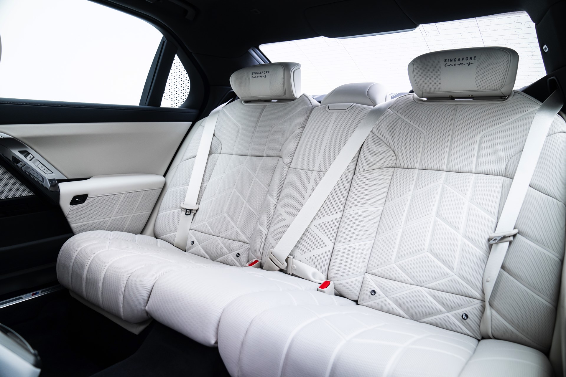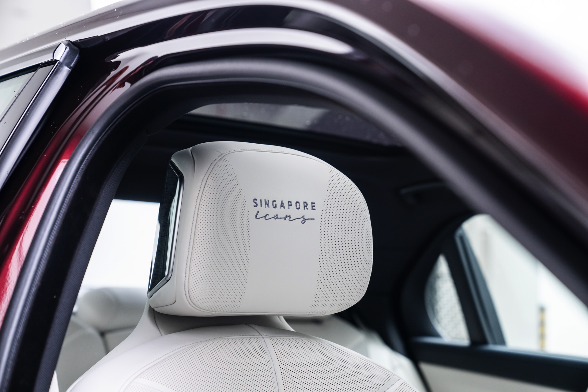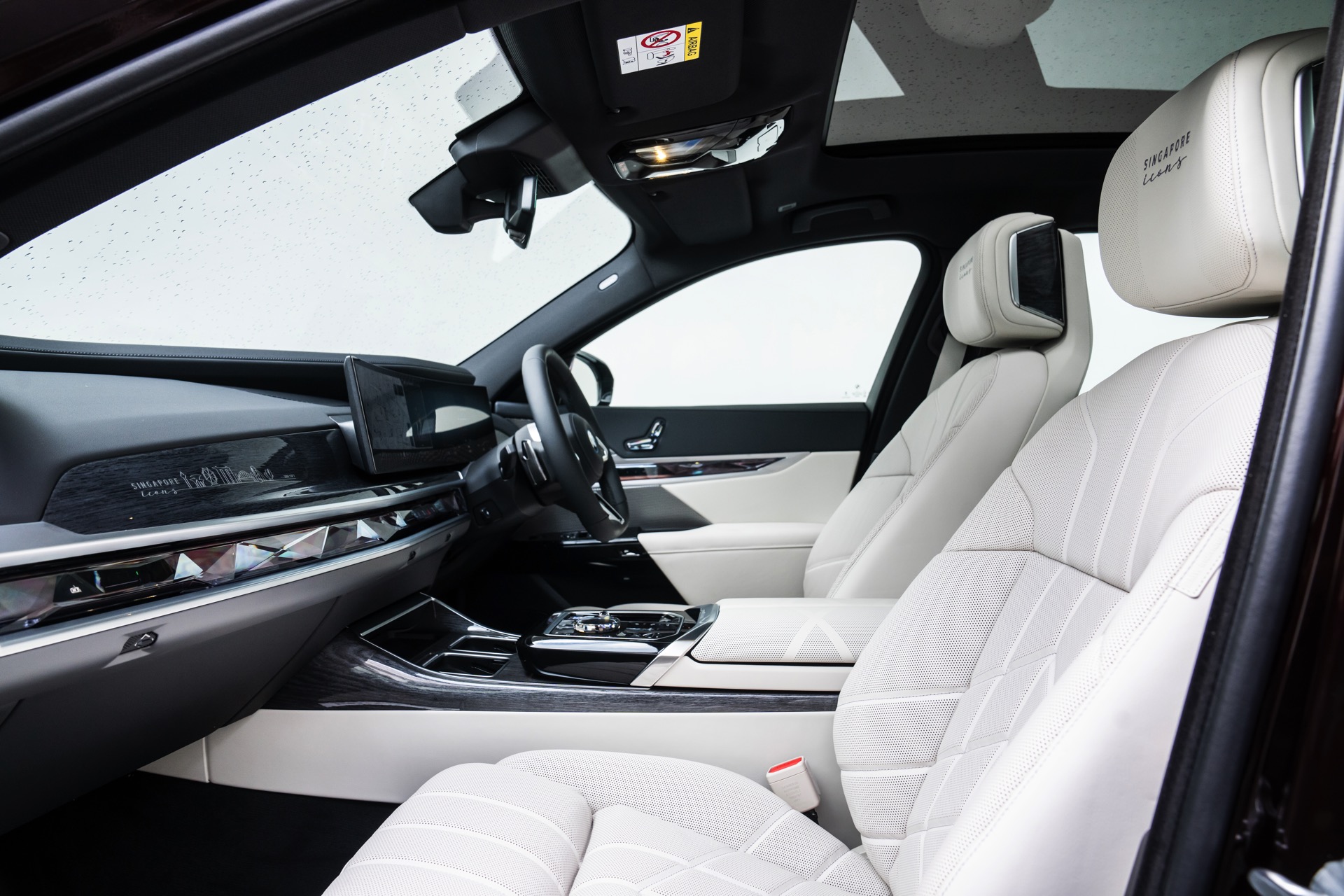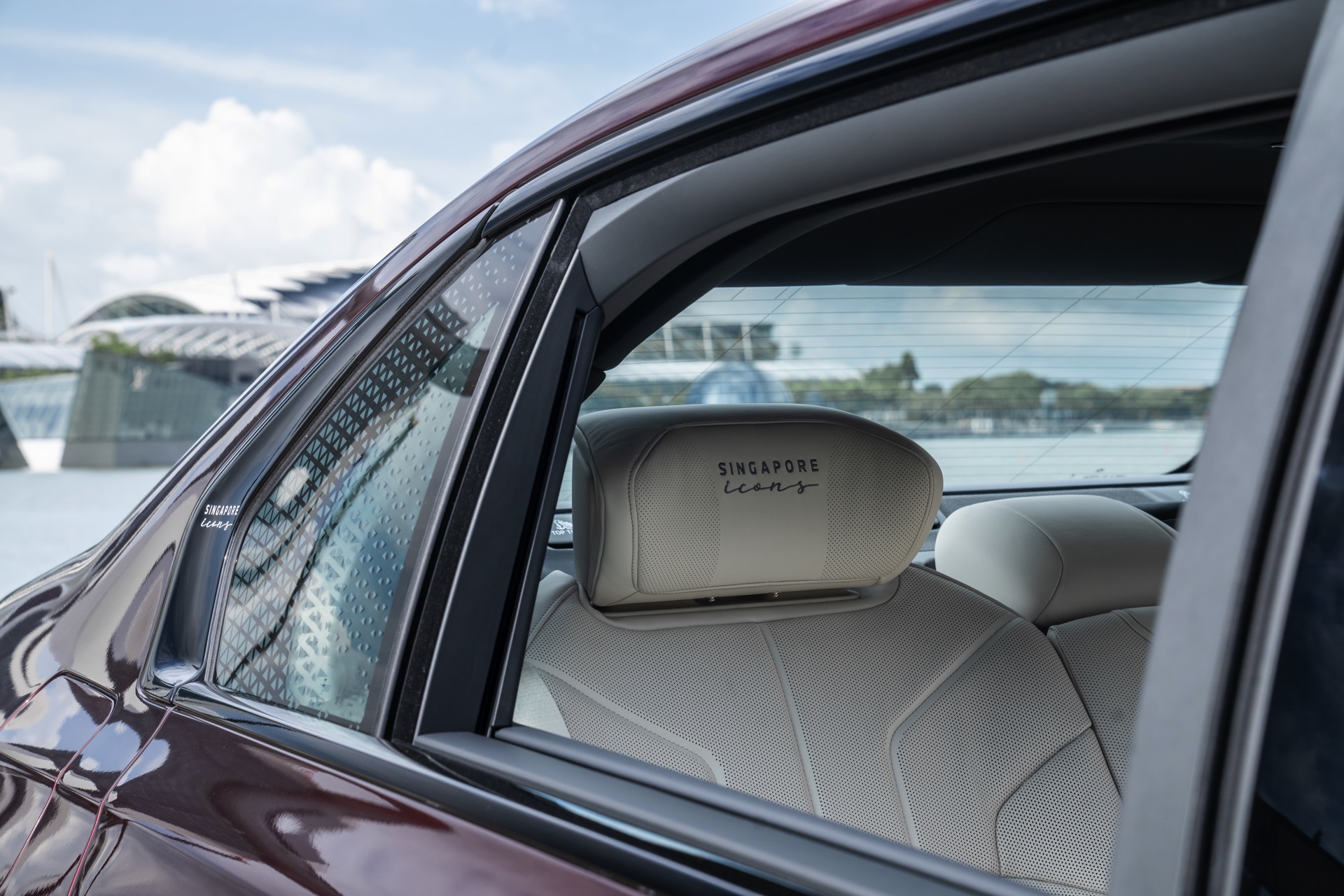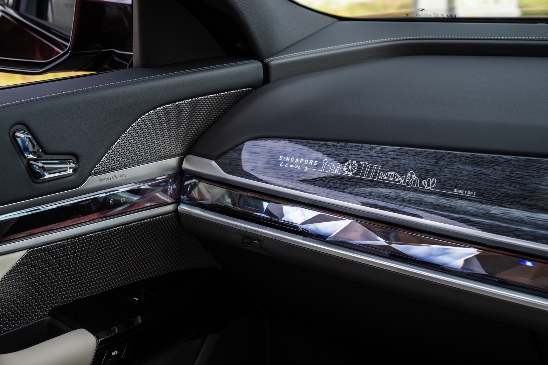 Das Interieur kommt mit Merino-Leder in Rauchweiß, sodass der rote BMW i7 die Farben der Flagge Singapurs aufgreift. Die Kopfstützen tragen einen gestickten “Singapore Icons”-Schriftzug und in das Holz der Interieurleisten wurden gleich sieben Ikonen der städtischen Skyline eingearbeitet. Die Nachbildung der Skyline wurde per Laser aus einem 27,5 Zentimeter breiten und weniger als einen Millimeter dicken Metall geschnitten.