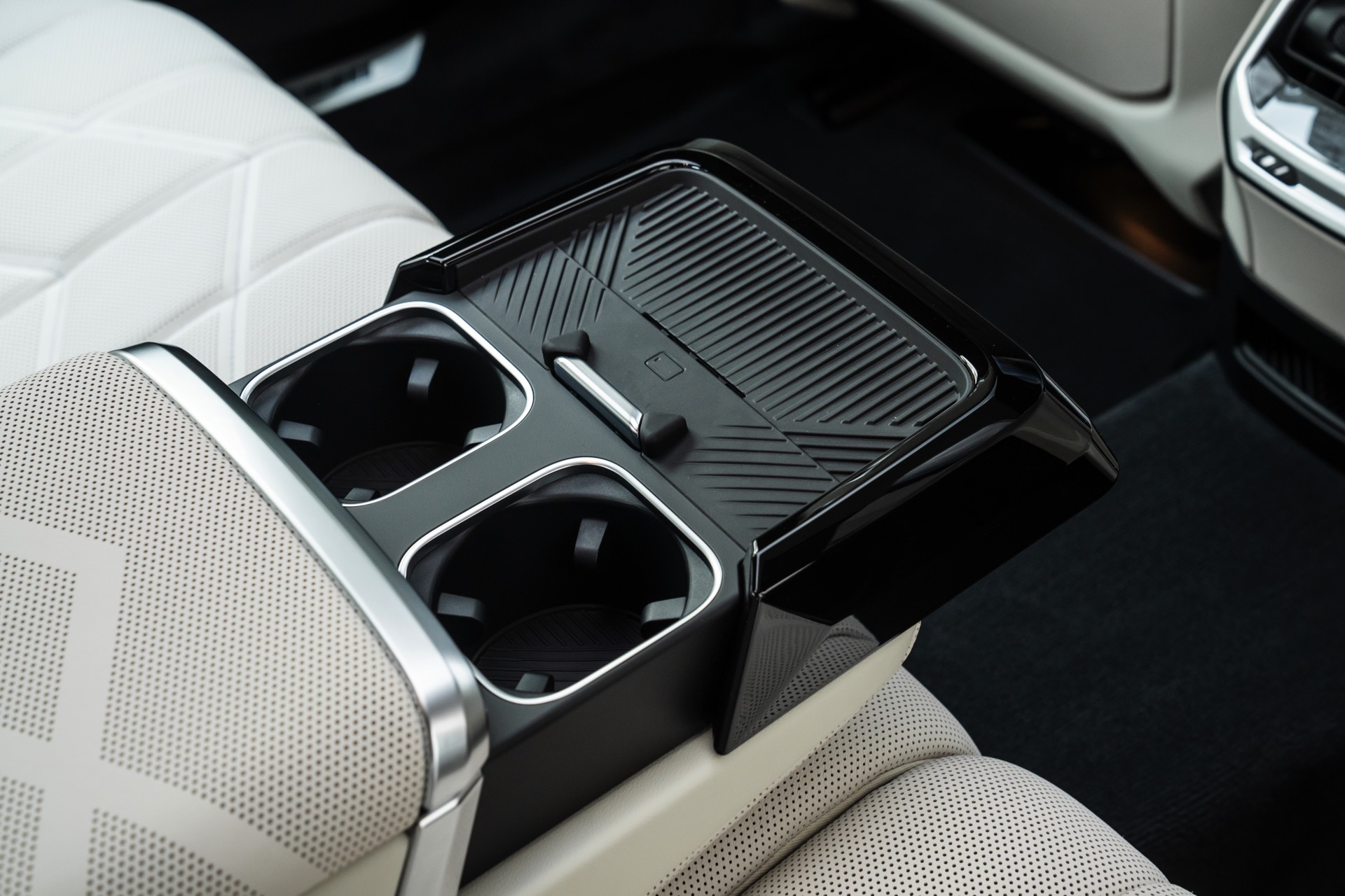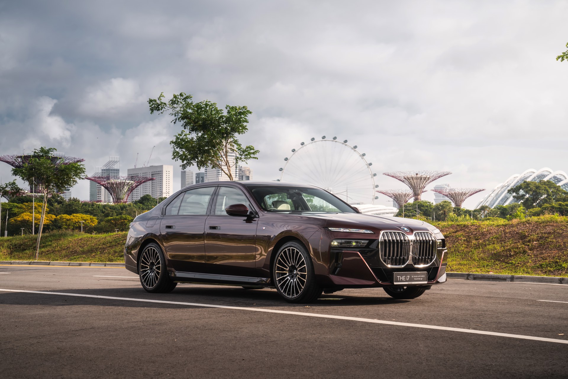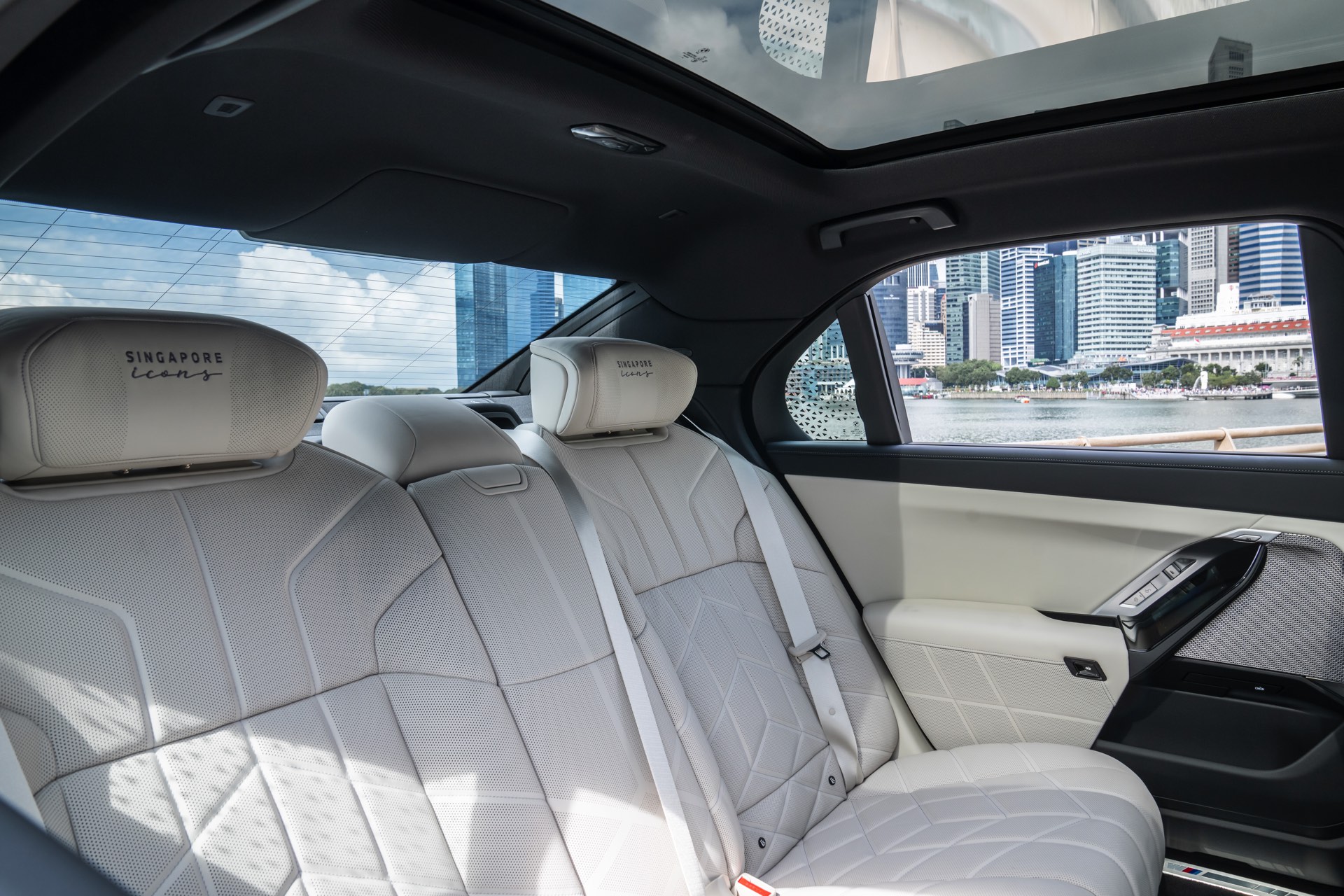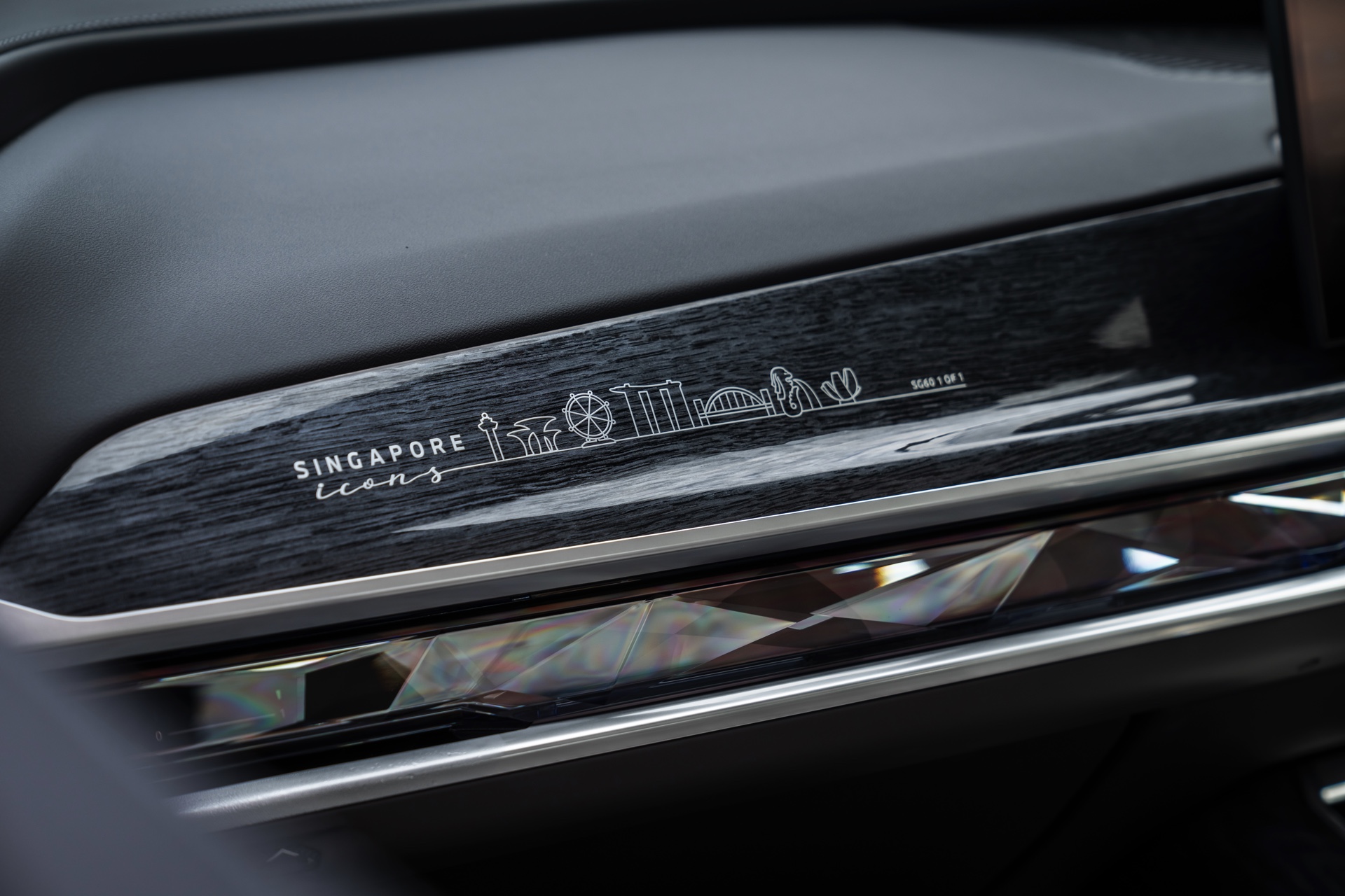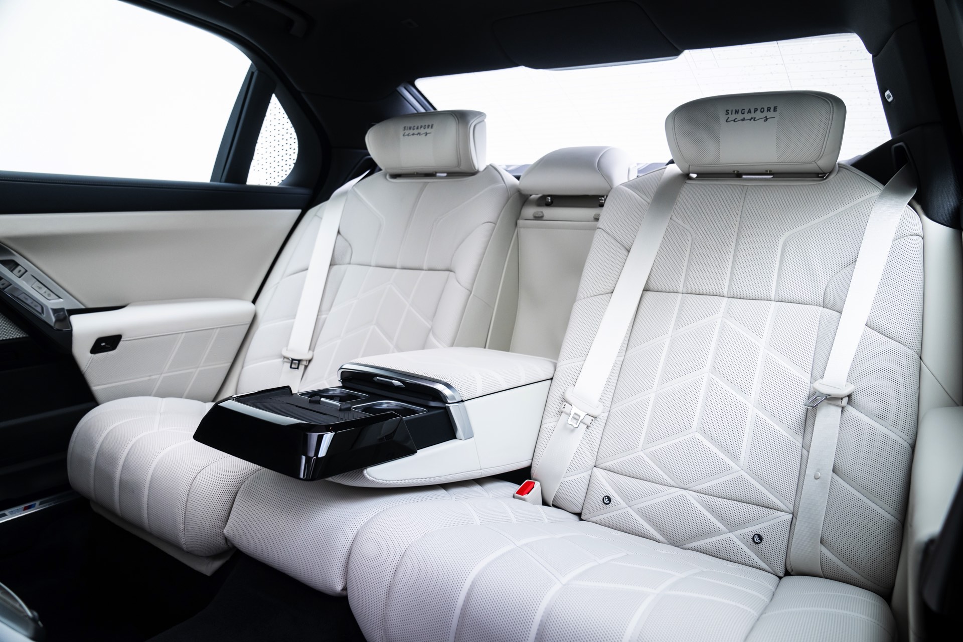 Das Interieur kommt mit Merino-Leder in Rauchweiß, sodass der rote BMW i7 die Farben der Flagge Singapurs aufgreift. Die Kopfstützen tragen einen gestickten “Singapore Icons”-Schriftzug und in das Holz der Interieurleisten wurden gleich sieben Ikonen der städtischen Skyline eingearbeitet. Die Nachbildung der Skyline wurde per Laser aus einem 27,5 Zentimeter breiten und weniger als einen Millimeter dicken Metall geschnitten.