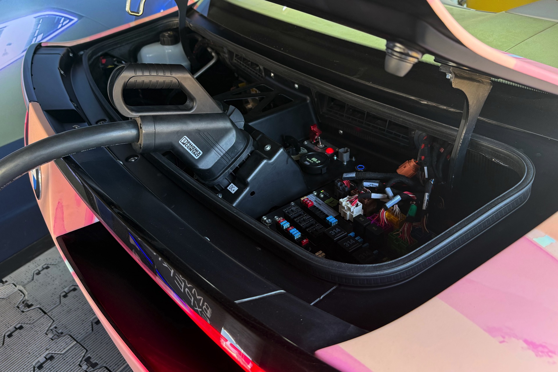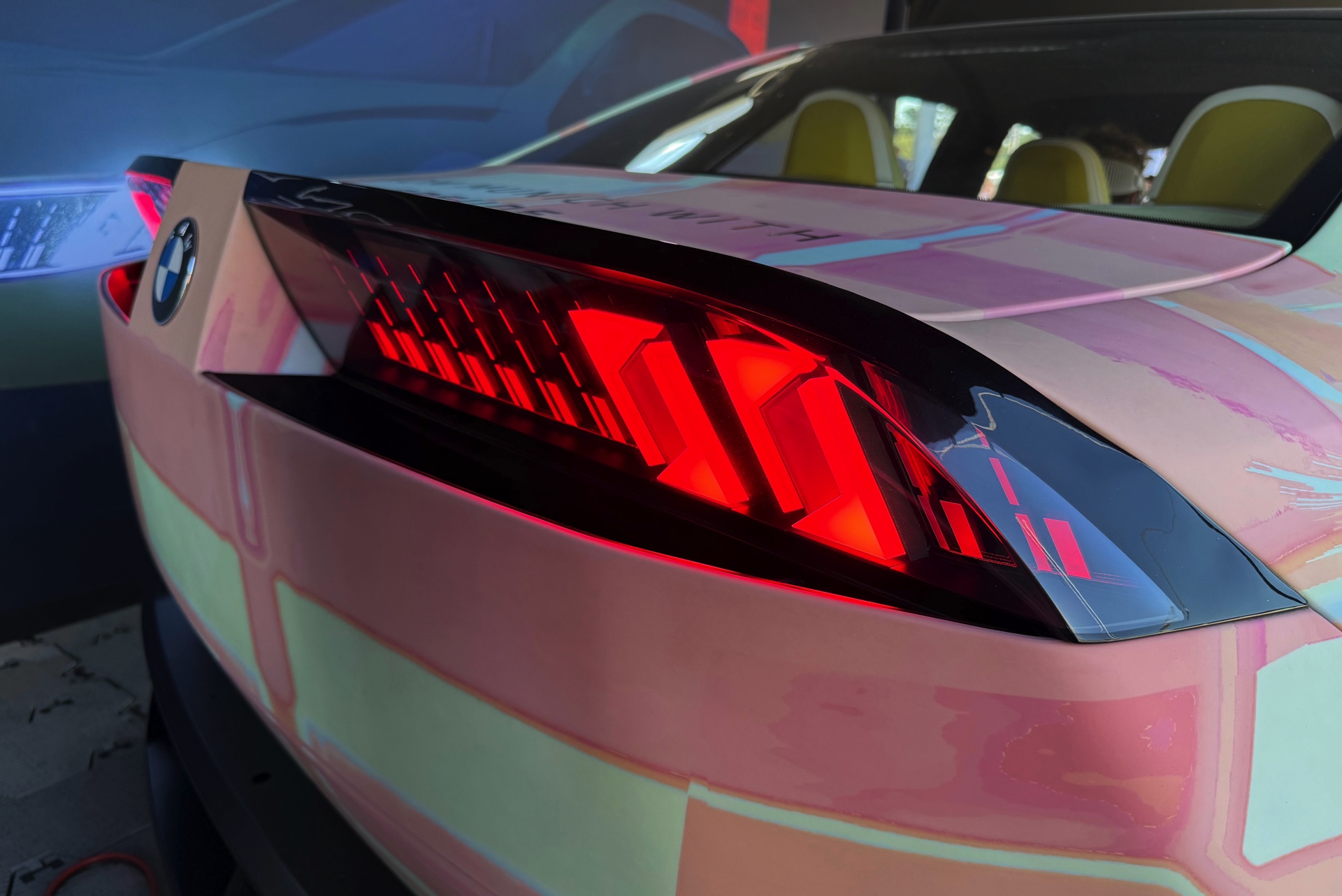 Frischen Strom tank der BMW VDX Prototyp am Heck, hier befindet sich zumindest derzeit die Ladebuchse für den Anschluss des Stromkabels. Wie inzwischen offiziell bekannt ist, kann die Neue Klasse an einer entsprechenden Ladesäule mit bis zu 400 kW aufgeladen werden, sodass sich innerhalb kürzester Zeit wieder viele Kilometer Reichweite nachladen lassen.