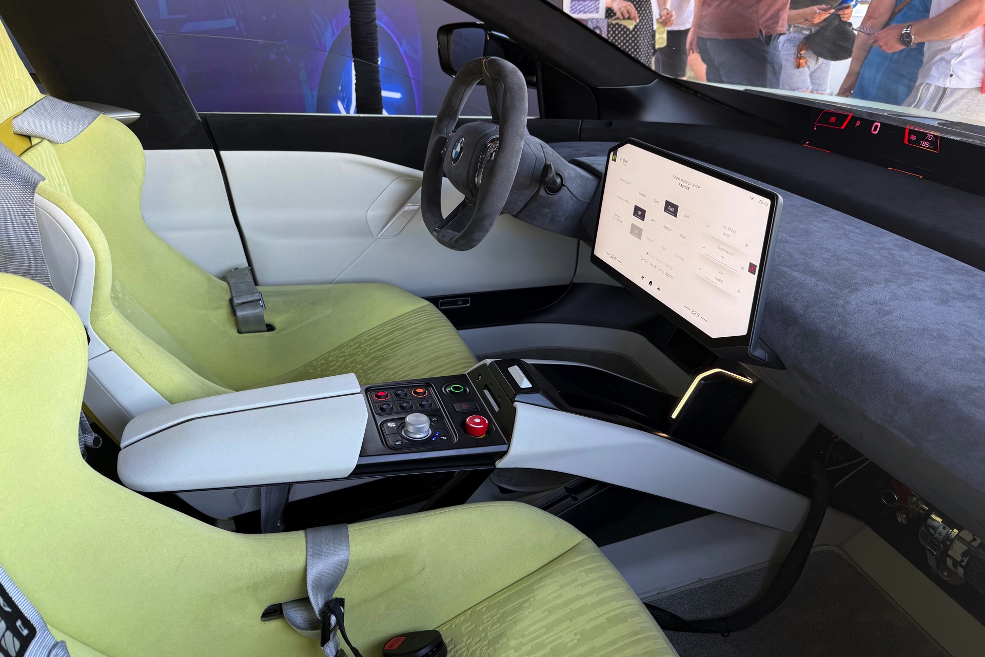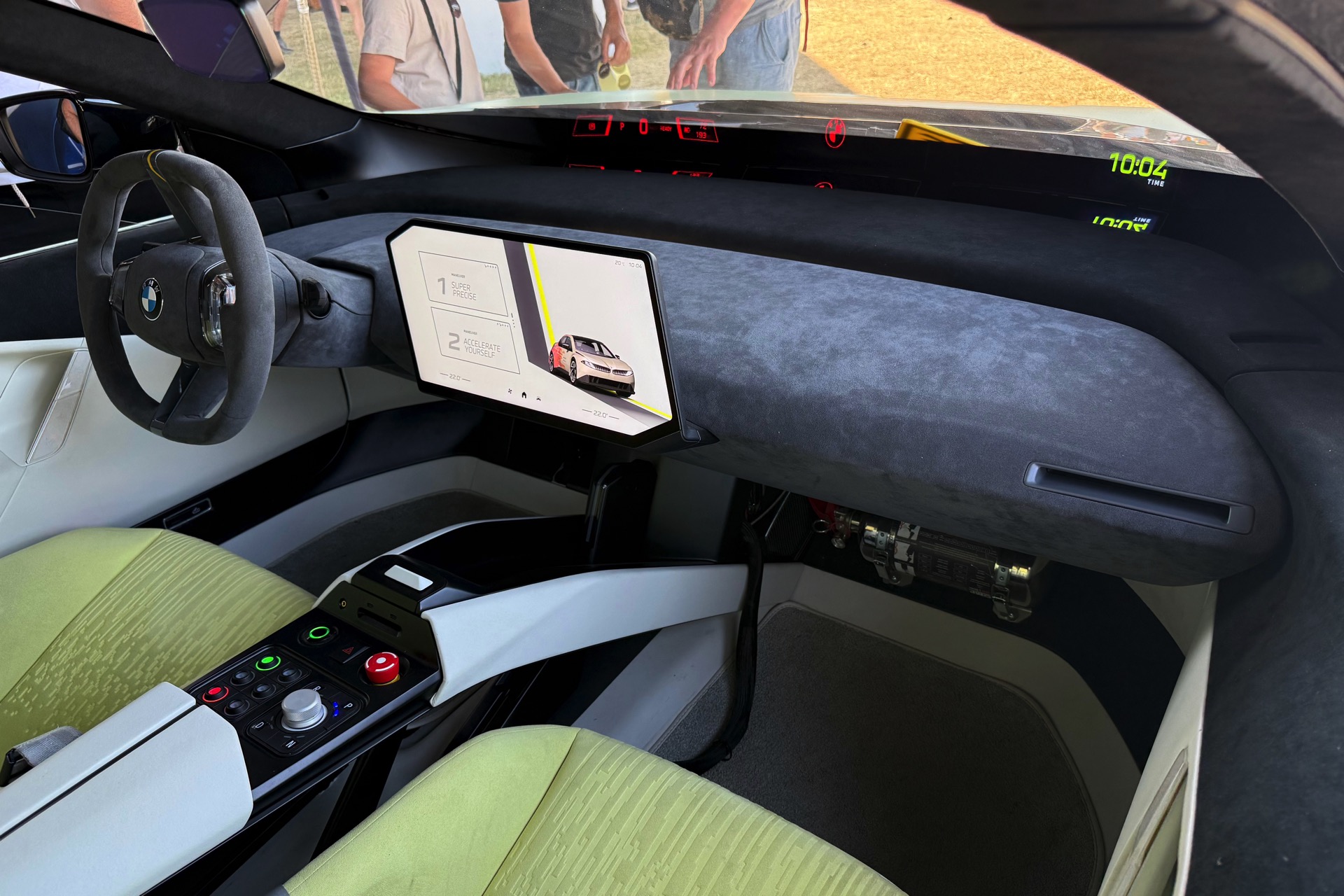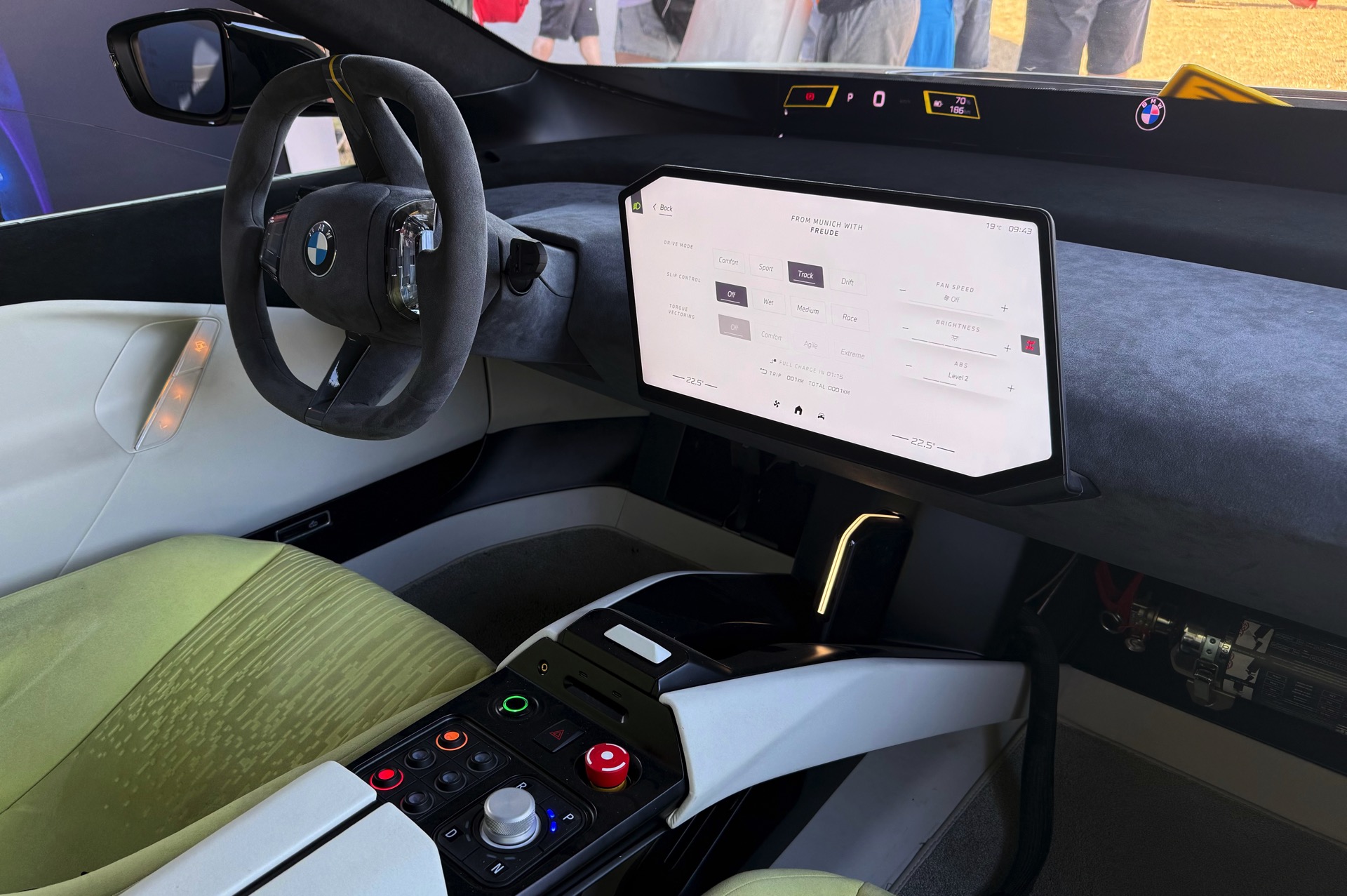 “Ganz nebenbei” liefert der meist schlicht als BMW VDX abgekürzte Prototyp auch einen ziemlich konkreten Ausblick auf den elektrischen BMW M3 (ZA0), der wohl 2027 auf Basis des nächsten i3 (NA0) auf den Markt kommen wird. Der Blick ins Cockpit liefert so gesehen auch einen Vorgeschmack auf das Interieur der Neuen Klasse, denn wir sehen unter anderem das Panoramic Vision-Display am Fuß der Frontscheibe und auch das markant geformte Infotainment-Display für BMW iDrive X. Die derzeit ziemlich pragmatisch gestaltete Schaltzentrale auf der Mittelkonsole dürfte sich auf dem Weg zur Serie genau wie manch anderes Detail noch verändern, das grundlegende Setup wird aber schon jetzt deutlich.