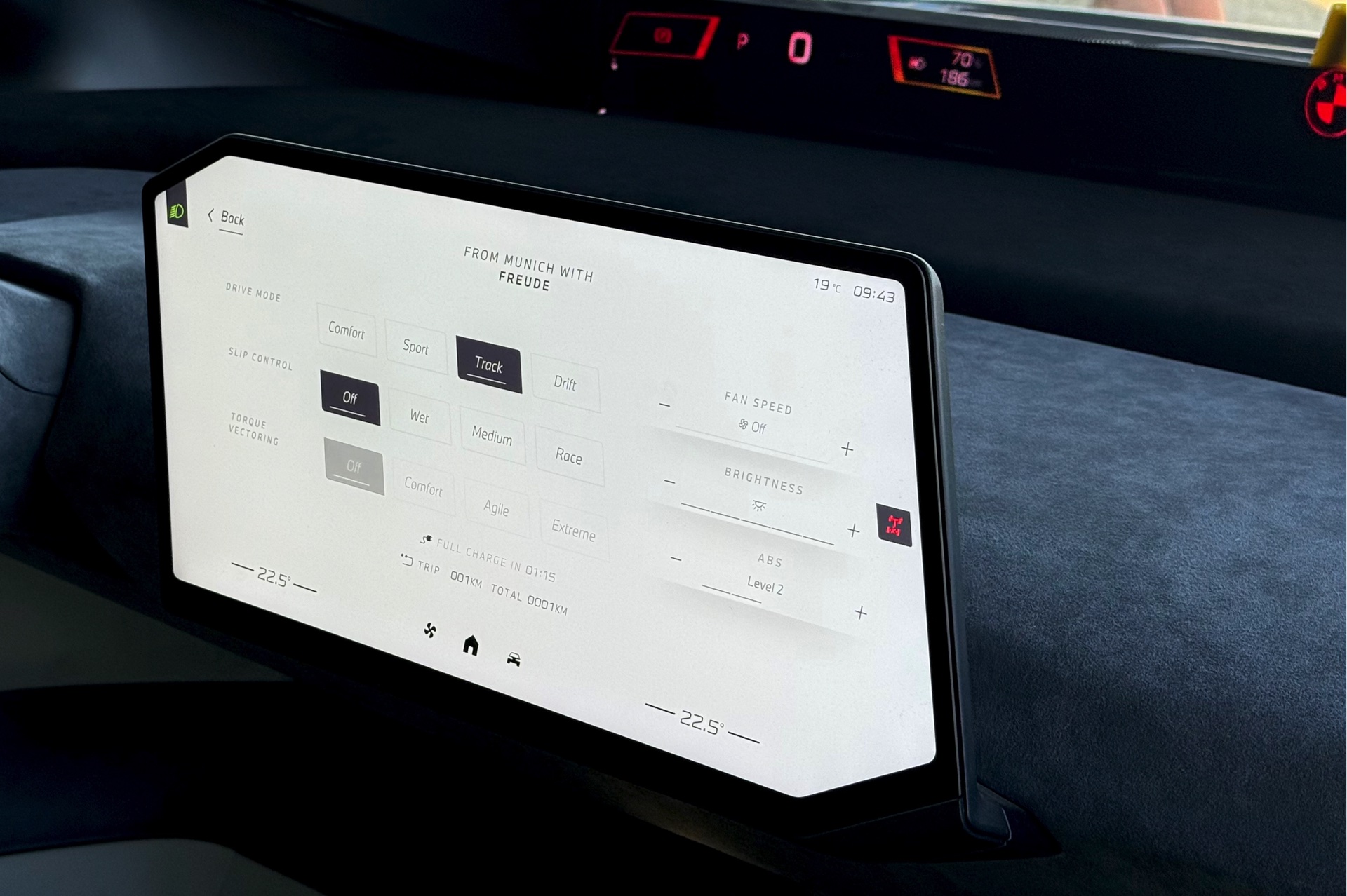 Wie das iDrive-Display und seine Menüs zeigen, gibt es im aktuellen Entwicklungsstadium die vier Fahrmodi Comfort, Sport, Track und Drift, außerdem kann separat eine Slip Control zur Regelung des Wheelspins vierstufig eingestellt werden. Interessant ist die dritte Zeile des Menüs, denn hier kann das Torque Vectoring in den Modi Off, Comfort, Agile und Extreme konfiguriert werden. Ein mehrstufiges ABS-Setup und die Einstellung für die Lüfter des aktiven Aerodynamiksystems runden die Setup-Optionen des Versuchsträgers ab.