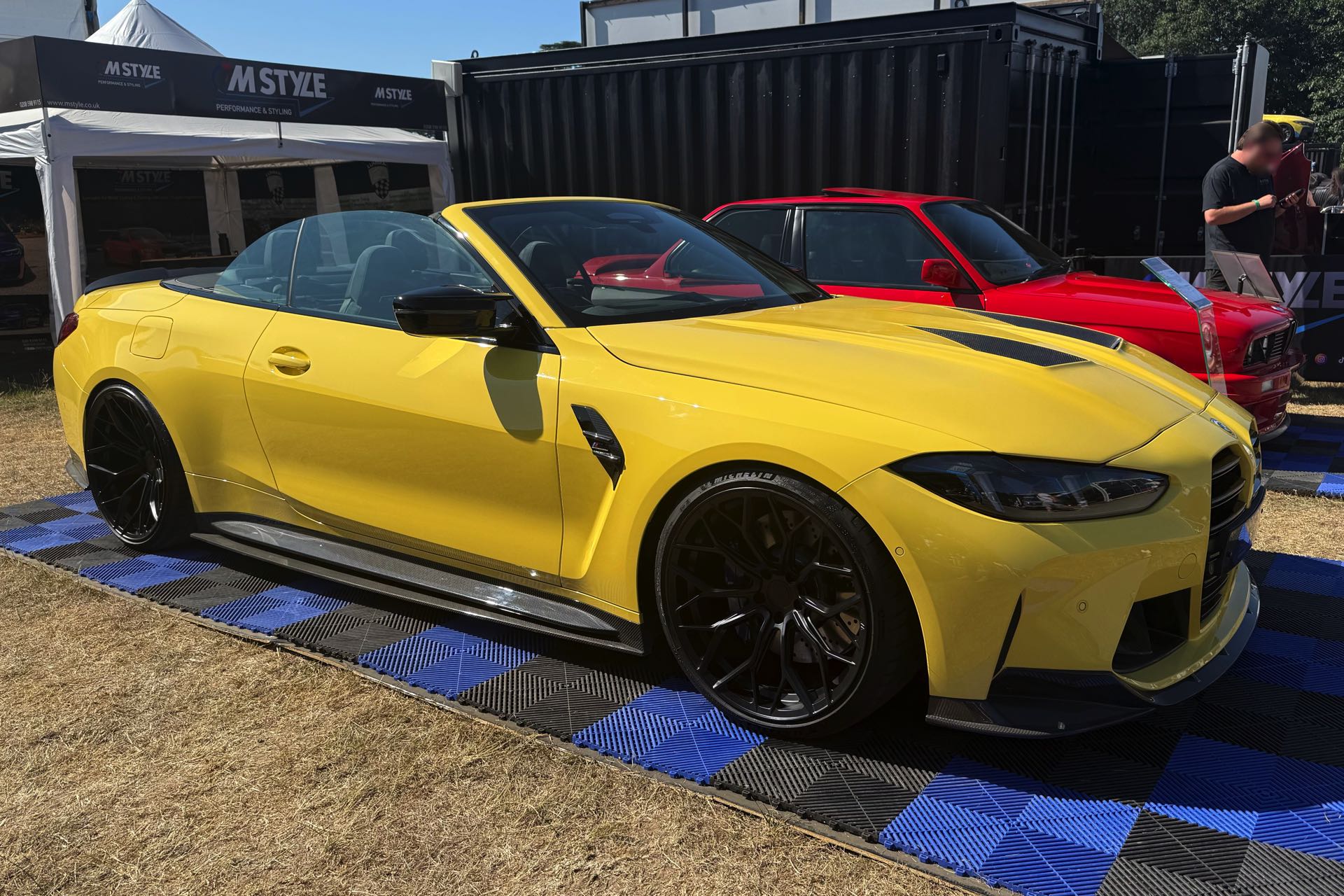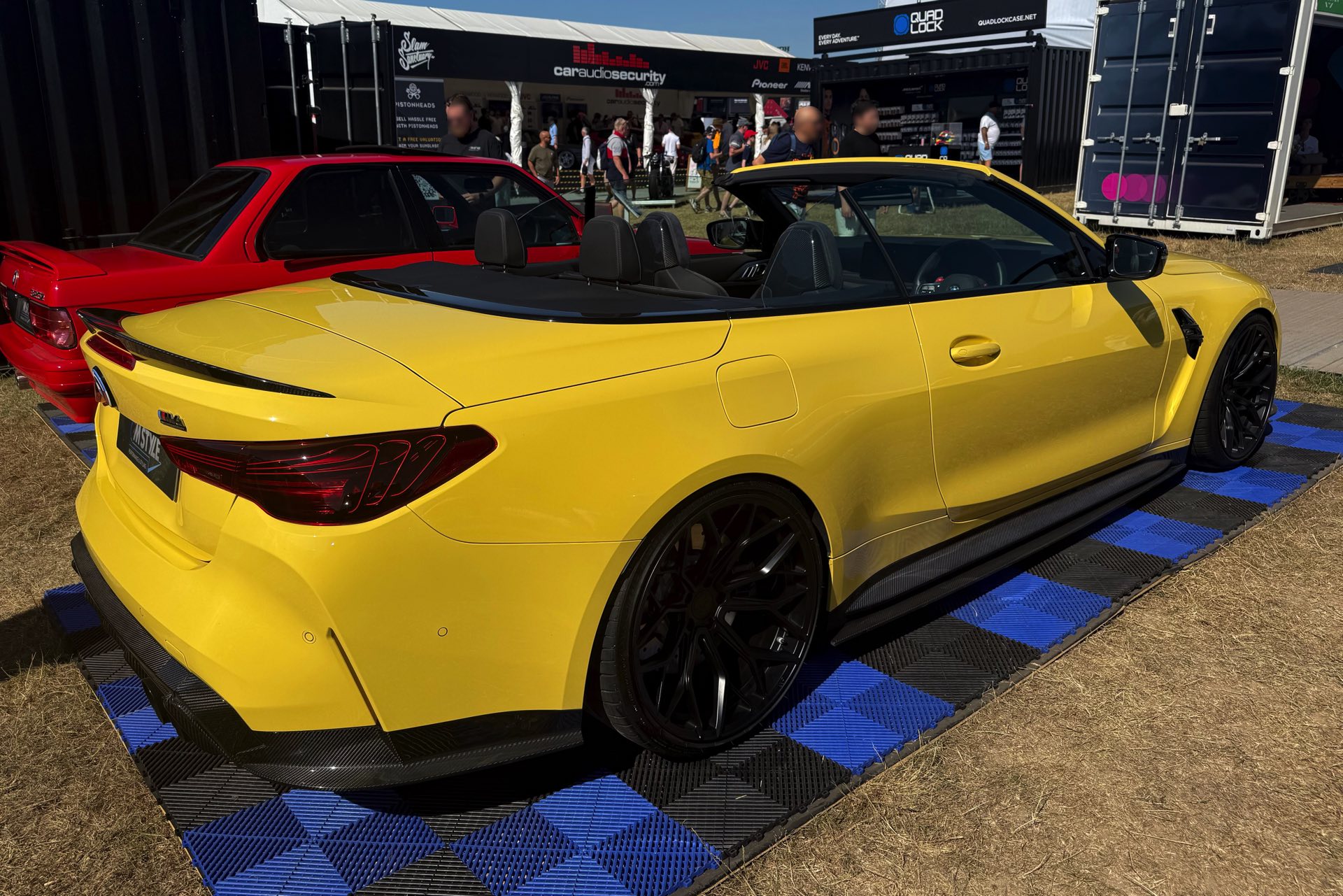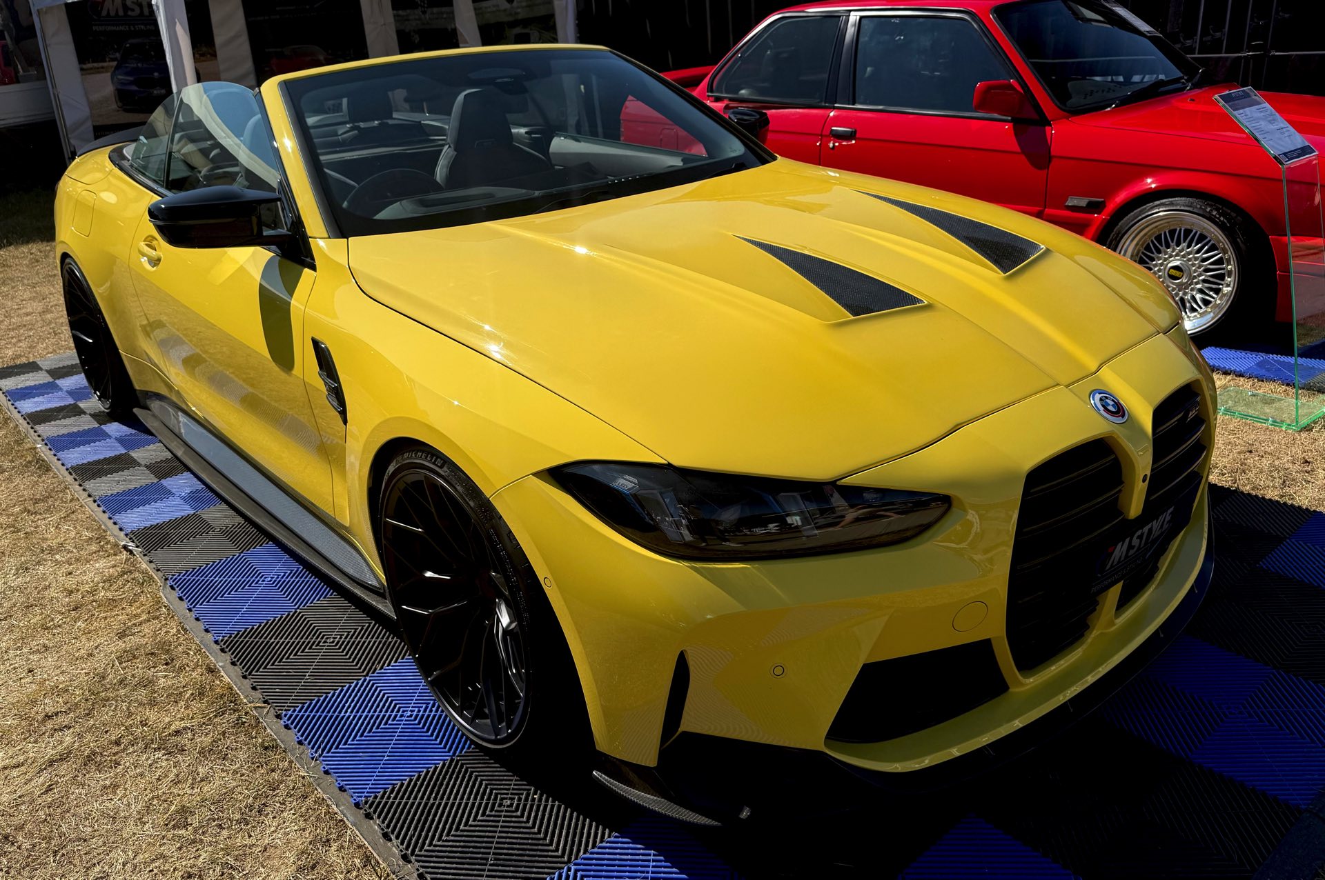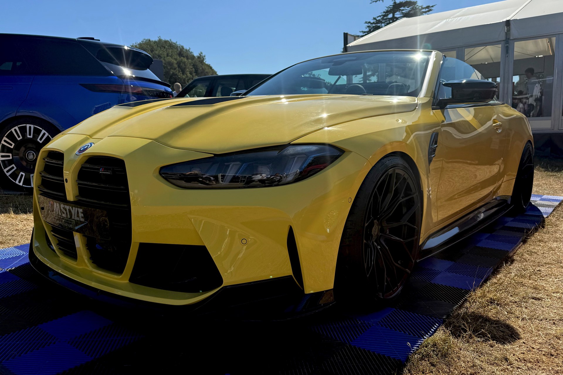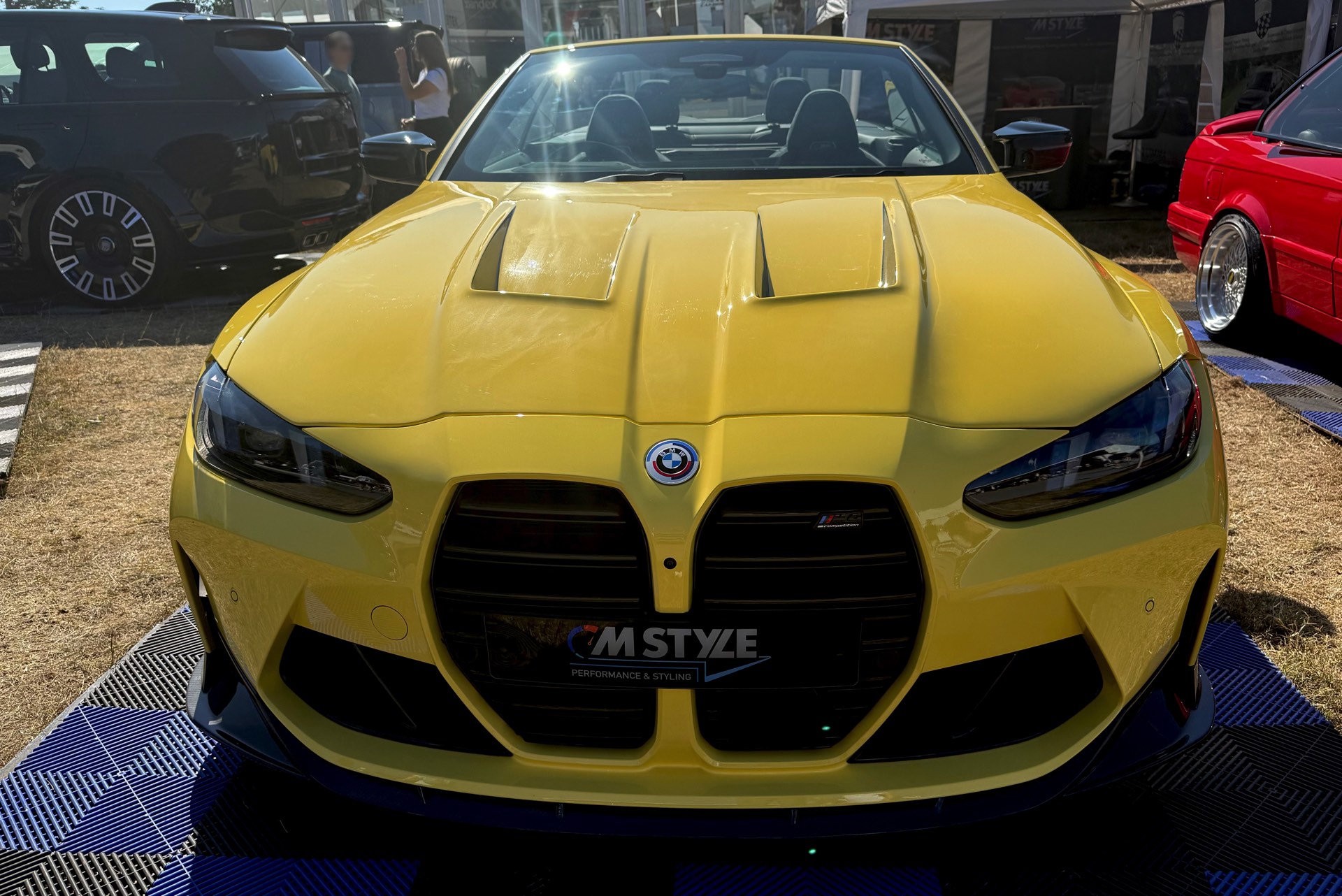 Für viele M-Fans ist Dakar Gelb untrennbar mit Fahrzeugen wie dem BMW M3 der Generation E36 verbunden, aber die Farbe kann sich auch auf heutigen Modellen absolut sehen lassen. Ein Beispiel dafür findet sich auch auf dem Goodwood Festival of Speed, denn am Stand von MStyle sehen wir ein BMW M4 Cabrio (G83 LCI) mit zahlreichen Tuning-Komponenten aus dem Programm von CT Carbon. Die Briten verpassen dem offenen Bayern unter anderem eine Carbon-Motorhaube mit zusätzlichen Entlüftungs-Öffnungen, aber auch viele kleinere Anbauteile für einen insgesamt sportlicheren Auftritt.