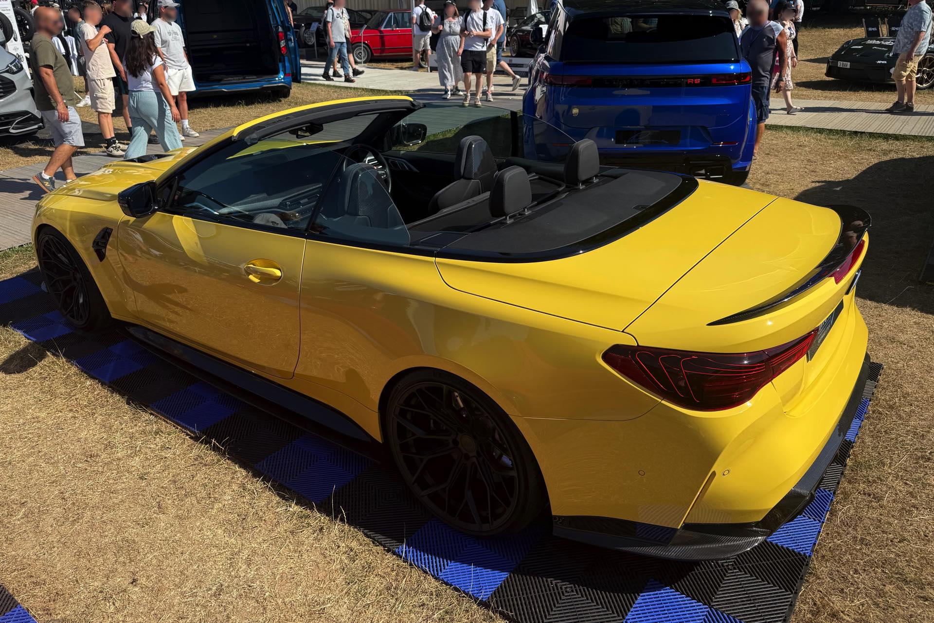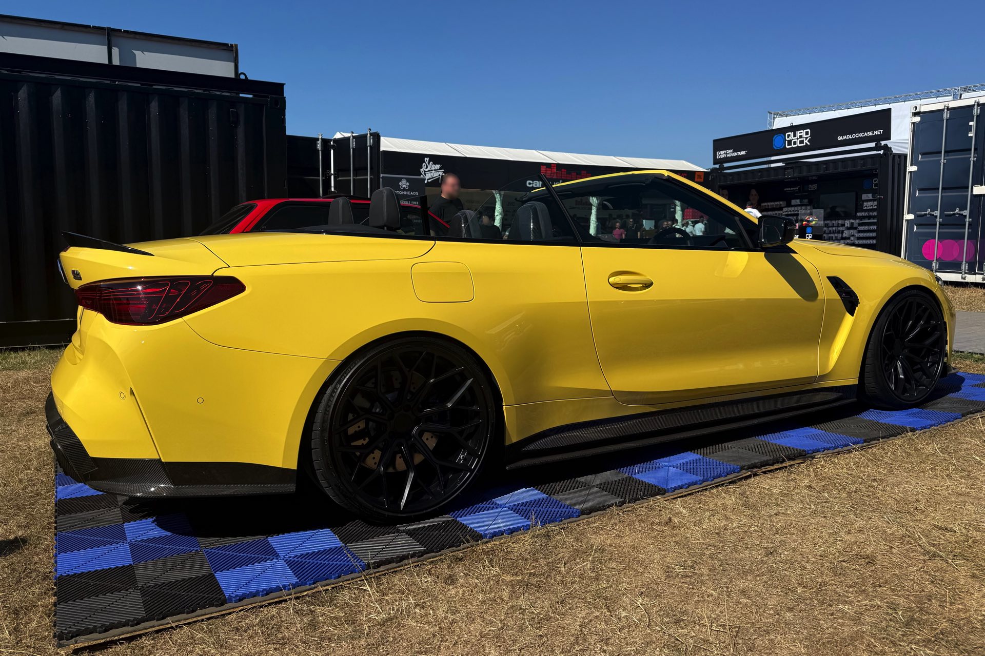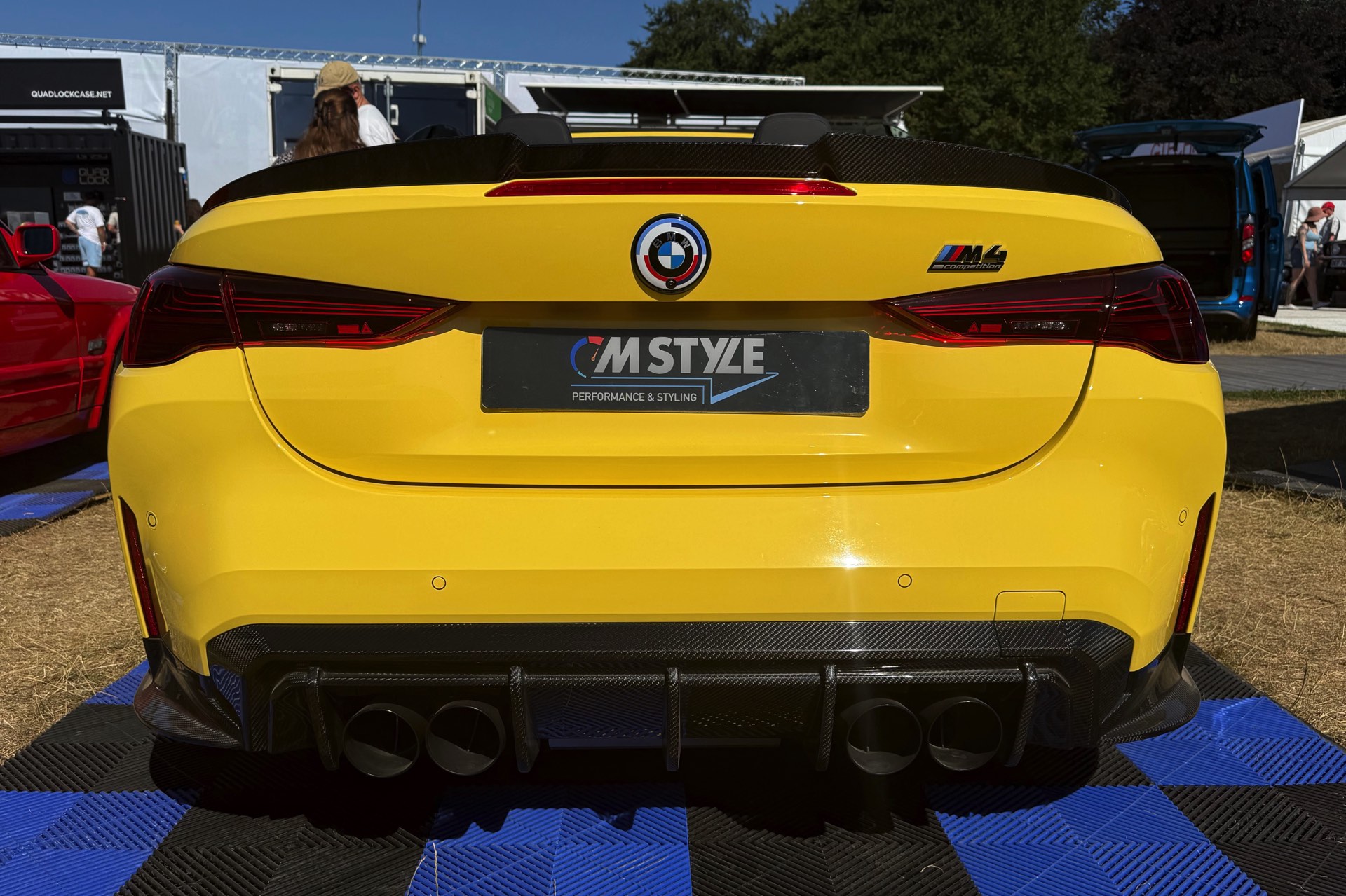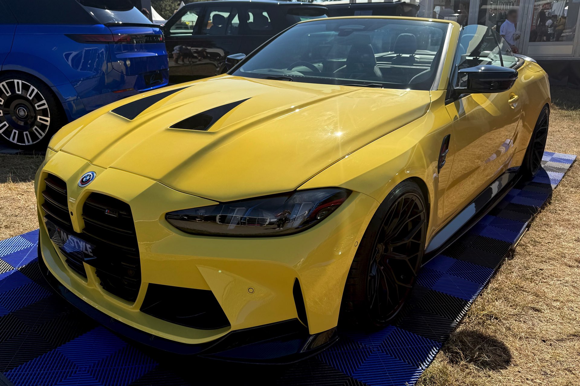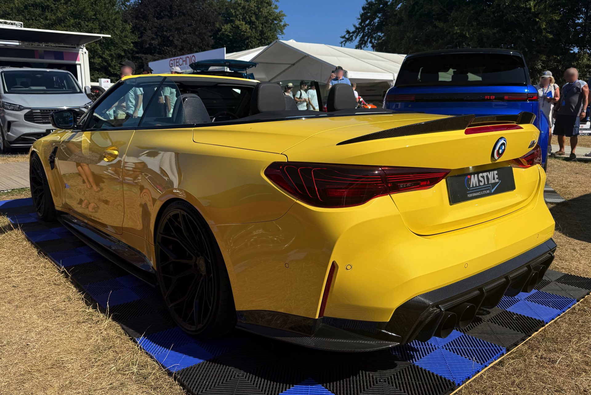 Für viele M-Fans ist Dakar Gelb untrennbar mit Fahrzeugen wie dem BMW M3 der Generation E36 verbunden, aber die Farbe kann sich auch auf heutigen Modellen absolut sehen lassen. Ein Beispiel dafür findet sich auch auf dem Goodwood Festival of Speed, denn am Stand von MStyle sehen wir ein BMW M4 Cabrio (G83 LCI) mit zahlreichen Tuning-Komponenten aus dem Programm von CT Carbon. Die Briten verpassen dem offenen Bayern unter anderem eine Carbon-Motorhaube mit zusätzlichen Entlüftungs-Öffnungen, aber auch viele kleinere Anbauteile für einen insgesamt sportlicheren Auftritt.