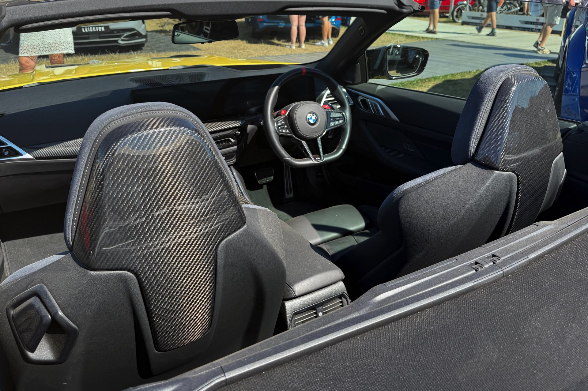 Ein interessantes Detail sind die Carbon-Aufsätze für die Rückenlehnen der regulären Sportsitze: Auch ohne die teure Option der M Carbon Schalensitze lässt sich so für Hinterherfahrende eine sportliche Carbon-Optik realisieren, was gerade für Cabrio-Fahrer eine spannende Option sein dürfte.