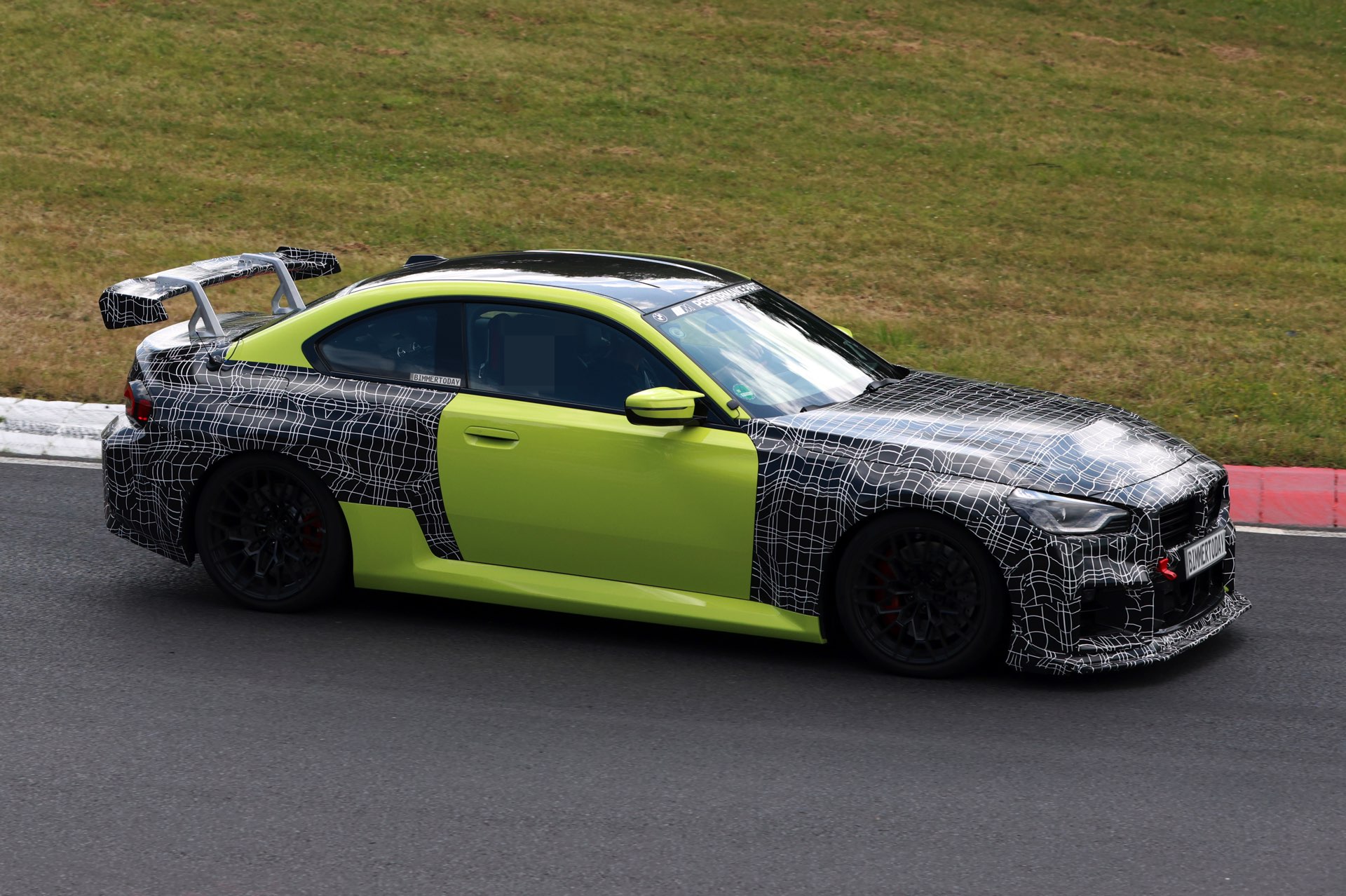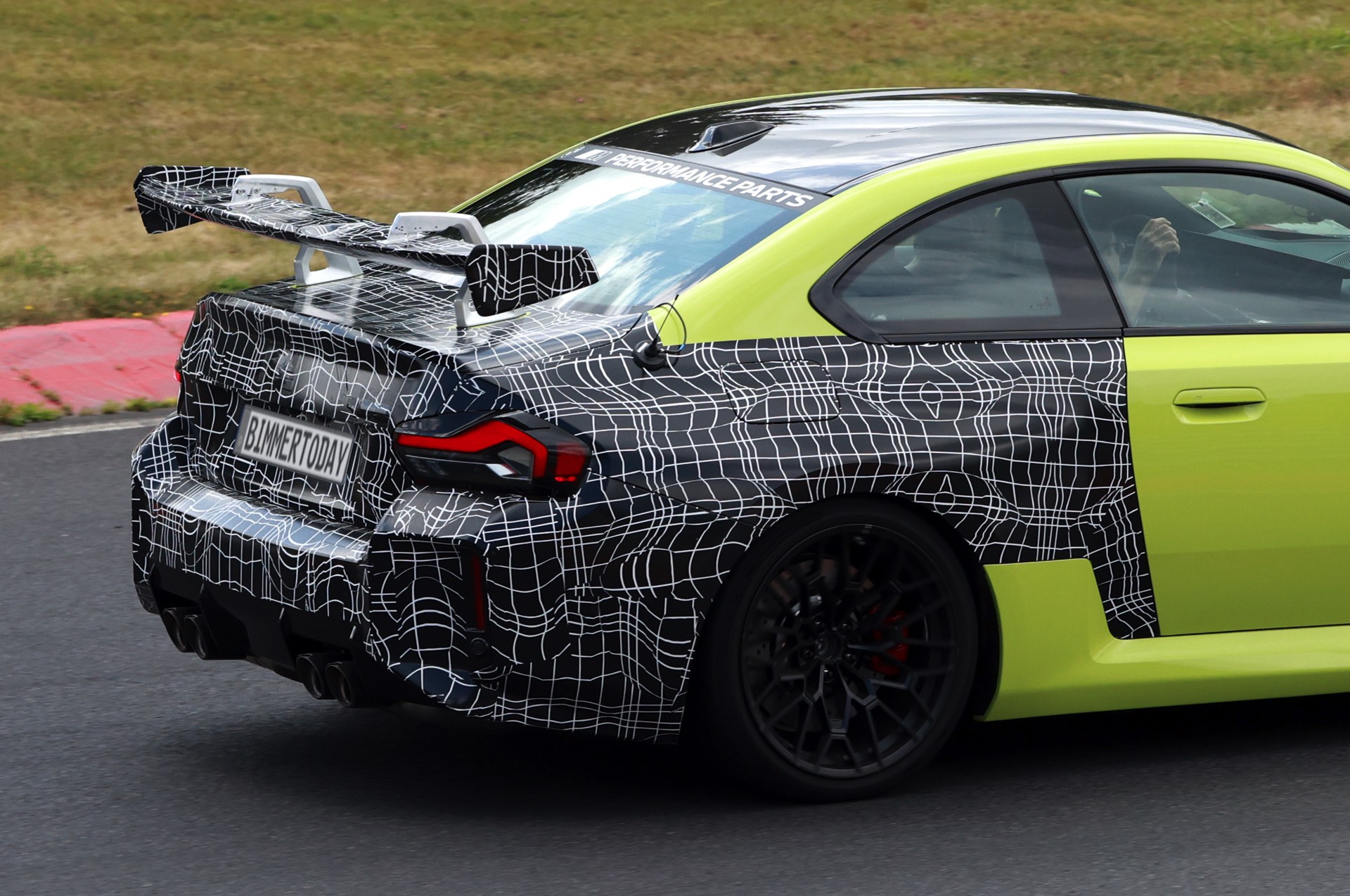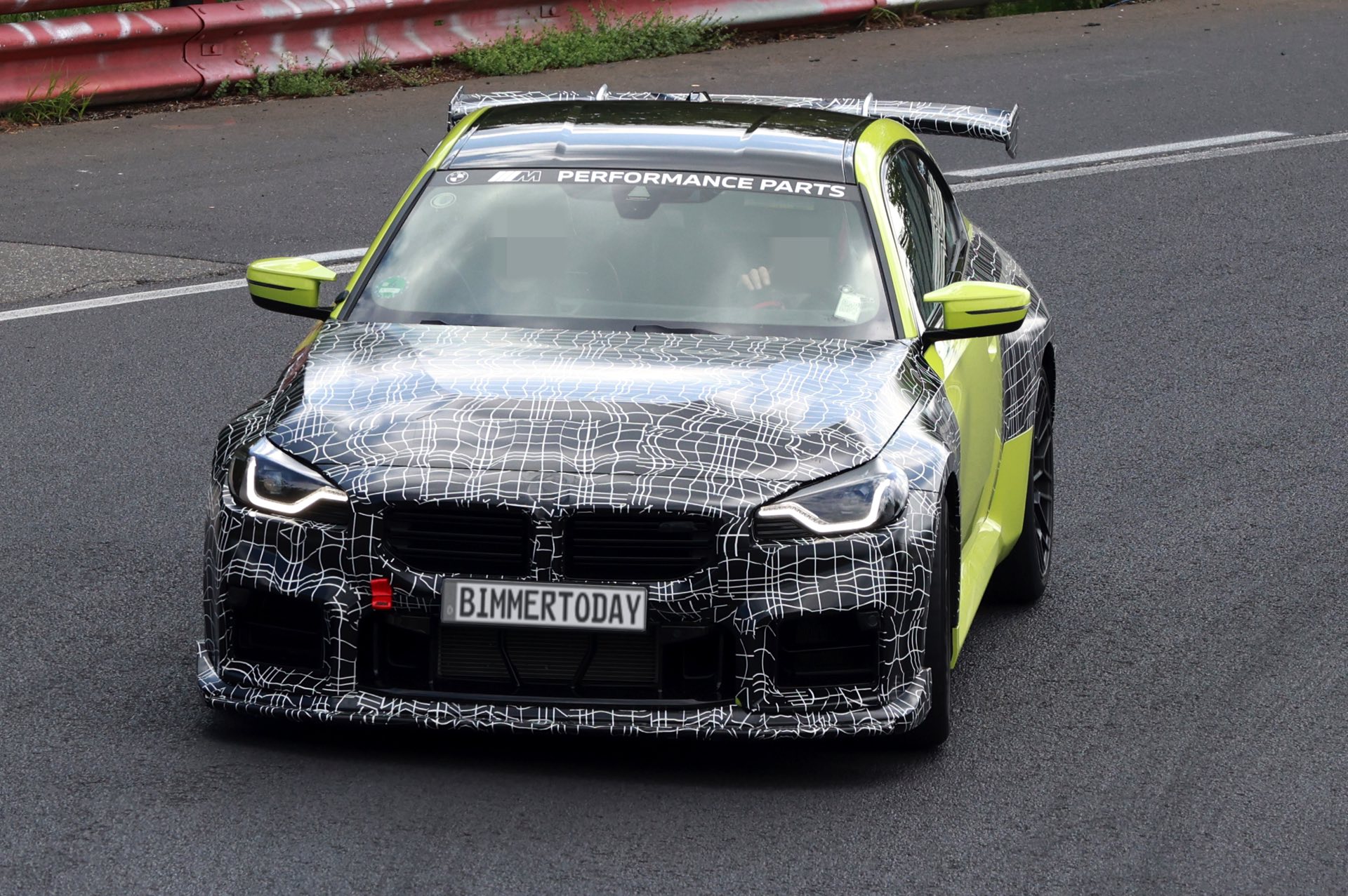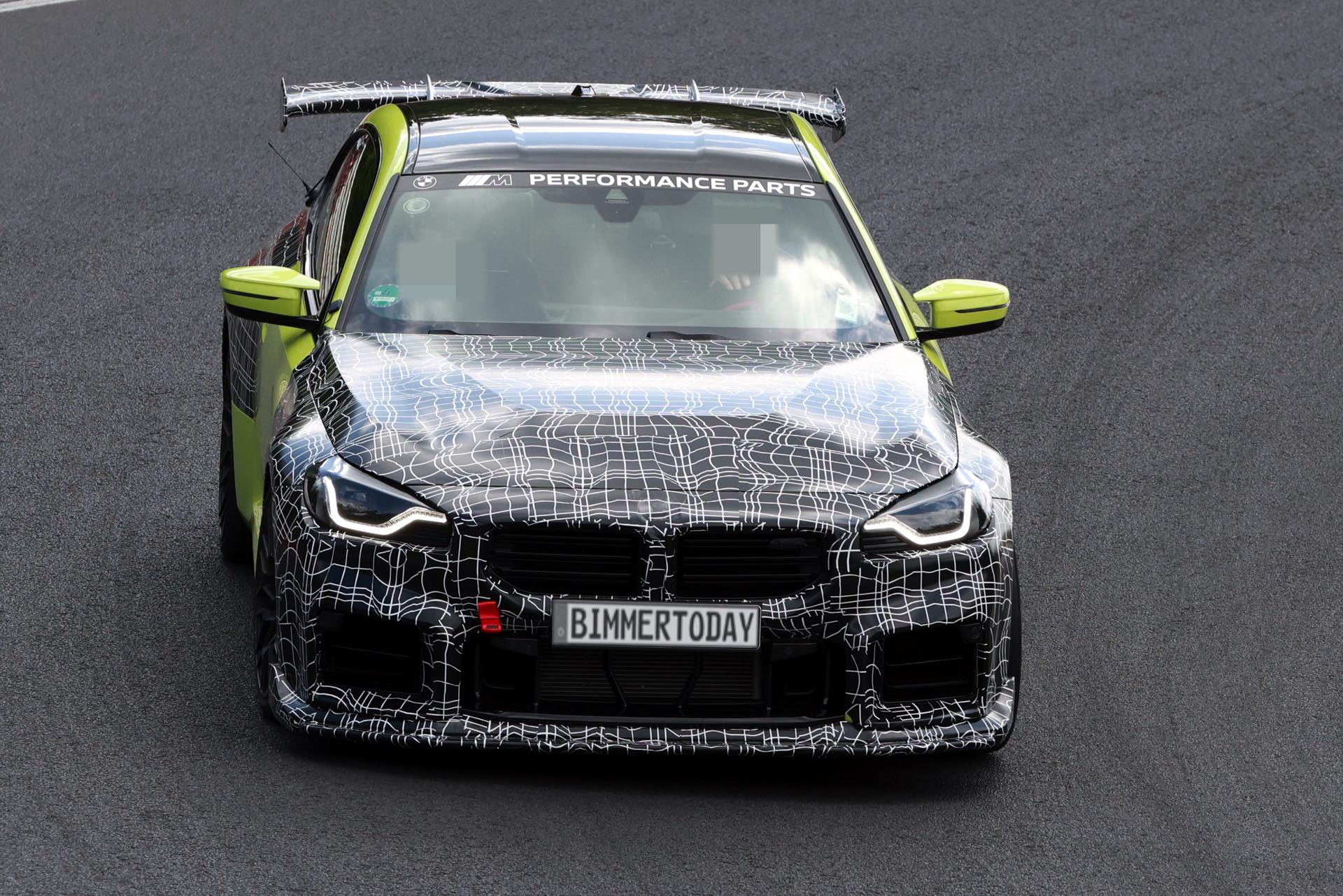 Die Fotos von SHProshots zeigen uns einen Prototypen in Sao Paulo Gelb, der vor allem an Front und Heck mit typischer Tarnfolie beklebt ist. Absoluter Hingucker ist der riesige Heckflügel, dessen Setup sich offenbar mit Hilfe mehrerer Schräubchen verändern lässt: Je nach Rennstrecke oder auch persönlicher Vorliebe kann der BMW M2 für mehr oder weniger Anpressdruck an der Hinterachse optimiert werden, was neben der Fahrstabilität in schnellen Kurven natürlich auch Einfluss auf die Höchstgeschwindigkeit nehmen wird. Gut erkennen lässt sich auch ein Frontsplitter, der auch die Front stärker an den Asphalt drückt. "