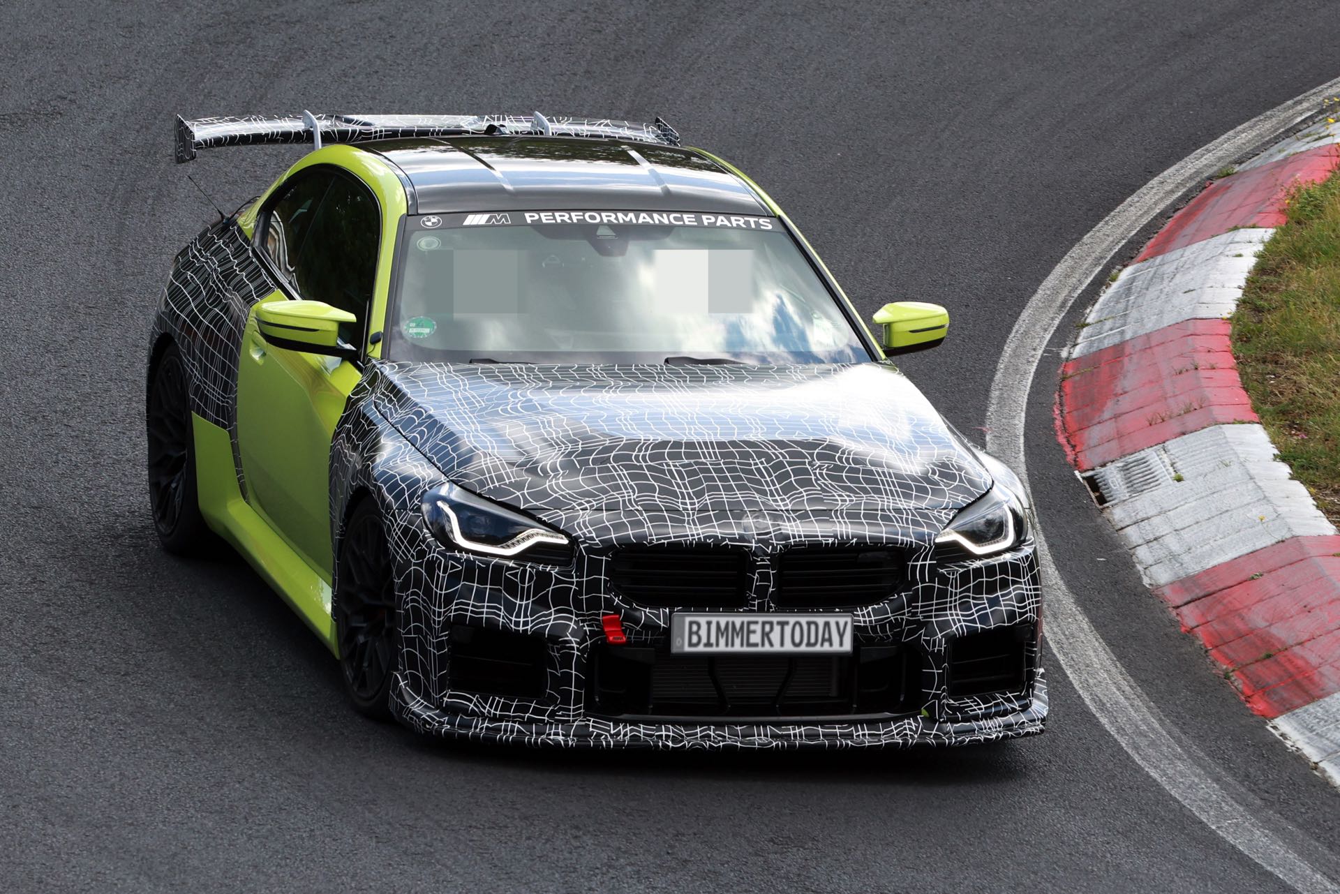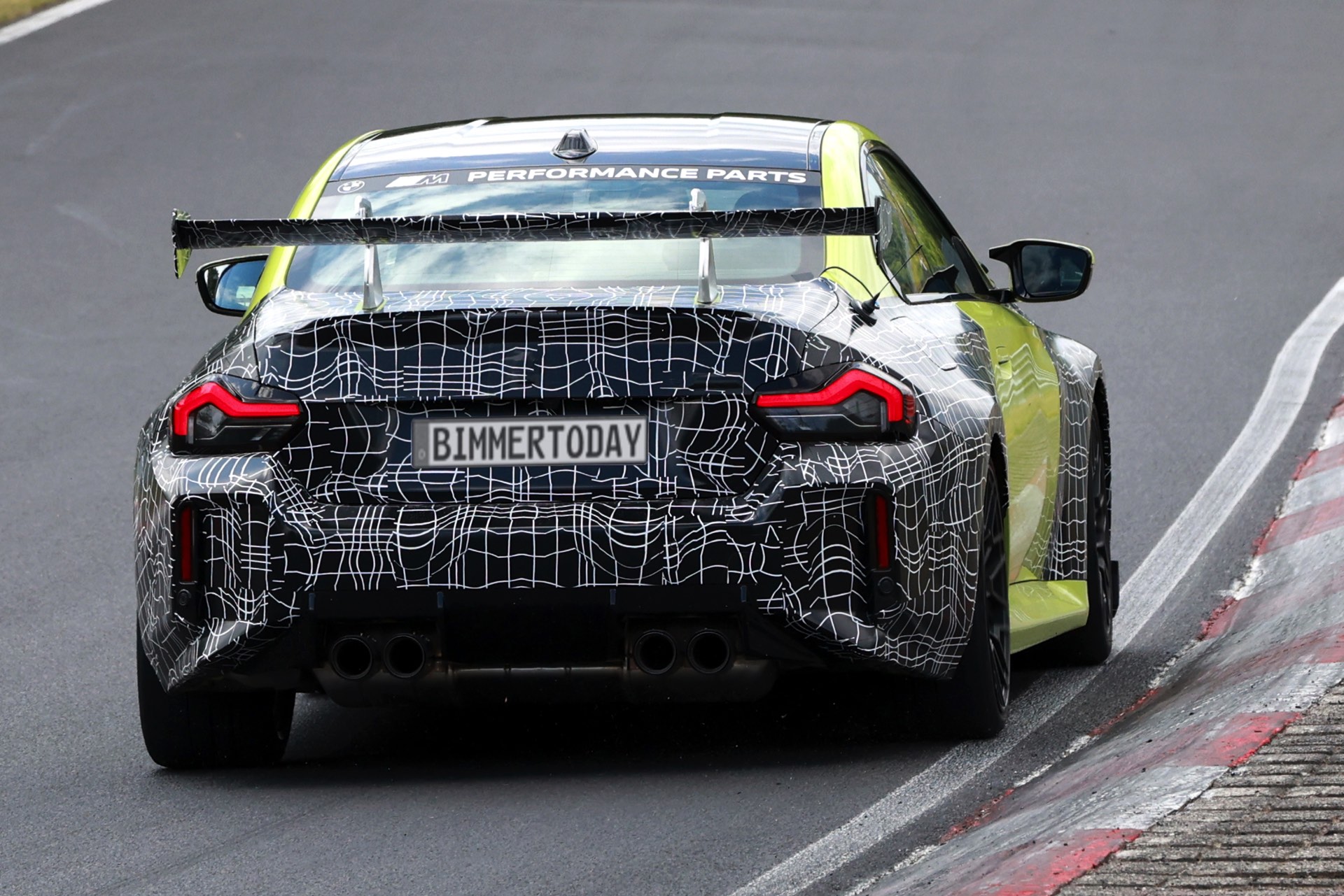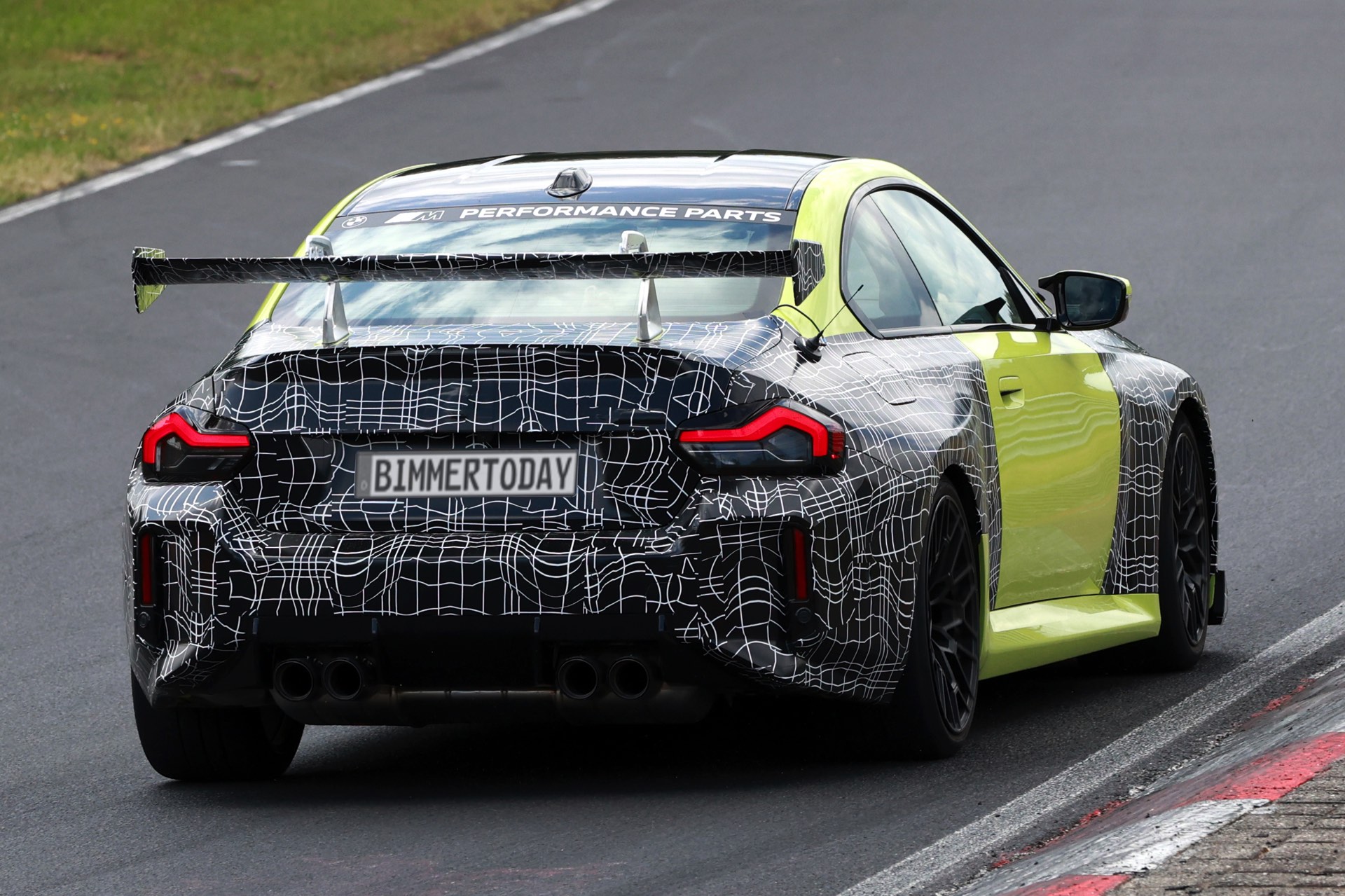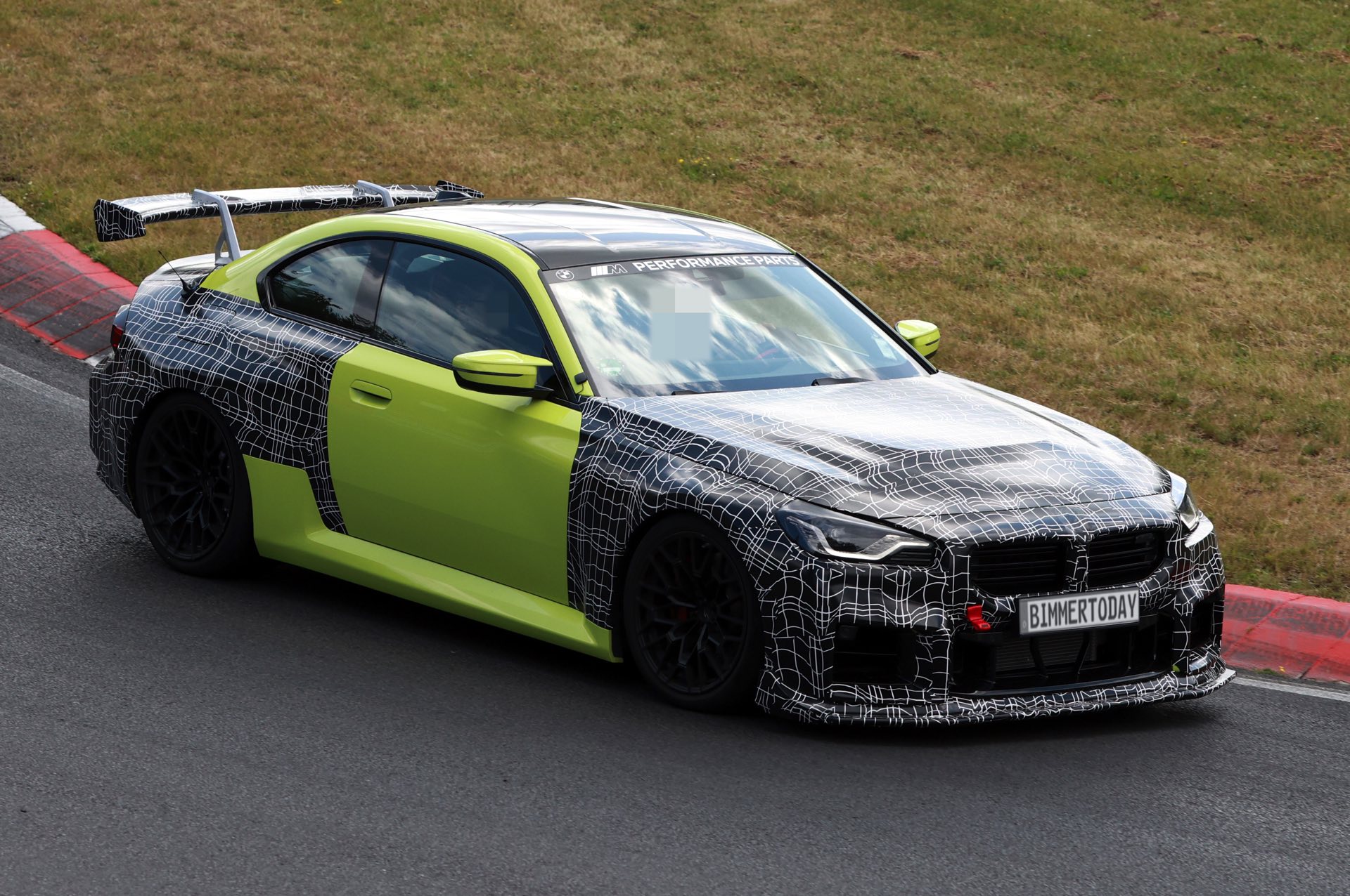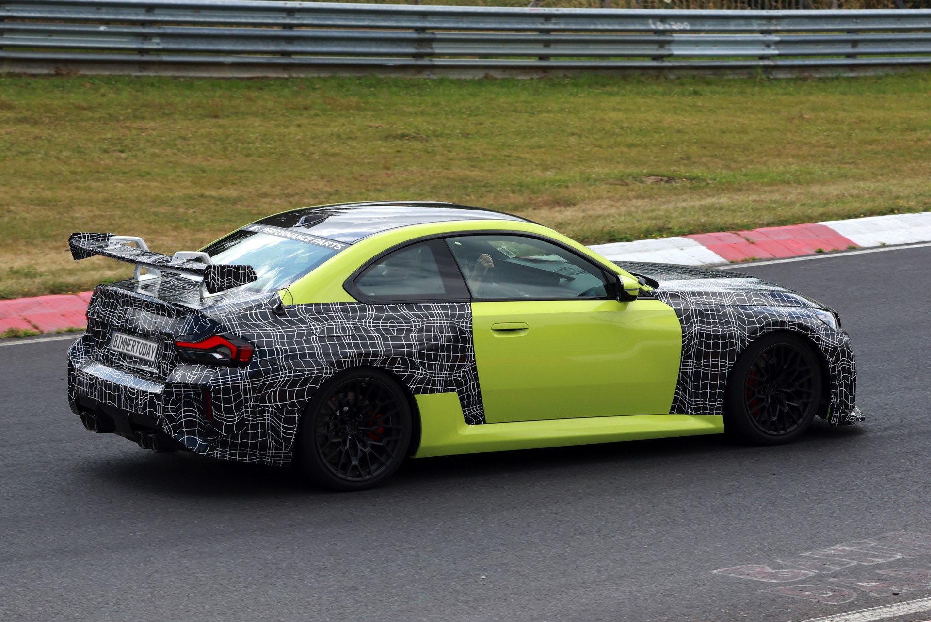 Die Fotos von SHProshots zeigen uns einen Prototypen in Sao Paulo Gelb, der vor allem an Front und Heck mit typischer Tarnfolie beklebt ist. Absoluter Hingucker ist der riesige Heckflügel, dessen Setup sich offenbar mit Hilfe mehrerer Schräubchen verändern lässt: Je nach Rennstrecke oder auch persönlicher Vorliebe kann der BMW M2 für mehr oder weniger Anpressdruck an der Hinterachse optimiert werden, was neben der Fahrstabilität in schnellen Kurven natürlich auch Einfluss auf die Höchstgeschwindigkeit nehmen wird. Gut erkennen lässt sich auch ein Frontsplitter, der auch die Front stärker an den Asphalt drückt. "