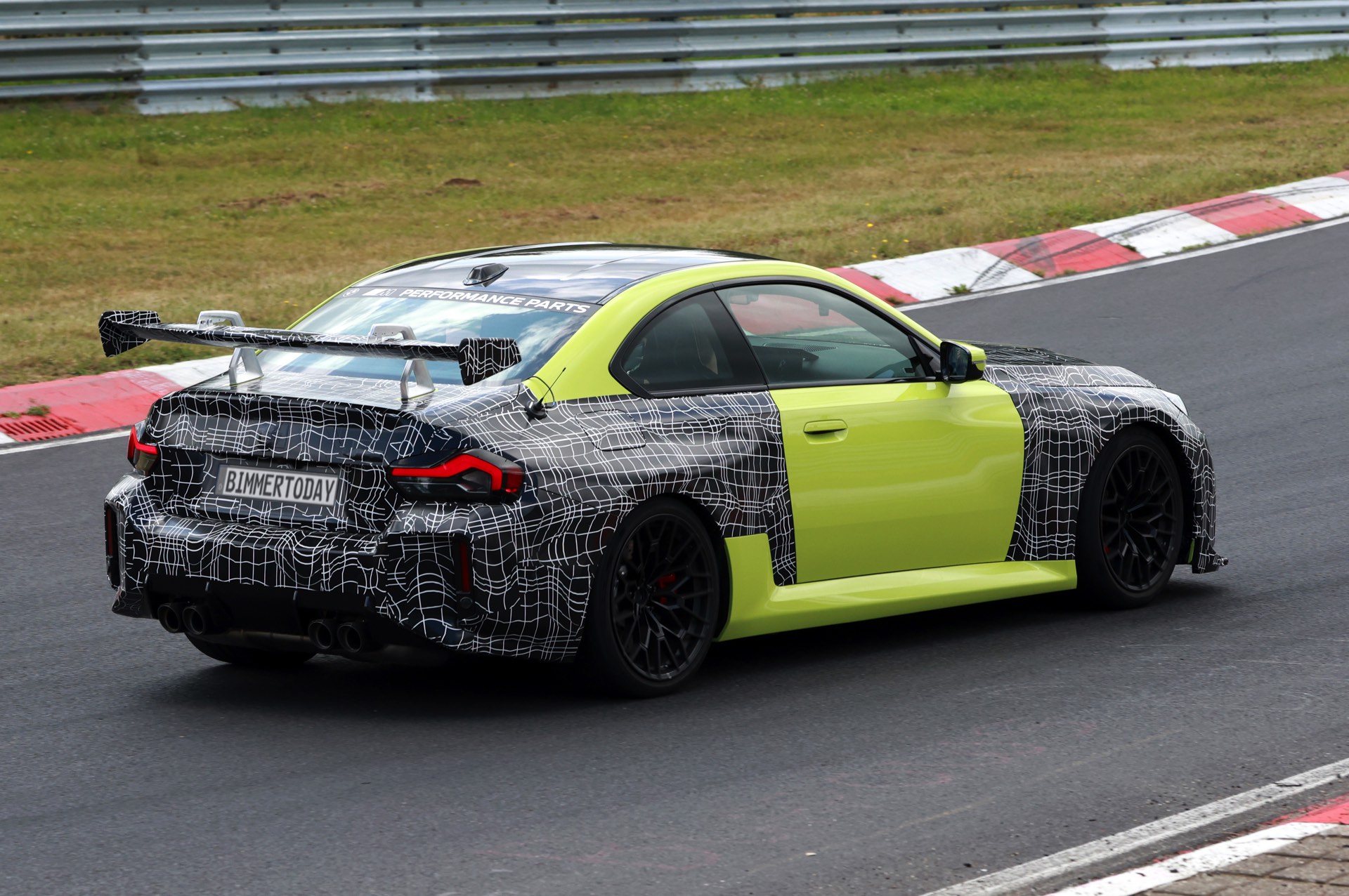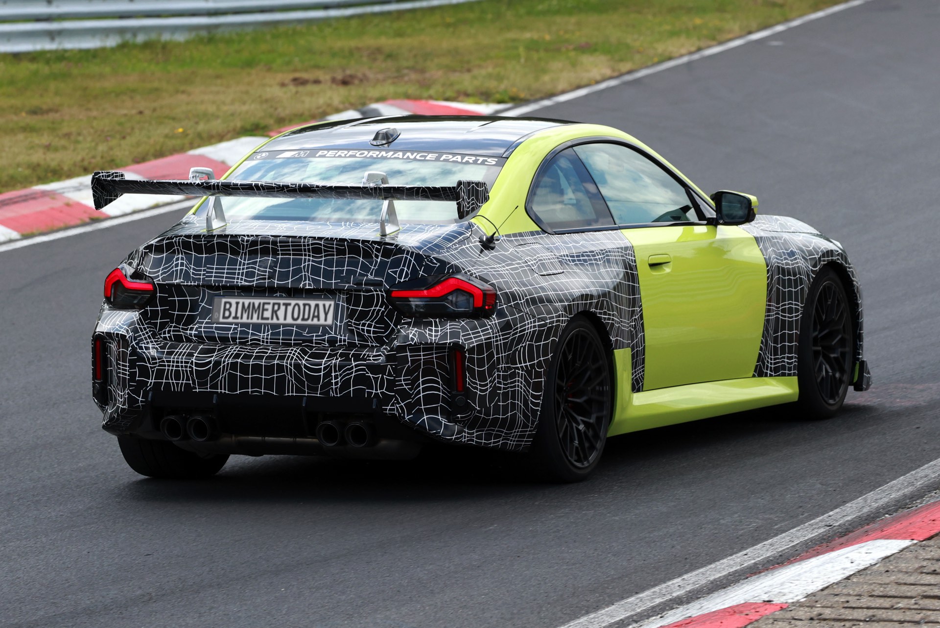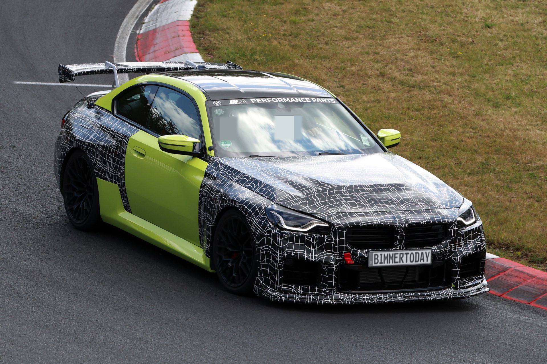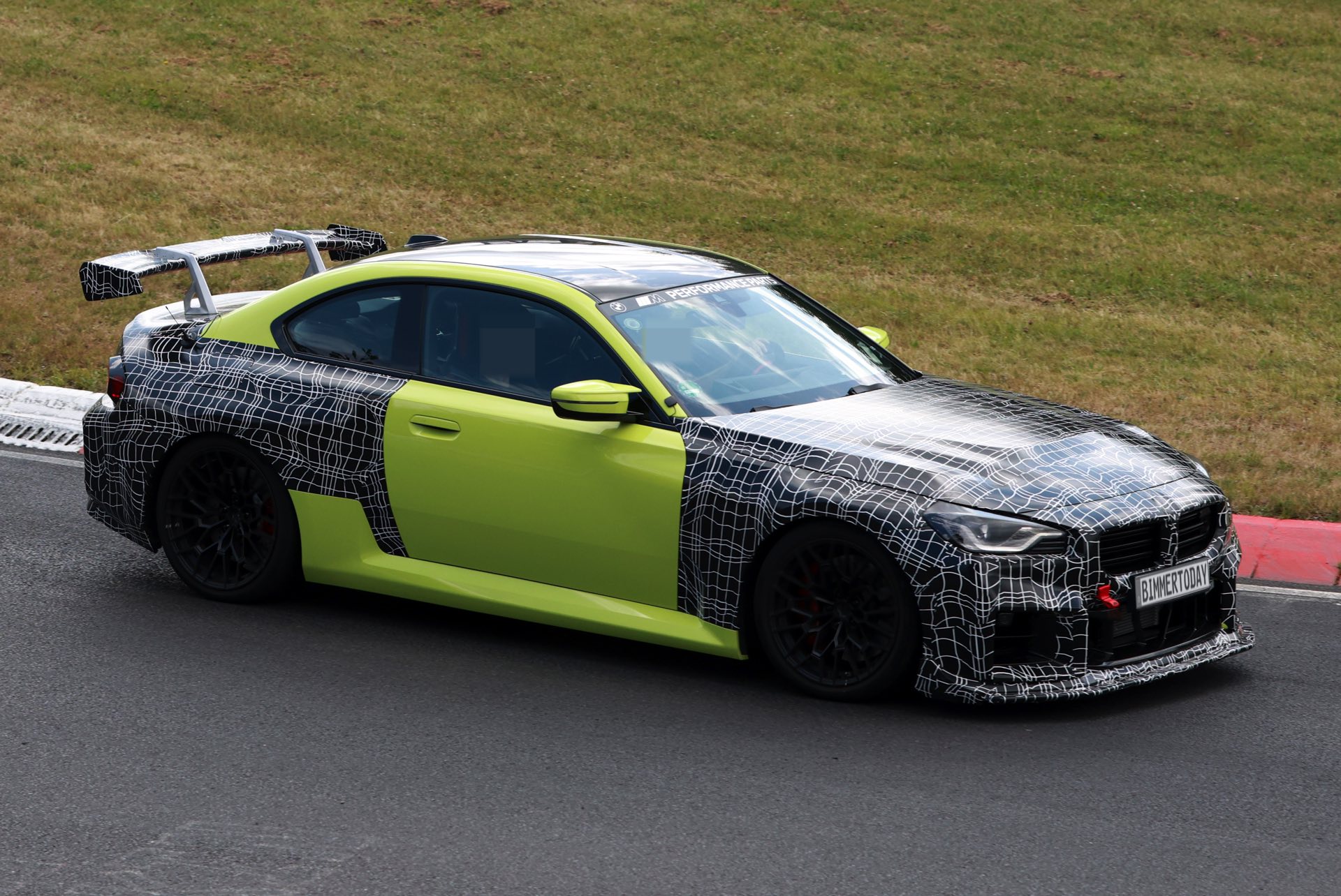 Die Fotos von SHProshots zeigen uns einen Prototypen in Sao Paulo Gelb, der vor allem an Front und Heck mit typischer Tarnfolie beklebt ist. Absoluter Hingucker ist der riesige Heckflügel, dessen Setup sich offenbar mit Hilfe mehrerer Schräubchen verändern lässt: Je nach Rennstrecke oder auch persönlicher Vorliebe kann der BMW M2 für mehr oder weniger Anpressdruck an der Hinterachse optimiert werden, was neben der Fahrstabilität in schnellen Kurven natürlich auch Einfluss auf die Höchstgeschwindigkeit nehmen wird. Gut erkennen lässt sich auch ein Frontsplitter, der auch die Front stärker an den Asphalt drückt. "