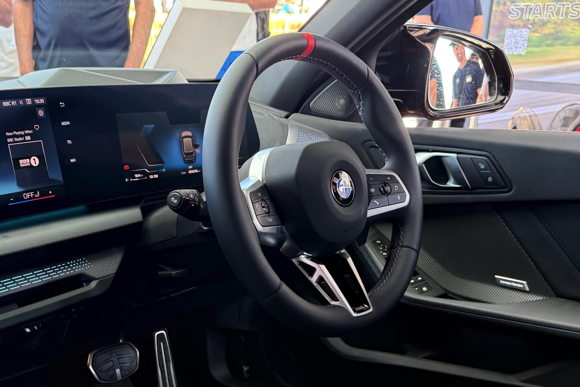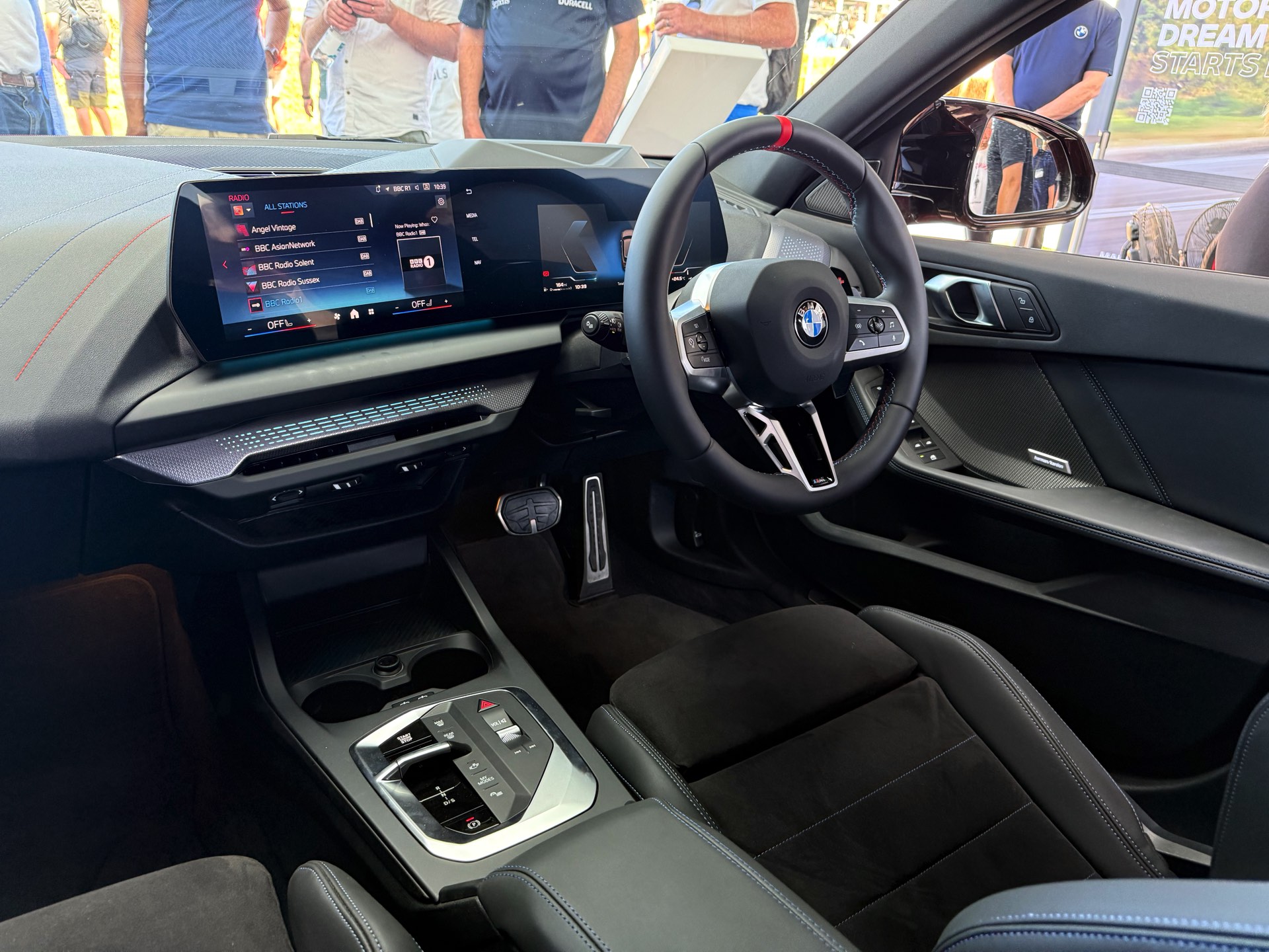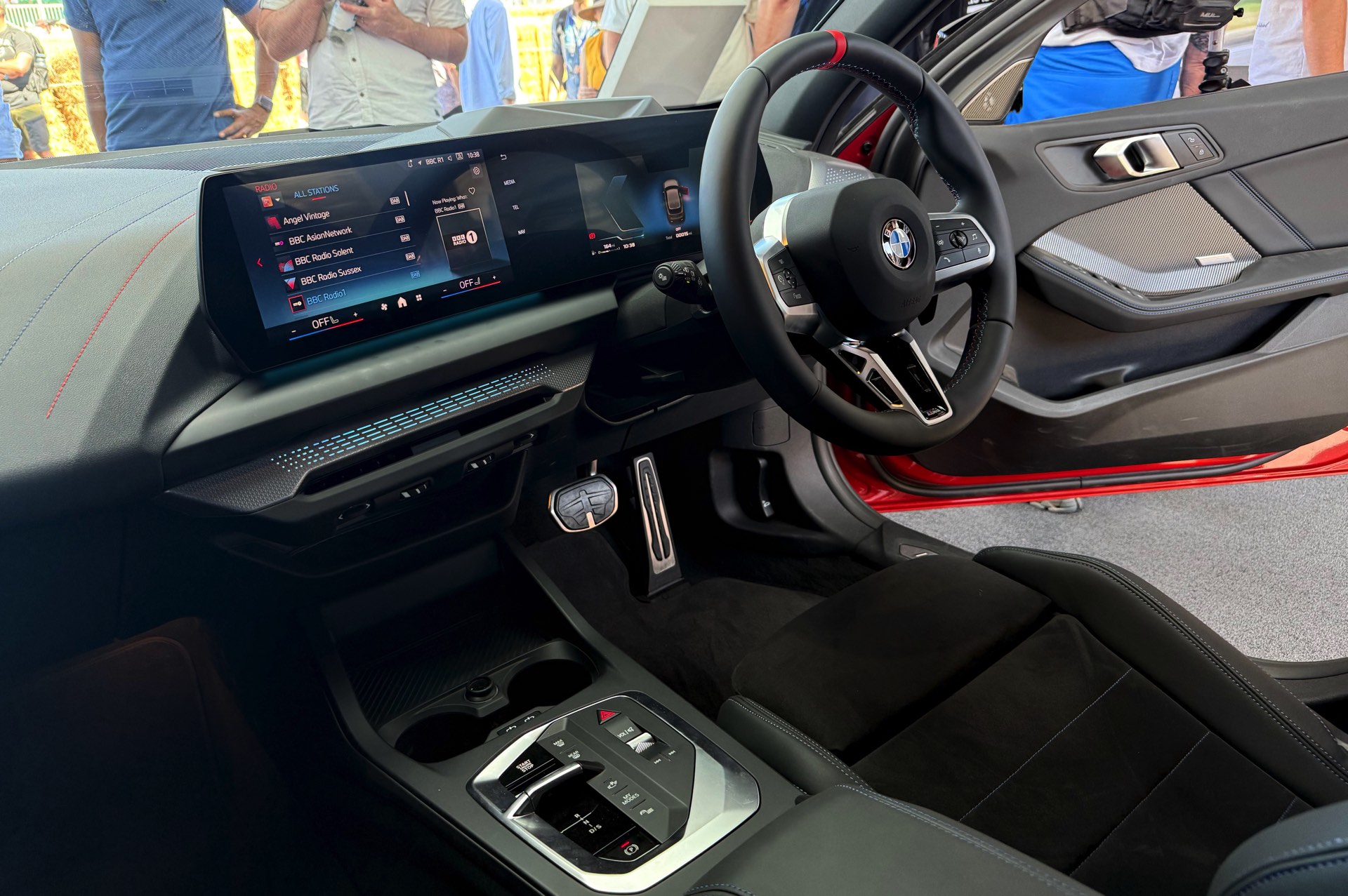 Im Innenraum sehen wir die optionalen M Sportsitze mit Alcantara-Bezug, integrierten Kopfstützen und beleuchtetem M-Logo, dazu kommen diverse Akzente in den Farben der M GmbH. Das Lenkrad mit roter 12-Uhr-Markierung ist exklusiv dem M135 vorbehalten.
