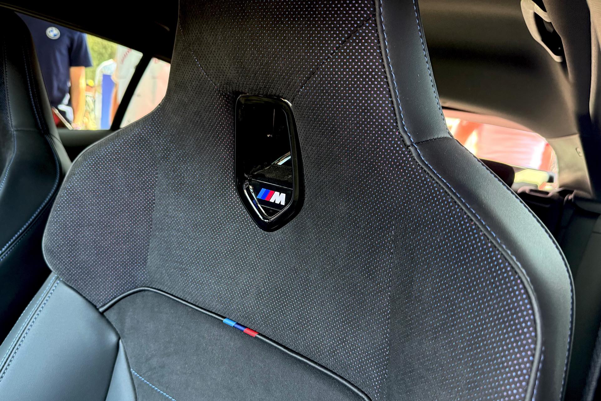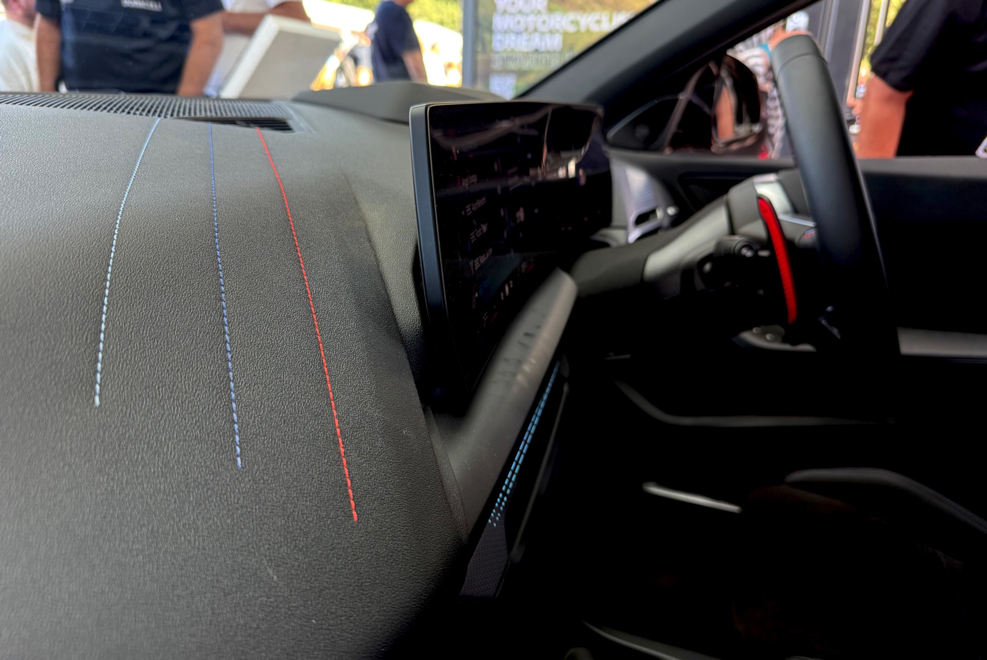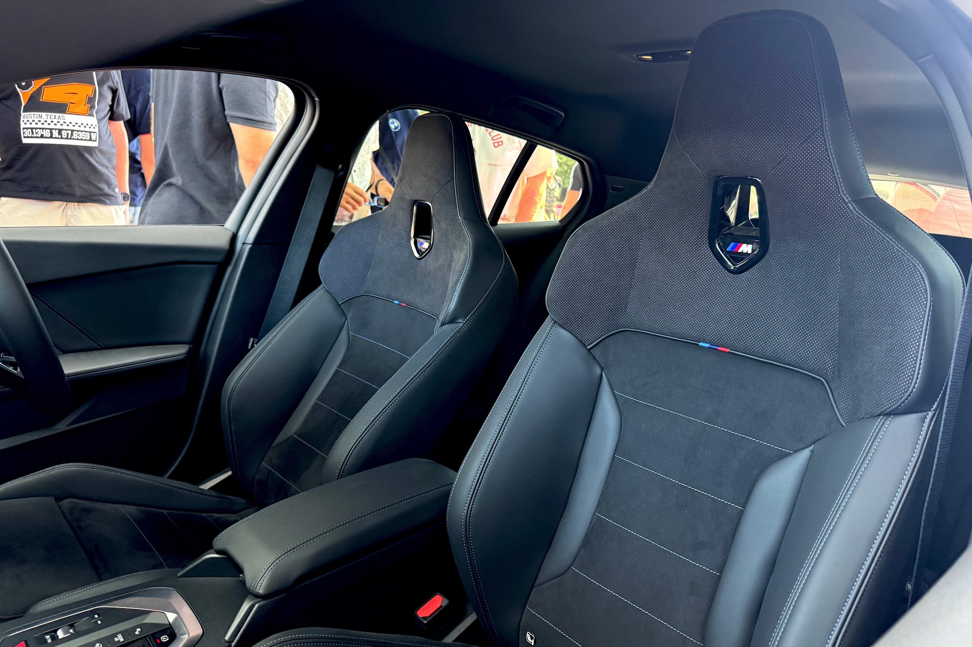 Im Innenraum sehen wir die optionalen M Sportsitze mit Alcantara-Bezug, integrierten Kopfstützen und beleuchtetem M-Logo, dazu kommen diverse Akzente in den Farben der M GmbH. Das Lenkrad mit roter 12-Uhr-Markierung ist exklusiv dem M135 vorbehalten.