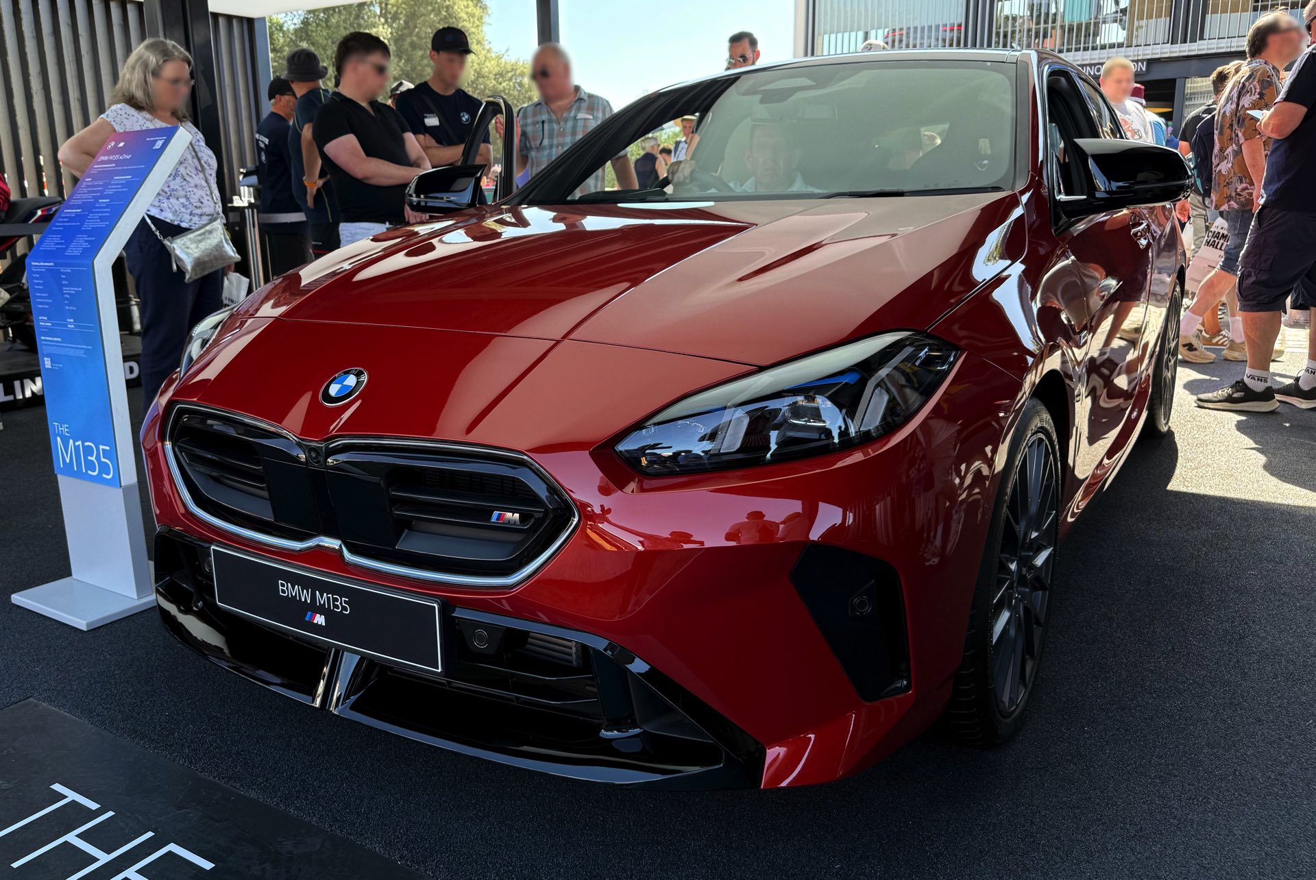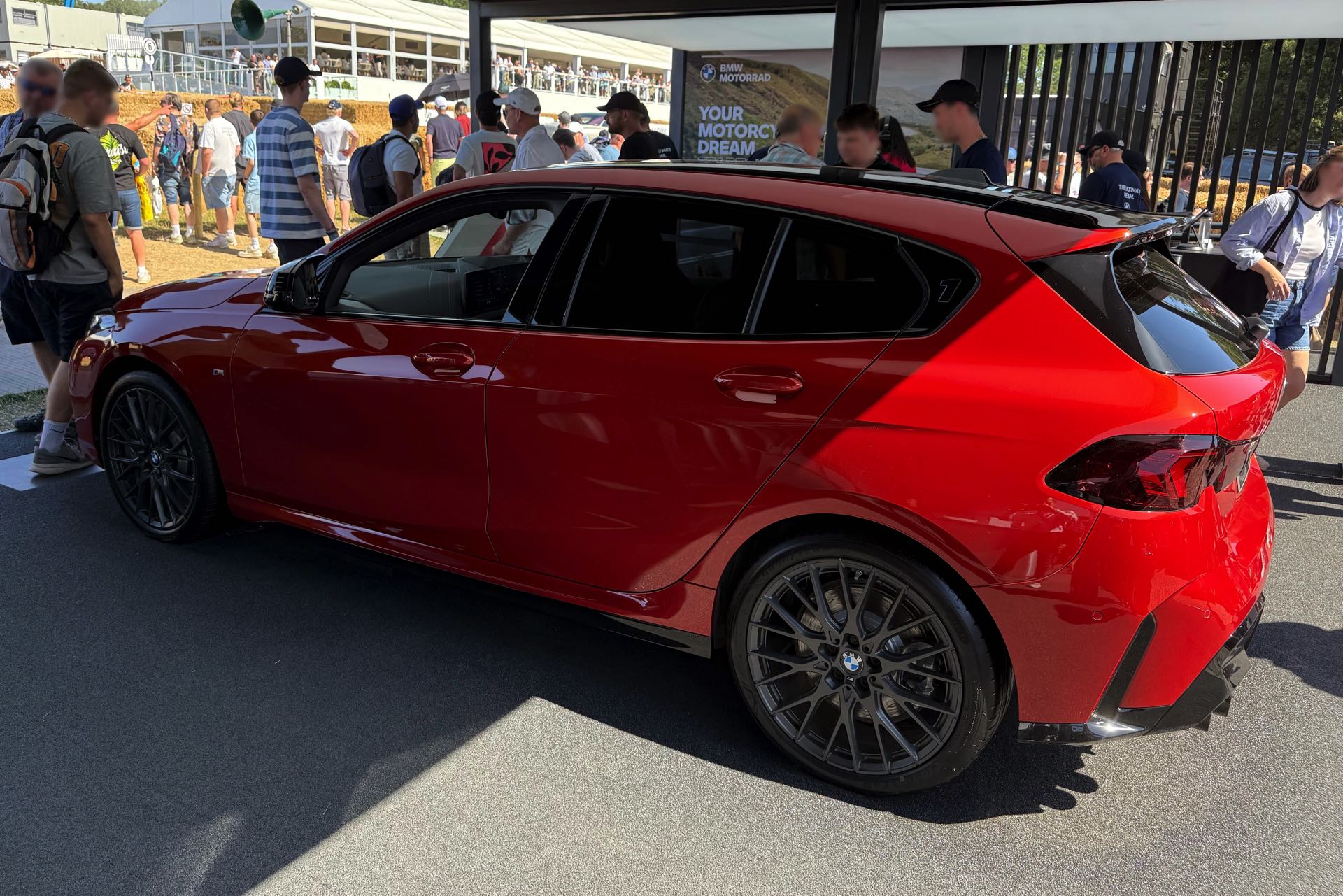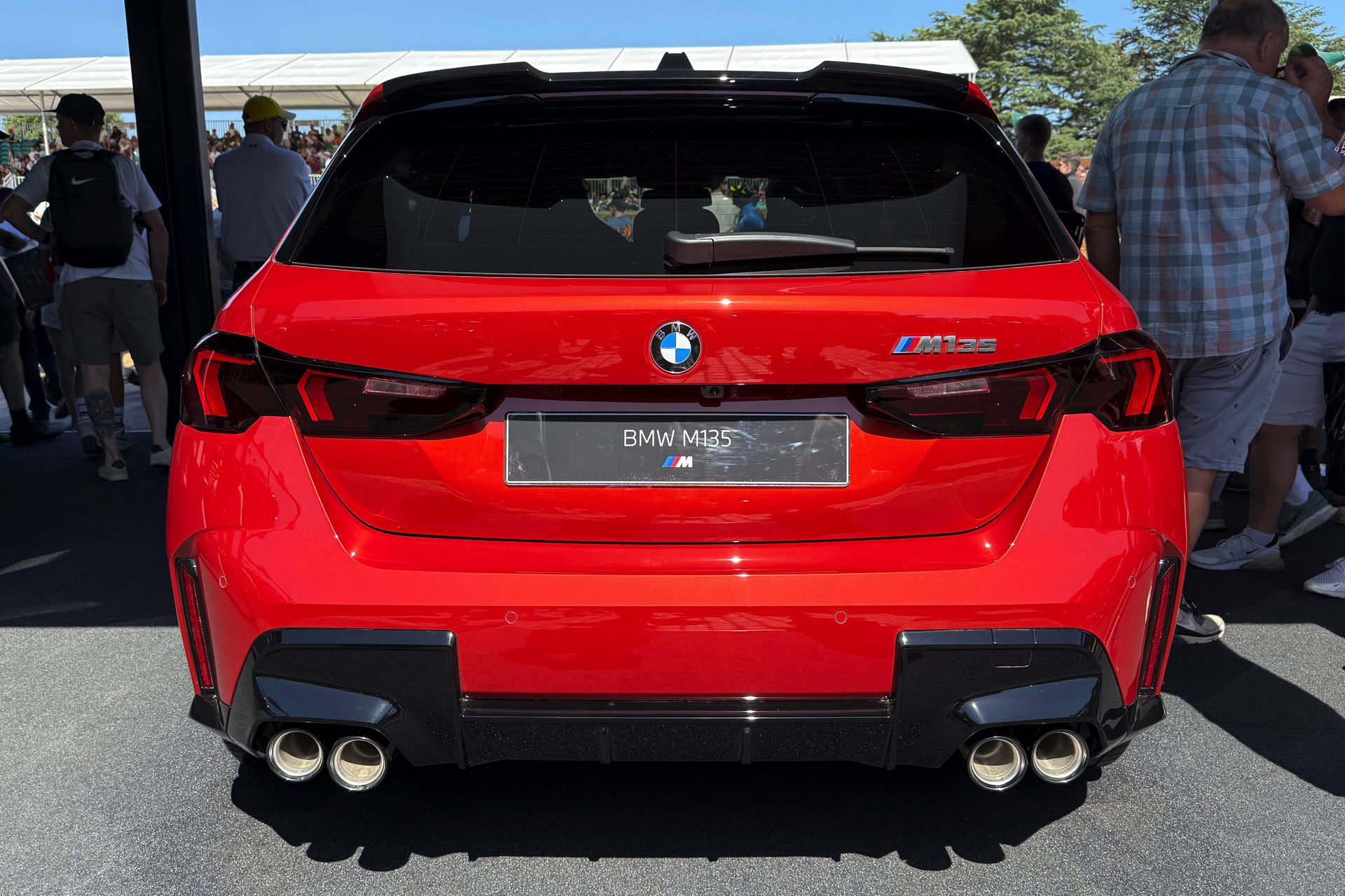 Für den aktuellen BMW 1er ist Sakhir Orange III als Sonderwunsch-Farbe über BMW Individual unter dem Farbcode P93 bestellbar, in Deutschland werden für die Lackierung 3.900 Euro Aufpreis fällig. Der in Goodwood gezeigte M135 xDrive kombiniert die Lackierung mit den 19 Zoll großen Schmiederädern Y-Speiche 1085 M mit Finish in Anthrazit, die auf Wunsch auch ab Werk mit Sportreifen erhältlich sind. Hinter den Felgen fallen erst auf den zweiten Blick die grau lackierten Bremssättel der 19 Zoll M Compound-Bremse ins Auge, die vor allem bei intensiver Nutzung mit vielen starken Bremsungen in kurzer Zeit deutlich mehr Ausdauer bietet. "