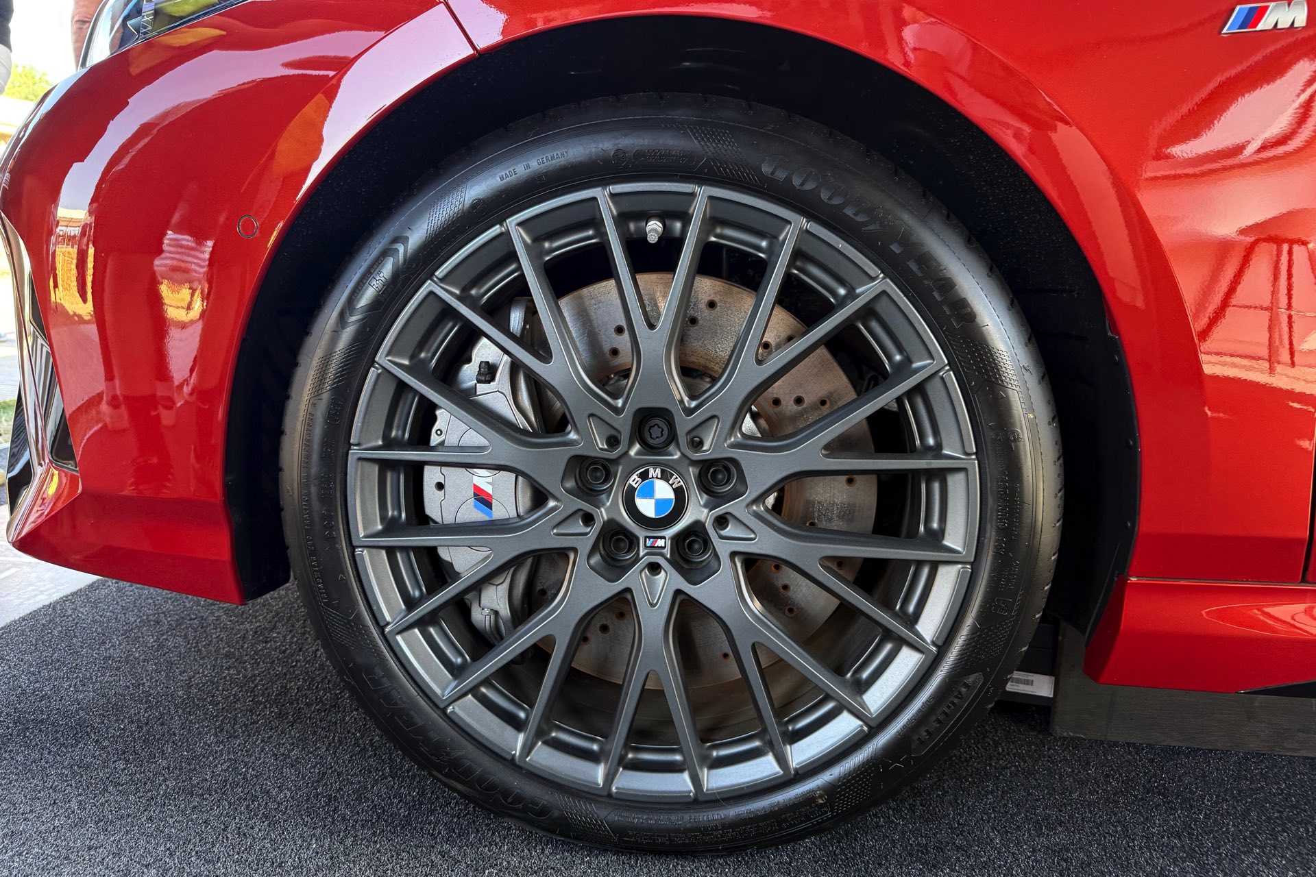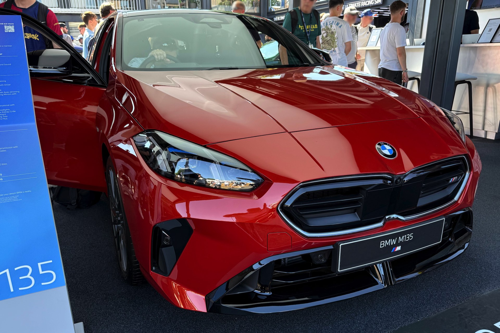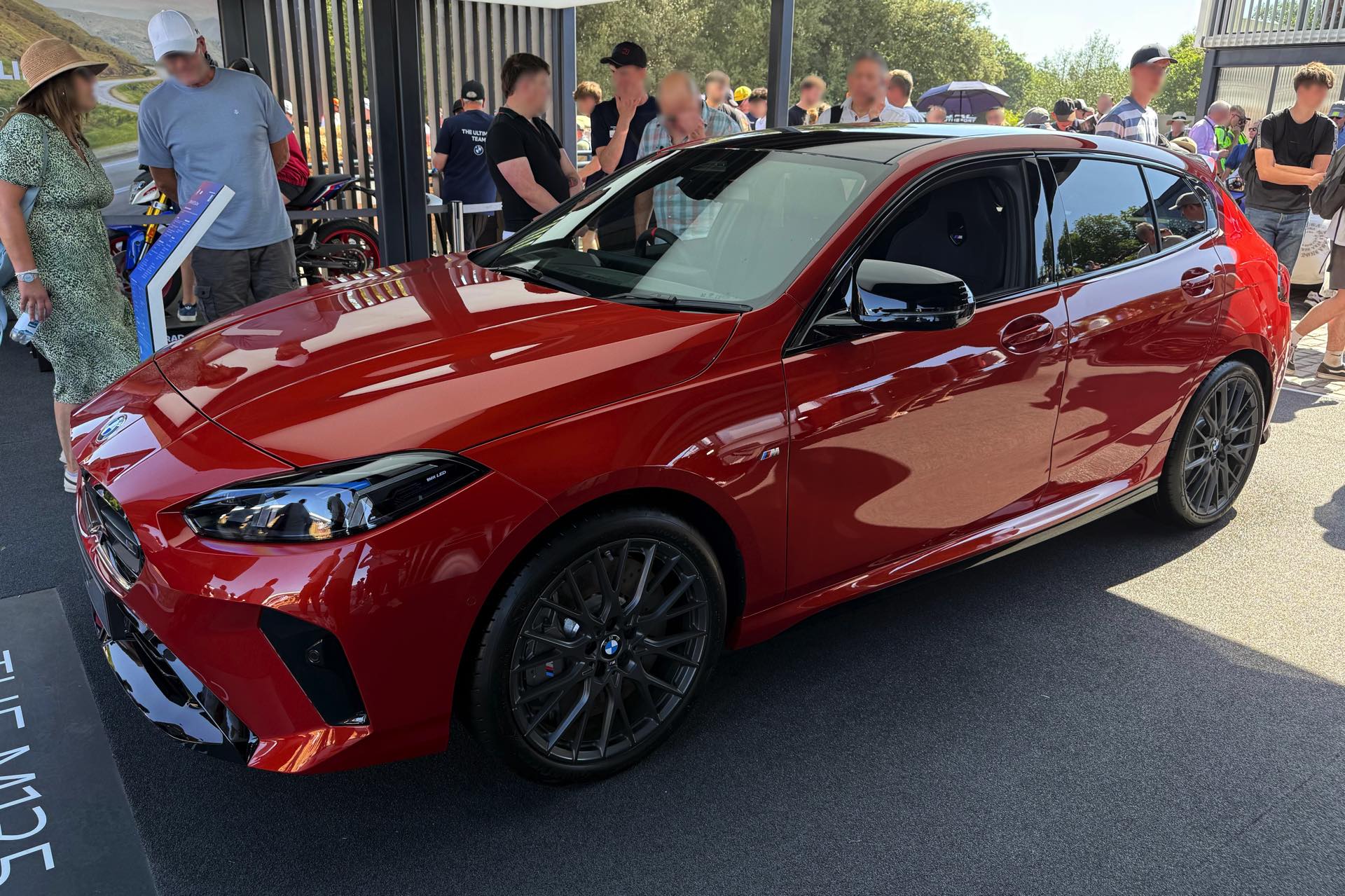 Für den aktuellen BMW 1er ist Sakhir Orange III als Sonderwunsch-Farbe über BMW Individual unter dem Farbcode P93 bestellbar, in Deutschland werden für die Lackierung 3.900 Euro Aufpreis fällig. Der in Goodwood gezeigte M135 xDrive kombiniert die Lackierung mit den 19 Zoll großen Schmiederädern Y-Speiche 1085 M mit Finish in Anthrazit, die auf Wunsch auch ab Werk mit Sportreifen erhältlich sind. Hinter den Felgen fallen erst auf den zweiten Blick die grau lackierten Bremssättel der 19 Zoll M Compound-Bremse ins Auge, die vor allem bei intensiver Nutzung mit vielen starken Bremsungen in kurzer Zeit deutlich mehr Ausdauer bietet. "