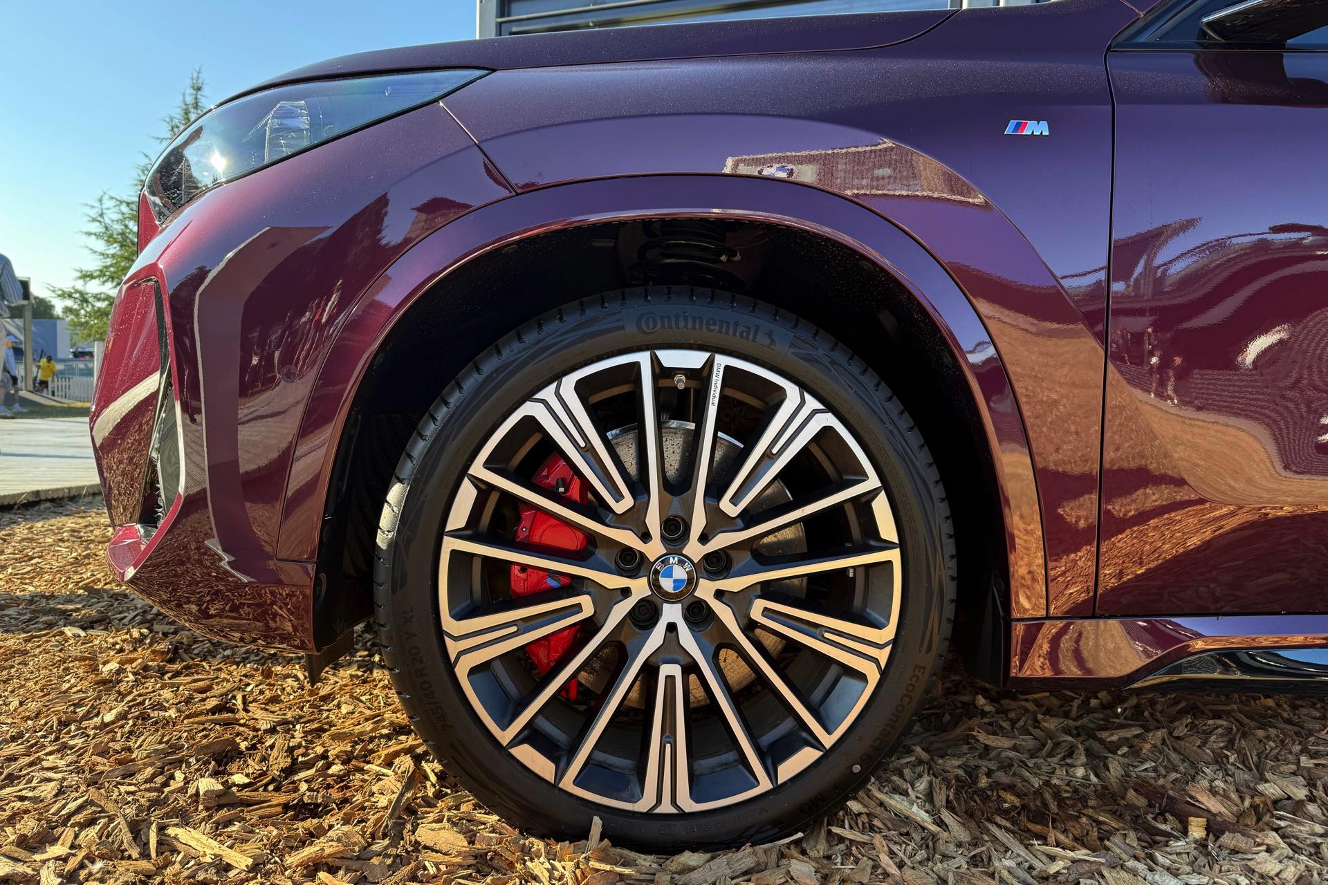 Auch unterhalb von Fahrradträger und Dachbox hat der gezeigte BMW iX1 (U11) viel zu bieten, denn dank der Lackierung in der Sonderwunsch-Farbe Wildberry Metallic (Farbcode T09) fällt er in praktisch jeder Umgebung sofort ins Auge und hebt sich deutlich vom Serien-Look ab. Neben der 3.900 Euro Aufpreis kostenden Individual-Lackierung trägt der Elektro-X1 auch das M Sport Pro-Paket mit vielen schwarzen Details sowie die 20 Zoll großen BMW Individual Leichtmetallräder Vielspeiche 869. Dass das BMW-Logo an allen vier Rädern aufrecht steht, ist ebenfalls kein Zufall – denn die 20-Zöller werden mit den ‘Fixed Hub Caps’ der BMW Nabenabdeckung feststehend zusätzlich aufgewertet.