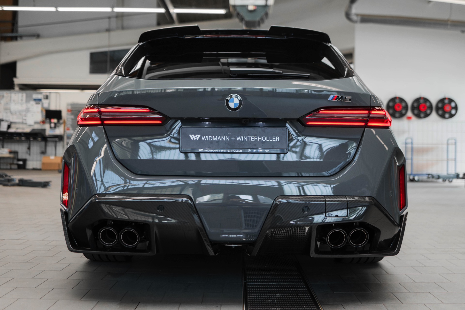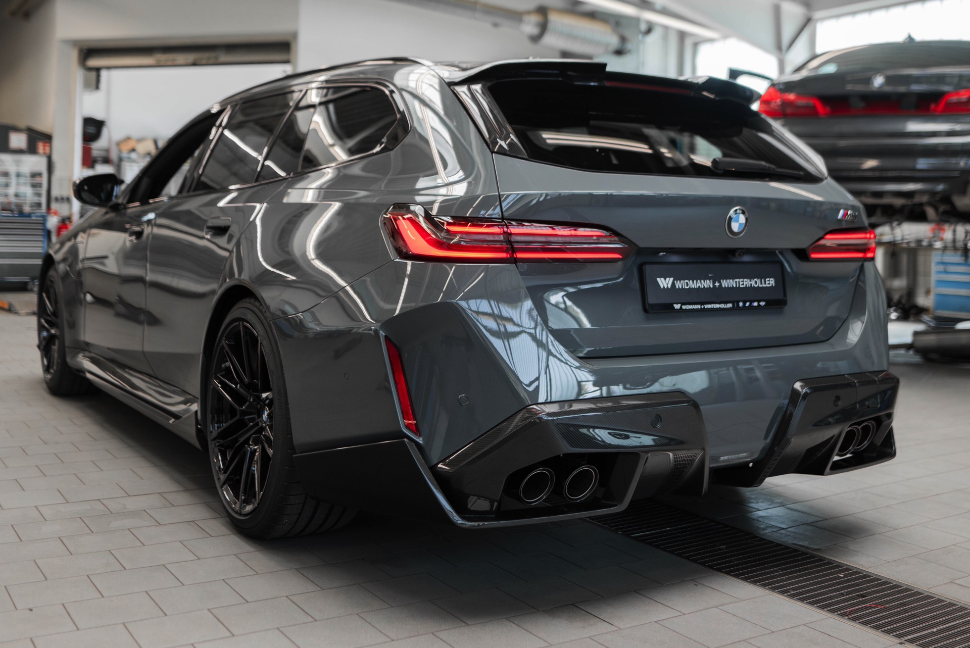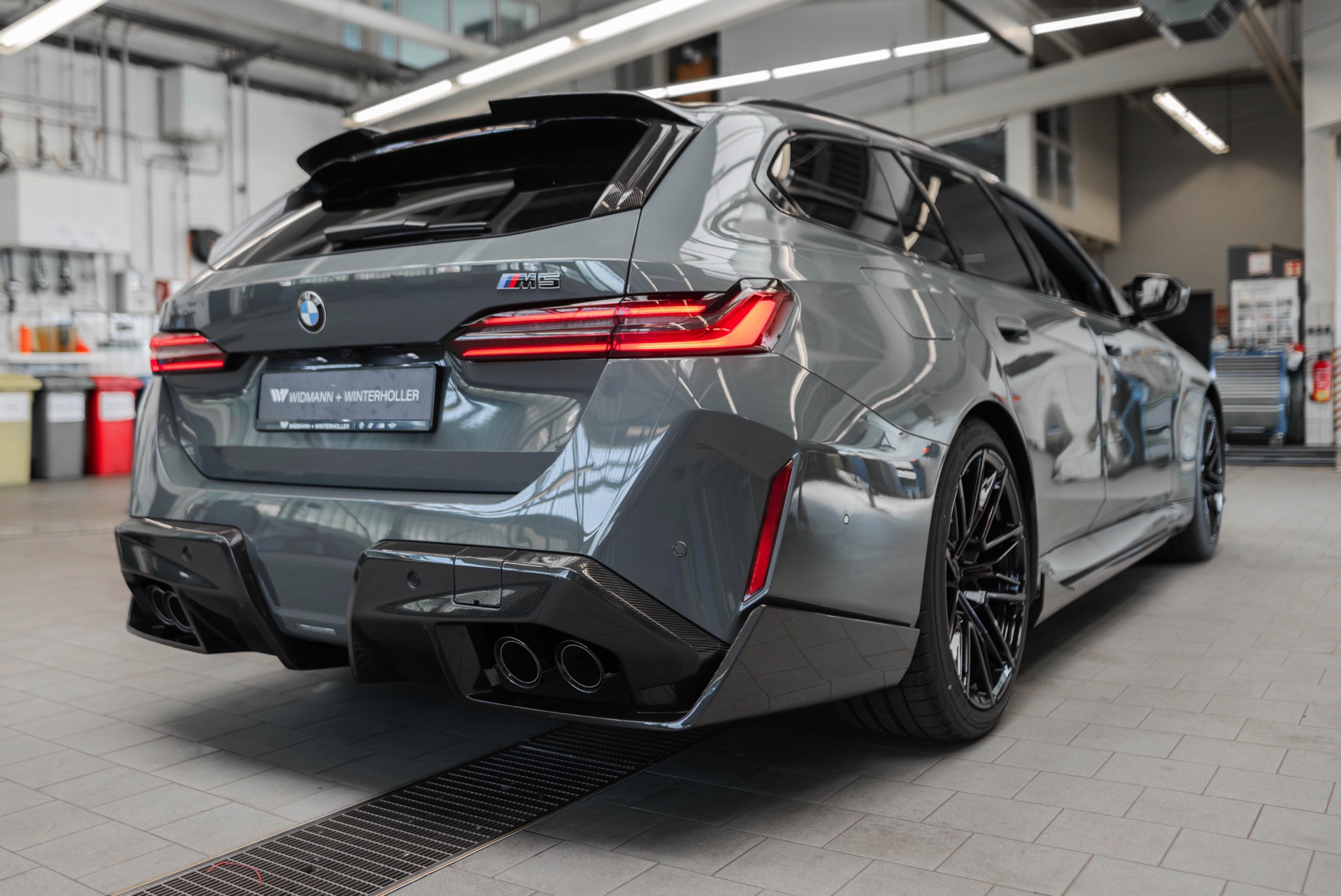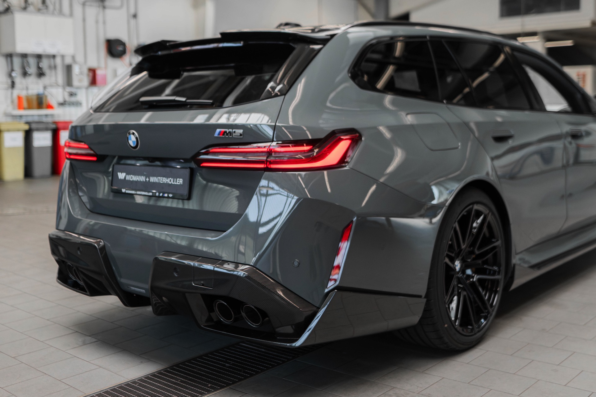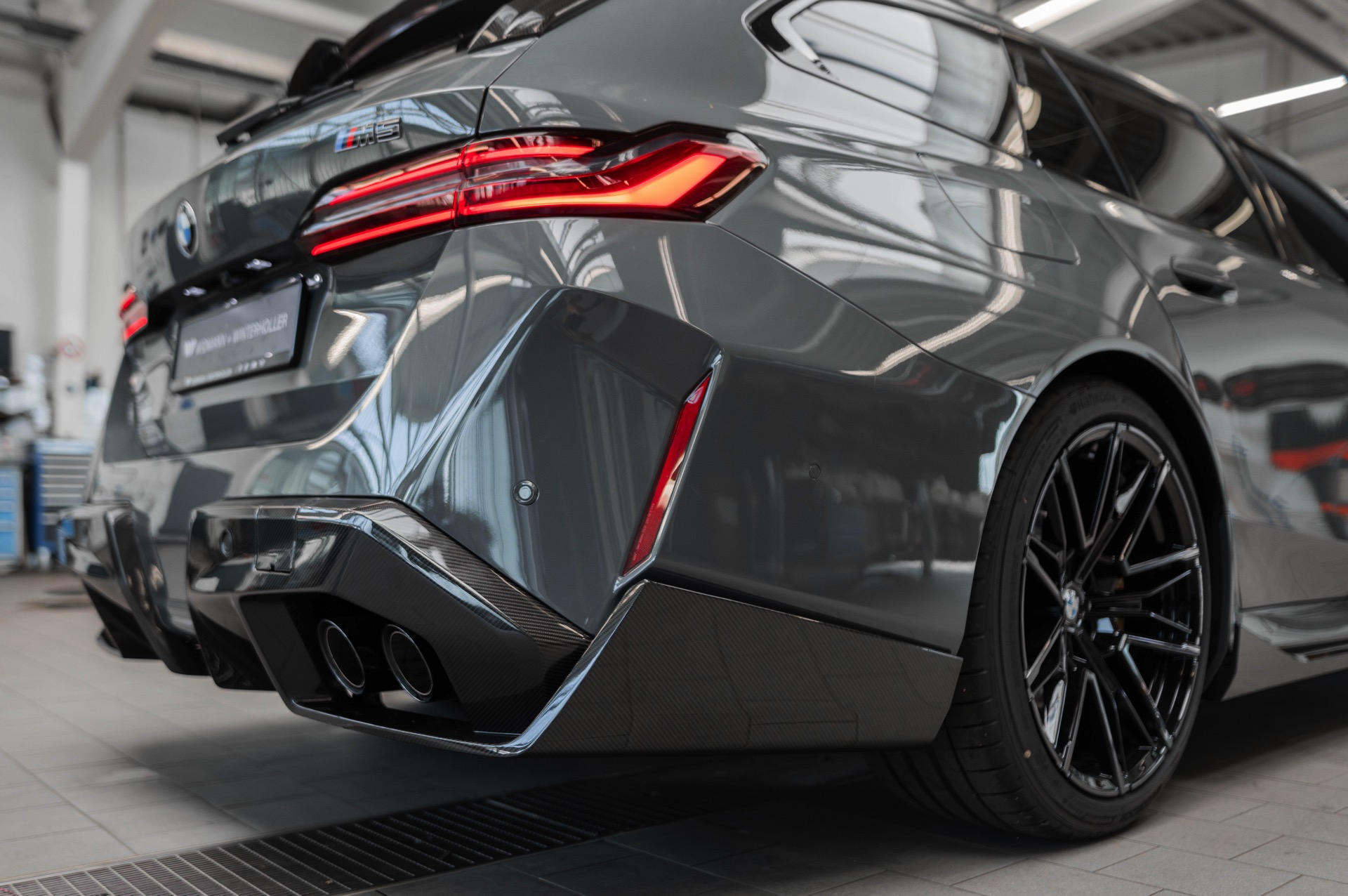 Wie der aufgerüstete BMW M5 Touring mit seiner 5.900 Euro teuren Individual-Lackierung in Grigio Telesto sowie Frontaufsatz, Schwelleraufsätzen, Heckdiffusor und Heckfinnen aus Carbon direkt nach der Montage des Zubehörs wirkt, zeigen diese Fotos: