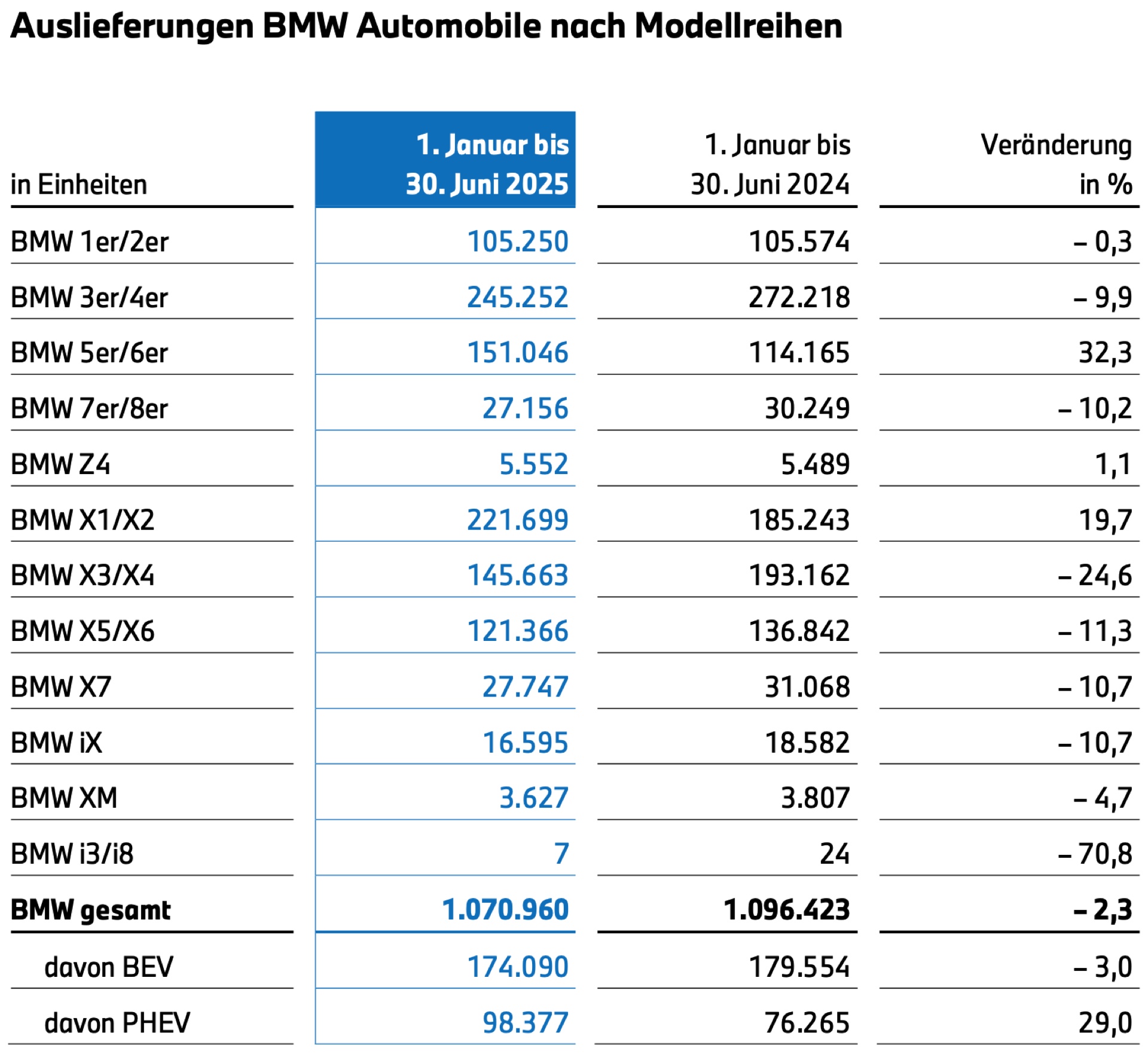 Beim Blick auf die Baureihen, der wie üblich mit den Quartalszahlen veröffentlicht wird, zeigt die Mittelklasse erneut ihre Stärke: Mit weltweit 245.252 Einheiten im 1. Halbjahr 2025 liegen 3er und 4er zwar knapp 10 Prozent unter Vorjahr, aber dennoch vor allen anderen Baureihen. Dahinter folgen die Kompakt-SUV X1 und X1, die 5er-Reihe sowie die Mittelklasse-SUV X3 und X4.