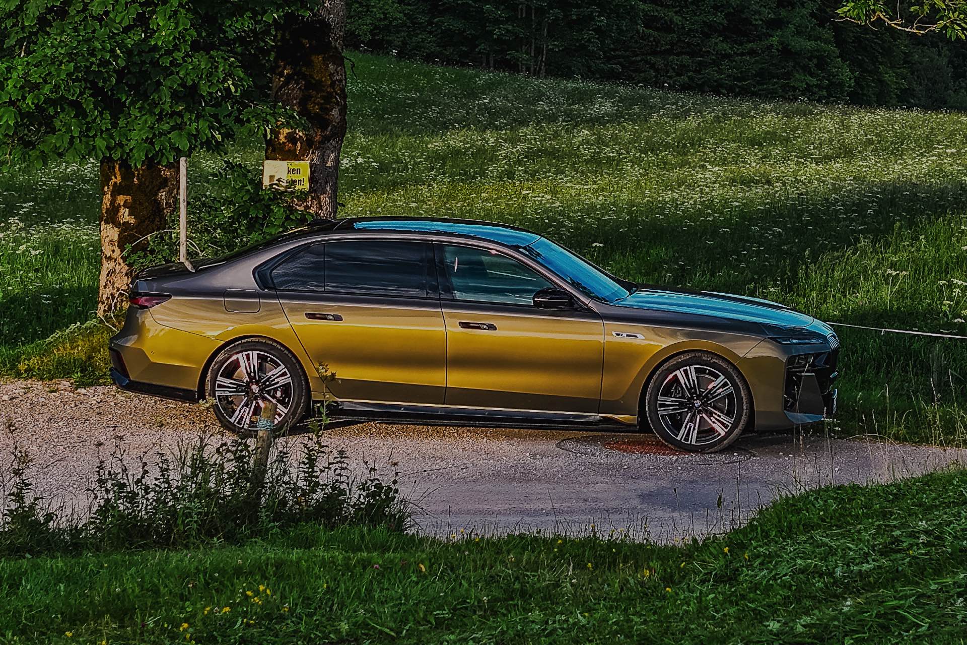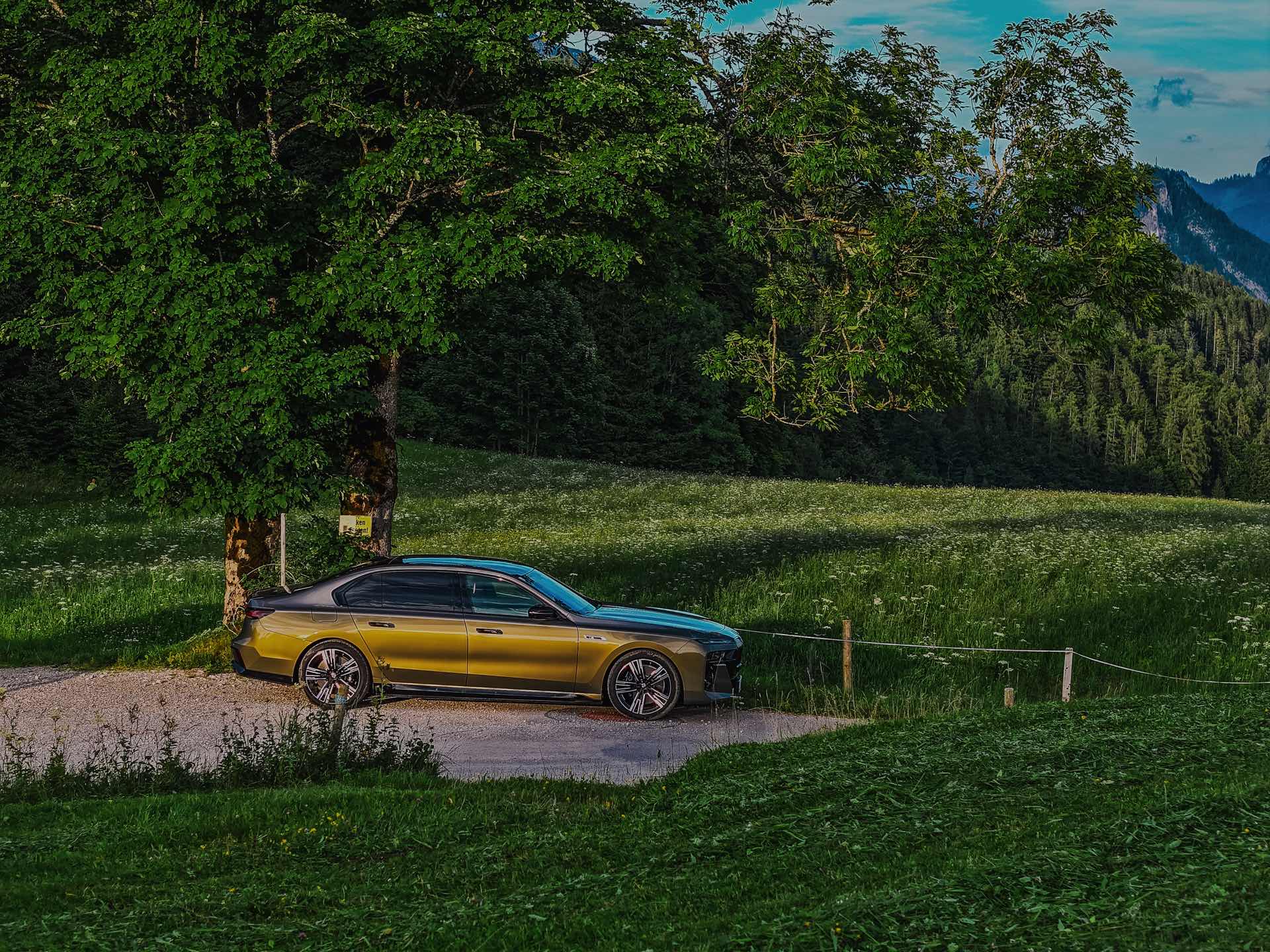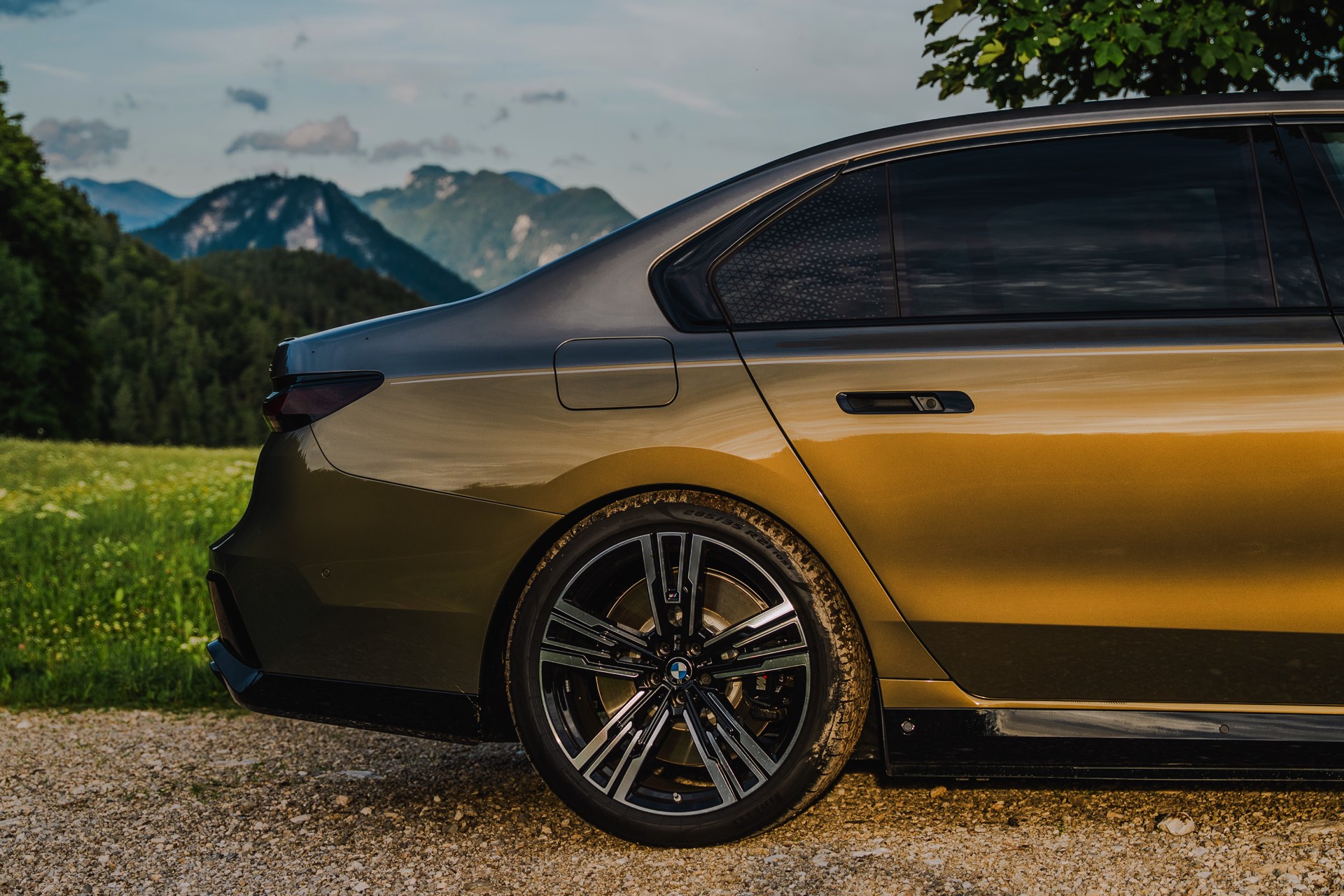 Eine ganz besondere Kombination sehen wir nun auf Fotos von Felix Graffweg, der einen einzigartigen 7er für BMW Austria in Szene gesetzt hat. Als Hauptfarbe der Two Tone-Lackierung kommt Messing Metallic zum Einsatz, das unter dem Farbcode 621 auch für andere Baureihen erhältlich ist. Die obere Hälfte der Limousine ist in einem vergleichsweise sanften Kontrast in Oxidgrau Metallic lackiert, was je nach Lichteinfall eine noch speziellere Wirkung entfaltet als es die alternative Zweifarb-Gestaltung in Messing und Schwarz jemals könnte.