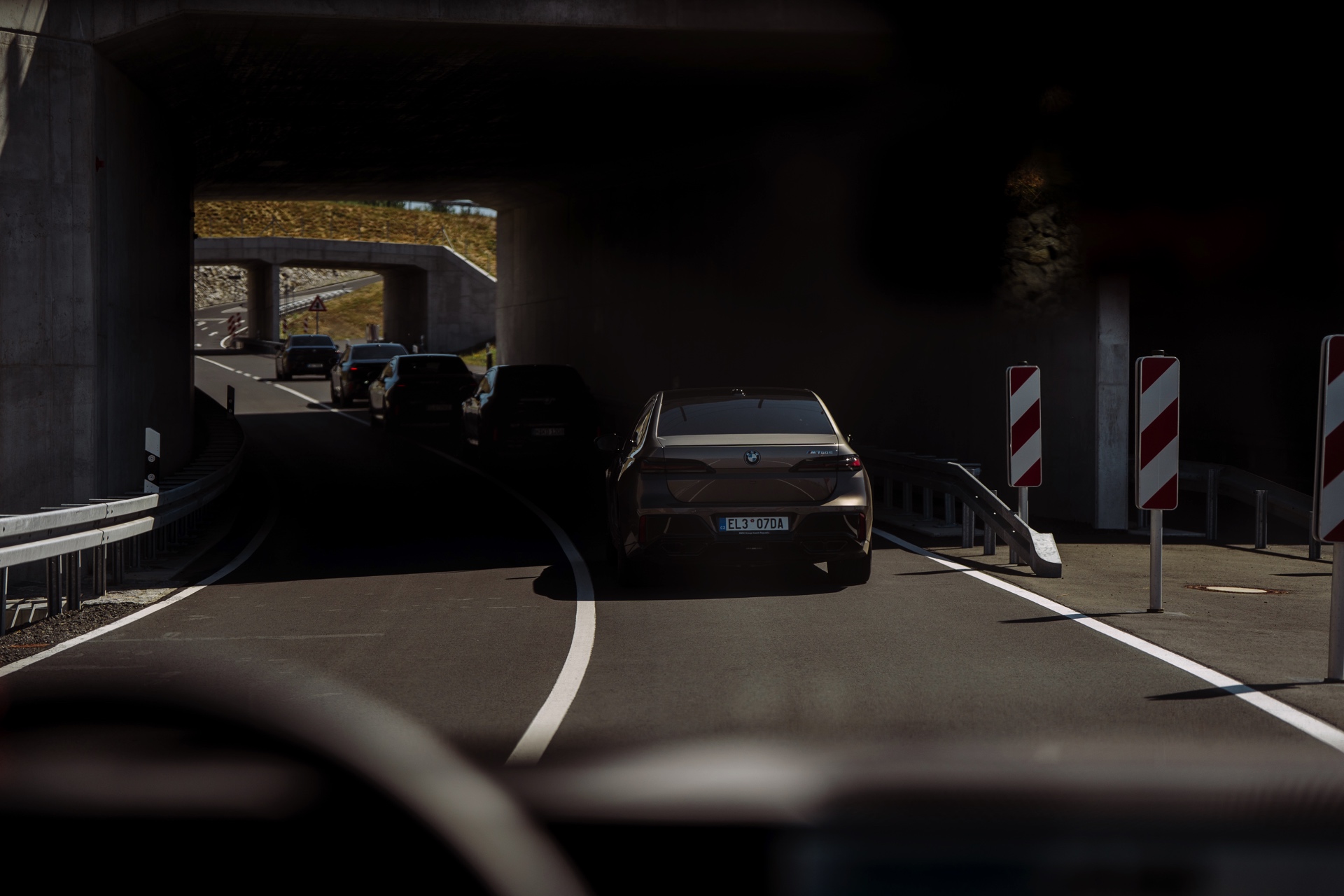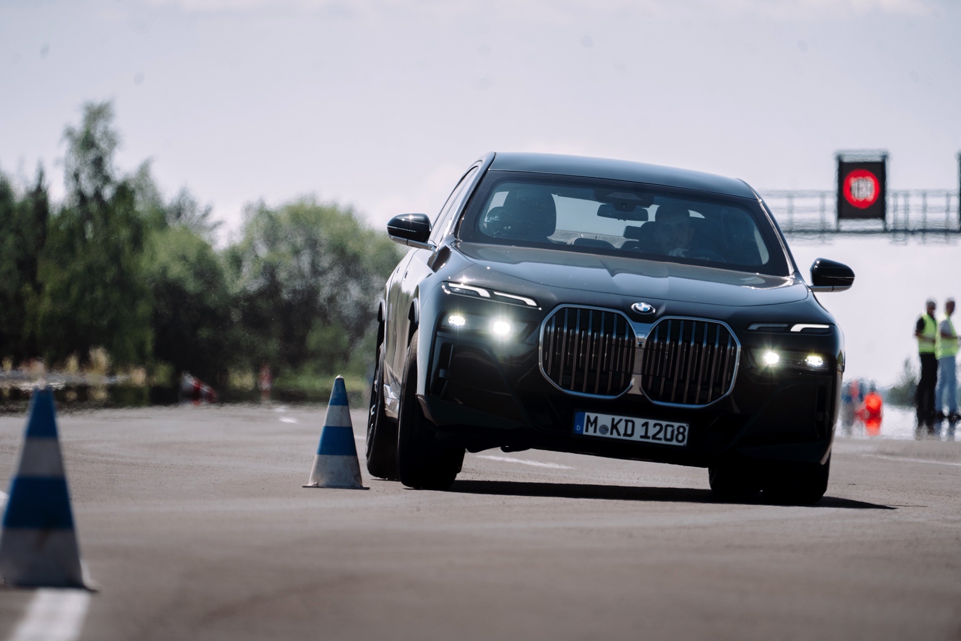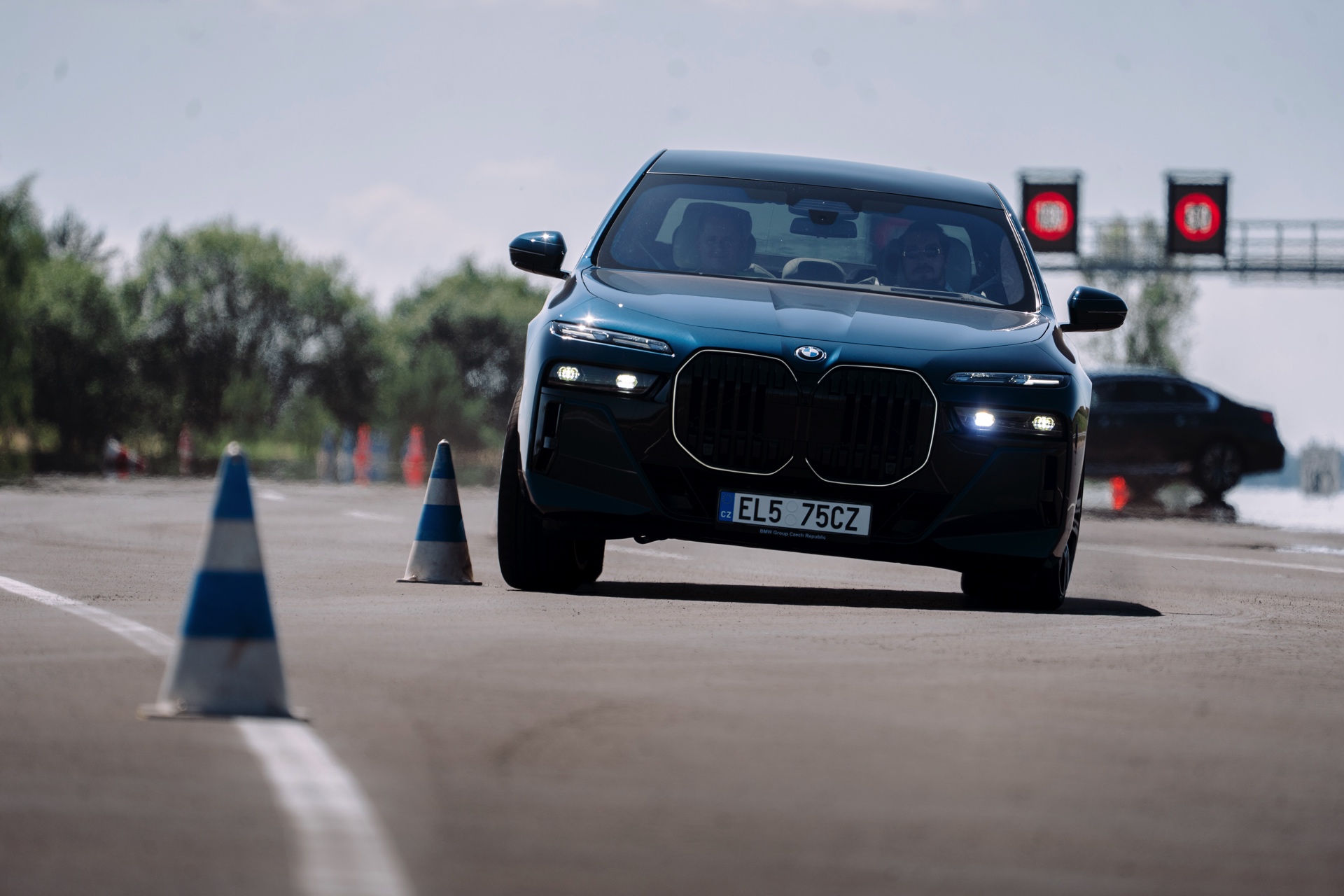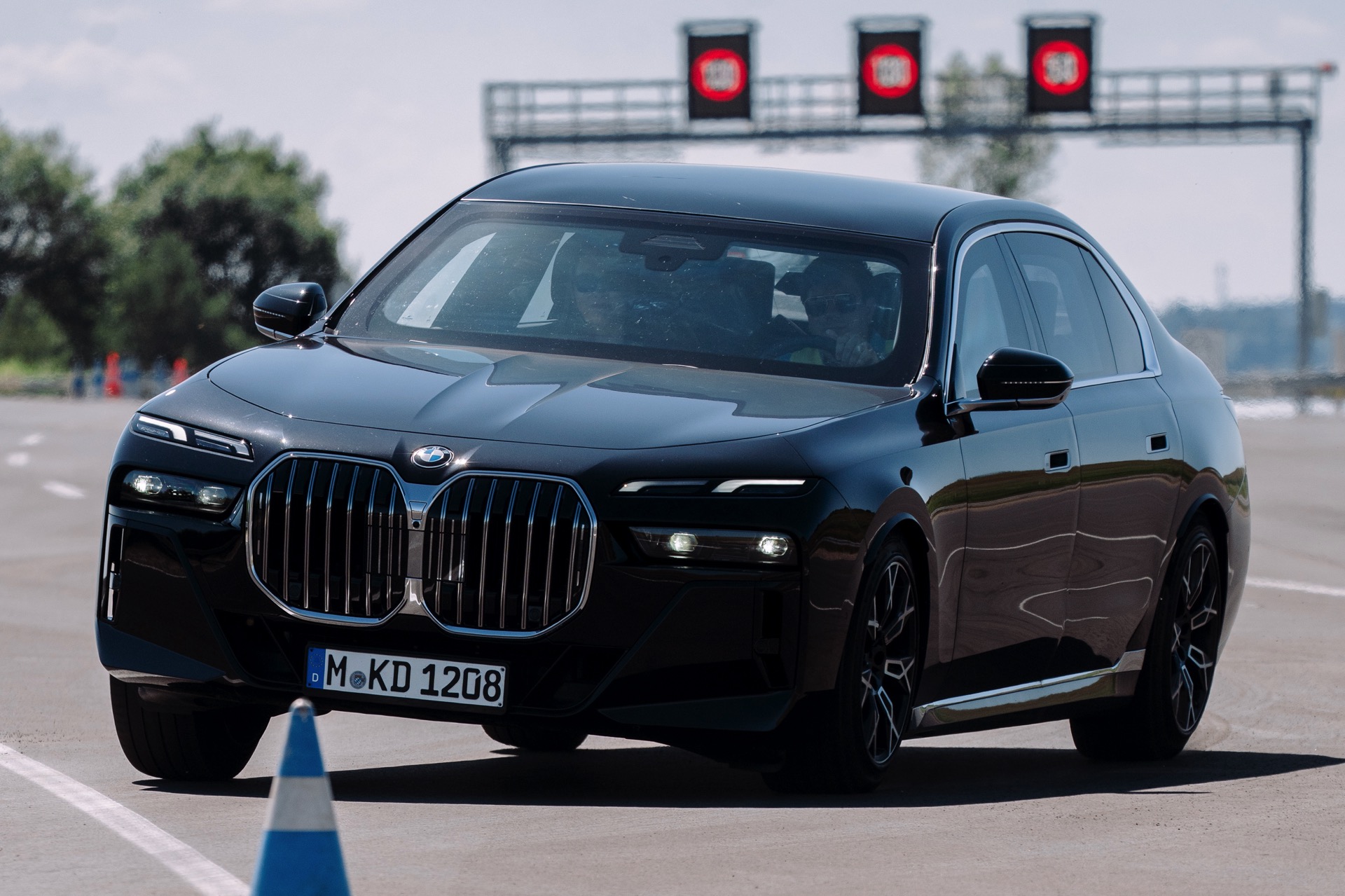 Die aktuellen Fotos aus Tschechien liefern uns einen kleinen Eindruck davon, wie enorm die Aufbaubewegungen der fast 5,40 Meter langen Luxus-Limousine bei einer dynamischen Slalom-Fahrt werden können. Kein Wunder: Der gepanzerte 7er soll im Alltag überragenden Komfort bieten und kann deshalb nicht mit einem straffen Sportfahrwerk ausgerüstet werden. Wenn die rund 4,4 Tonnen des BMW 7er Protection dann plötzlich die Richtung wechseln sollen, sind sichtbare Verlagerungen des Gewichts unvermeidbar. Das zeigt sich auch auf den Fotos von der maximalen Verzögerung bei einer Vollbremsung, denn natürlich geht die Front bei diesem Manöver deutlich in die Knie.
