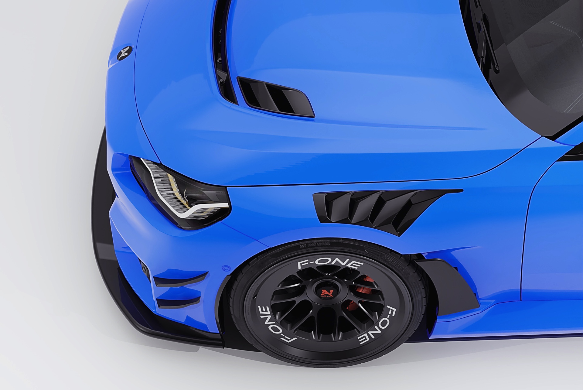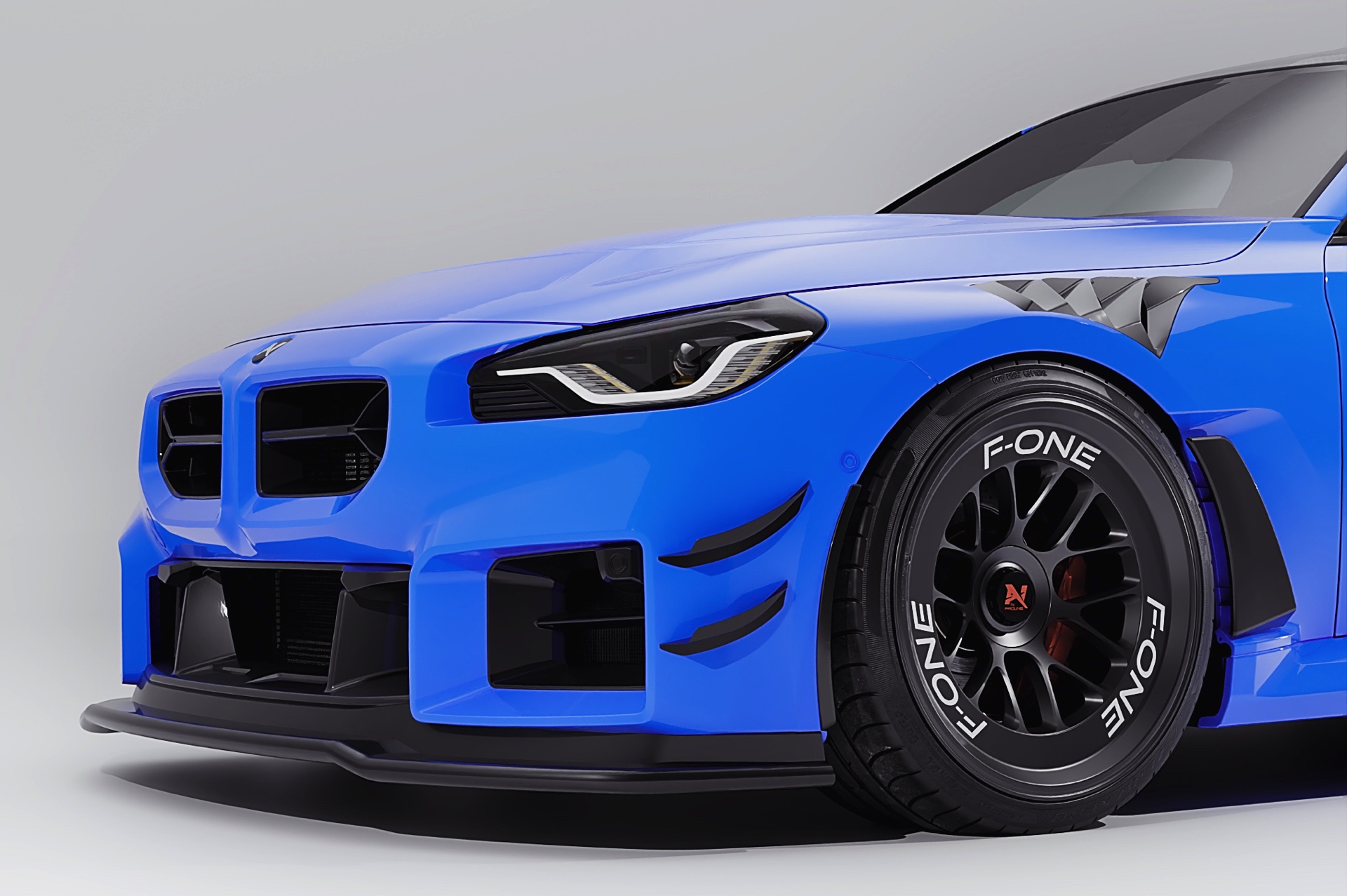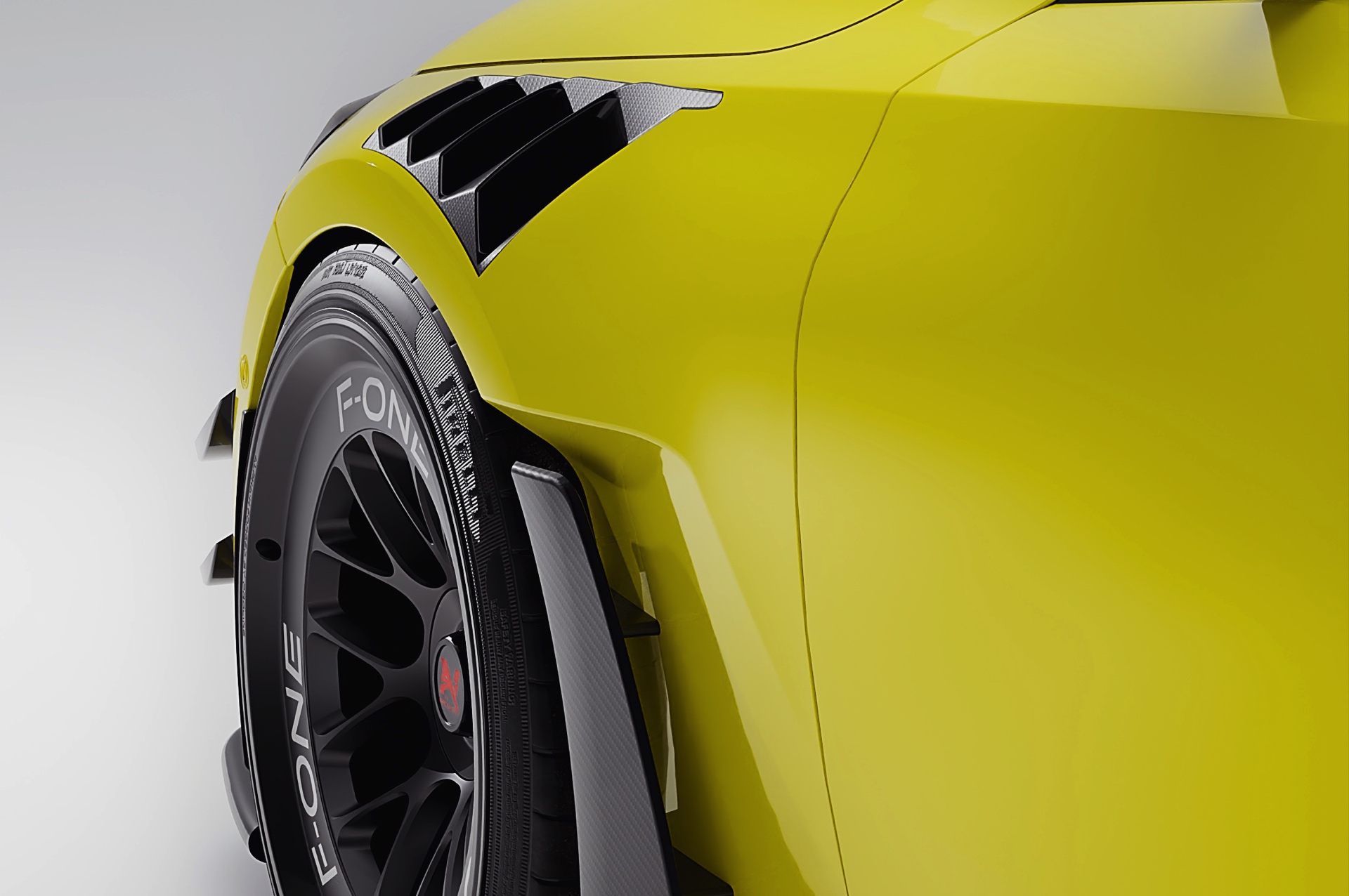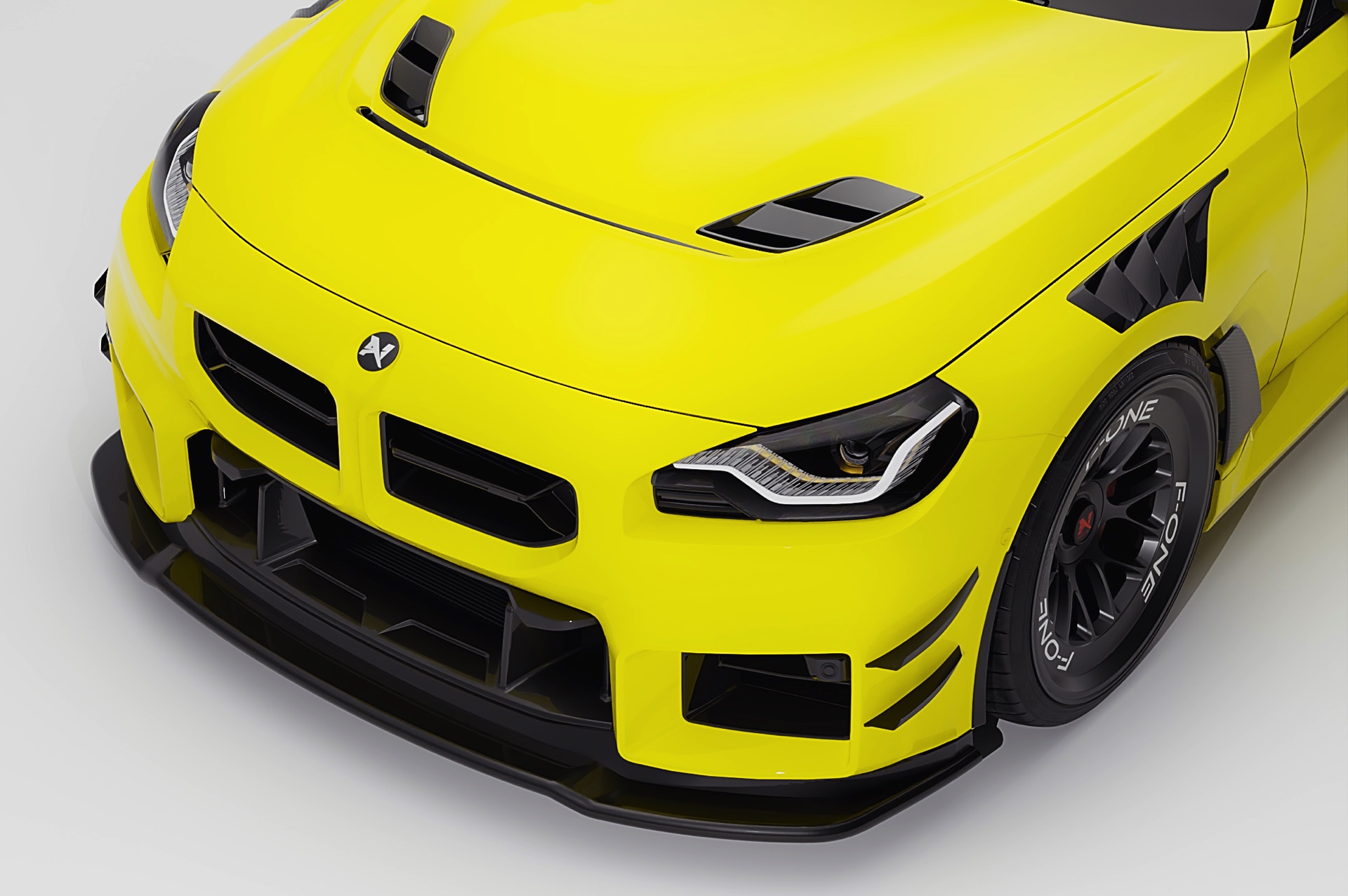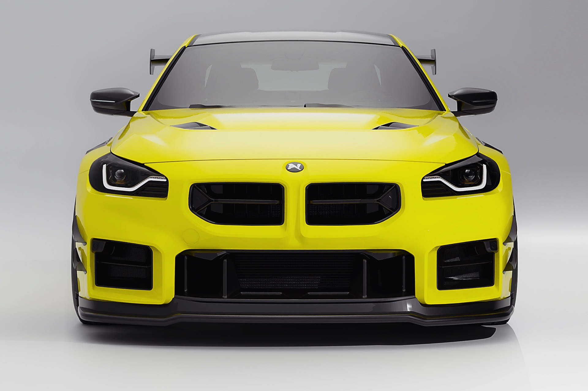 Auf den ersten Fotos sehen wir verschiedene Teile aus dem Alpha N Corse-Paket an einem blauen und einem gelben BMW M2. Beide tragen einen für maximale Stabilität direkt am Chassis montierten Carbon-Frontsplitter, der für mehr aerodynamischen Anpressdruck an der Vorderachse sorgt. Zusätzliche Unterstützung erhält er von Canards und Aeroblades, aber auch die Motorhaube und die Kotflügel atmen noch mehr Motorsport: Die Komponenten bestehen nicht nur aus leichtem Carbon, sie verfügen auch über zusätzliche Luftauslässe für ein optimiertes Wärmemanagement.