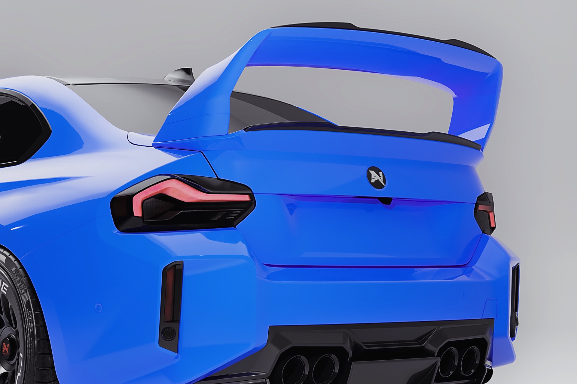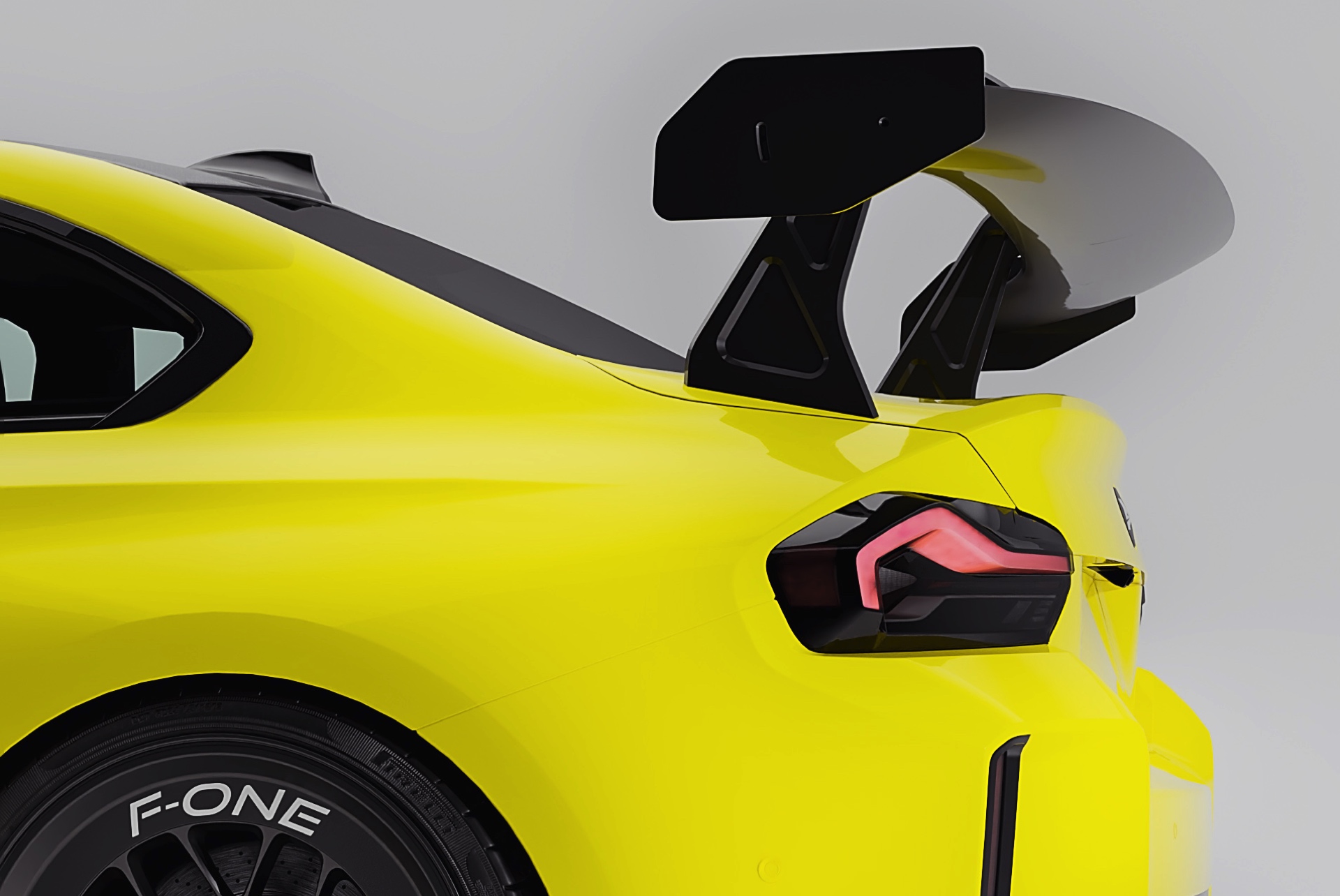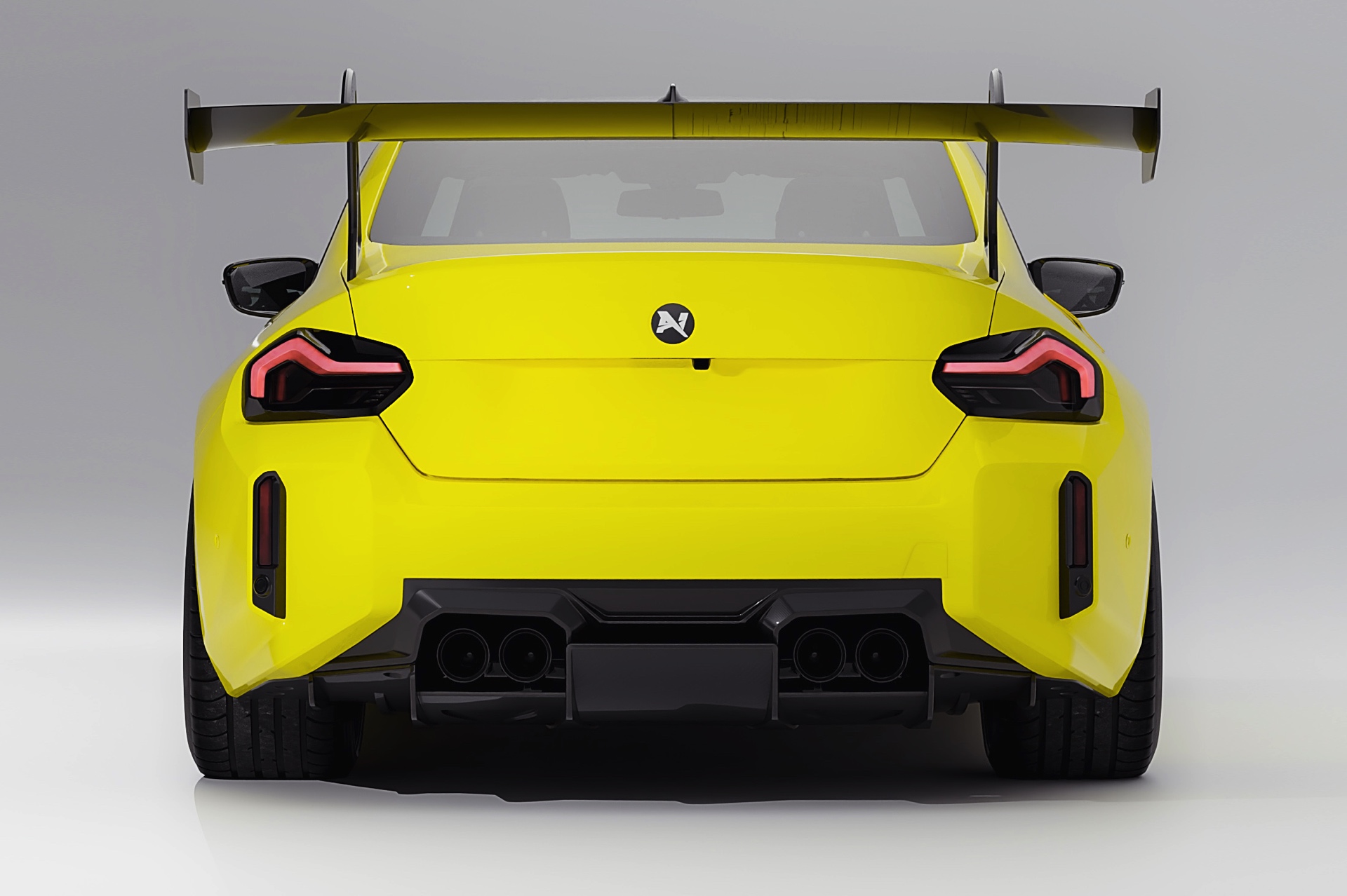 Am Heck des BMW M2 Corse von Alpha-N sehen wir einen Carbon-Diffusor und gleich zwei Heckflügel-Optionen: Der blaue G87 trägt den Class 3-Spoiler mit Distanzstücken und Gurney-Flaps, am gelben G87 sehen wir einen einstellbaren GT3-Heckflügel wie im Motorsport.