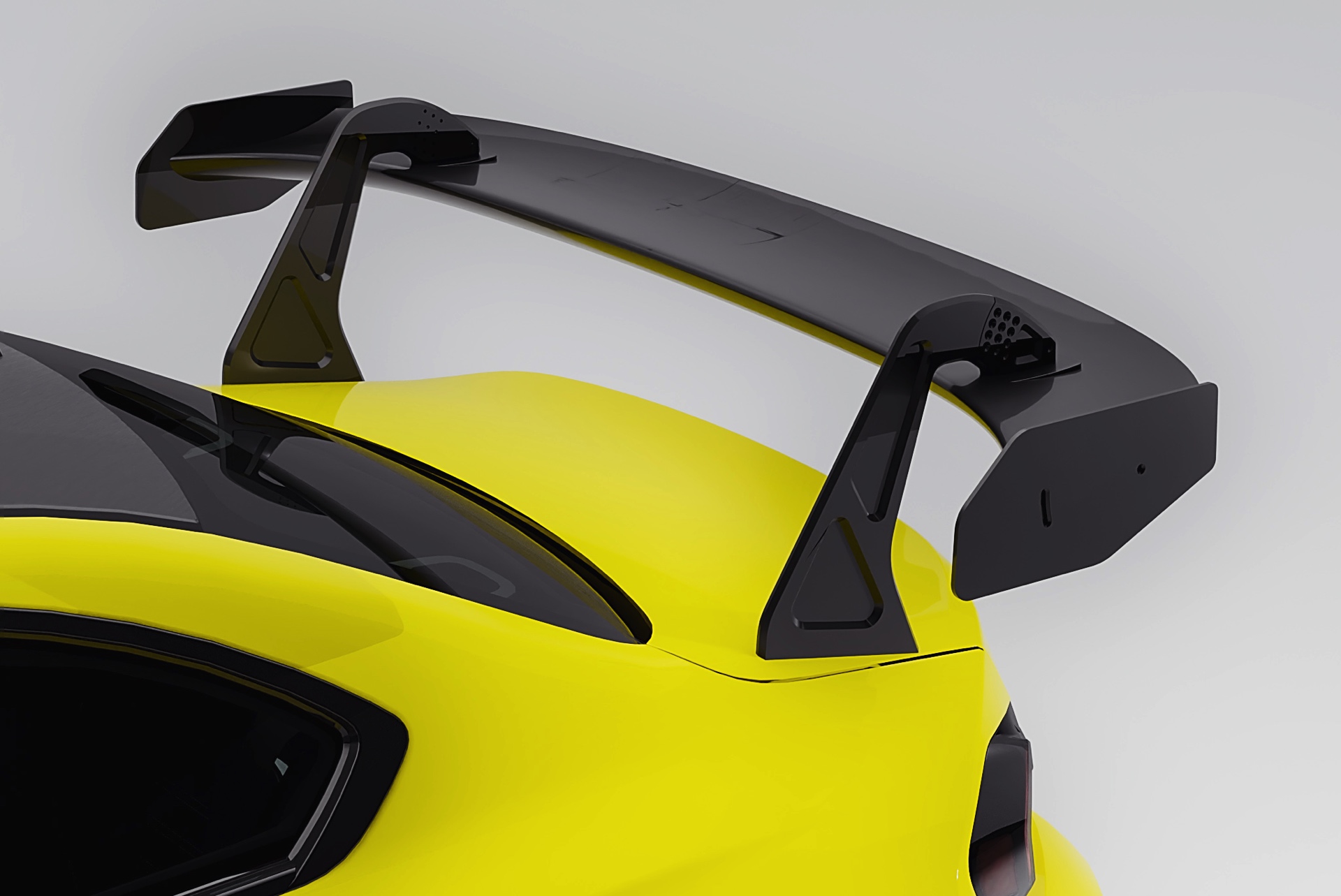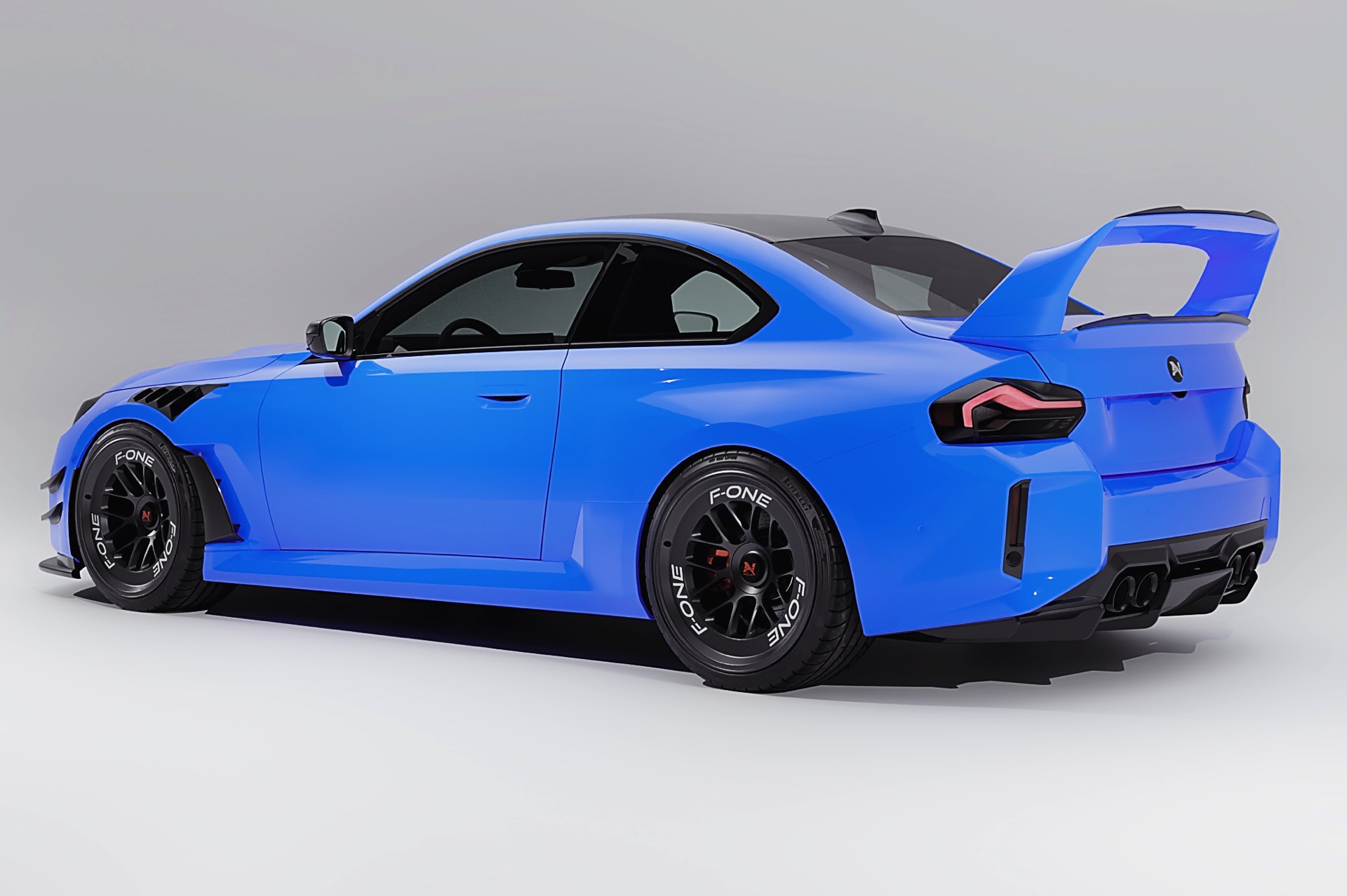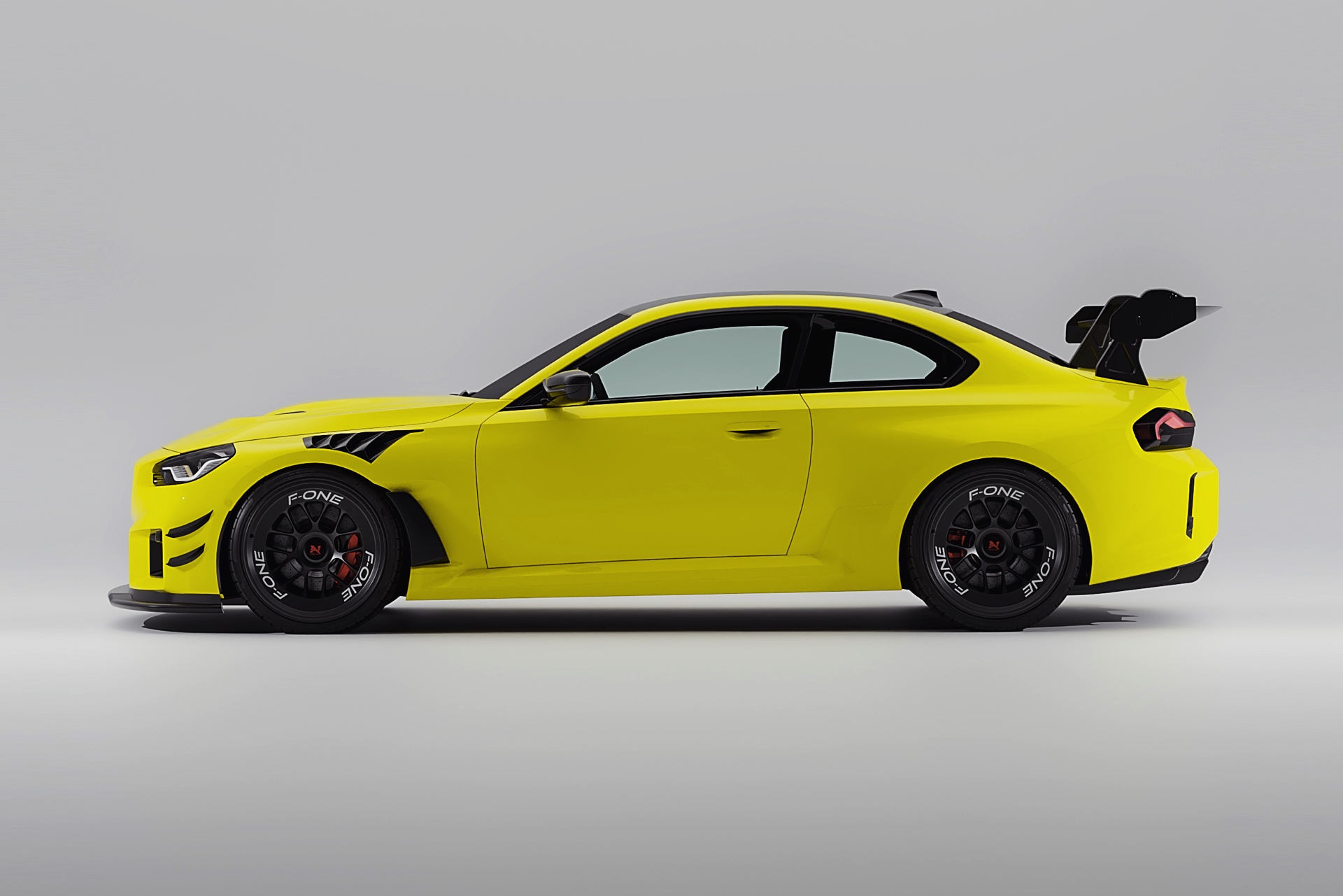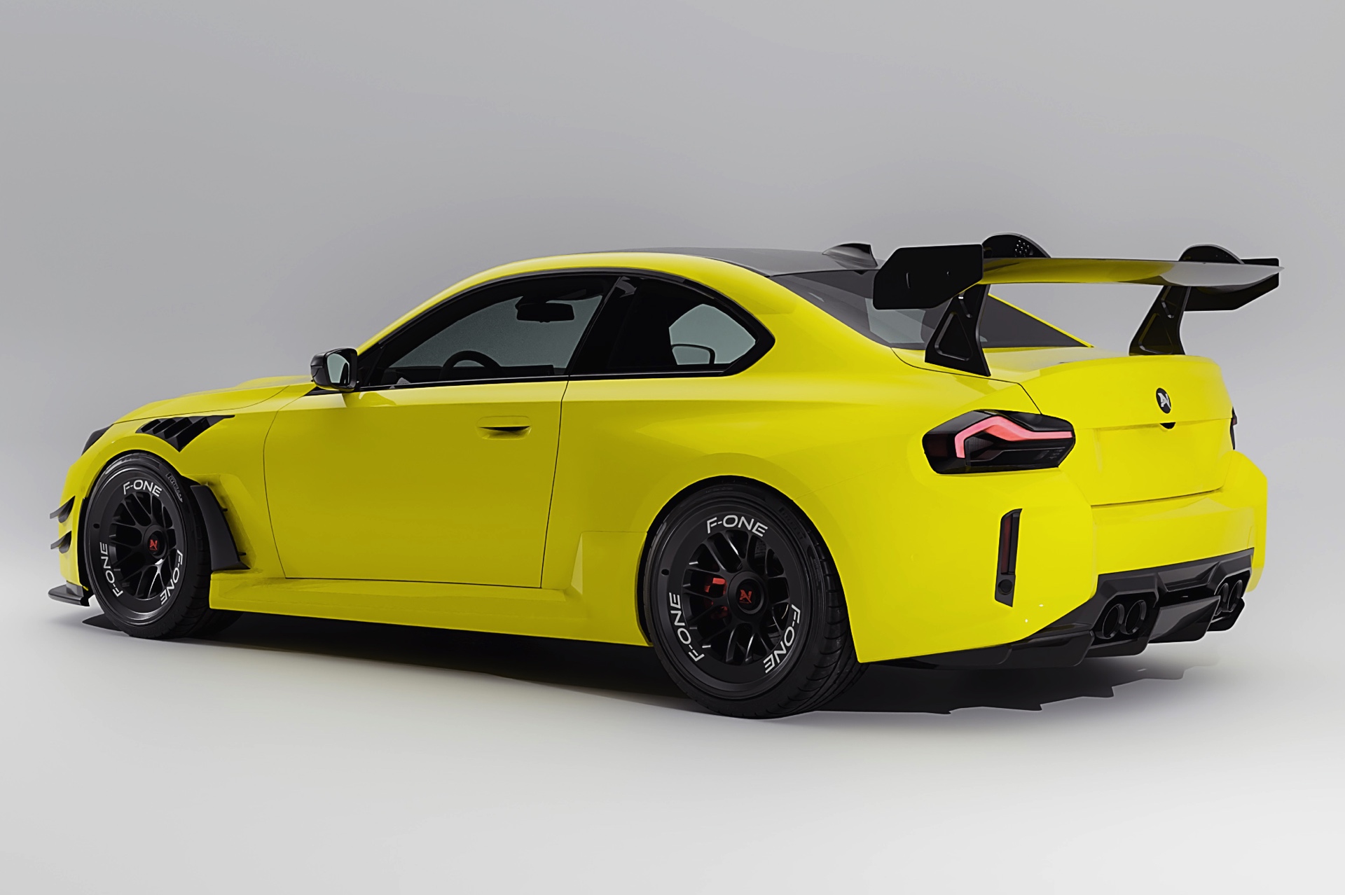 Am Heck des BMW M2 Corse von Alpha-N sehen wir einen Carbon-Diffusor und gleich zwei Heckflügel-Optionen: Der blaue G87 trägt den Class 3-Spoiler mit Distanzstücken und Gurney-Flaps, am gelben G87 sehen wir einen einstellbaren GT3-Heckflügel wie im Motorsport.