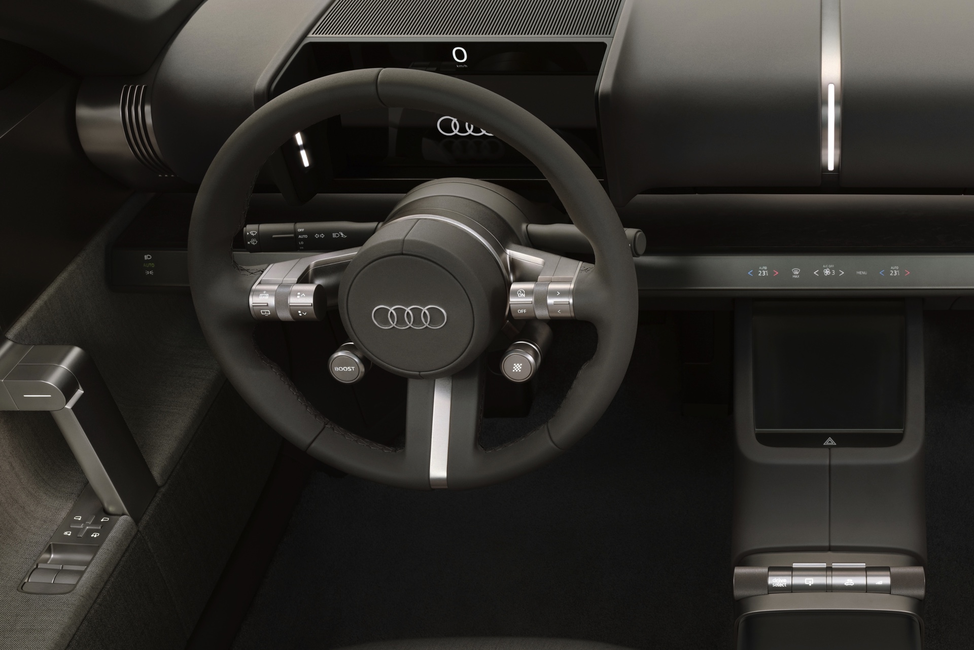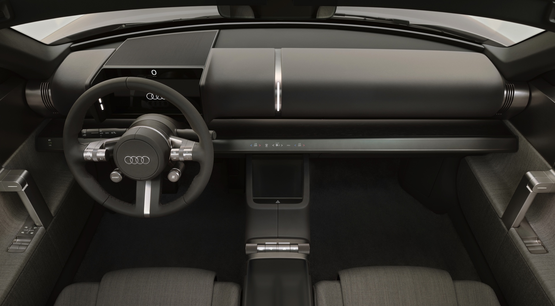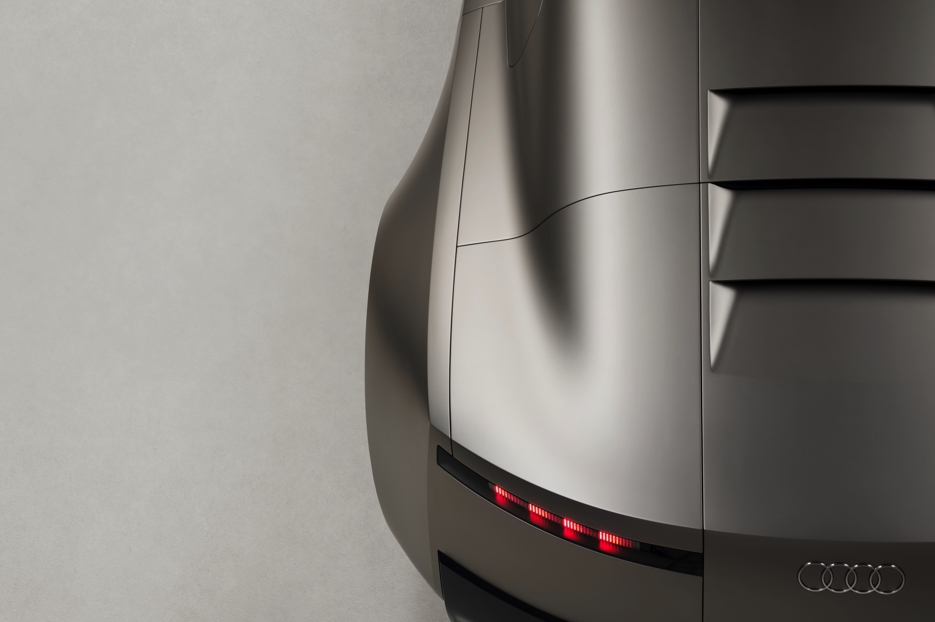 Flankiert wird der vertikale Grill von schmalen Scheinwerfern und monolithischen Flächen, die in Wagenfarbe lackiert sind. Audi selbst spricht von ‘athletischem Minimalismus’ und zeigt diesen auch aus allen anderen Perspektiven: Der Concept C verzichtet in beinahe radikaler Konsequenz auf jede unnötige Linie im Blech und wirkt so wie ein aus dem Vollen gefrästes Kunstwerk. Nicht ohne Grund sprechen die Verantwortlichen von “einer neuen Ära der Klarheit”, die sie mit dem Elektro-Sportwagen einläuten wollen. "