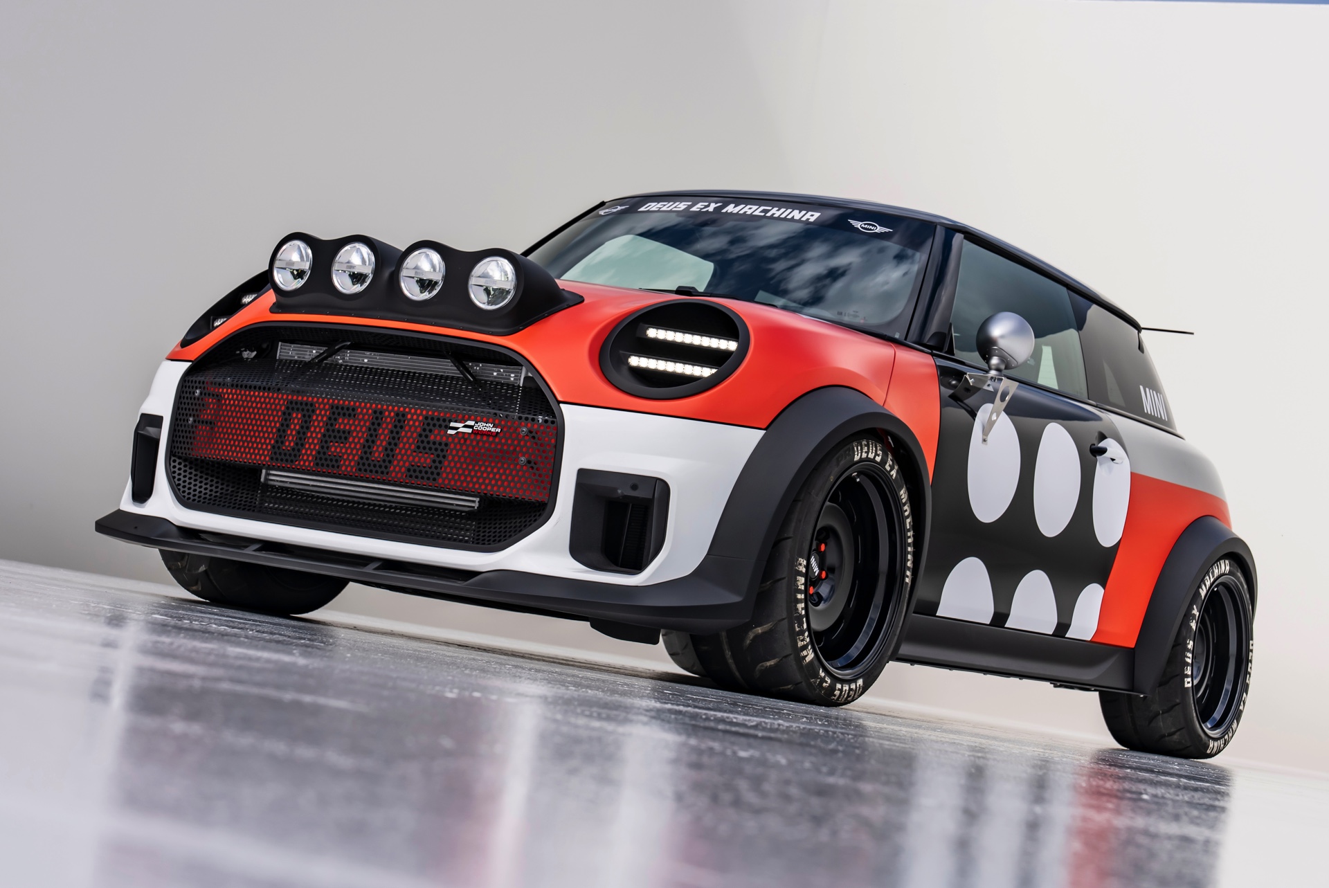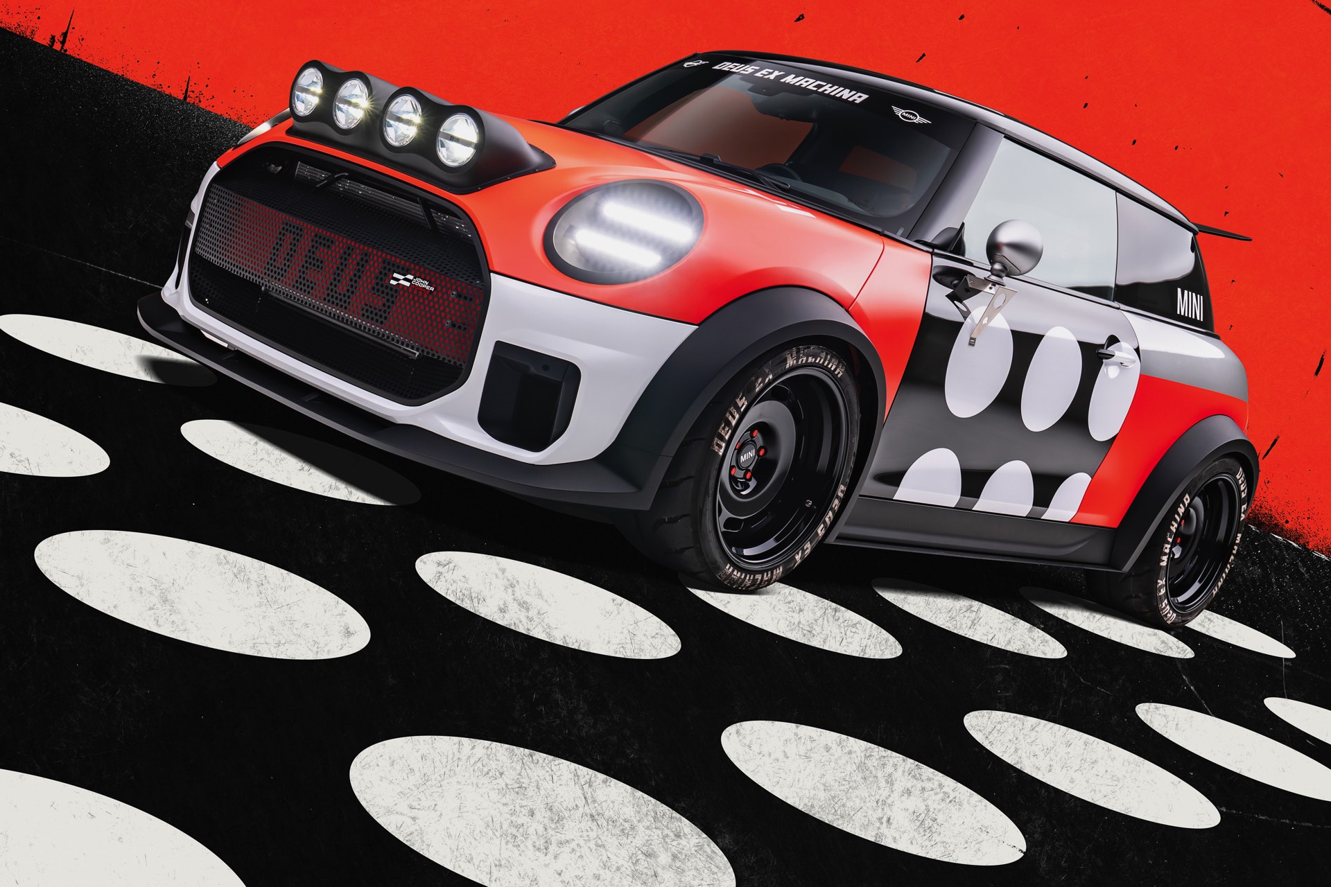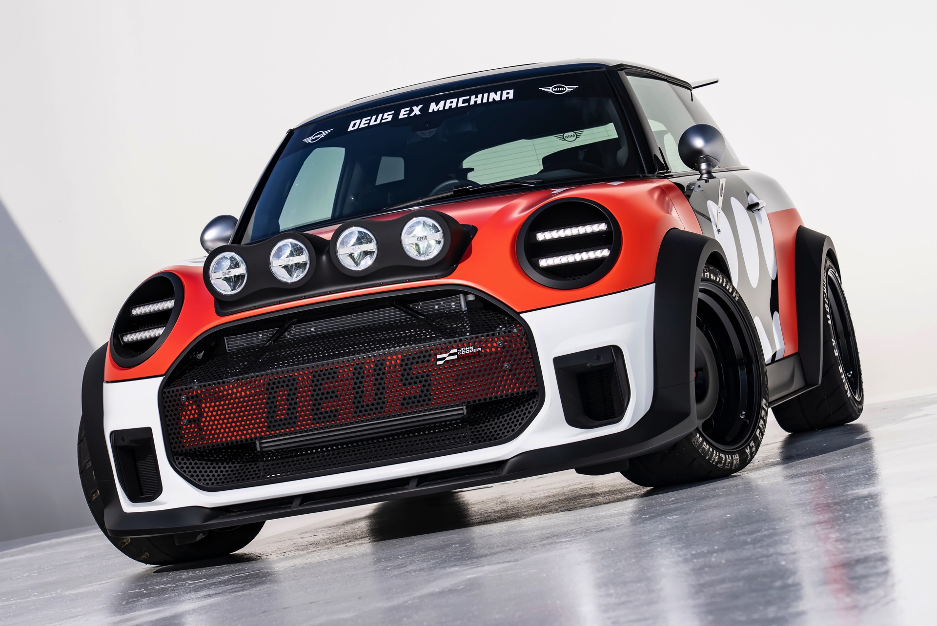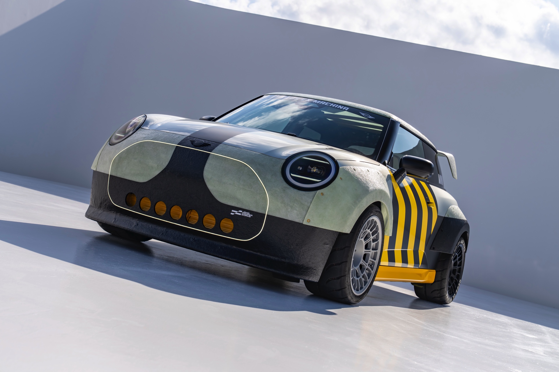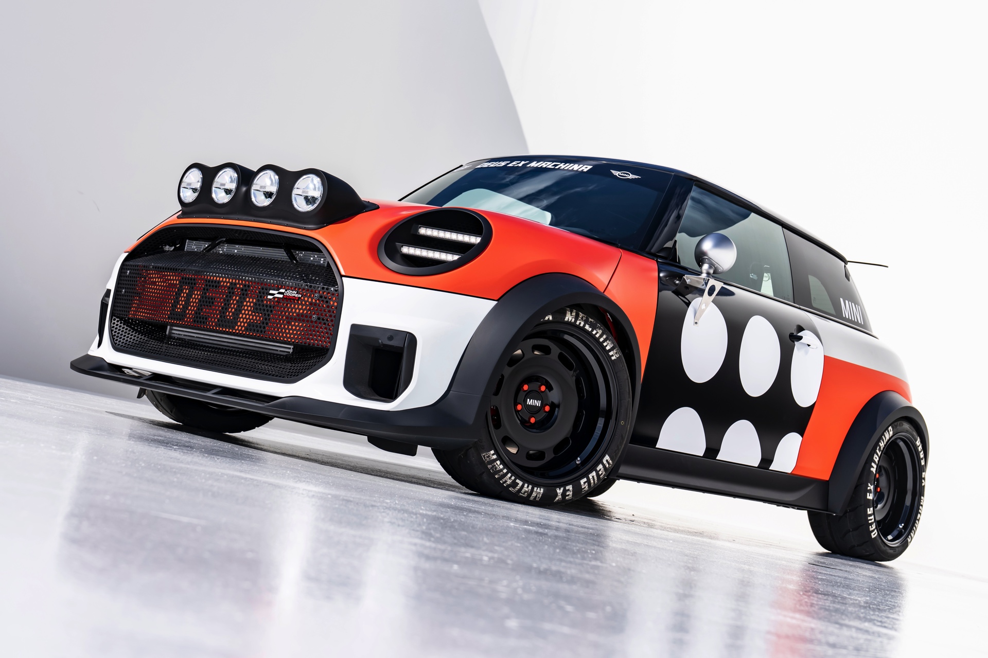 Für rohe Mechanik und echten Motorsport steht der ‘The Machina’ genannte und überwiegend in Weiß und Orange gehaltene MINI John Cooper Works (F66) mit 231 PS starkem Turbo-Vierzylinder: Weit ausgestellte Kotflügel, unübersehbare Aerodynamik-Elemente und eine Reihe von vier Zusatz-Scheinwerfern wecken Rallye-Assoziationen. Unterstrichen wird dieser Eindruck vom Innenraum, der auf das Wesentlichste reduziert wurde und von zwei Carbon-Schalensitzen dominiert wird. "