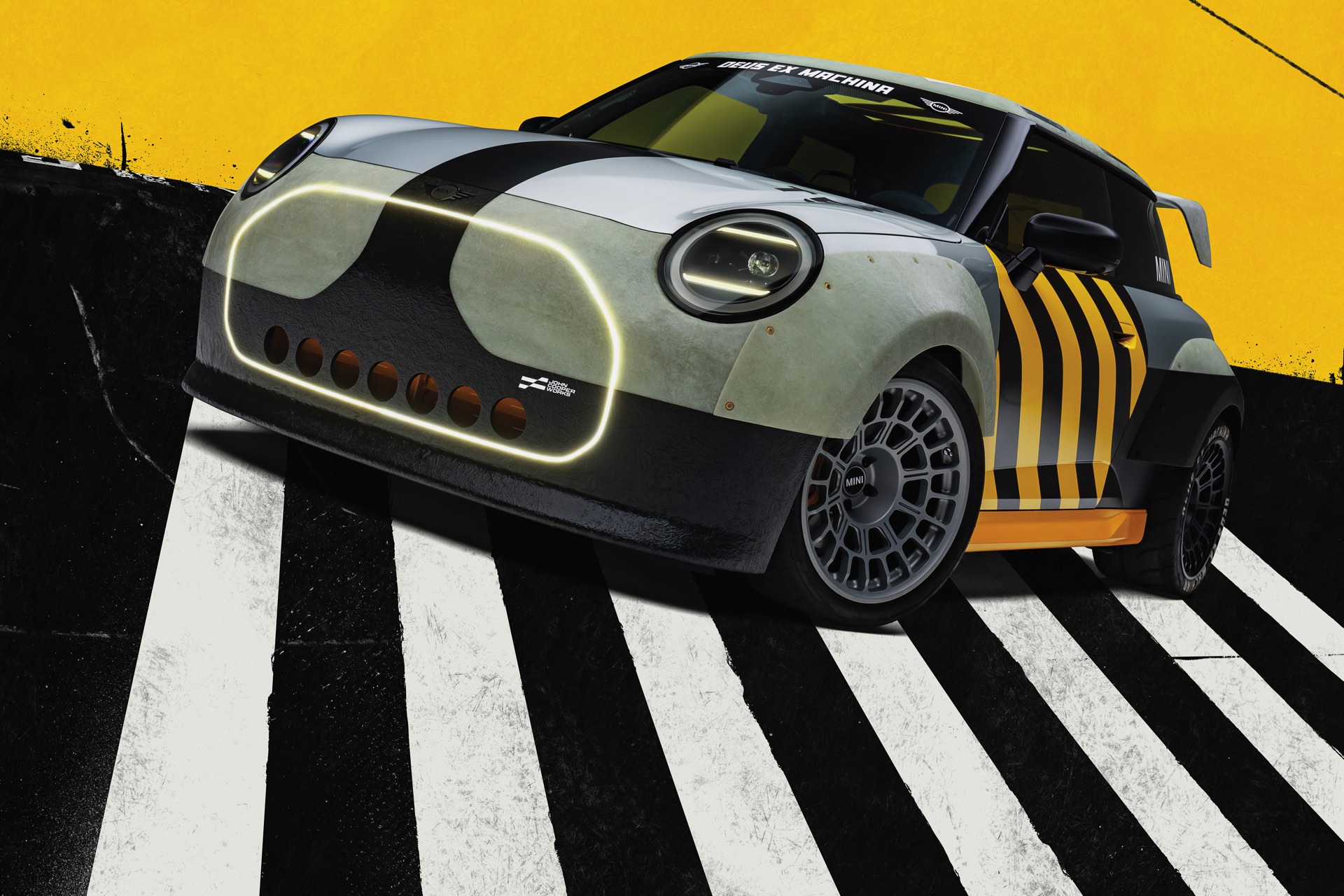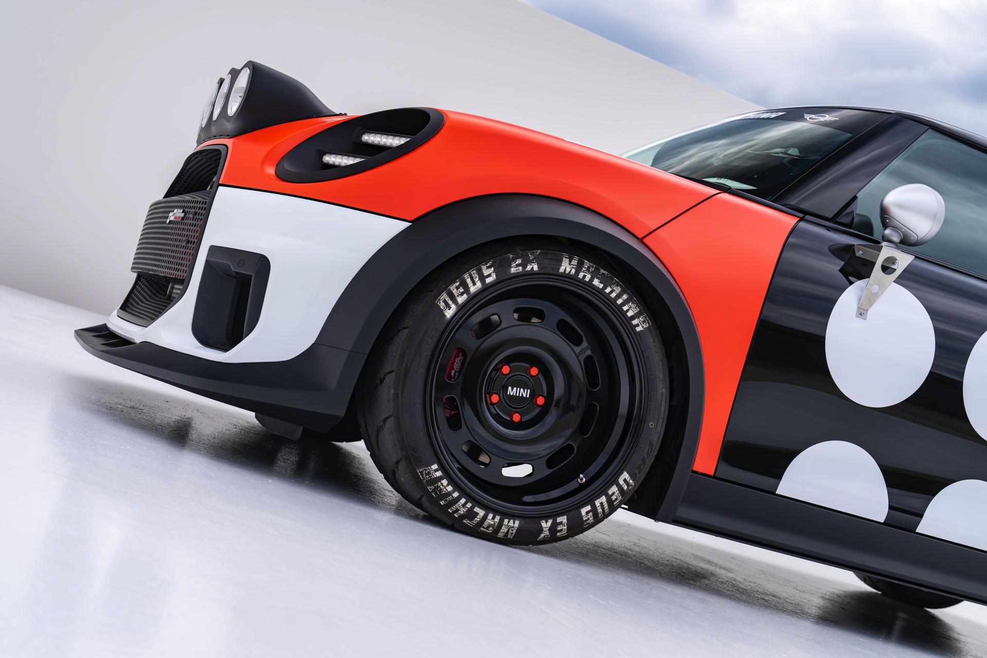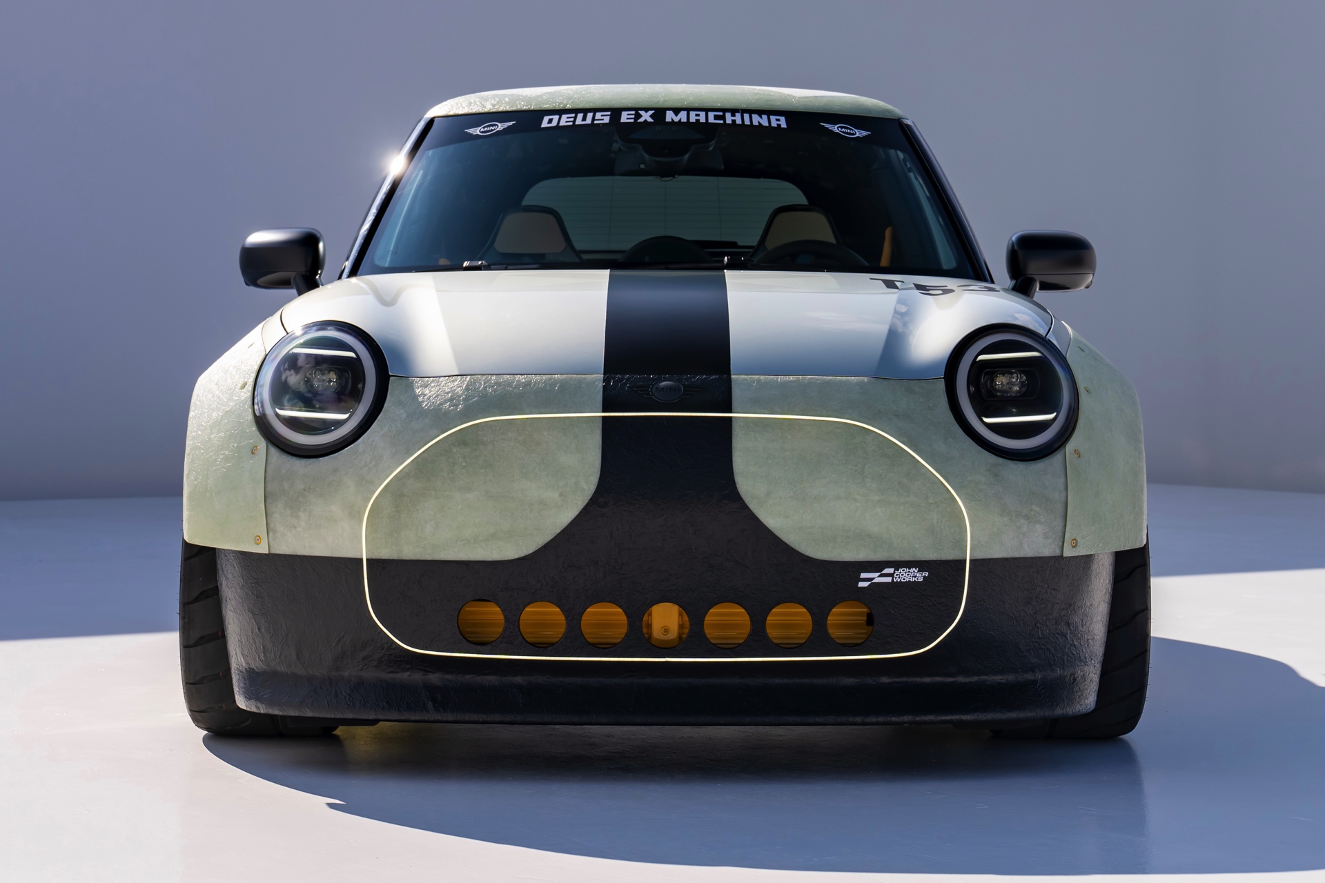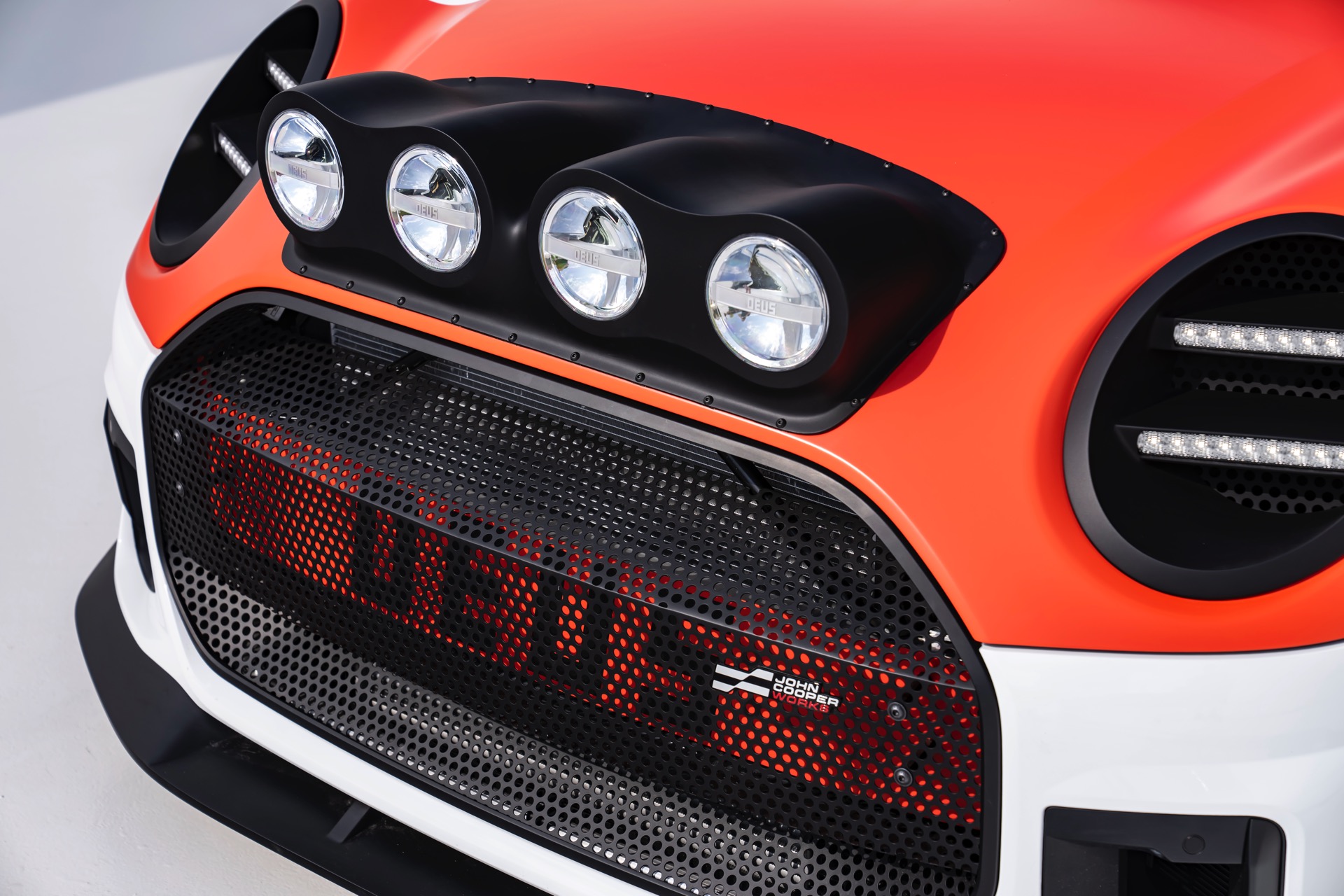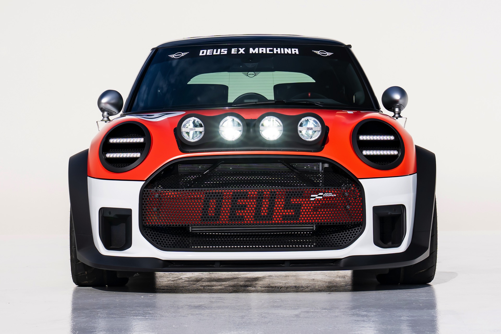 Für rohe Mechanik und echten Motorsport steht der ‘The Machina’ genannte und überwiegend in Weiß und Orange gehaltene MINI John Cooper Works (F66) mit 231 PS starkem Turbo-Vierzylinder: Weit ausgestellte Kotflügel, unübersehbare Aerodynamik-Elemente und eine Reihe von vier Zusatz-Scheinwerfern wecken Rallye-Assoziationen. Unterstrichen wird dieser Eindruck vom Innenraum, der auf das Wesentlichste reduziert wurde und von zwei Carbon-Schalensitzen dominiert wird. "