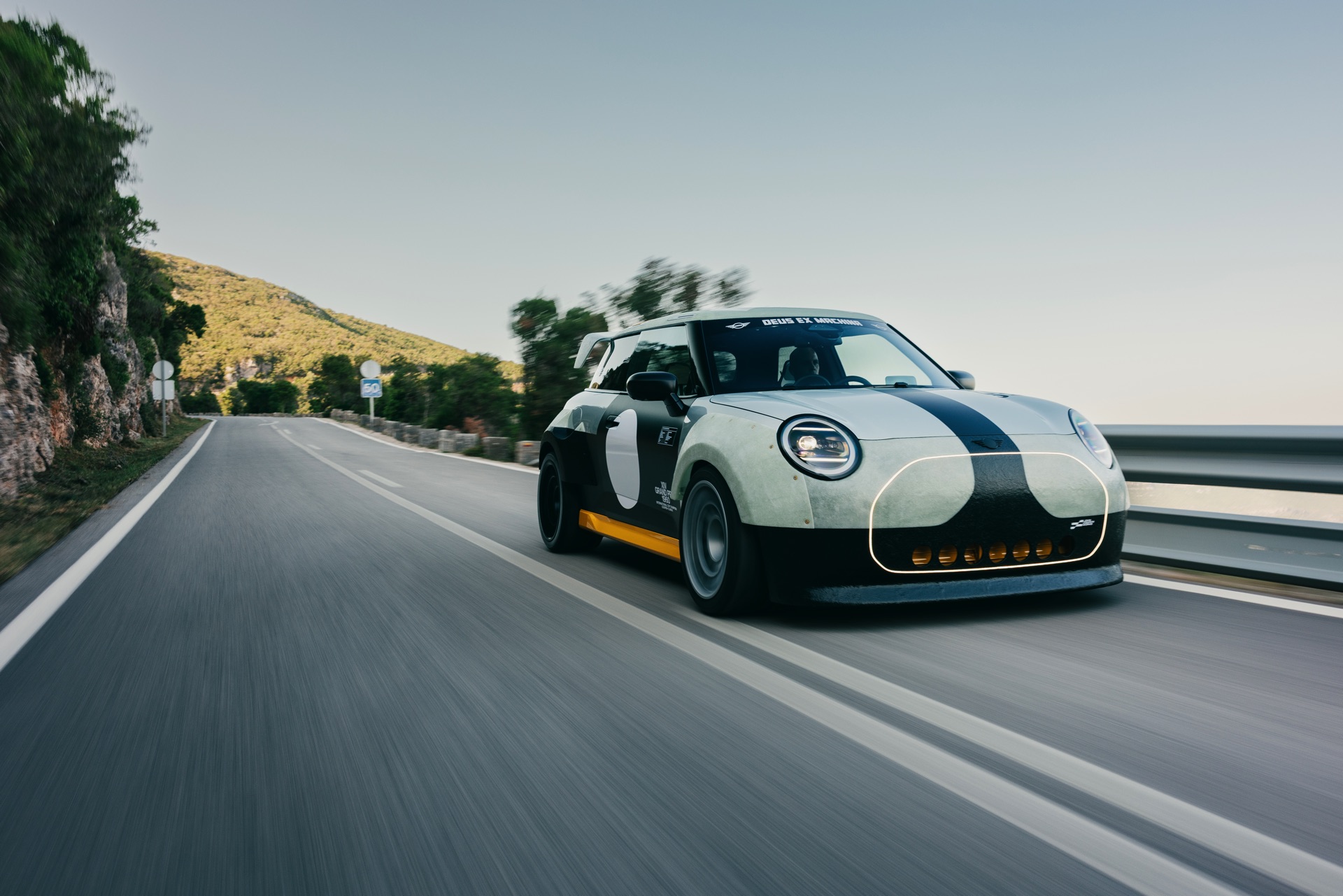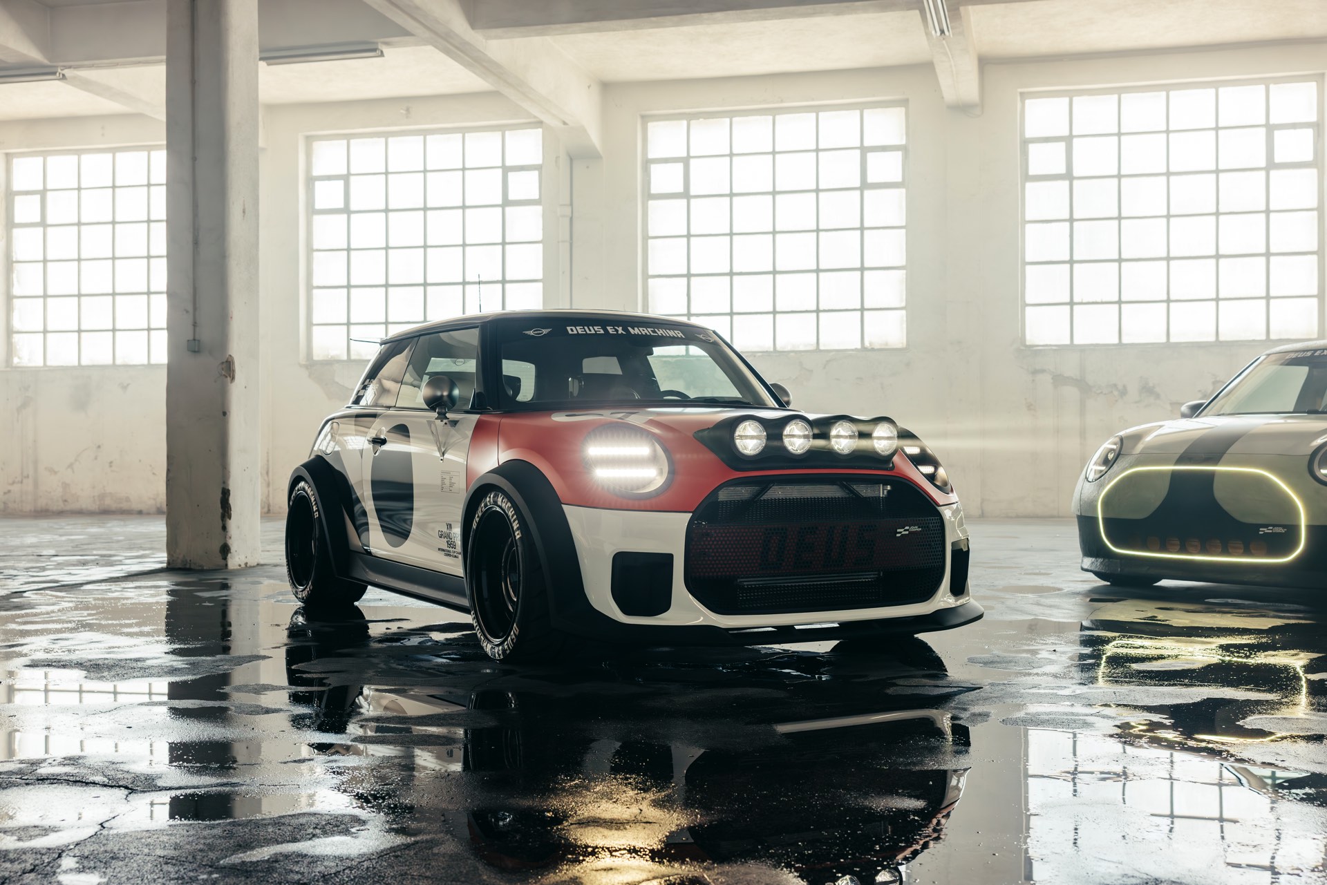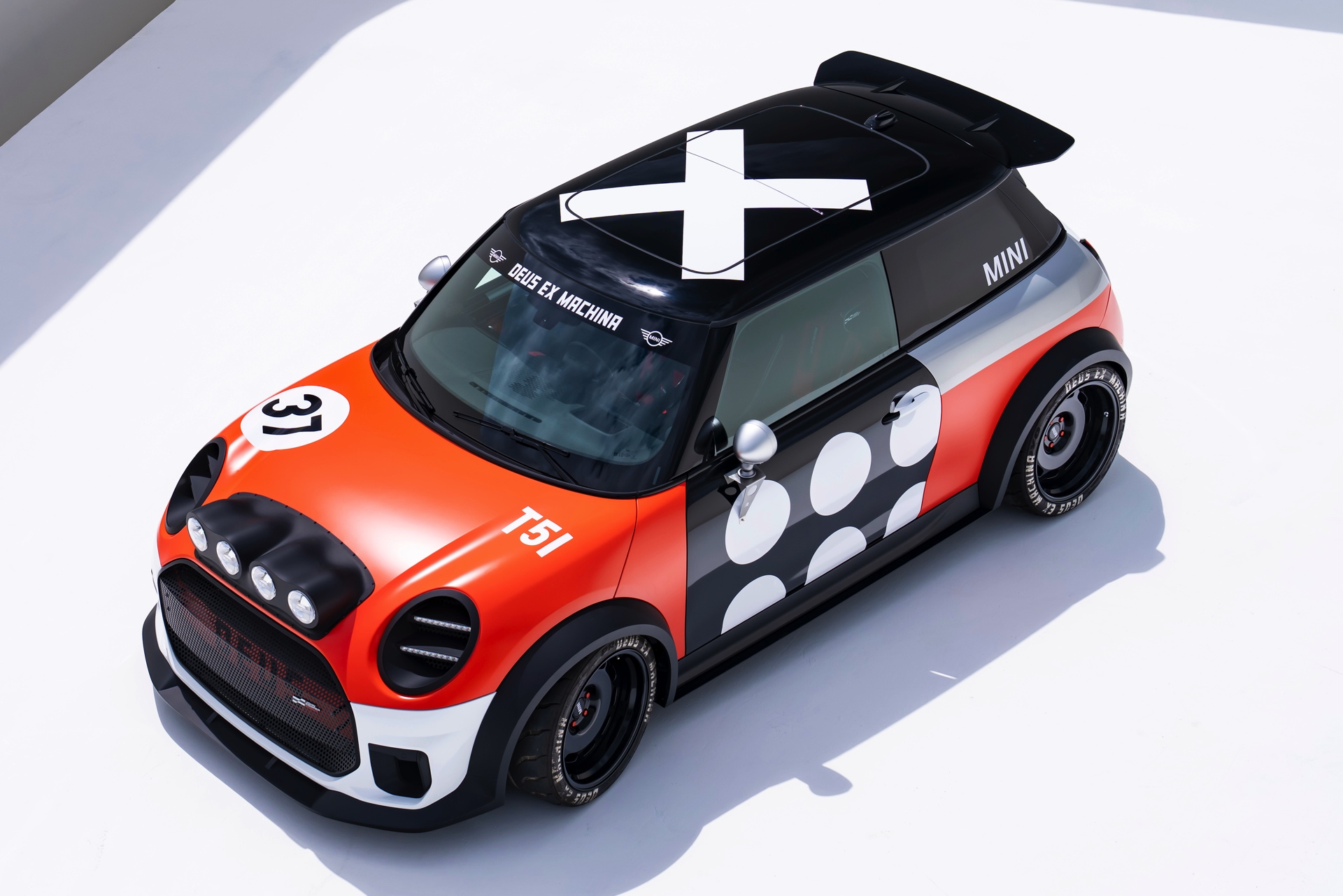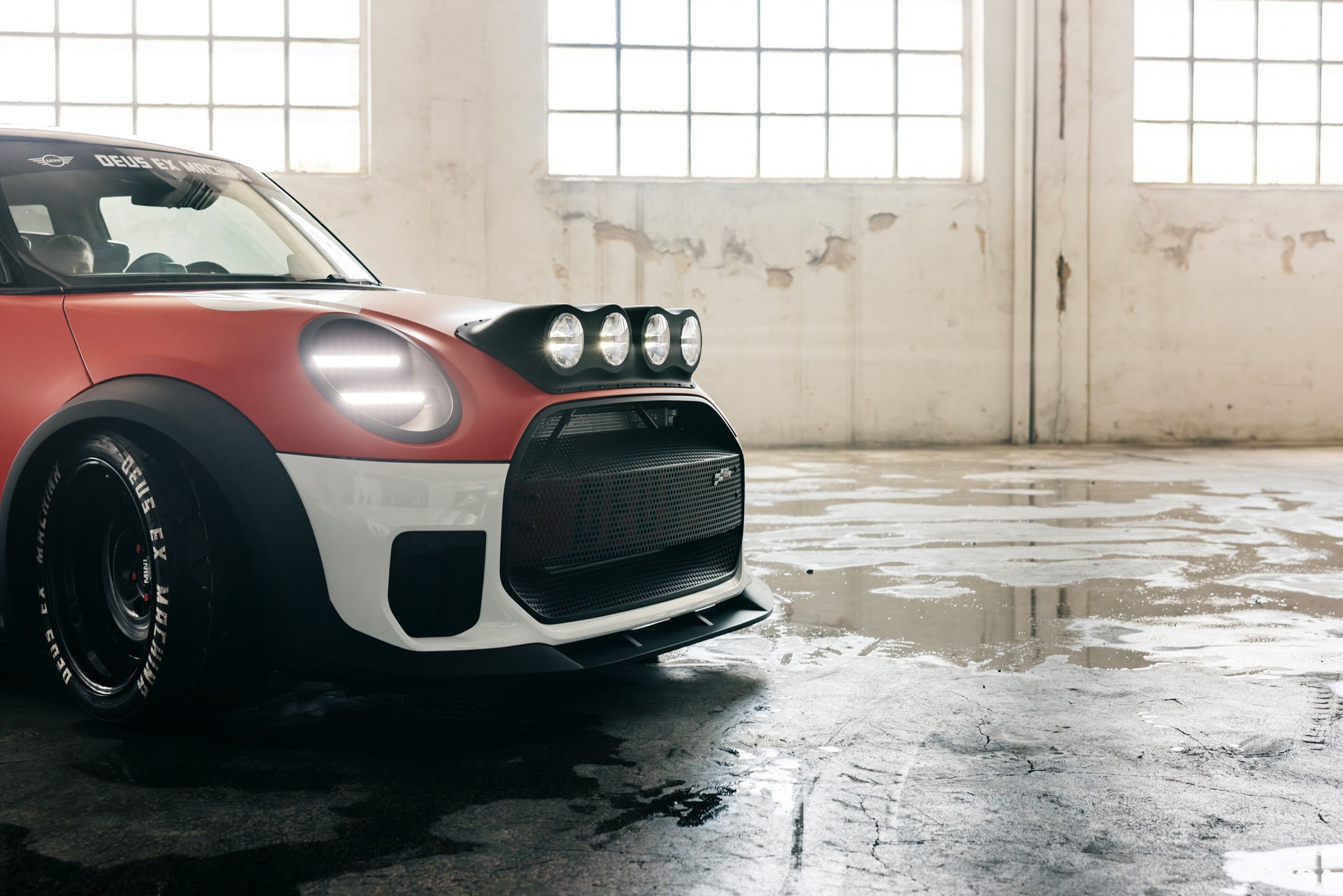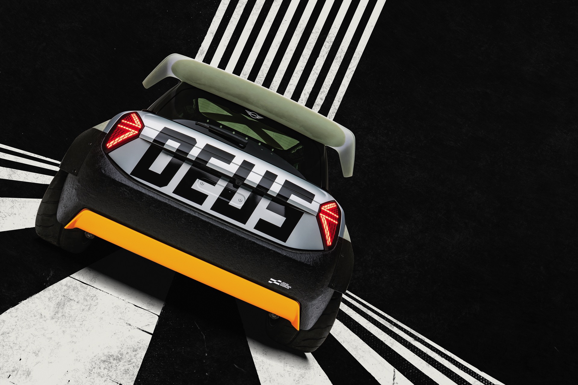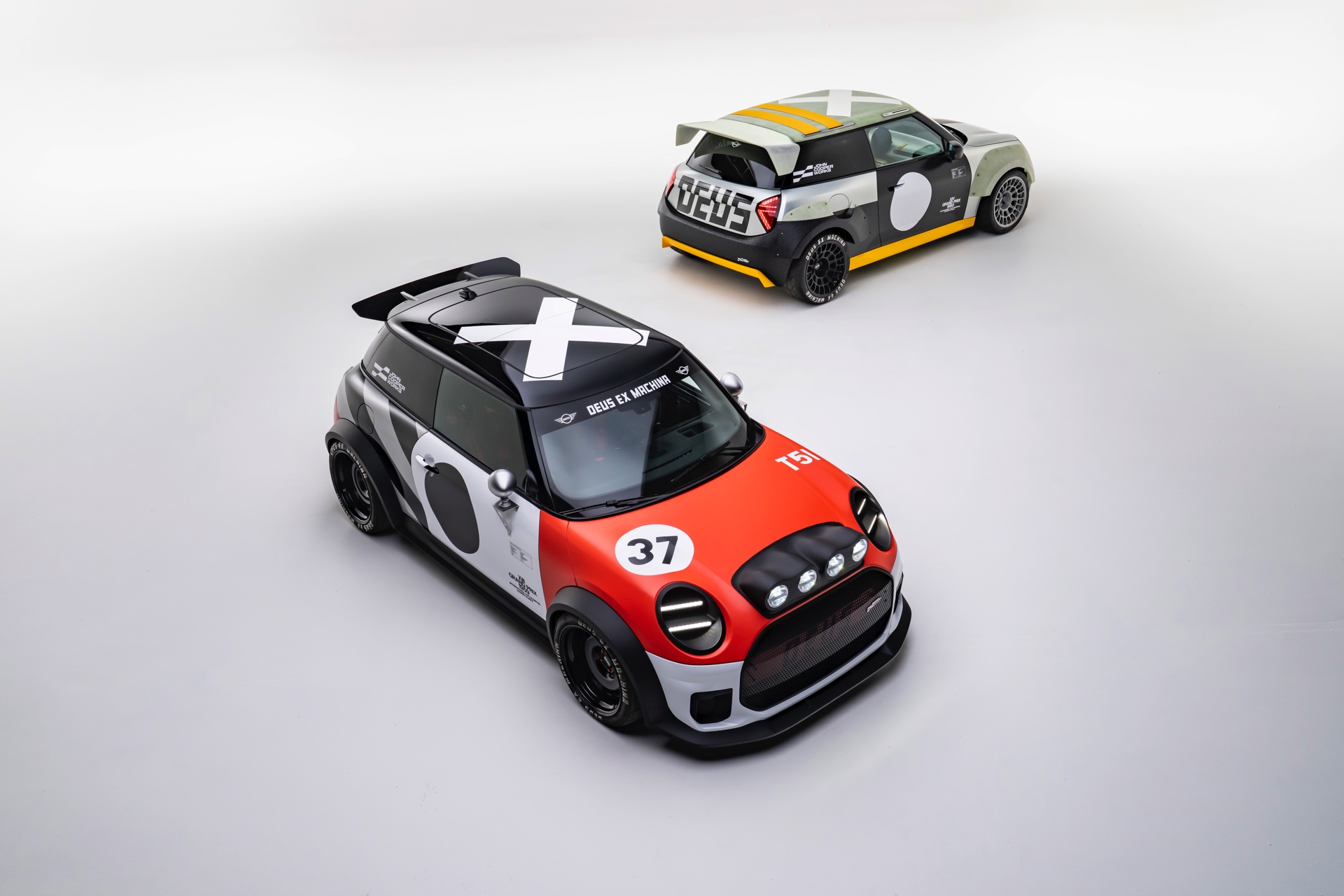 Für rohe Mechanik und echten Motorsport steht der ‘The Machina’ genannte und überwiegend in Weiß und Orange gehaltene MINI John Cooper Works (F66) mit 231 PS starkem Turbo-Vierzylinder: Weit ausgestellte Kotflügel, unübersehbare Aerodynamik-Elemente und eine Reihe von vier Zusatz-Scheinwerfern wecken Rallye-Assoziationen. Unterstrichen wird dieser Eindruck vom Innenraum, der auf das Wesentlichste reduziert wurde und von zwei Carbon-Schalensitzen dominiert wird. "