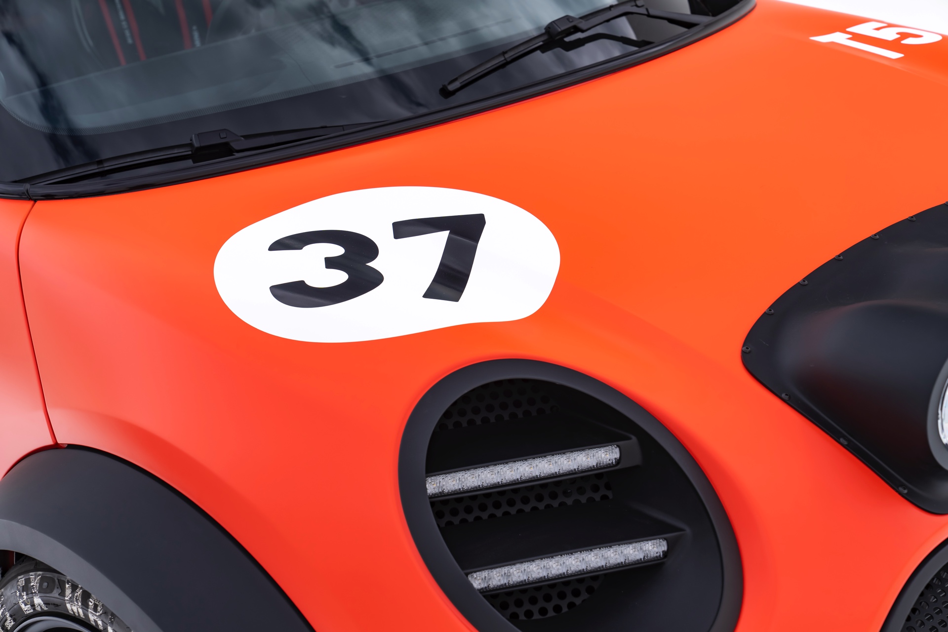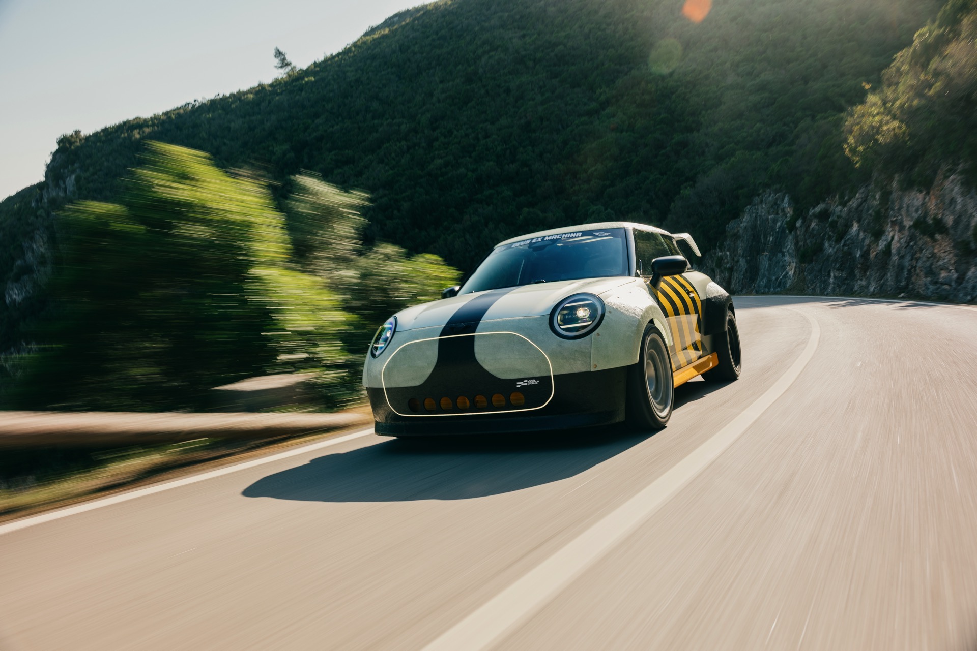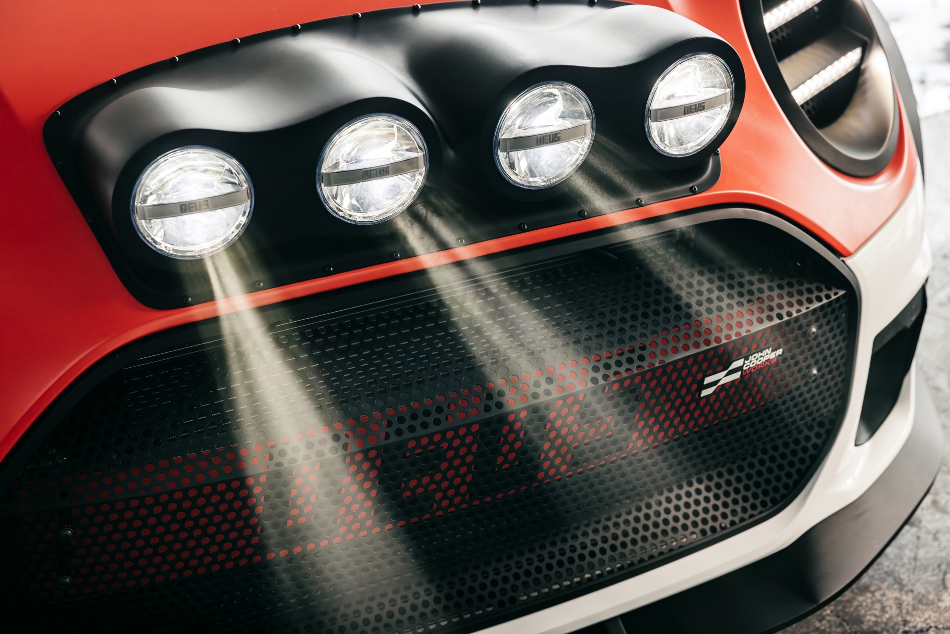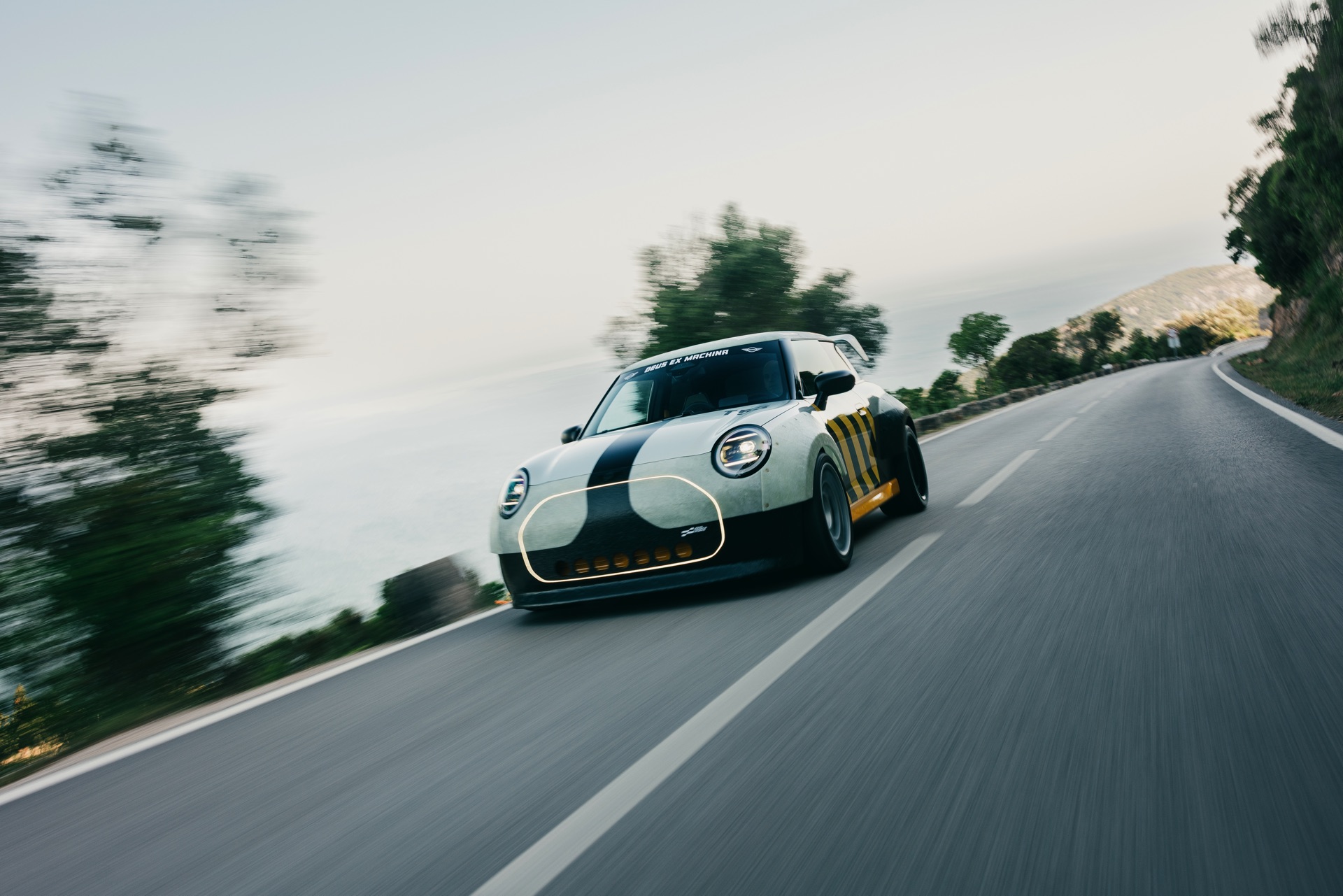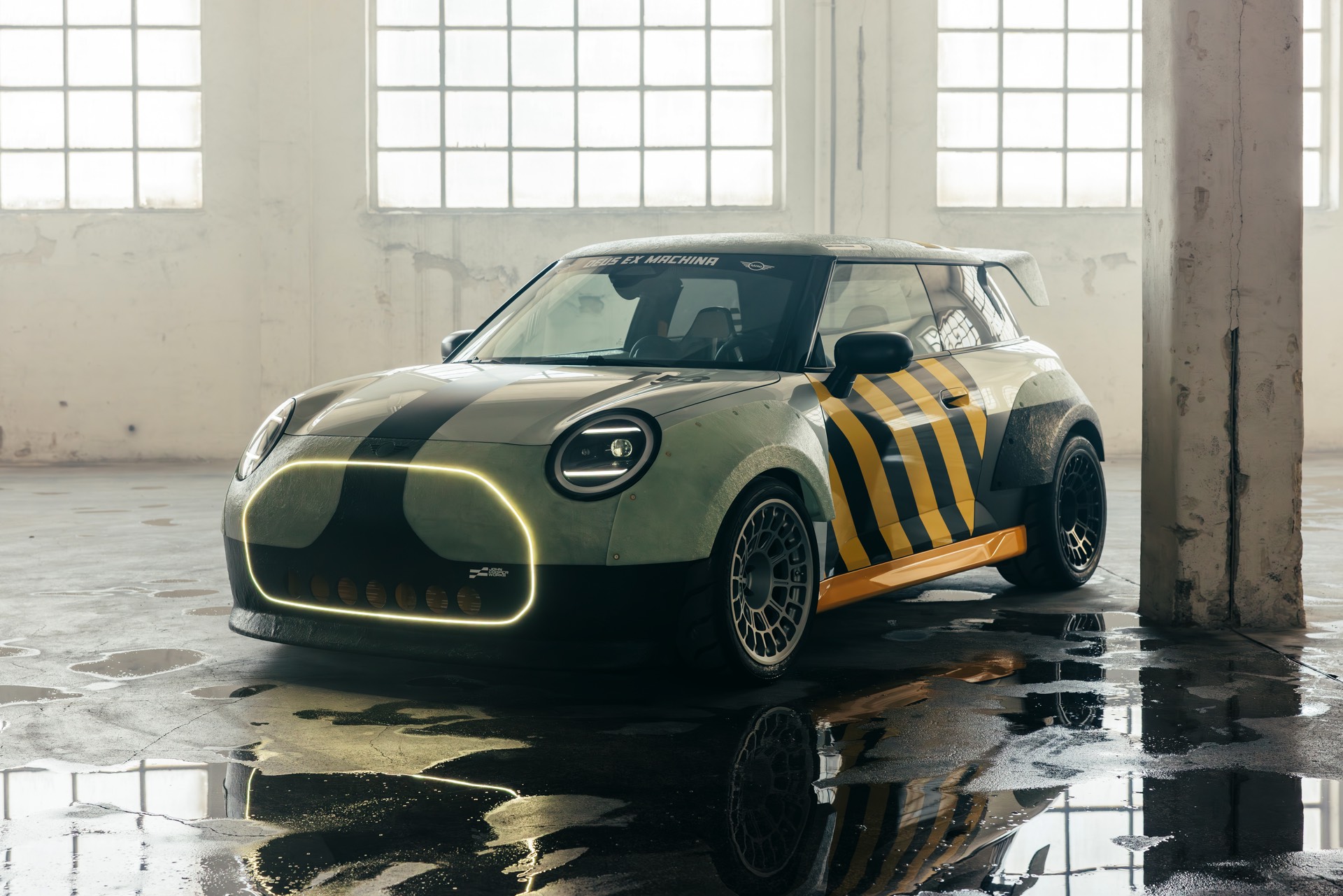 Für rohe Mechanik und echten Motorsport steht der ‘The Machina’ genannte und überwiegend in Weiß und Orange gehaltene MINI John Cooper Works (F66) mit 231 PS starkem Turbo-Vierzylinder: Weit ausgestellte Kotflügel, unübersehbare Aerodynamik-Elemente und eine Reihe von vier Zusatz-Scheinwerfern wecken Rallye-Assoziationen. Unterstrichen wird dieser Eindruck vom Innenraum, der auf das Wesentlichste reduziert wurde und von zwei Carbon-Schalensitzen dominiert wird. "