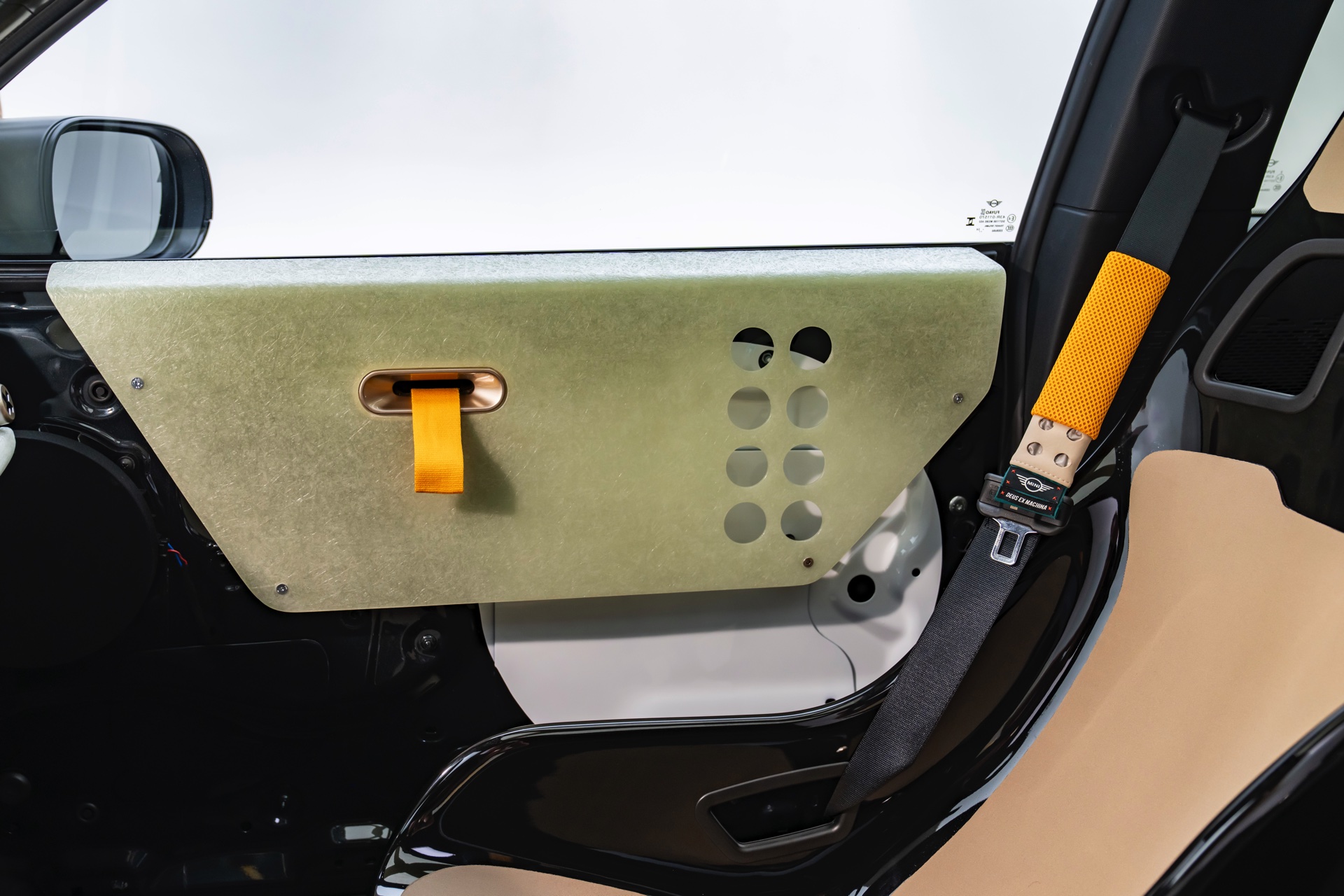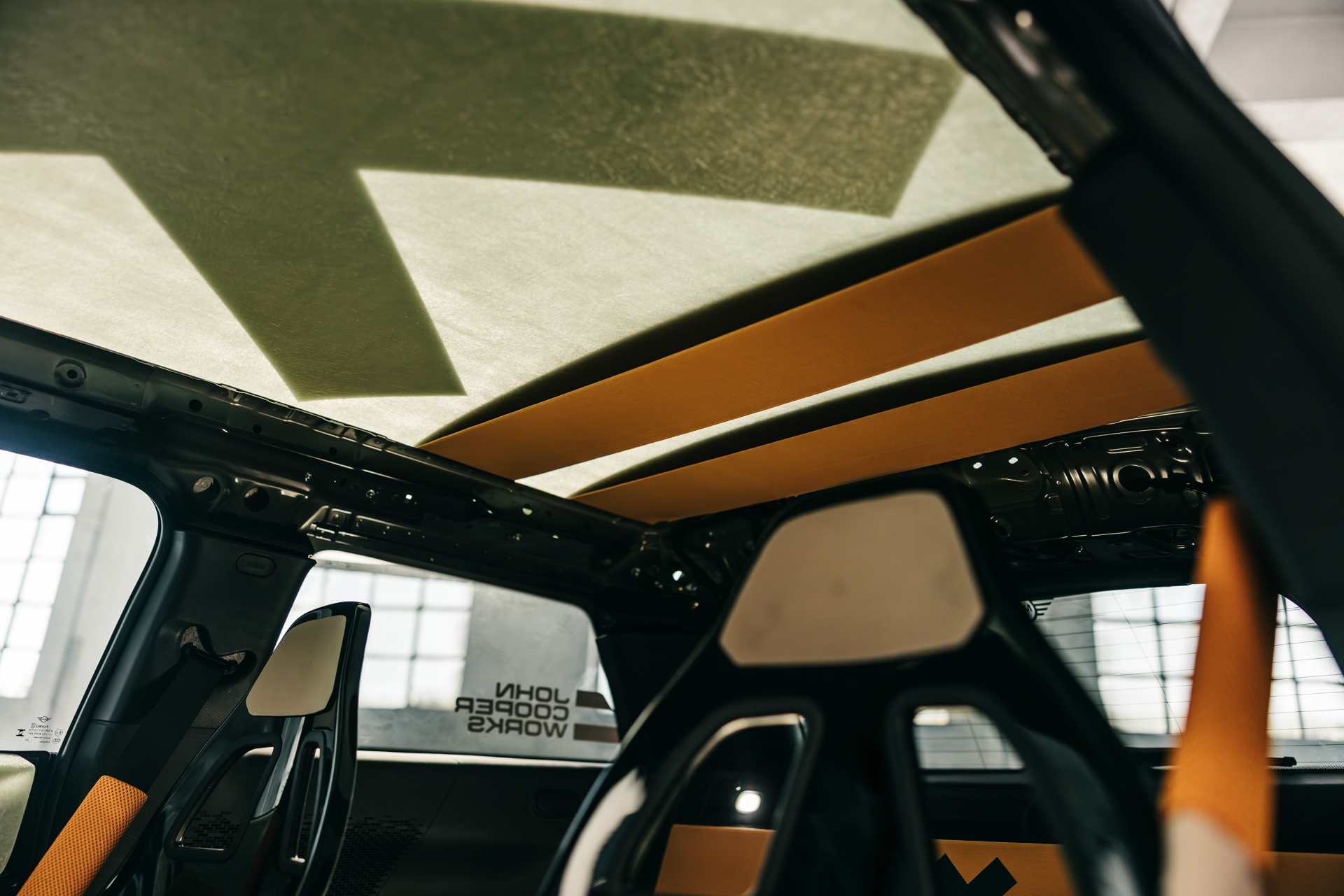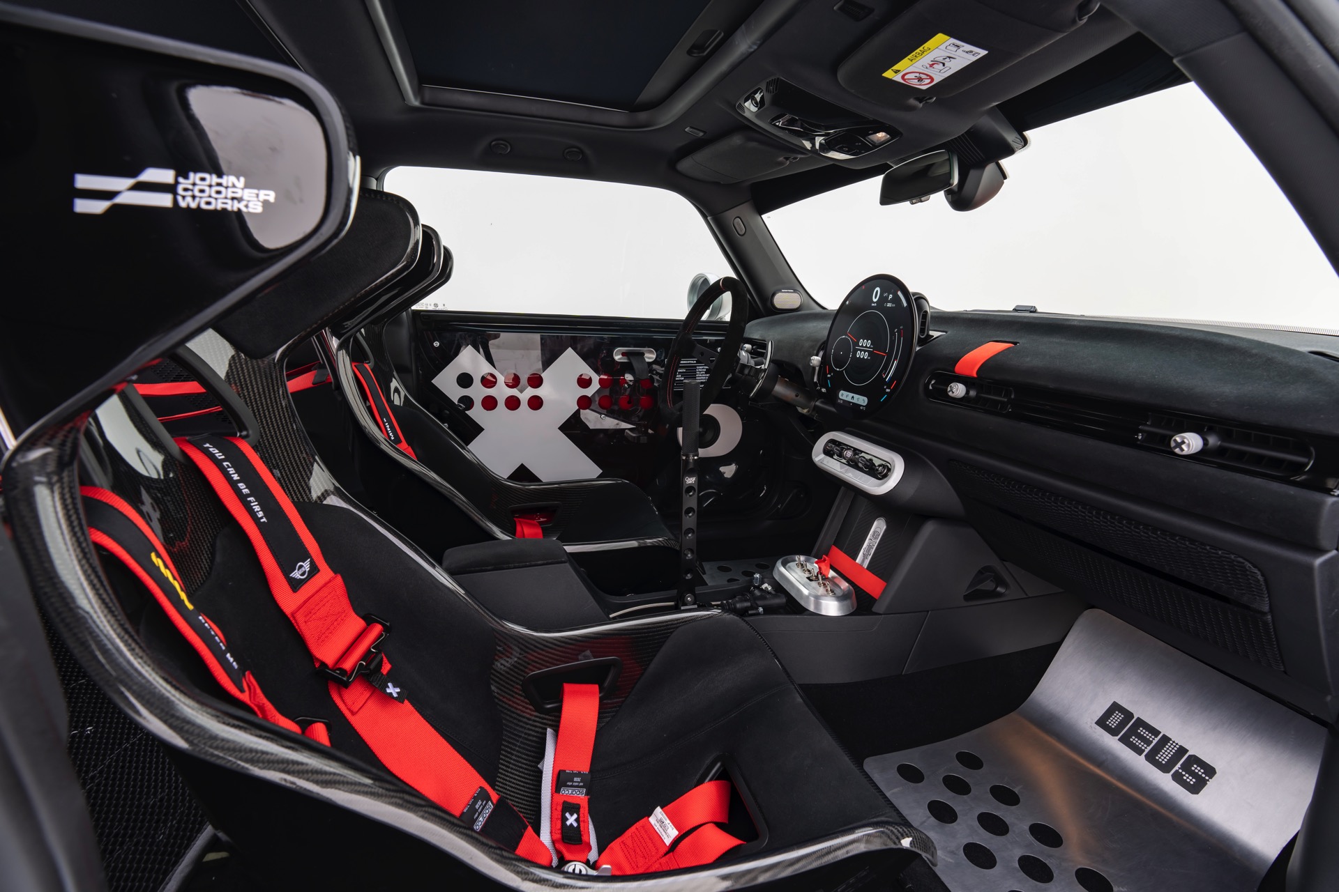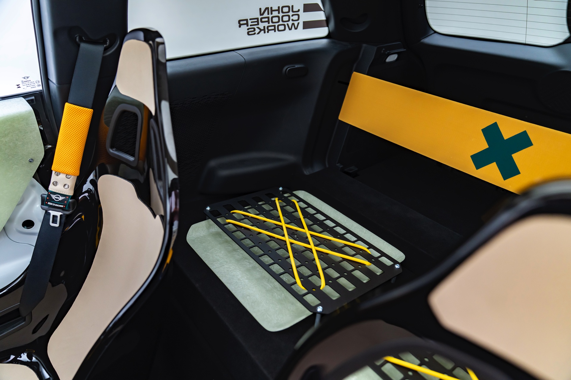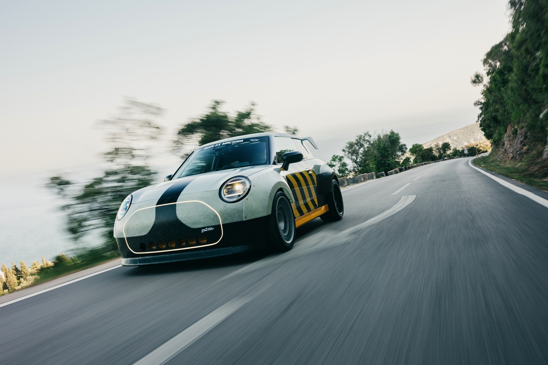 Für rohe Mechanik und echten Motorsport steht der ‘The Machina’ genannte und überwiegend in Weiß und Orange gehaltene MINI John Cooper Works (F66) mit 231 PS starkem Turbo-Vierzylinder: Weit ausgestellte Kotflügel, unübersehbare Aerodynamik-Elemente und eine Reihe von vier Zusatz-Scheinwerfern wecken Rallye-Assoziationen. Unterstrichen wird dieser Eindruck vom Innenraum, der auf das Wesentlichste reduziert wurde und von zwei Carbon-Schalensitzen dominiert wird. "