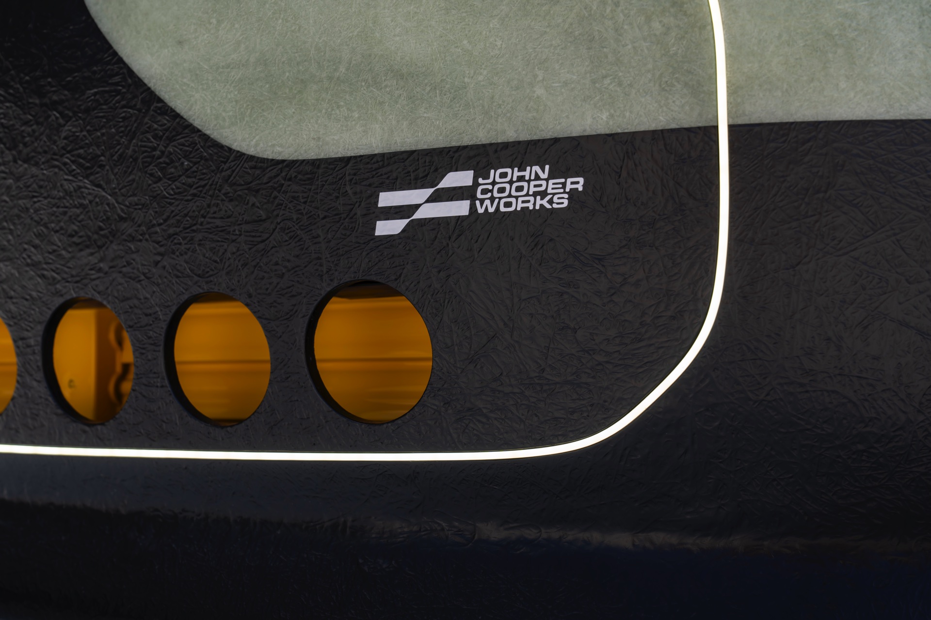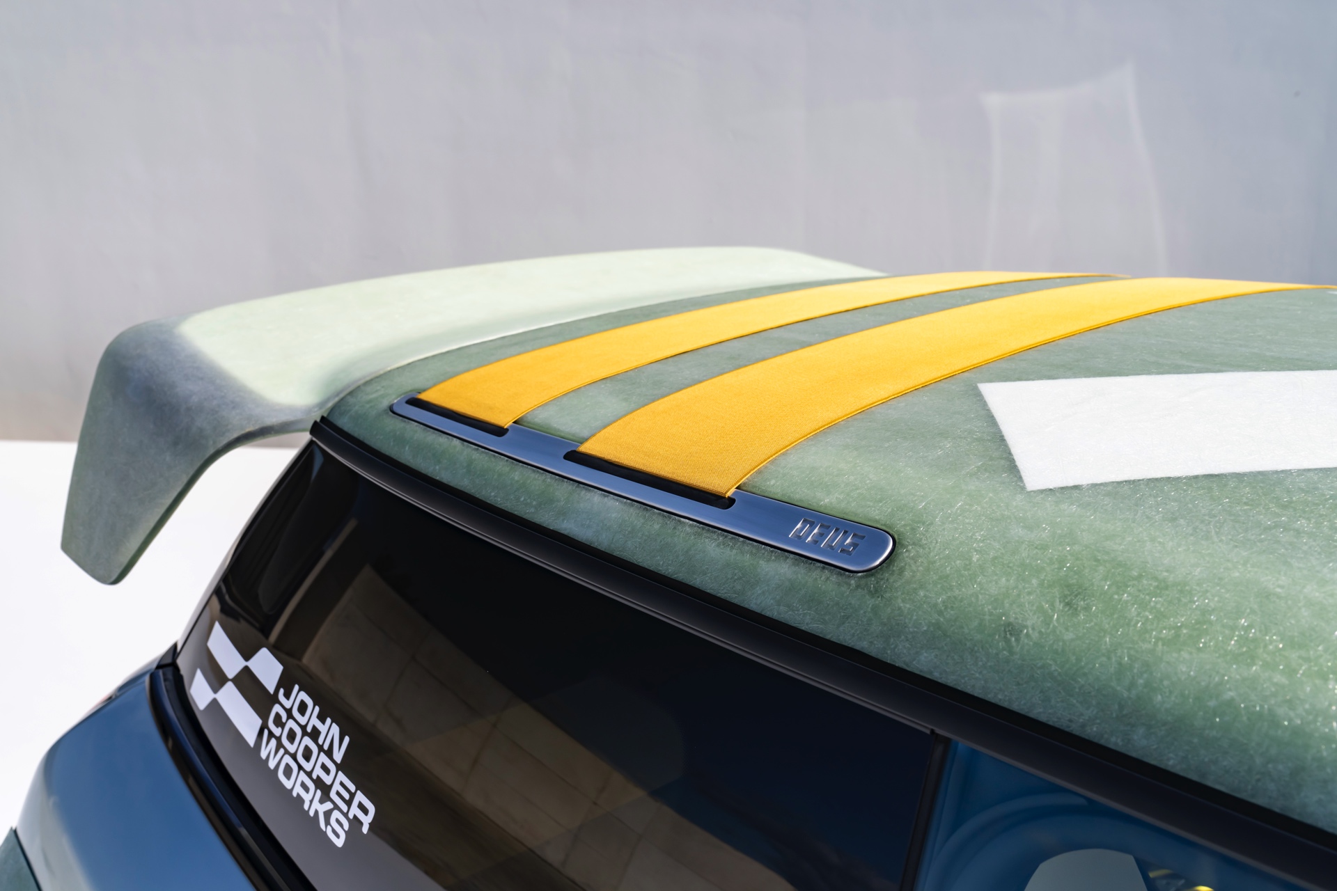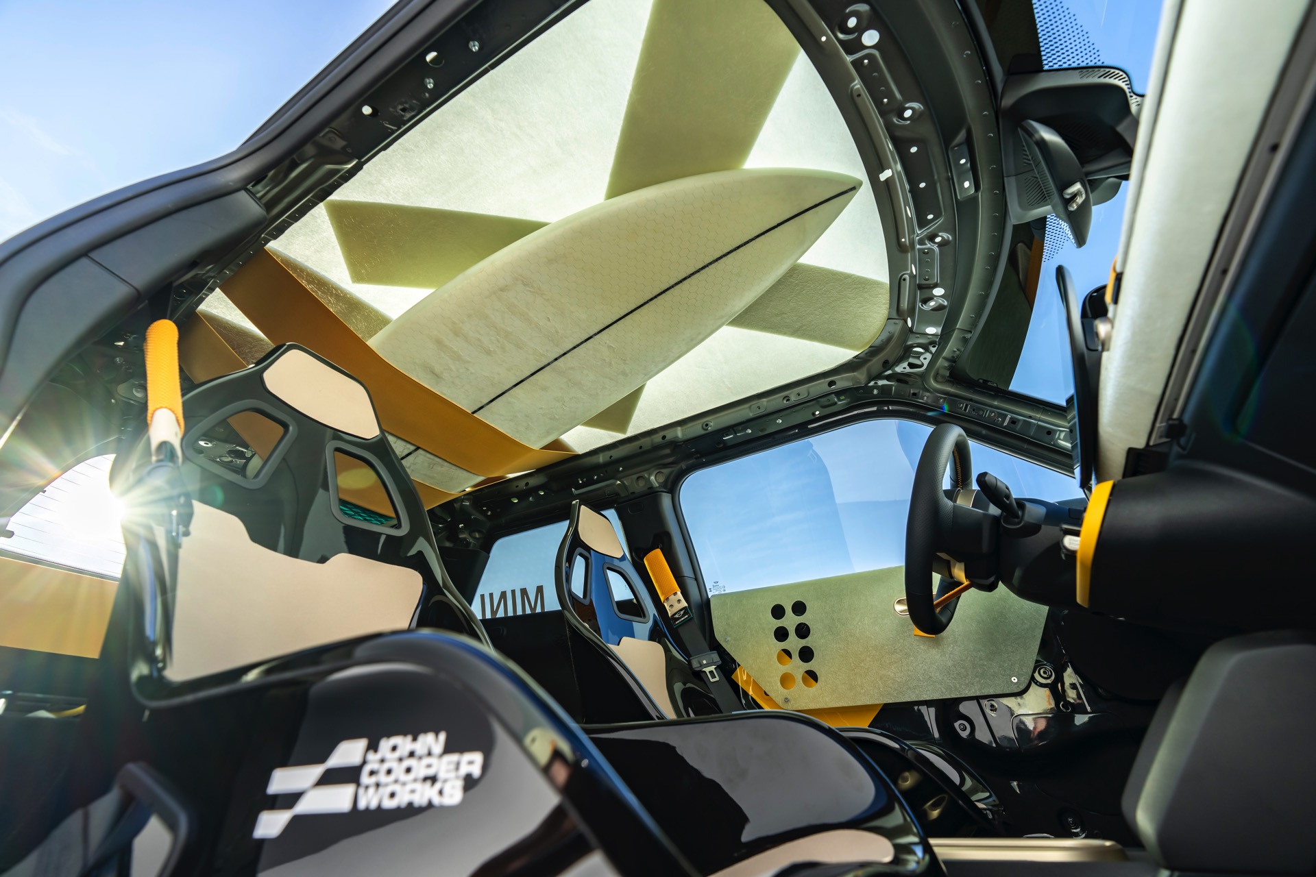 Noch etwas stärker und doch weniger laut steht ihm ‘The Skeg’ gegenüber: Das zweite Unikat basiert auf dem elektrischen MINI John Cooper Works (J01) und zitiert mit vielen Details den Surf-Sport. Seine halbtransparenten Fiberglas-Komponenten an Dach, Front und Heck sehen nicht nur spektakulär aus, sie sind auch 15 Prozent leichter als herkömmliche Materialien. Der Flex-Tip Surf-Spoiler am Heck verändert seine Form je nach Intensität der auf ihn treffenden Luftströme, während Befestigungsgurte auf dem Dach die Befestigung eines Surfboards erleichtern.