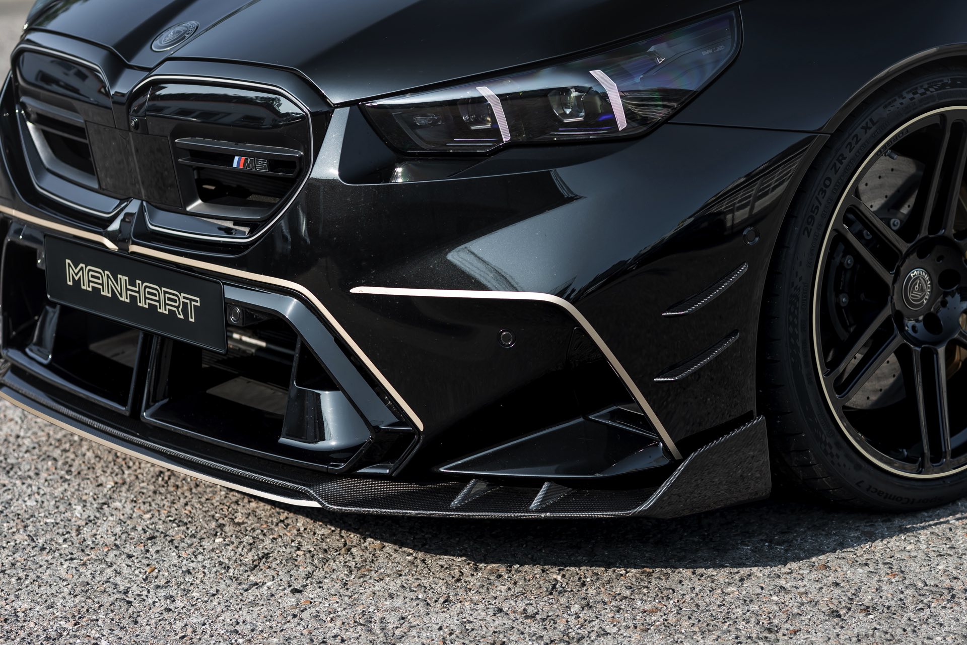 Auch in Schwarz kann im Fall des Manhart MH5 900E von Zurückhaltung keine Rede sein, auch wenn die zahlreichen Carbon-Teile in Verbindung mit der dunklen Lackierung nicht sofort ins Auge fallen. Die erheblich breitere Karosserie und die aggressiven Formen des BMW M5 (G90) werden nicht nur von einer Dekor-Beklebung in hellem Champagner zusätzlich betont, sondern auch von Frontsplitter, Dachkanten-Spoiler, Heckspoiler-Lippe und Diffusor-Einsatz aus Carbon flankiert.