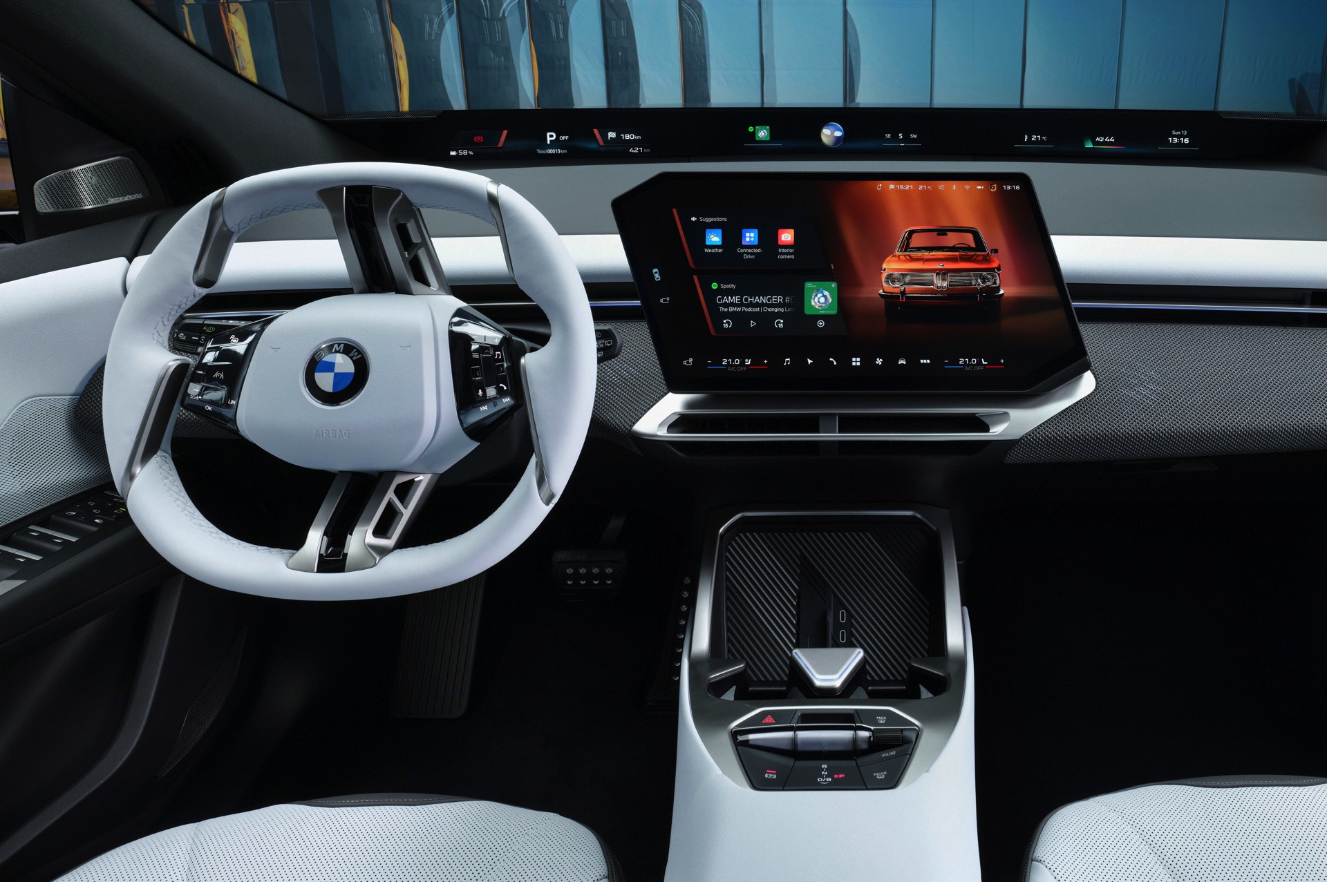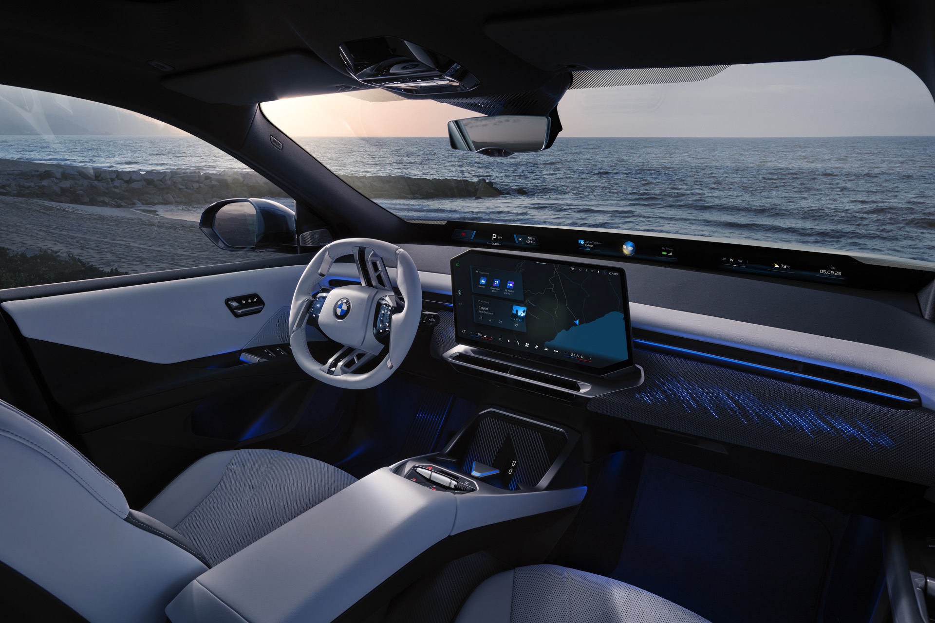 Völlig neu präsentiert sich auch der Innenraum der Neuen Klasse, der rund um die Displays des komplett neuen Infotainment-Systems BMW iDrive X gestaltet wurde. Am Fuß der Frontscheibe sehen wir das neue Panoramic Vision Display, das für alle Insassen jederzeit sichtbar ist. Für komplexere Aufgaben, etwa die Darstellung von Navigations-Karten oder das Ändern von Einstellungen, steht ein zum Fahrer geneigtes Free-Cut-Display mit 17,9 Zoll Bildschirm-Diagonale zur Verfügung. Für den Fahrer gibt es auf Wunsch zusätzlich ein Head-up-Display.