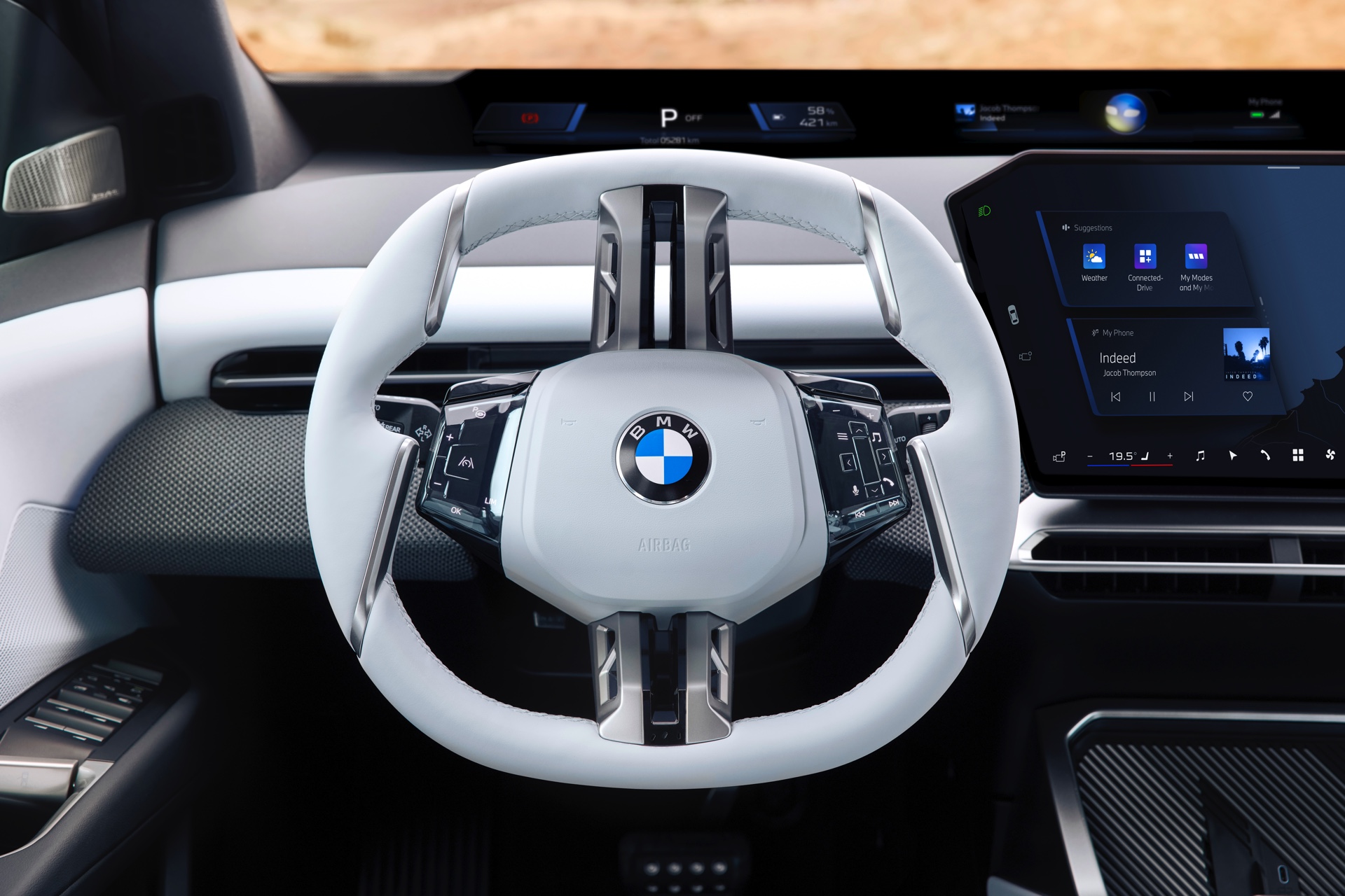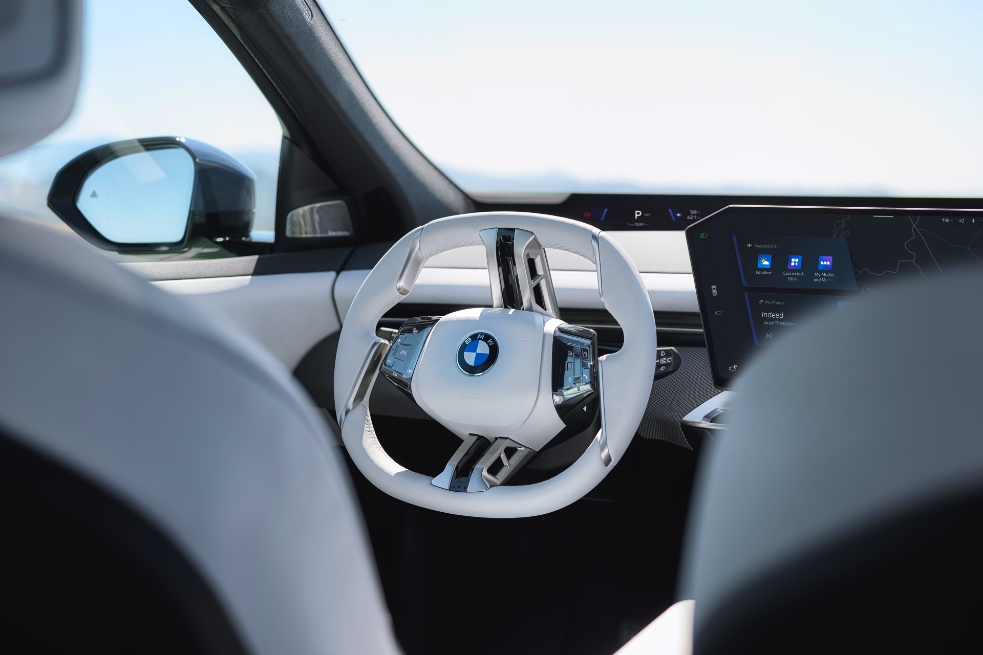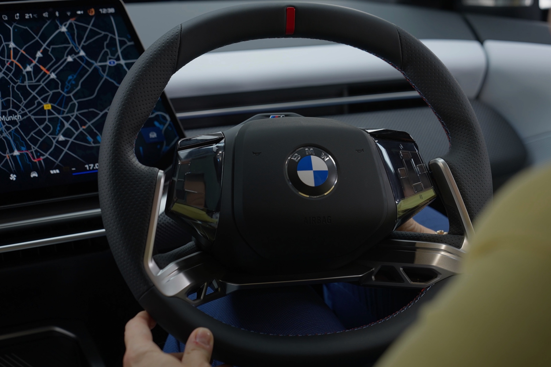 Das Lenkrad spielt mit seinen Bedienelementen im Bereich der Daumen-Ablagen auch eine wichtige Rolle für die Bedienung von iDrive X: Der iDrive-Controller hat tatsächlich ausgedient, stattdessen erfolgt die Steuerung der meisten Funktionen über den großen Touch-Screen, per Spracheingabe – oder eben über die Bedienfelder und Tasten am Lenkrad, dank derer sich Basis-Funktionen wie der Wechsel des Radiosenders, Lautstärke-Änderungen, Telefonie-Funktionen oder Anpassungen an den Einstellungen der Assistenzsysteme immer in Reichweite befinden.