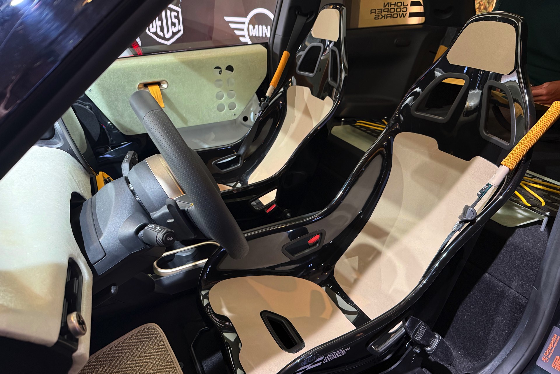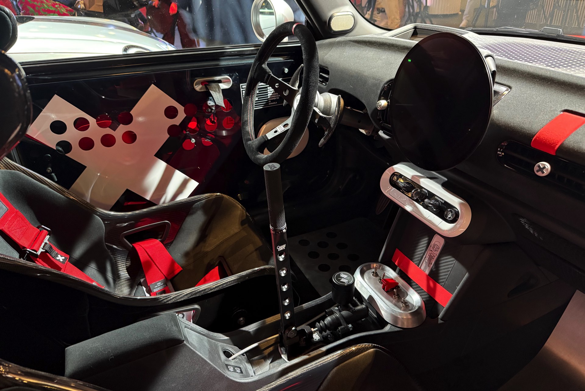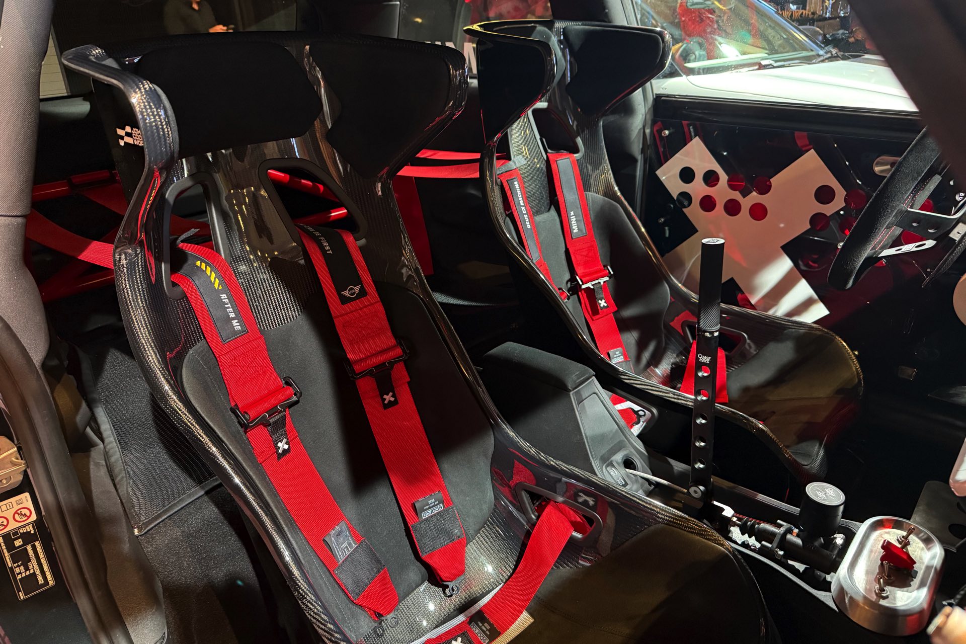 Weitere Hingucker sind die dramatisch verbreiterten Kotflügel vorne und hinten, die pragmatisch montierten Außenspiegel, die Heckspoiler-Finne und der mächtige Diffusor. Im von allen überflüssigen Verkleidungen befreiten Innenraum verkörpern Überrollkäfig, Carbon-Schalensitze, 5-Punkt-Gurte, ein reduziertes Alcantara-Lenkrad ohne Airbag und natürlich die hydraulische Handbremse mit großem Hebel authentisches Motorsport-Flair.