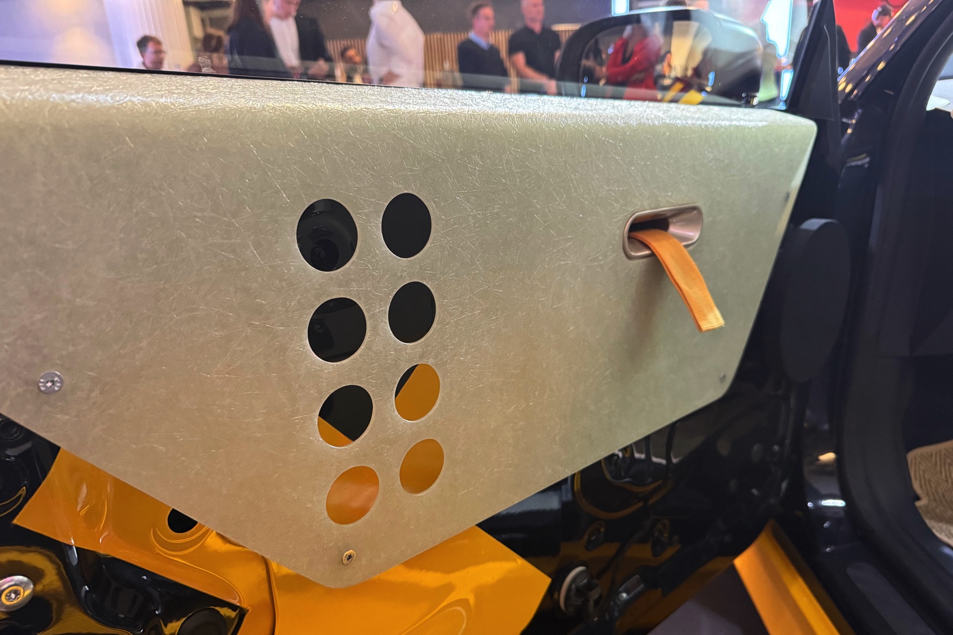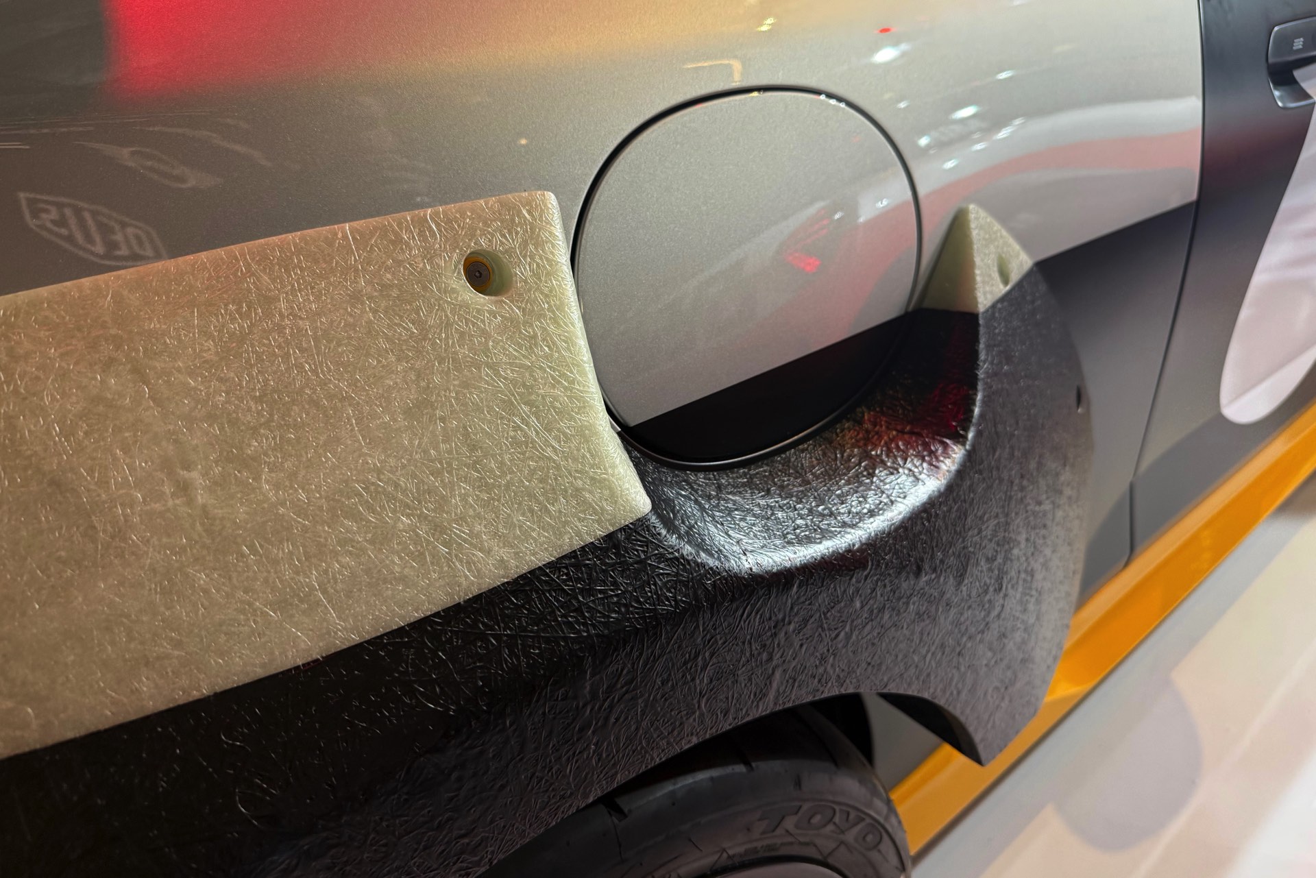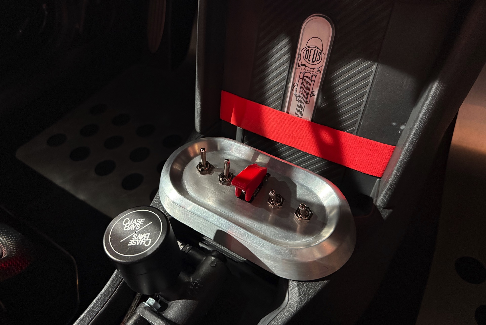 Weitere Hingucker sind die dramatisch verbreiterten Kotflügel vorne und hinten, die pragmatisch montierten Außenspiegel, die Heckspoiler-Finne und der mächtige Diffusor. Im von allen überflüssigen Verkleidungen befreiten Innenraum verkörpern Überrollkäfig, Carbon-Schalensitze, 5-Punkt-Gurte, ein reduziertes Alcantara-Lenkrad ohne Airbag und natürlich die hydraulische Handbremse mit großem Hebel authentisches Motorsport-Flair.