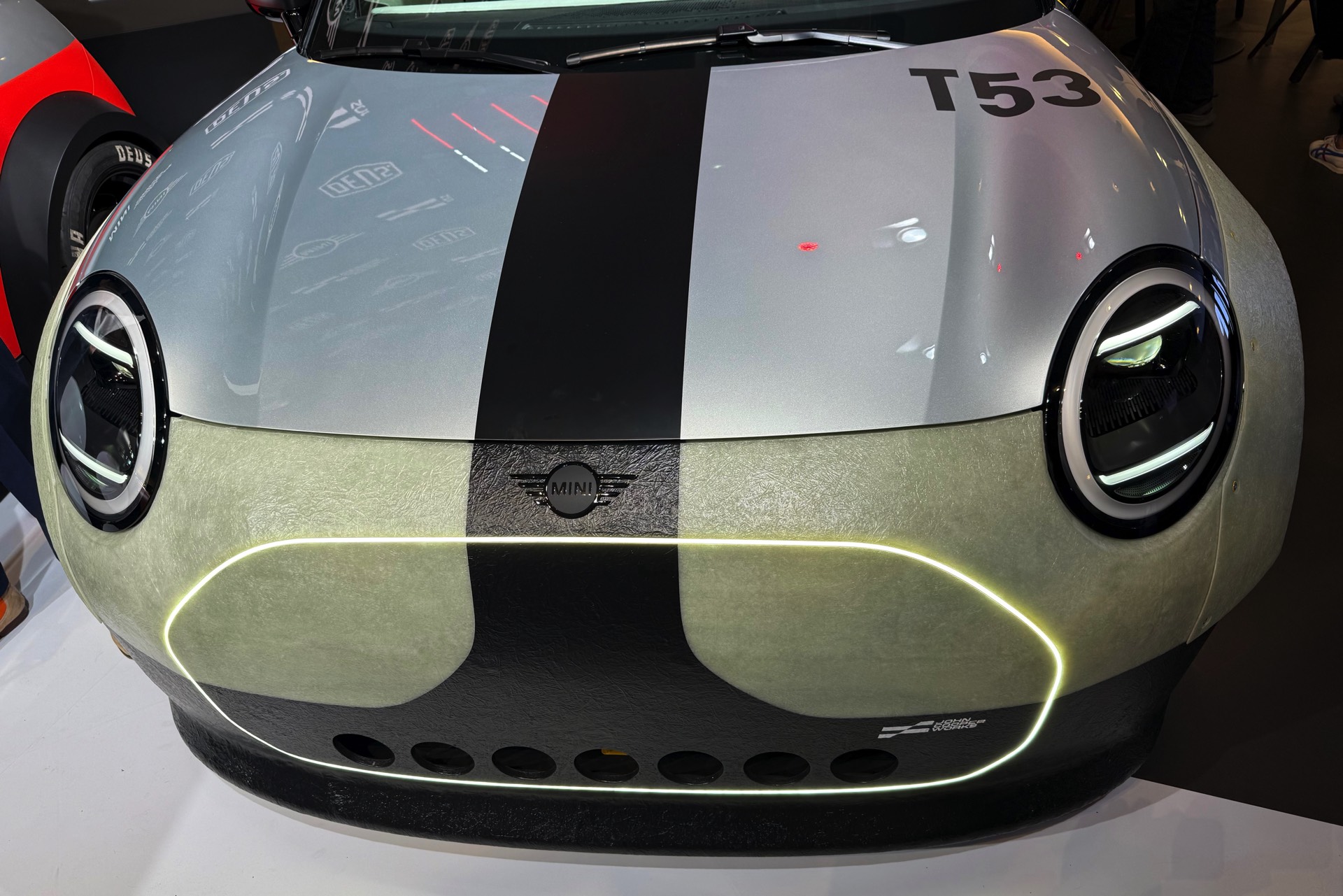 Für Rennsport-Fans ist vor allem der in Rot, Weiß und Schwarz gehaltene ‘The Machina’ von Interesse: Basierend auf dem aktuellen MINI John Cooper Works (F66) haben die Designer von MINI und DEUS ein Fahrzeug kreiert, das aus jeder Perspektive satte Performance verspricht und mit zahlreichen Details begeistert, die direkt Lust auf eine Ausfahrt machen. Zu den Highlights zählen die Scheinwerfer, die als funktionale Lufteinlässe ausgeführt sind: Nur zwei schmale LED-Streifen sorgen für den eigentlichen Hauptjob, rundherum sind die Scheinwerfer kreisrunde Lufteinlässe zur Kühlung von Motorraum und Bremsen. Möglich ist diese Lösung auch, weil ‘The Machina’ über vier Zusatz-Scheinwerfer im Rallye-Stil verfügt.