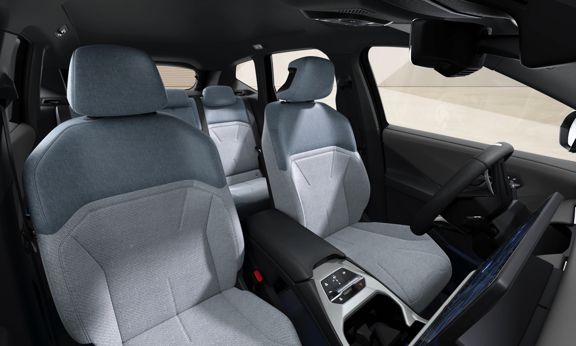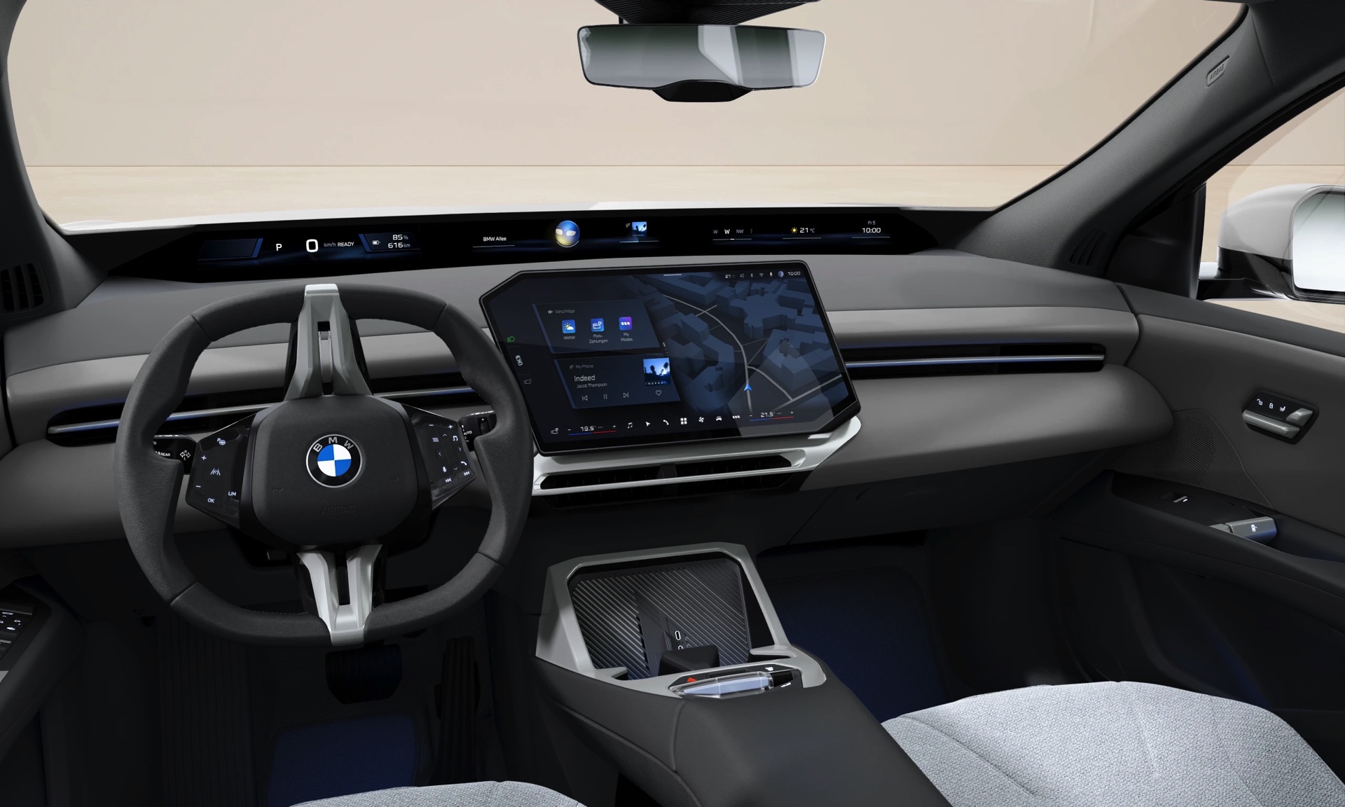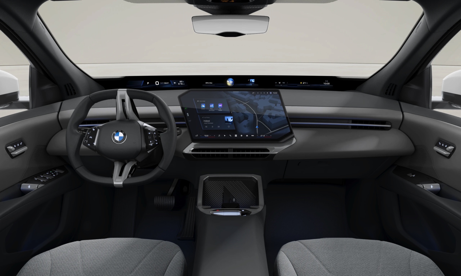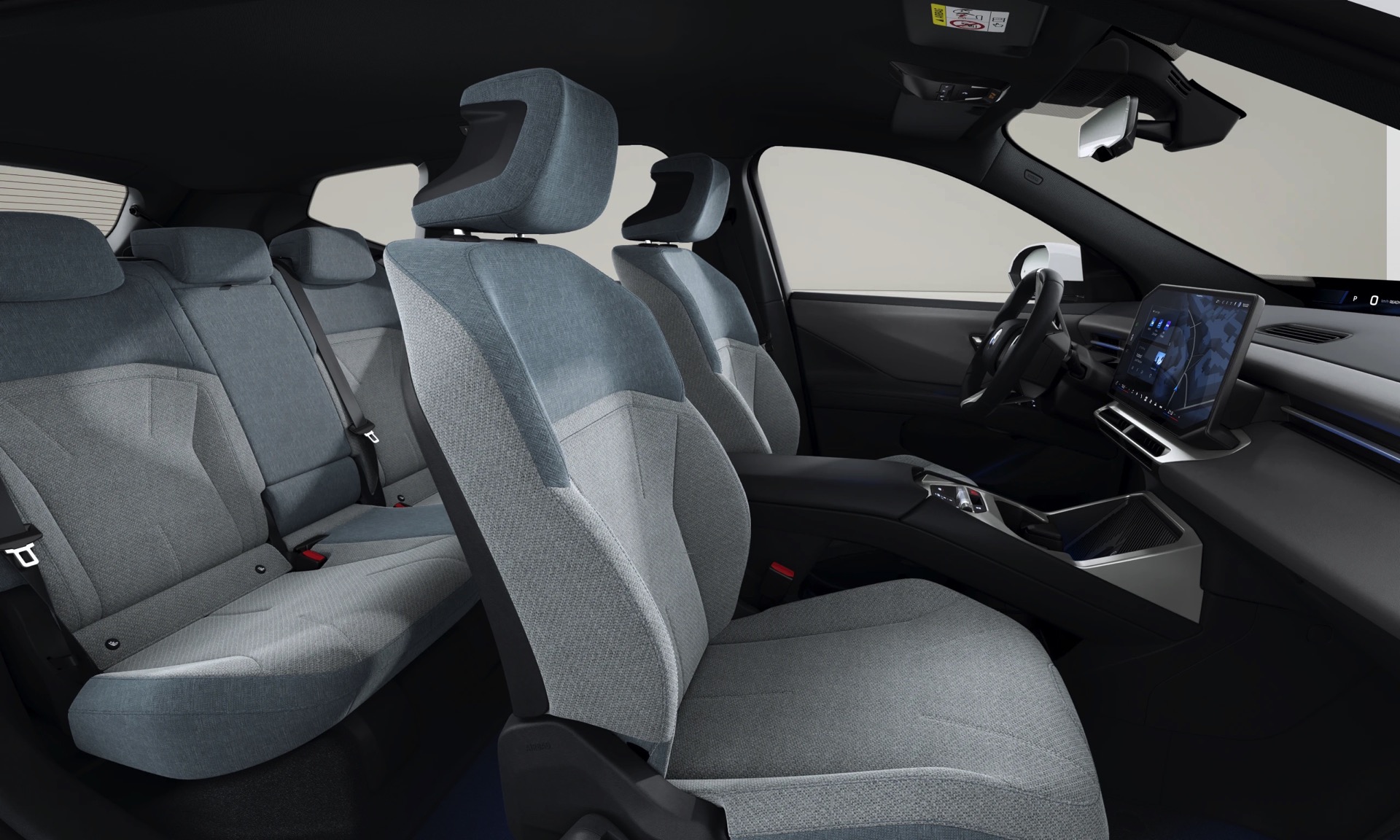 Im Innenraum setzt der Serien-iX3 auf das Interieurdesign Essential in Vivid Grey Bicolor. Die Textilien der Econeer genannten Sitzbezüge fühlen sich zwar wie klassische Stoffe an, bestehen aber aus recycelten PET-Flaschen und tragen damit ihren Teil zum erstaunlich geringen Carbon Footprint des iX3 bei. Immer im Grundpreis enthalten ist auch iDrive X mit 17,9 Zoll großem Infotainment-Touchscreen und dem neuartigen Panoramic Vision Display auf voller Breite der Frontscheibe.