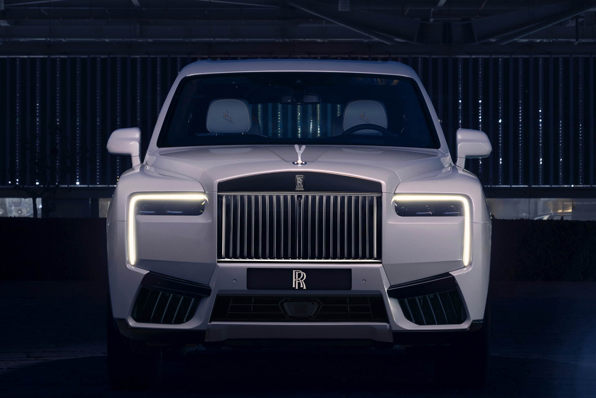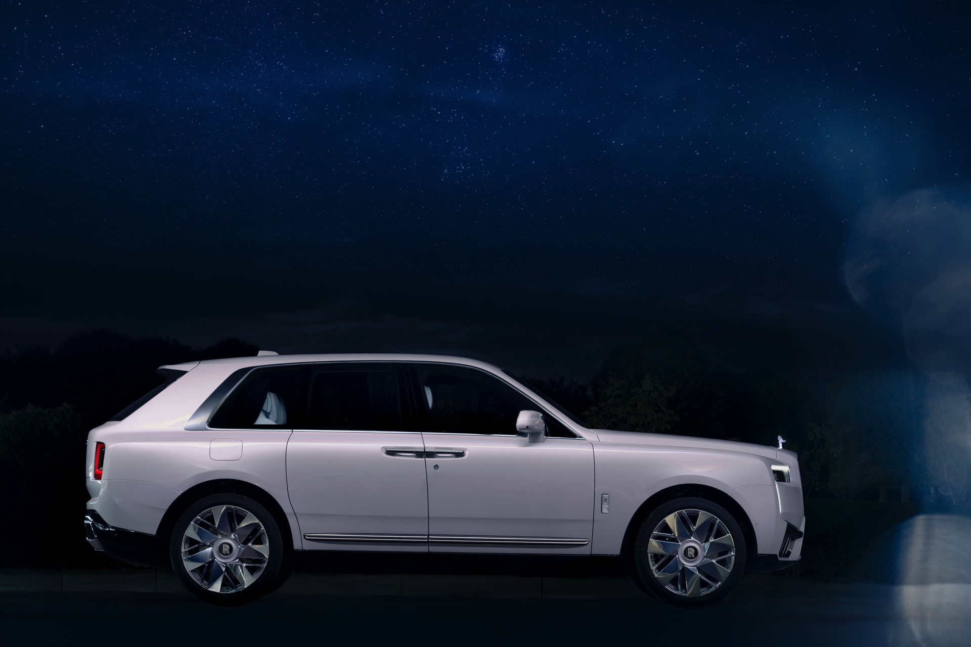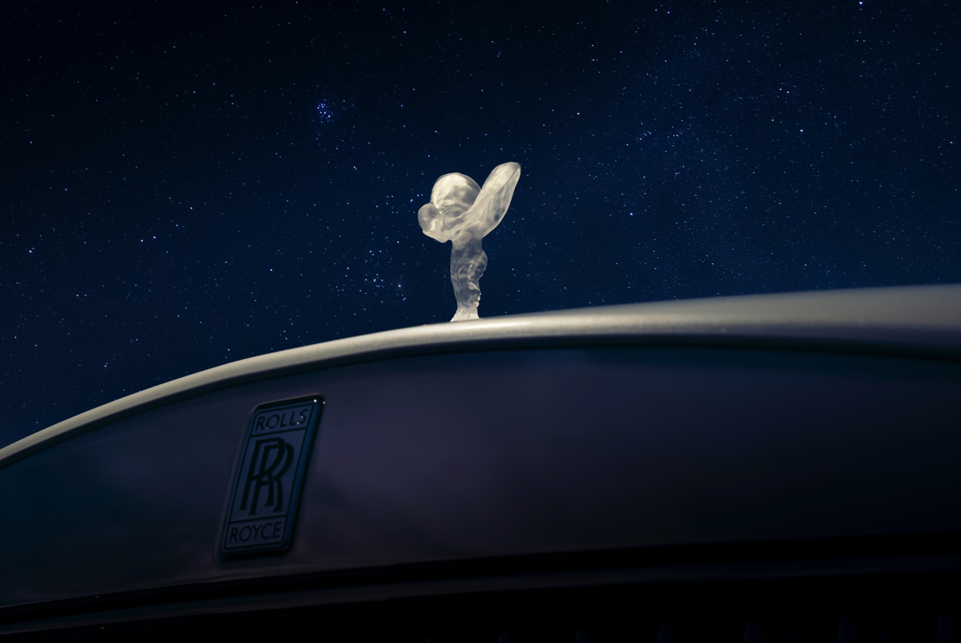 Die Außenfarbe Arabescato Pearl soll an den Mondschein einer dunklen Nacht erinnern, während die von Hand gezeichnete Coach Line in Charles Blue einen edlen Akzent setzt. Die durchleuchtete Spirit of Ecstasy rundet das Spiel mit dem Licht auf sehenswerte Art und Weise ab.