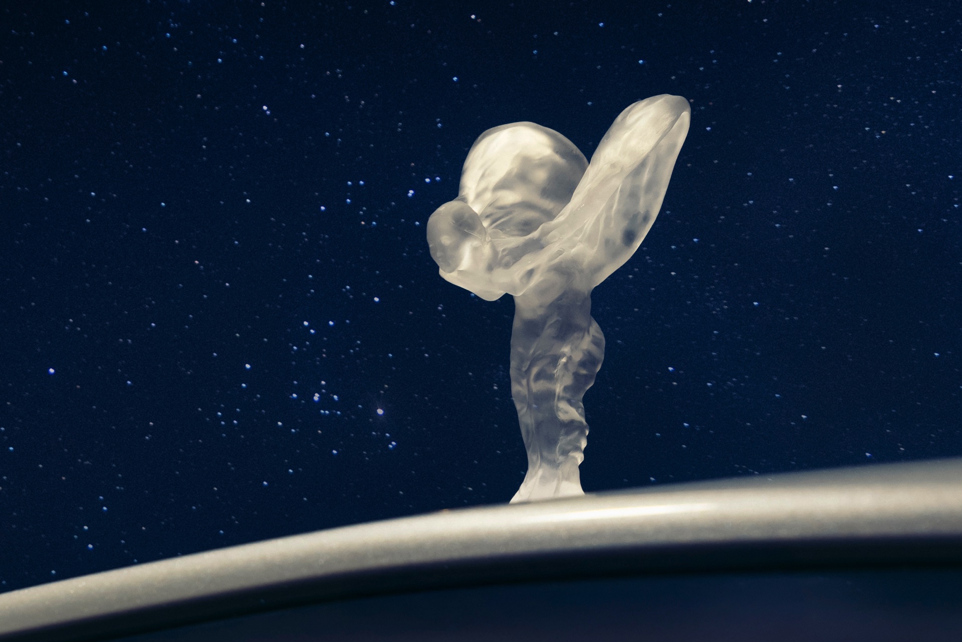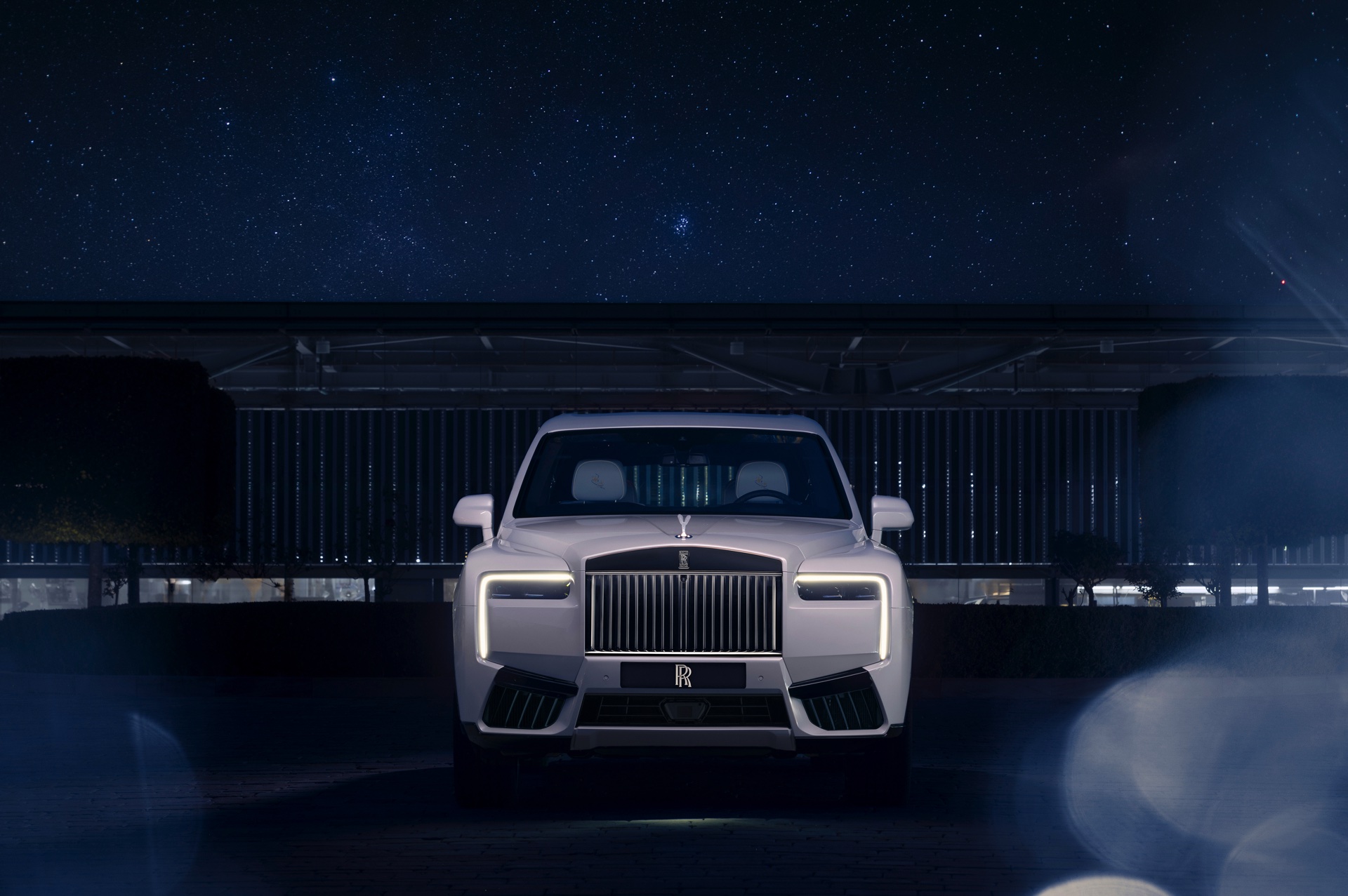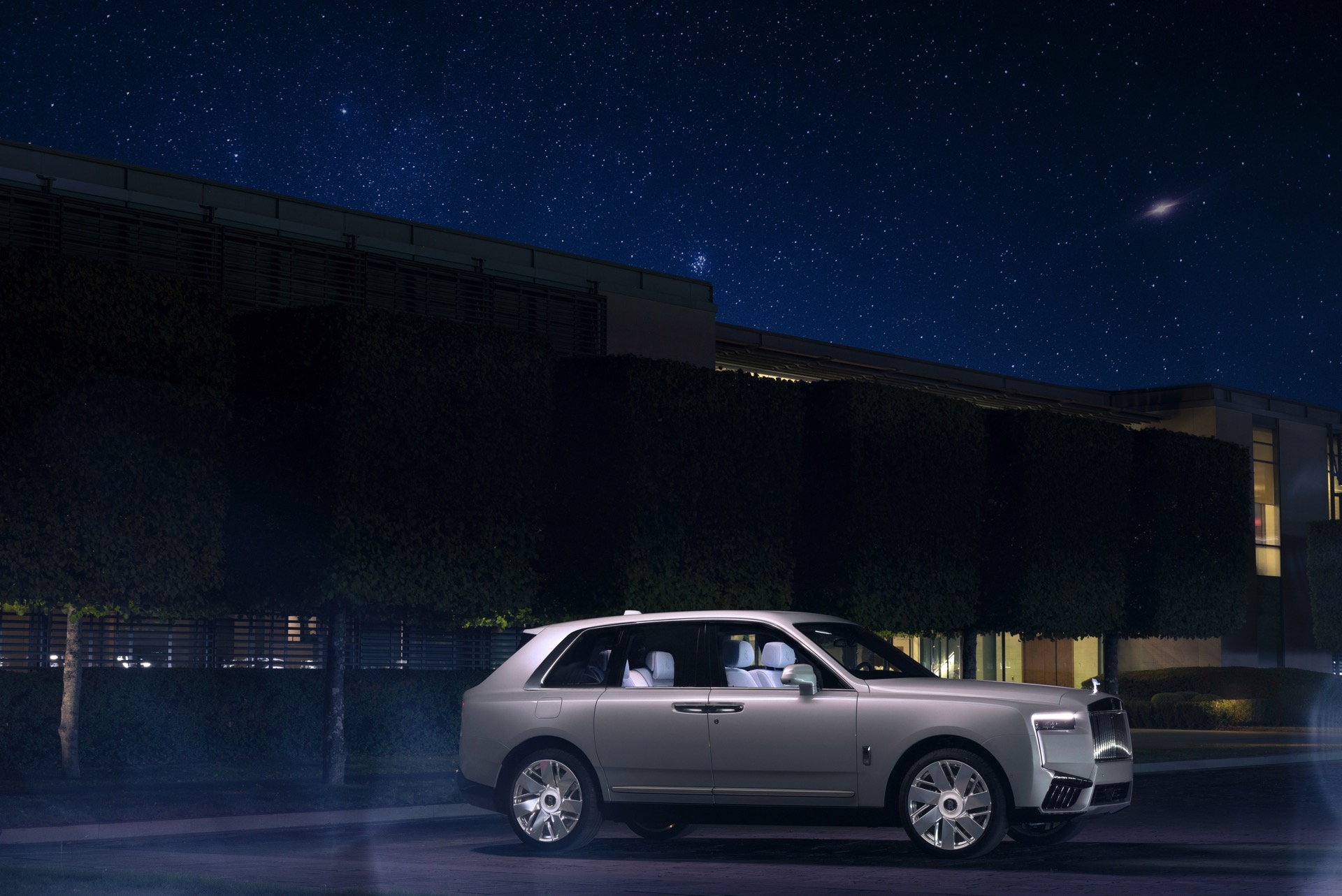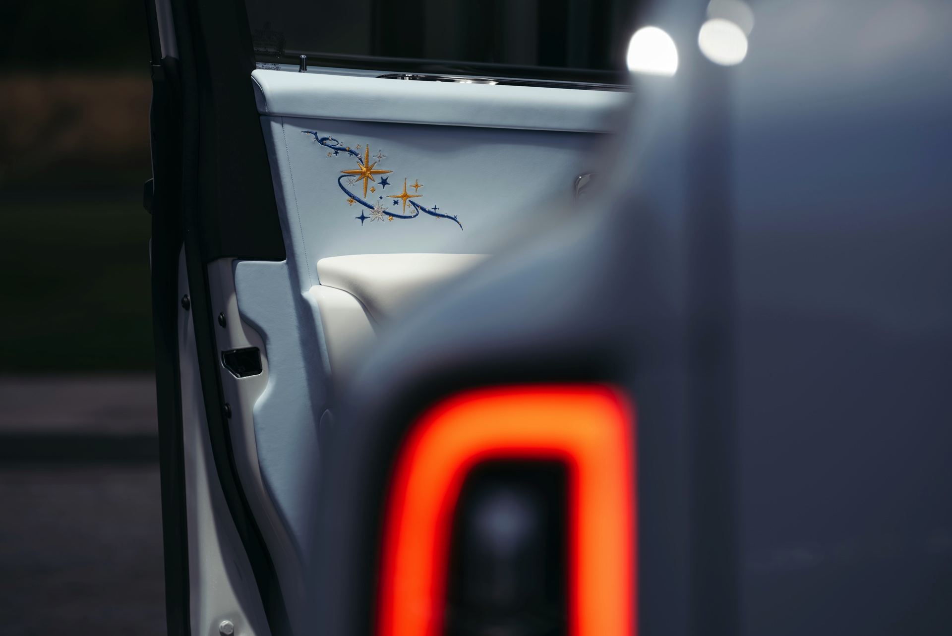Die Außenfarbe Arabescato Pearl soll an den Mondschein einer dunklen Nacht erinnern, während die von Hand gezeichnete Coach Line in Charles Blue einen edlen Akzent setzt. Die durchleuchtete Spirit of Ecstasy rundet das Spiel mit dem Licht auf sehenswerte Art und Weise ab.