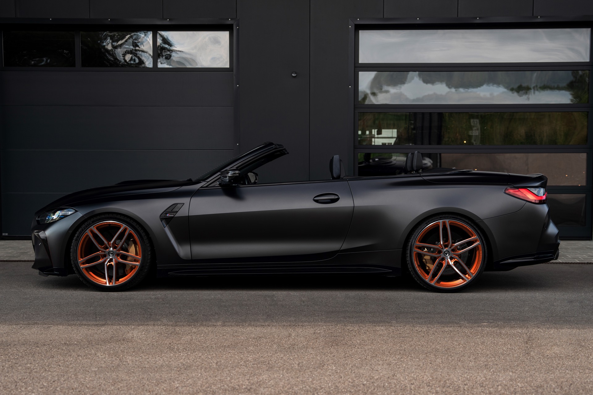 In der Seitenansicht zeigt das BMW M4 Cabrio die 21 Zoll großen Hurricane RR Schmiederäder, die Kenner mit ihren orangen Details unmissverständlich auf G-Power hinweisen. Für die abschließende Tieferlegung des 700 PS starken Cabrios sorgt ein Satz höhenverstellbarer Gewindefedern, der das beeindruckende Gesamtpaket abrundet.