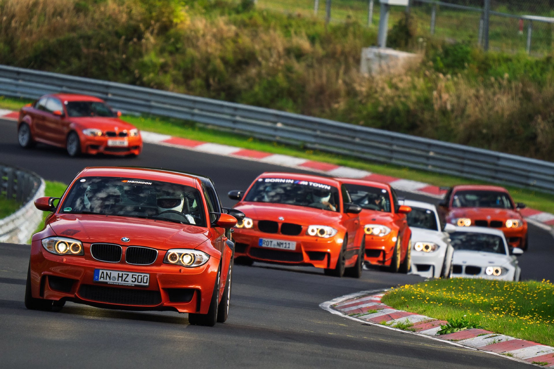 Am Samstag versammelte sich der 105 Fahrzeuge starke Fahrspaß-Konvoi zu zwei geführten Runden auf der Nürburgring Nordschleife, wobei ein historischer BMW 2002 turbo als geistiger Urvater des 1er M Coupé das Tempo vorgab. Die dominierende Farbe in der Grünen Hölle war wenig überraschend Valencia Orange, aber natürlich waren auch zahlreiche 1er M in Saphirschwarz und Alpinweiß mit vor Ort. Ebenfalls mit vor Ort war das einzige BMW 1er M Coupé in Java Green, dessen Übergabe als “Green Mamba” in der BMW Welt München einst eine kleine Sensation war.