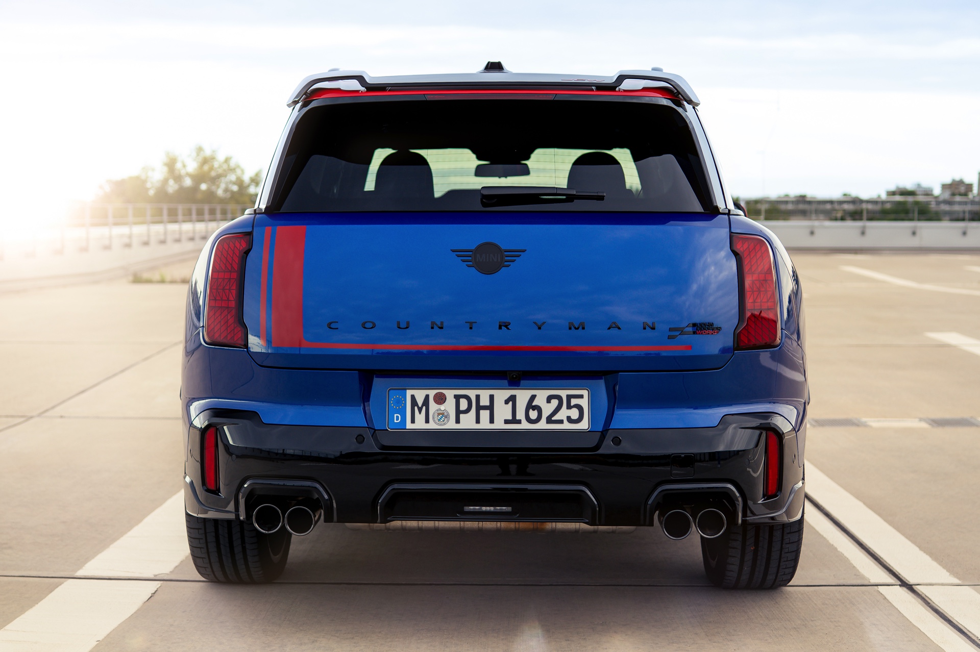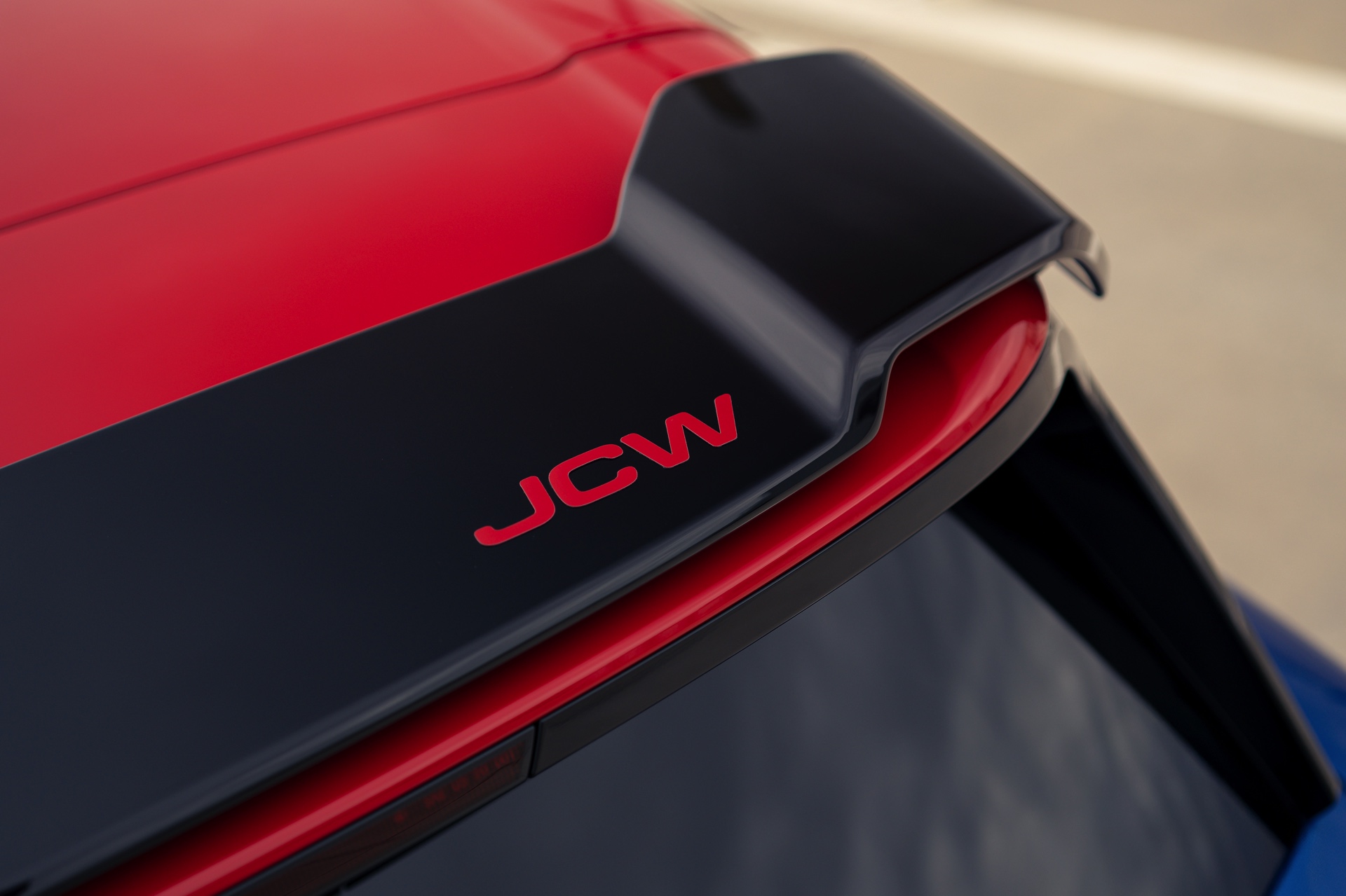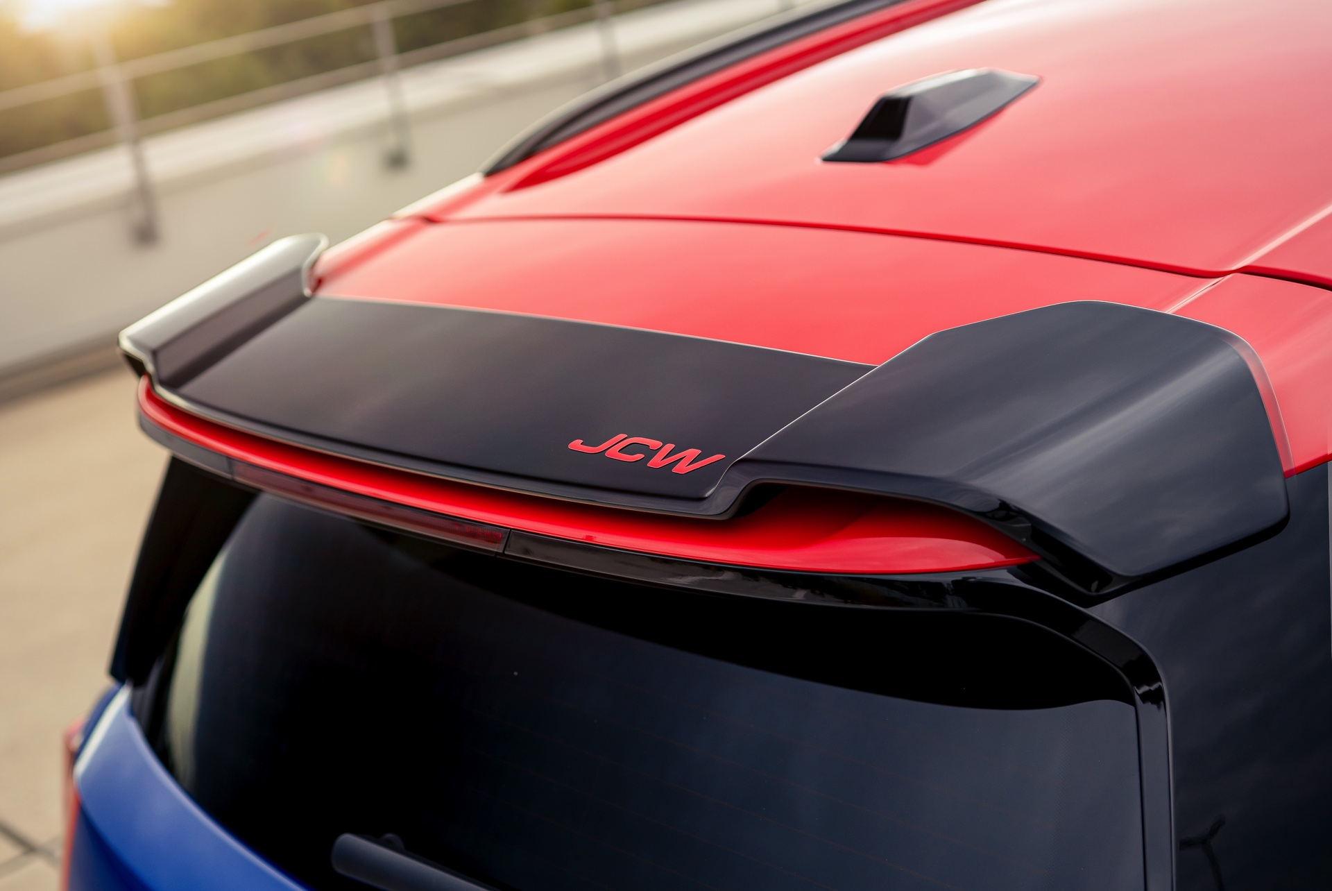 Am Heck punktet der MINI John Cooper Works Countryman nicht nur mit den vier Endrohren für seinen BMW-Vierzylinder, sondern auch mit dem JCW Dachkanten-Spoiler in Hochglanz-Schwarz. Der farbig abgesetzte Heckspoiler ist für 950 Euro erhältlich und sorgt gerade in Verbindung mit der roten Dachlackierung für einen sehenswerten Kontrast. Die rote Dekor-Beklebung an den vorderen Türen und auf der Heckklappe rundet den Superman-Look elegant ab.