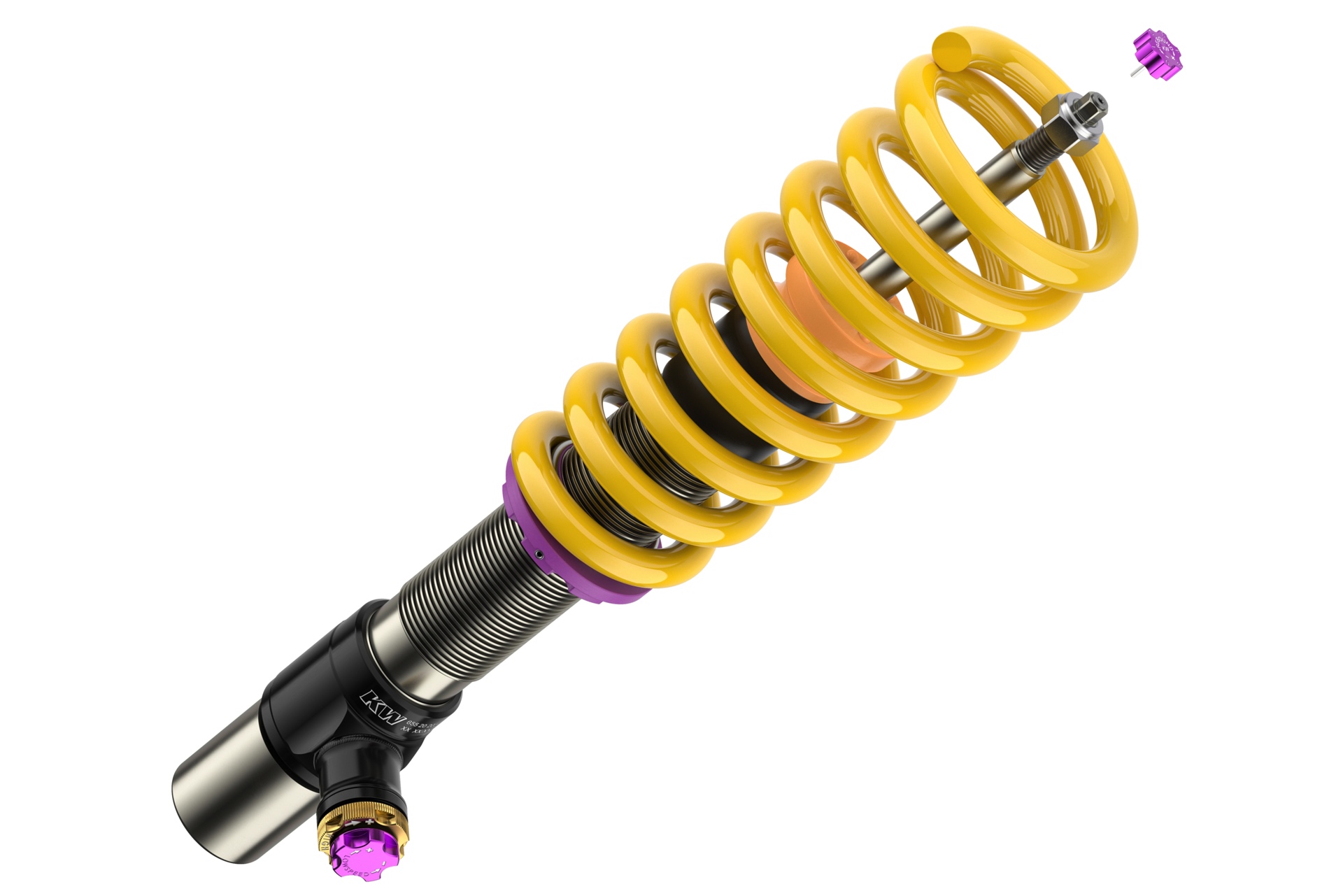 Florian Johann (KW Brand Manager): “Während bei unseren ersten V4 Gewindefahrwerken die einstellbaren Druckstufenventile entweder über einen an den Federbeinen angeschweißten Ausgleichsbehälter oder über eine Schlauchanbindung an ein angeschlossenes externes Reservoir mit dem Dämpfer verbunden waren, ist dies bei unserer neuen Einstelltechnik nicht mehr notwendig. Die in den Highspeed- und Lowspeed-Kräften einstellbaren Druckstufenventile sind nun seitlich an den Aluminiumfederbeinen angebracht. Das einstellbare Lowspeed-Zugstufenventil wird wie bekannt weiterhin an der Kolbenstange eingestellt.”