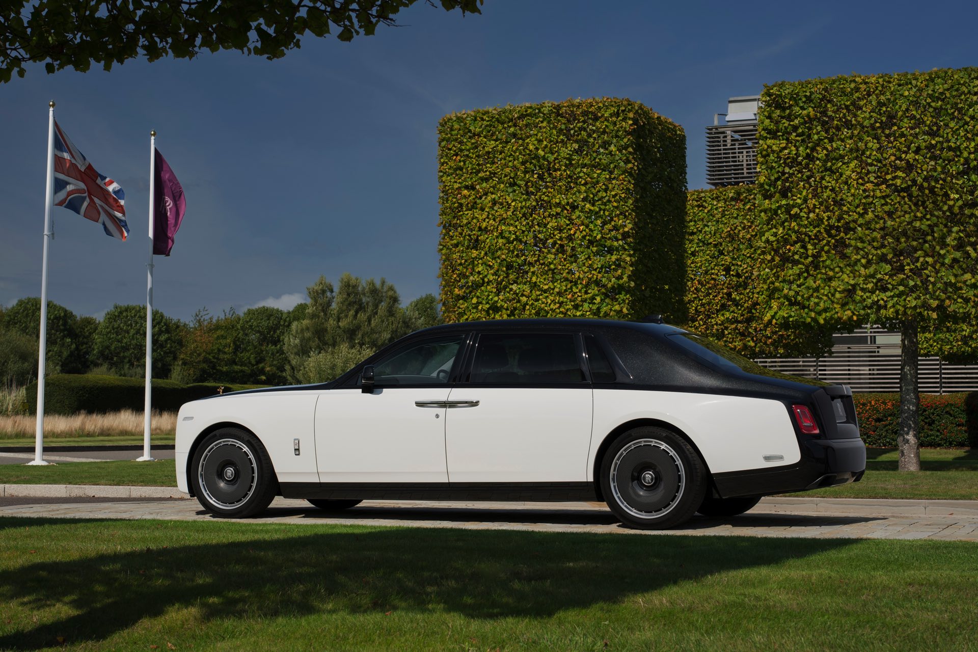 Das größte Highlight aus Münchner Sicht findet sich jedoch unter der schwarz lackierten Motorhaube, denn hier arbeitet der 6,75 Liter große V12-Biturbo von BMW. Das Triebwerk trägt eine neu gestaltete Abdeckung, die nicht nur in der Außenfarbe Arctic White lackiert wurde, sondern auch mit 24-karätigem Gold verziert wurde. So dankt Rolls-Royce auch dem Motor aus München, der in den letzten Jahrzehnten so entscheidend zum einzigartigen Gefühl von Souveränität an Bord des Phantom beigetragen hat.