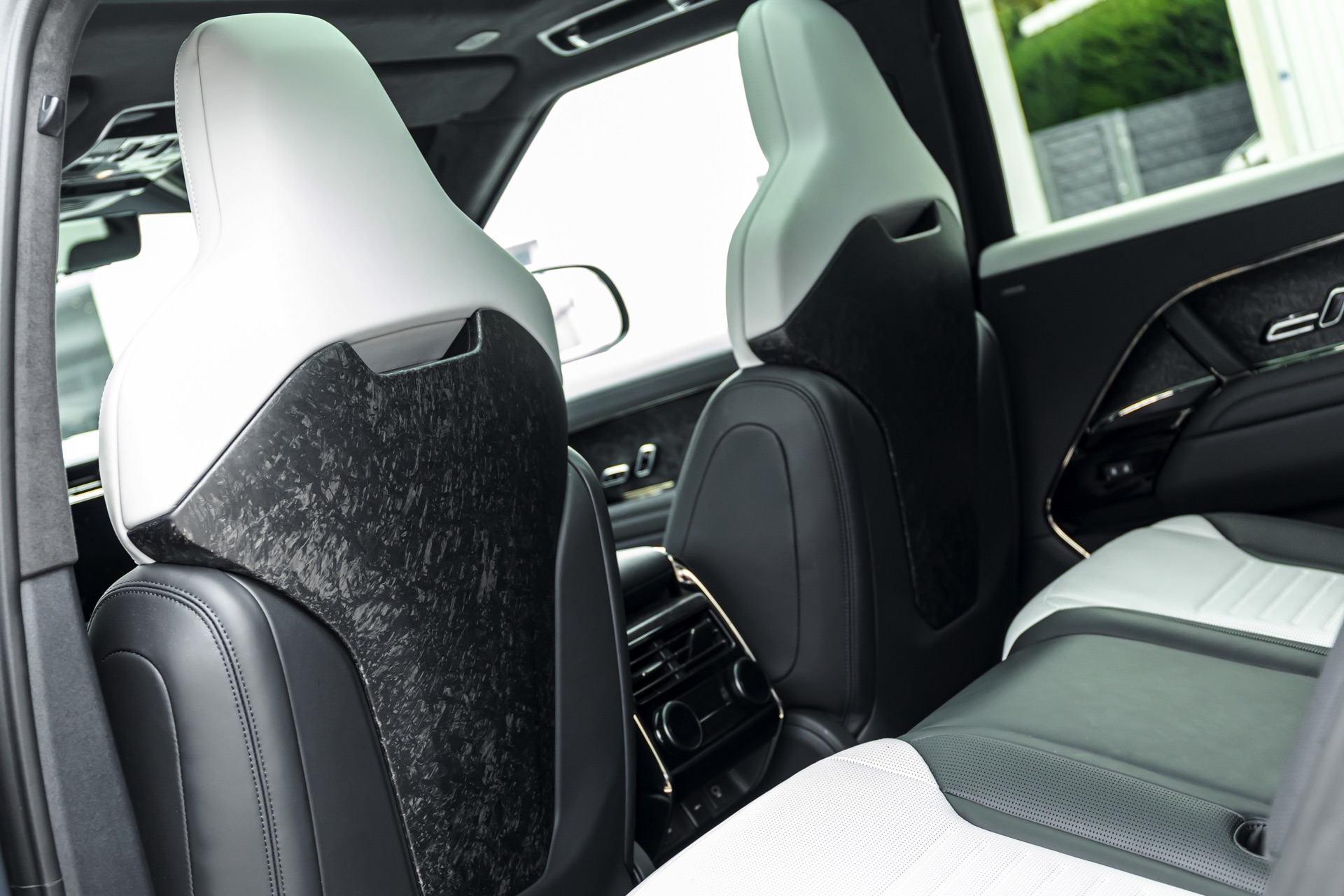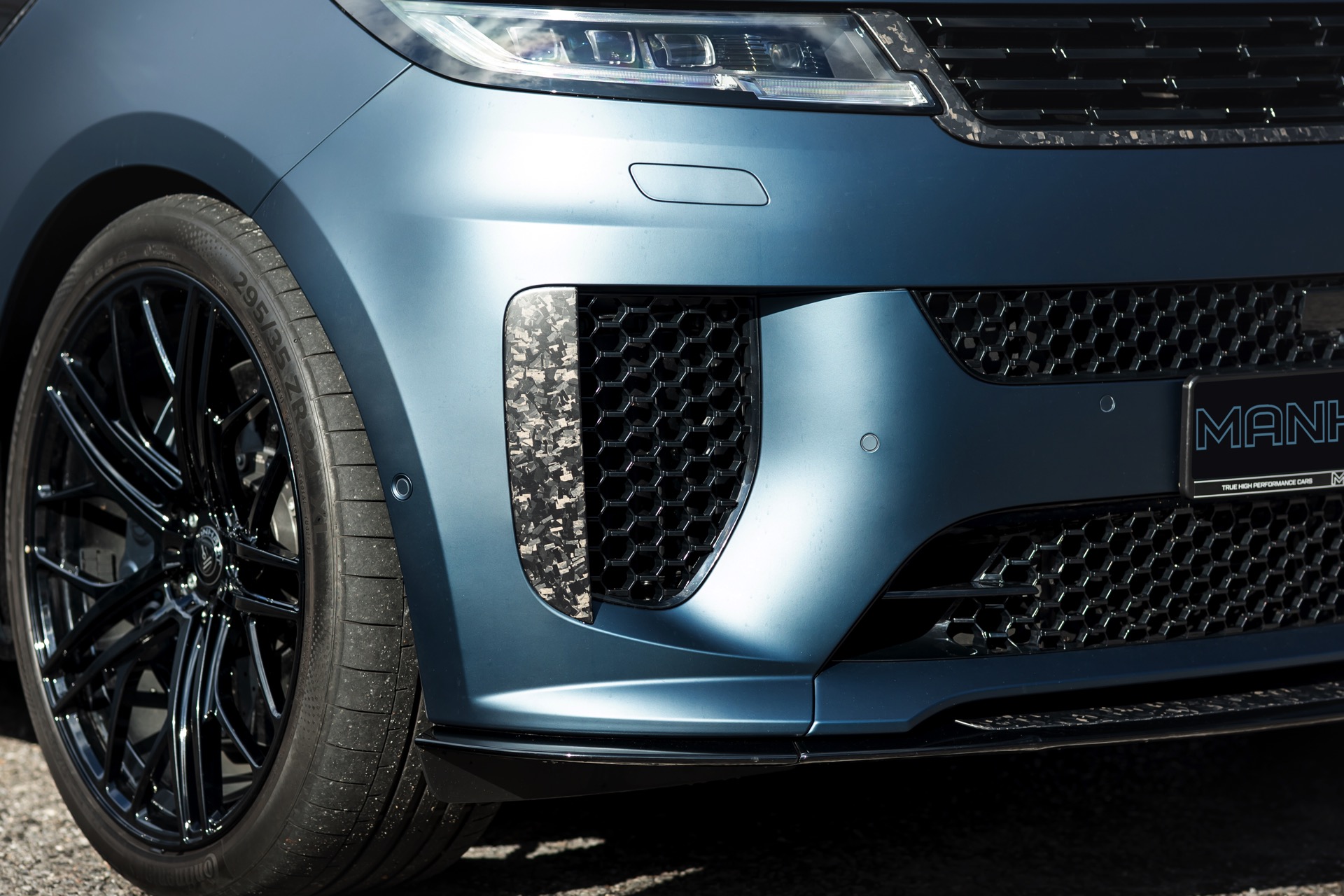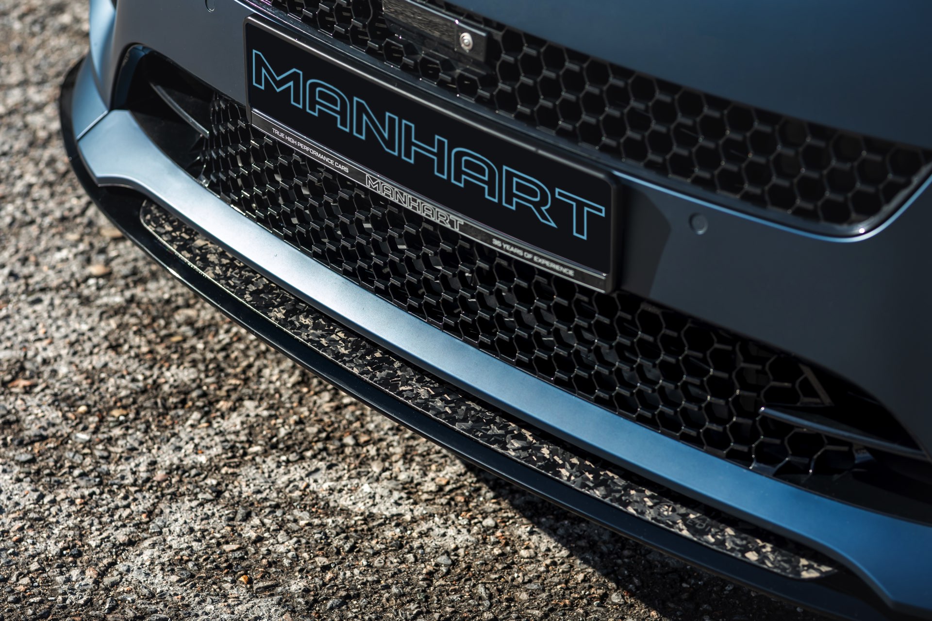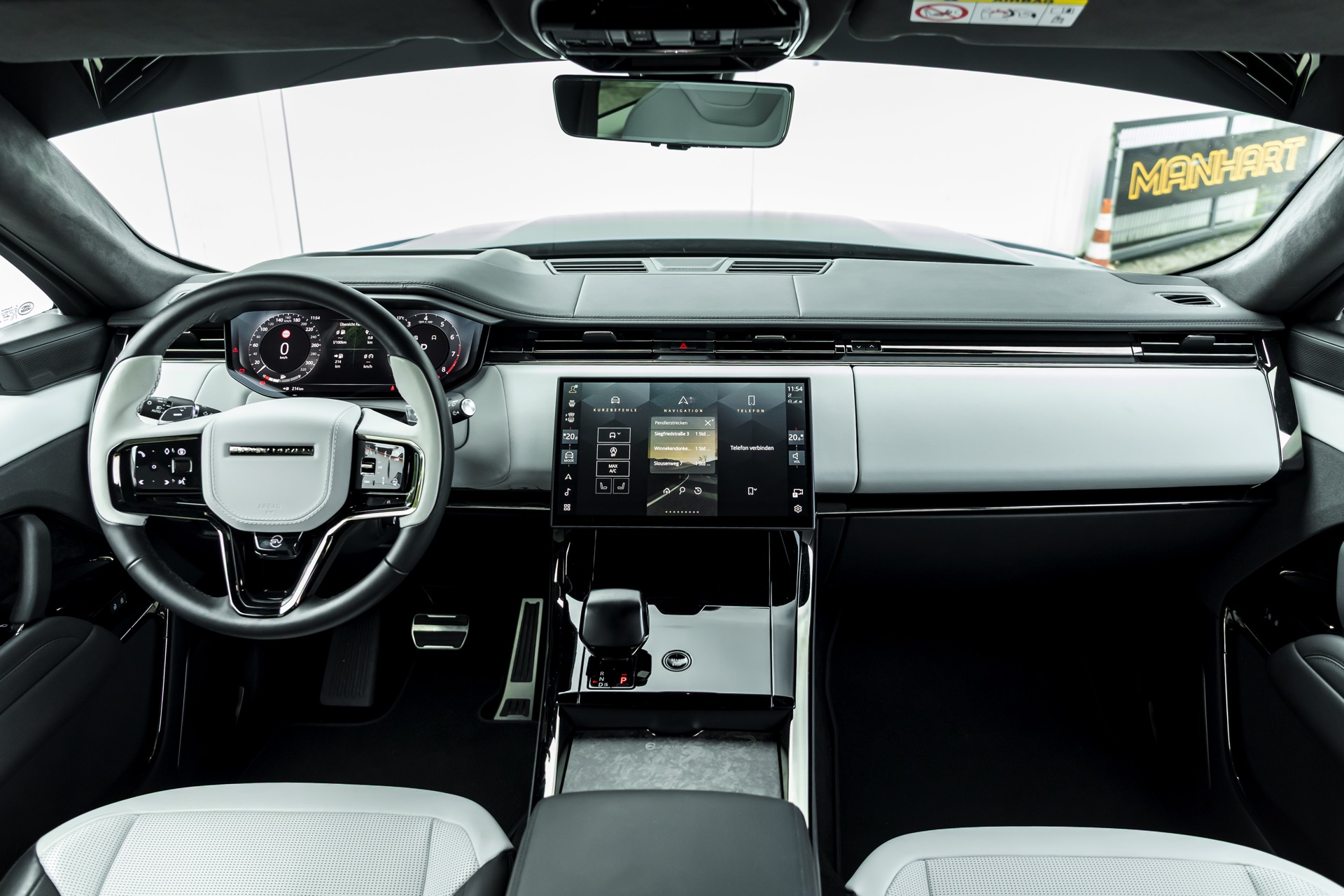 Gleiches gilt für den Innenraum, denn auch hier gibt es jede Menge Forged Carbon direkt von Range Rover. Wer zumindest ein Mindestmaß an Manhart-Individualisierung wünscht, kann aber Details wie Fußmatten mit entsprechenden Schriftzügen bestellen. Vergleichsweise dezent bleibt auch die Manhart-Folierung für das Exterieur, die auf Höhe der Türgriffe auch bei Fahrzeugen mit matter Lackierung einen glänzenden Akzent setzt.