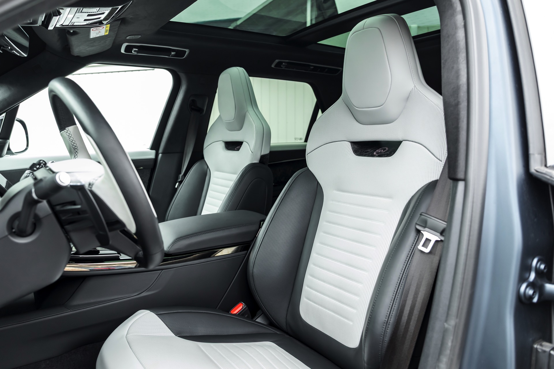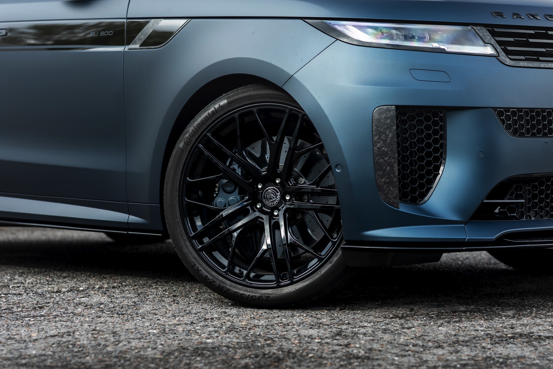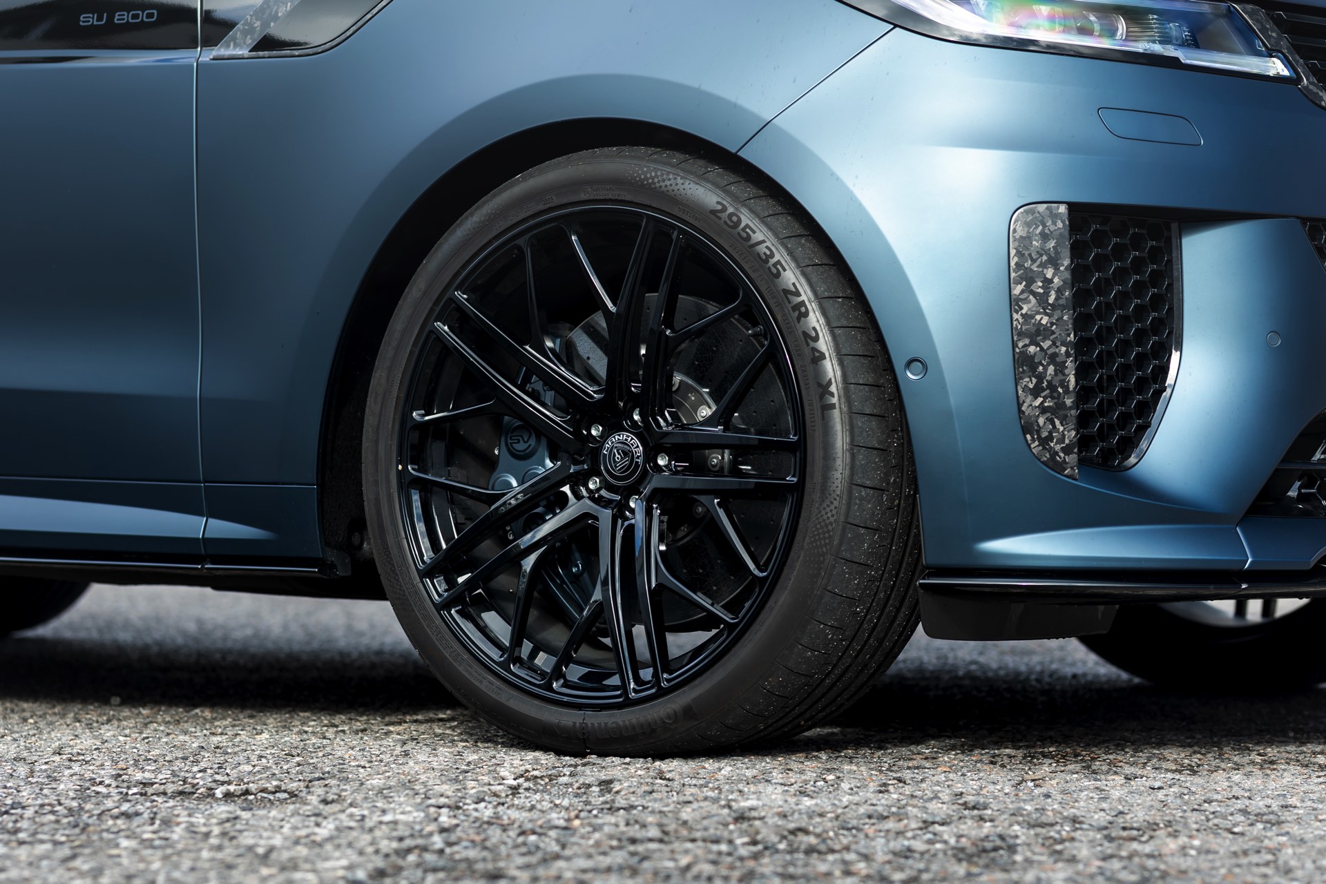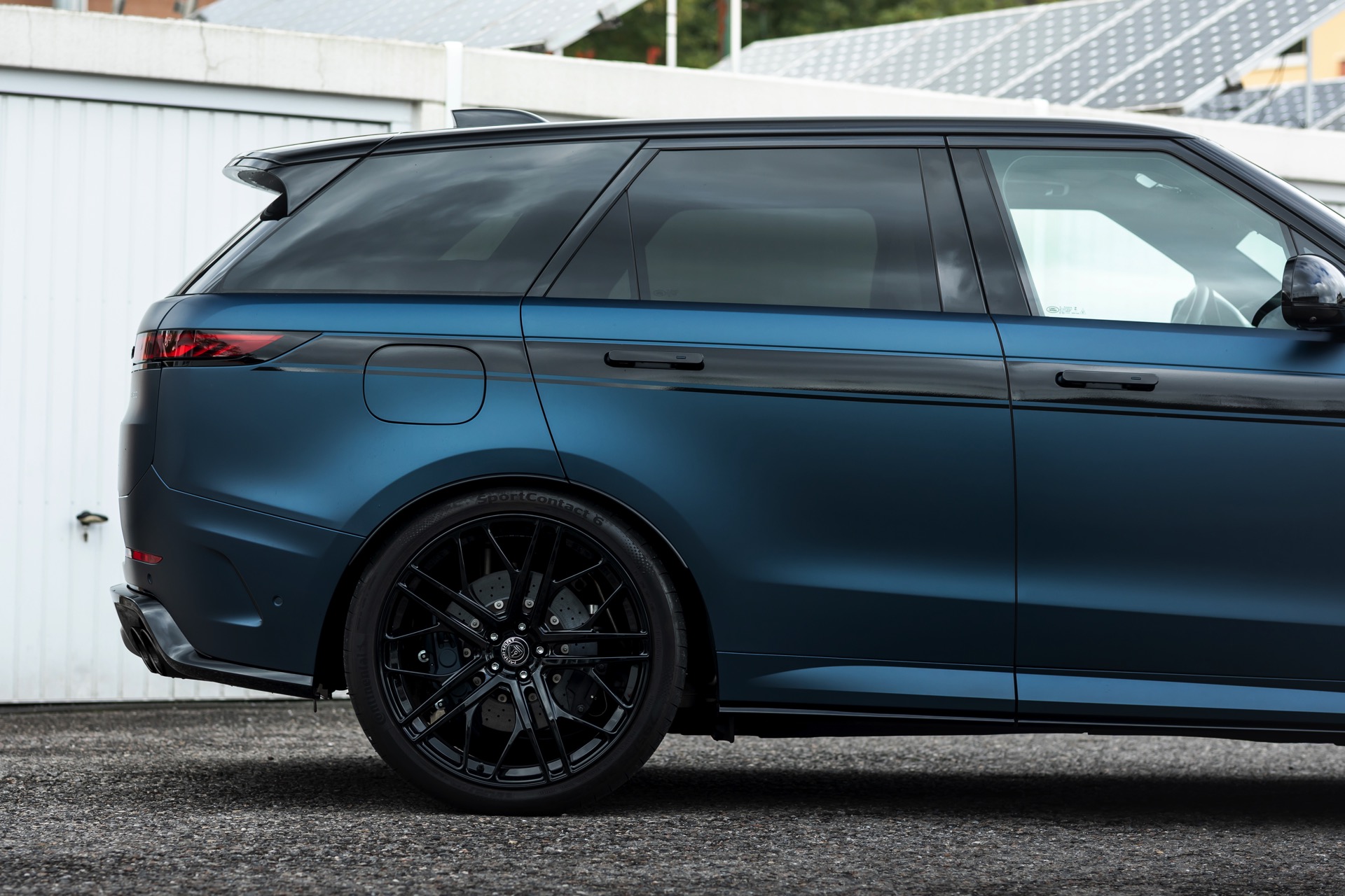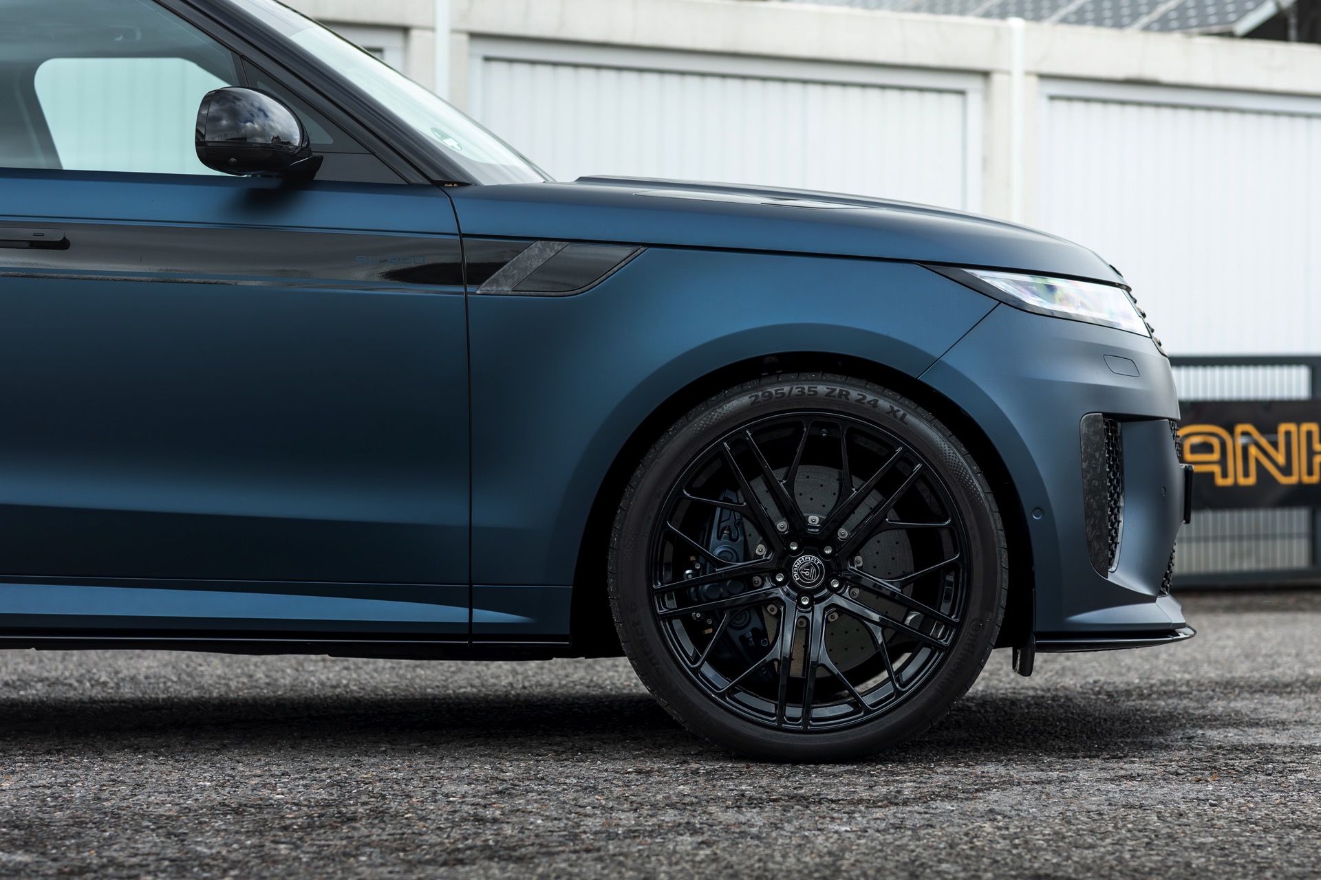 Anders sieht es bei den 24 Zoll großen Concave One-Schmiedefelgen aus, die selbst die riesigen Radhäuser des Range Rover Sport SV souverän ausfüllen. Die 24-Zöller im Y-Speichen-Design sind rundum mit 295 Millimeter breiten Reifen bezogen, alternativ zum schwarzen Finish sind natürlich auch andere Farben erhältlich. Abgesehen von den Felgen hat Manhart nur wenige Exterieur-Modifikationen vorgenommen, schließlich gibt es für den RR Sport SV auch ab Werk Aero-Elemente im Forged Carbon-Look.