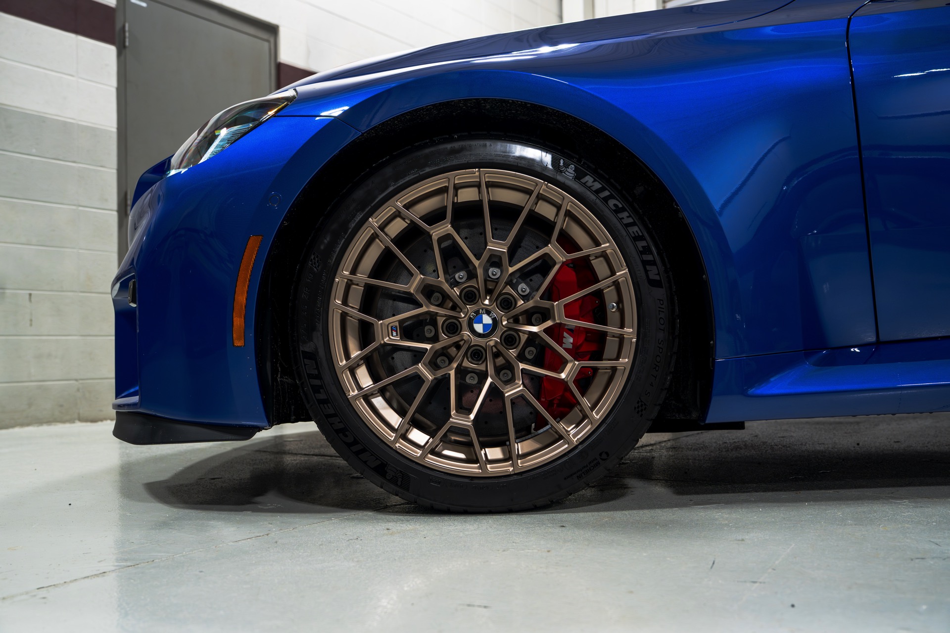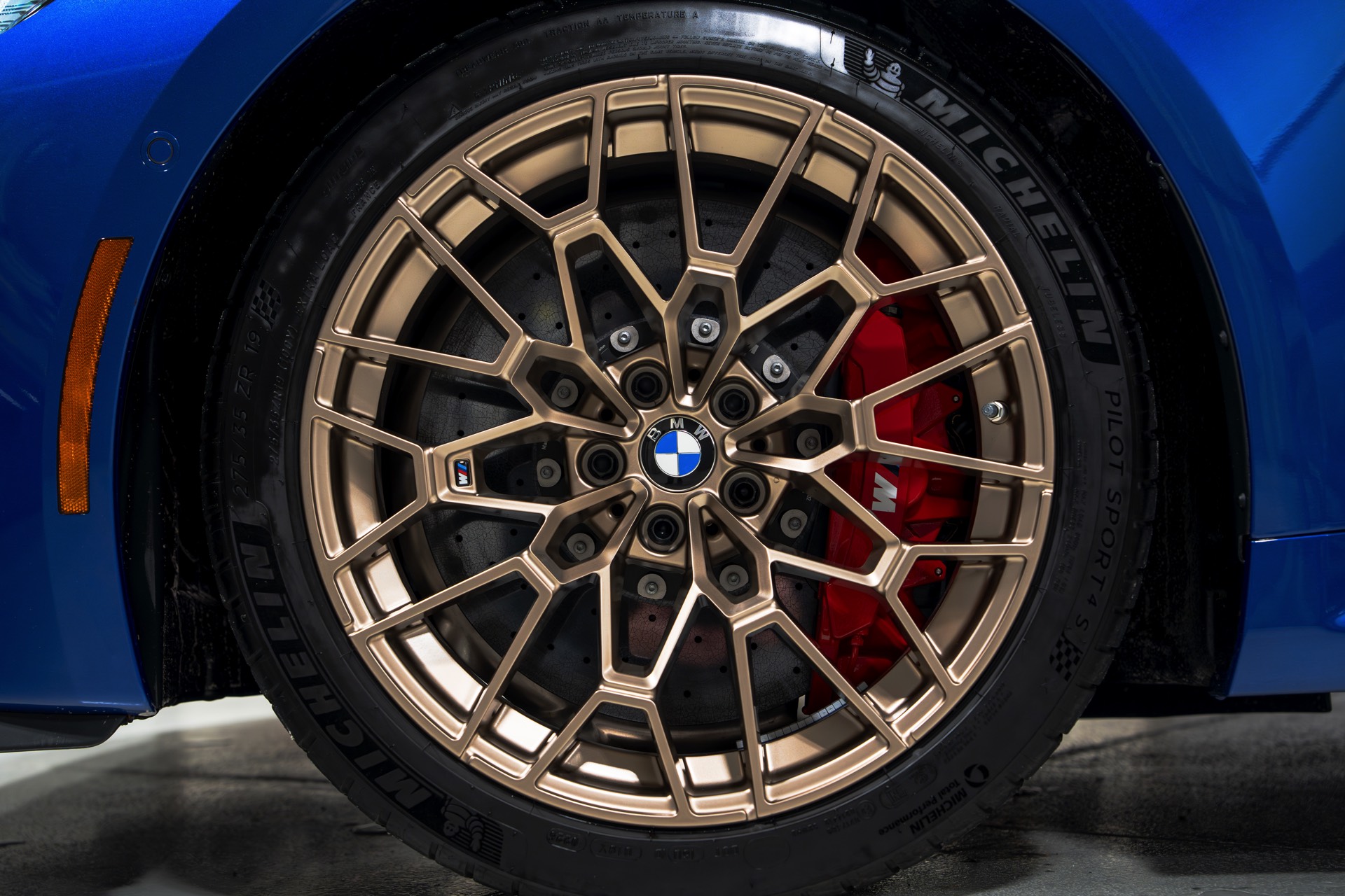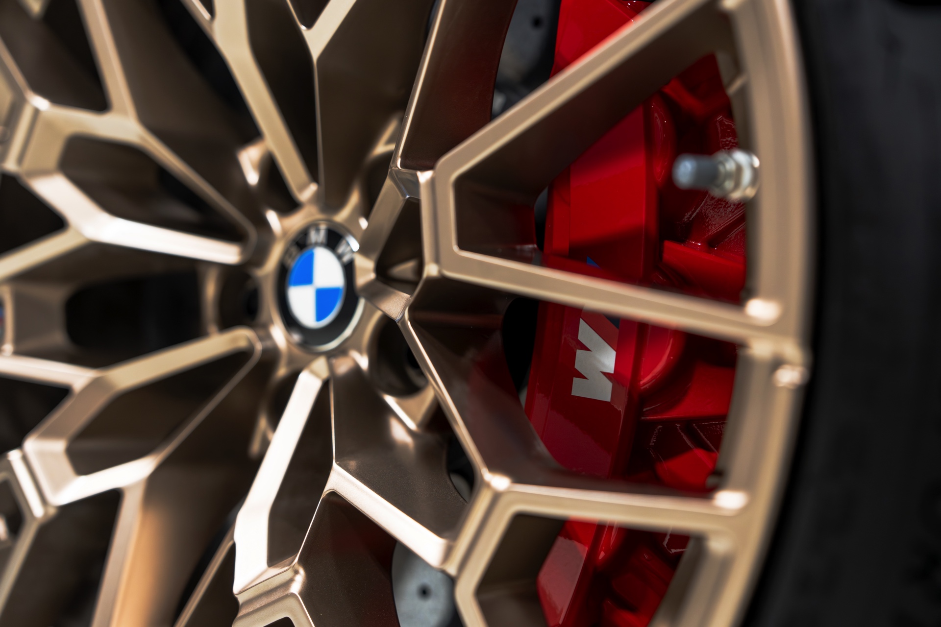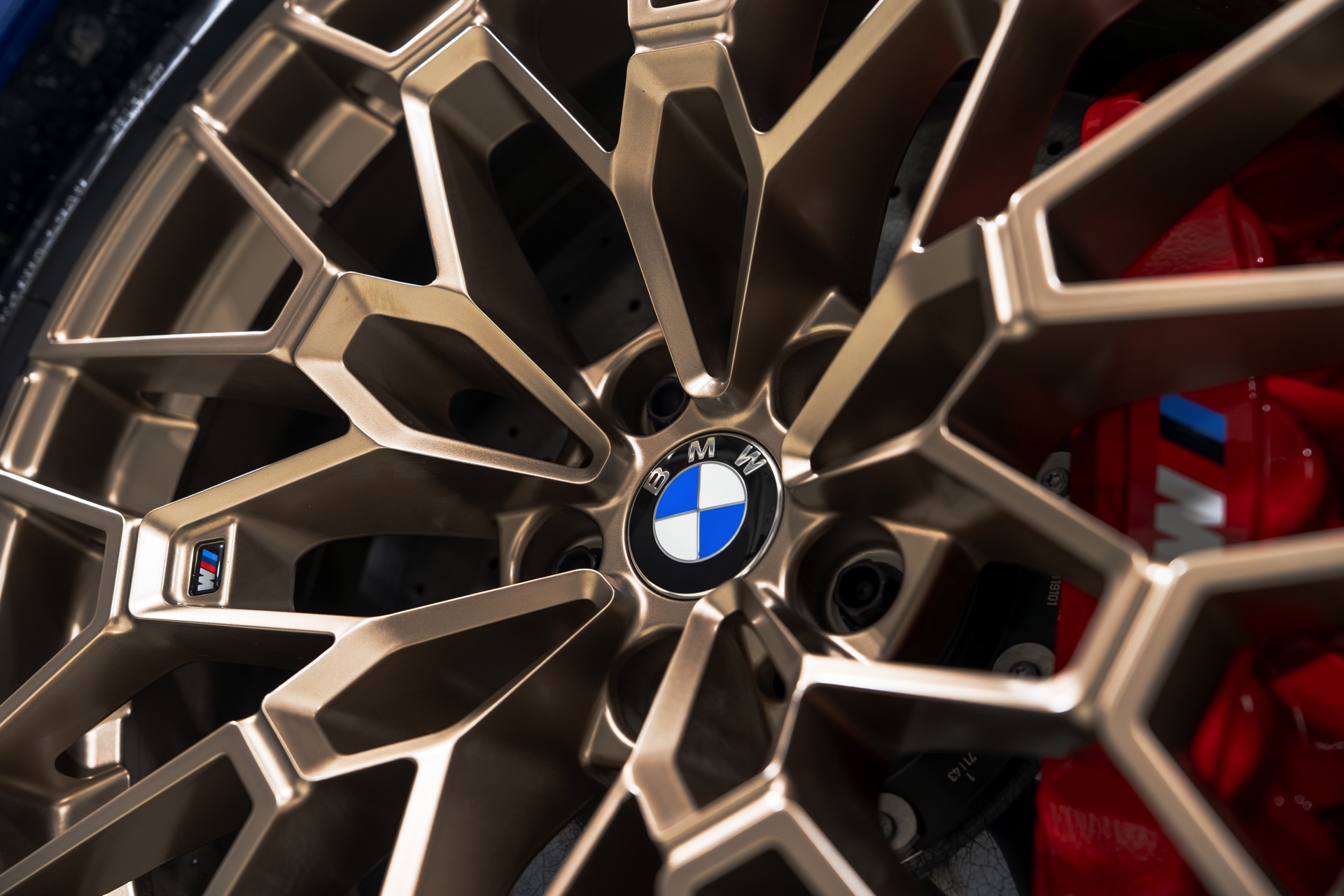 Der wohl größte Hingucker ist dabei die Carbon-Heckklappe, die mit ihrem integrierten Spoiler-Bürzel an legendäre M-Modelle wie den M3 CSL der Generation E46 erinnert und auch in Portimao Blau überzeugt. Wenige Zentimeter darunter sehen wir den ebenfalls neu gestalteten Diffusor-Einsatz, der für Kenner ebenfalls ein klarer Hinweis auf das Topmodell ist. In der Seitenansicht muss sich die Heckklappe die Aufmerksamkeit des Betrachters allerdings mit den Felgen teilen, denn diese ziehen mit ihrem Finish in Frozen Goldbronze ebenfalls viele Blicke auf sich.