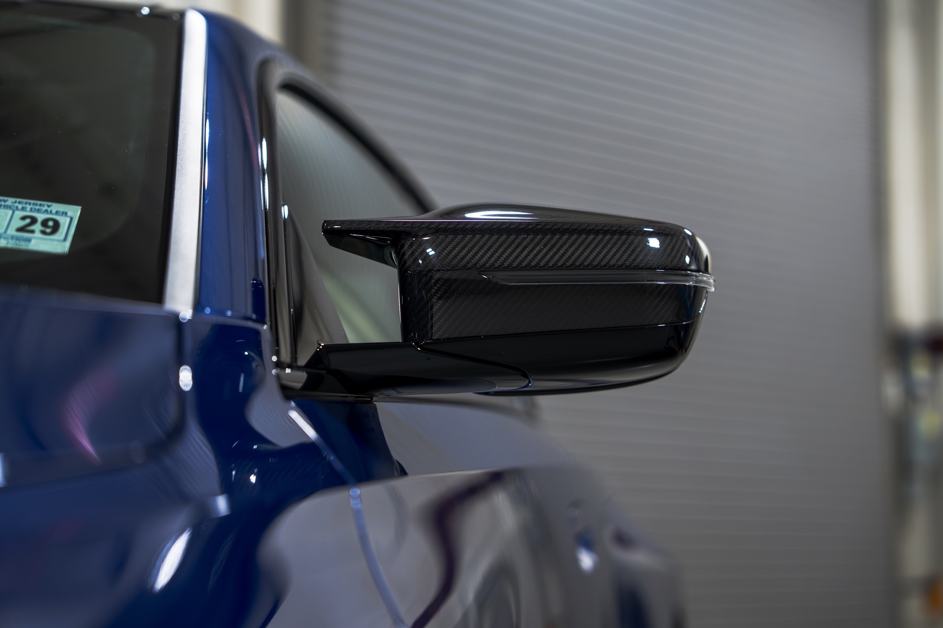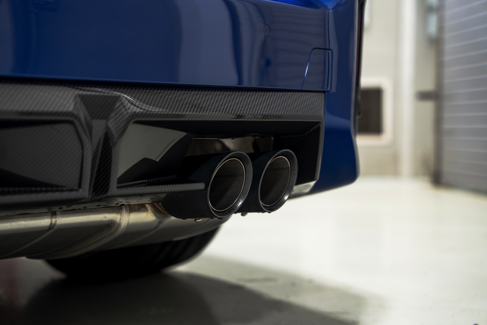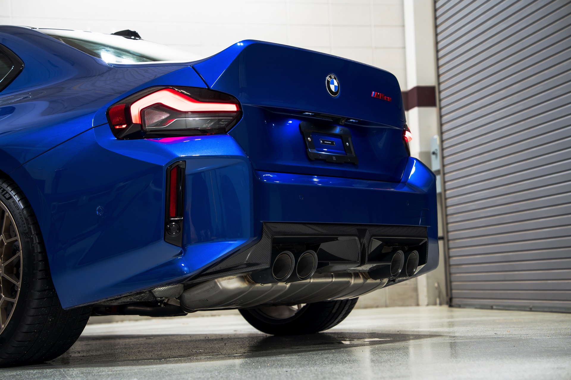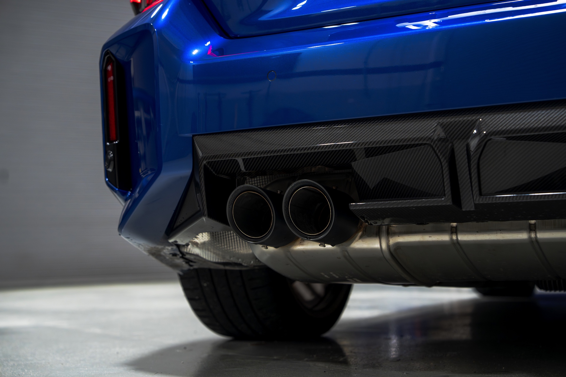 Der wohl größte Hingucker ist dabei die Carbon-Heckklappe, die mit ihrem integrierten Spoiler-Bürzel an legendäre M-Modelle wie den M3 CSL der Generation E46 erinnert und auch in Portimao Blau überzeugt. Wenige Zentimeter darunter sehen wir den ebenfalls neu gestalteten Diffusor-Einsatz, der für Kenner ebenfalls ein klarer Hinweis auf das Topmodell ist. In der Seitenansicht muss sich die Heckklappe die Aufmerksamkeit des Betrachters allerdings mit den Felgen teilen, denn diese ziehen mit ihrem Finish in Frozen Goldbronze ebenfalls viele Blicke auf sich.