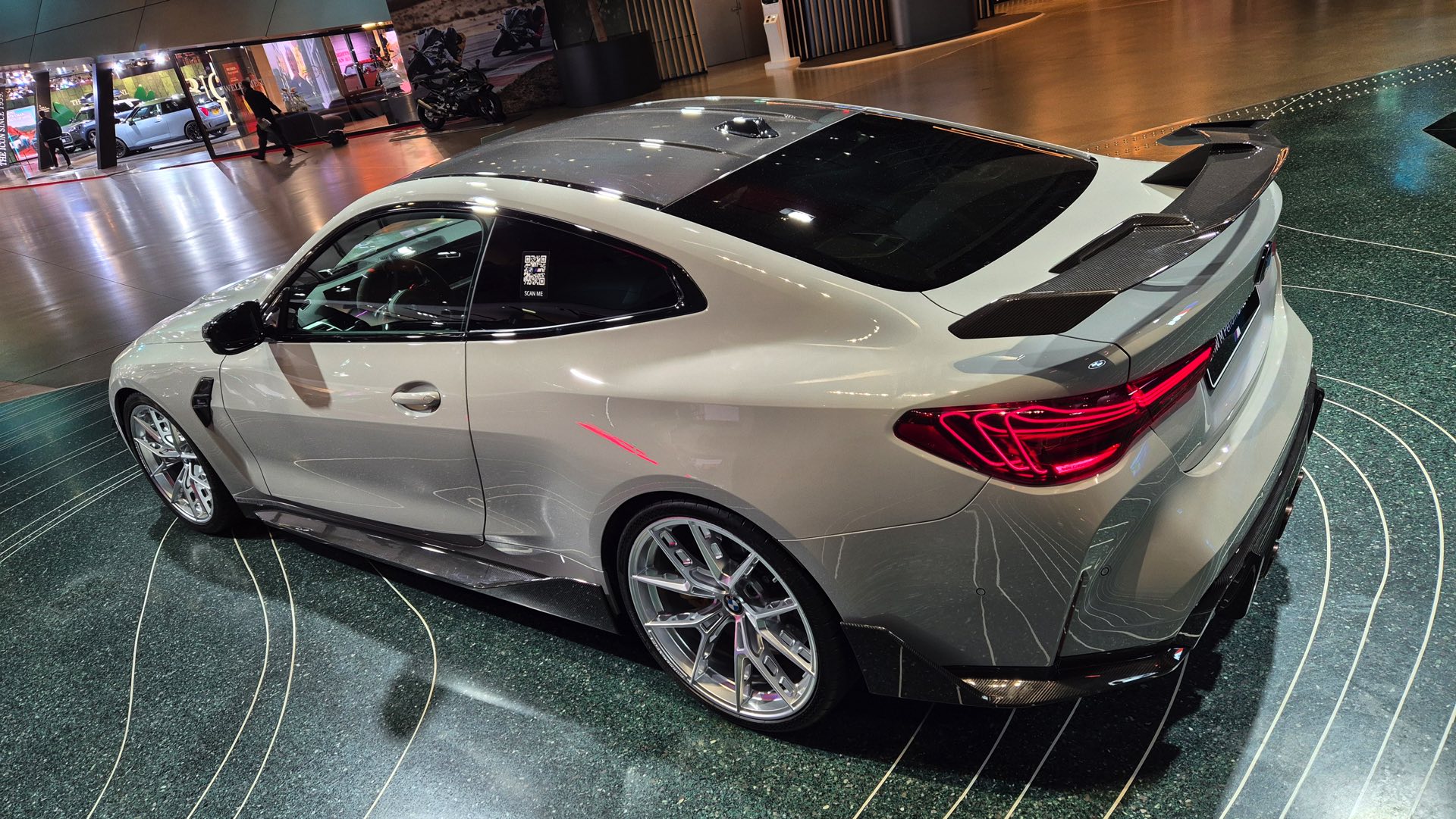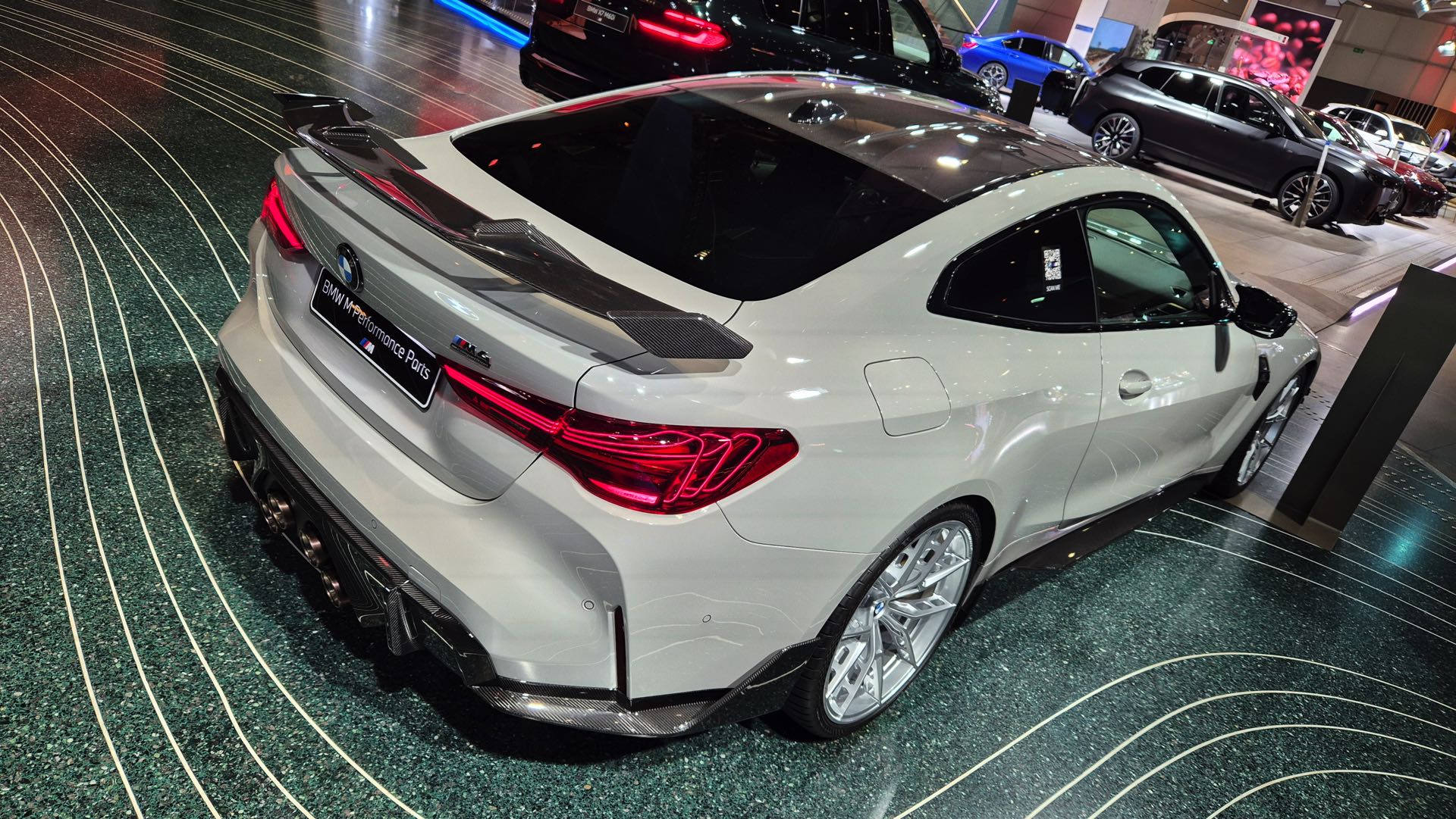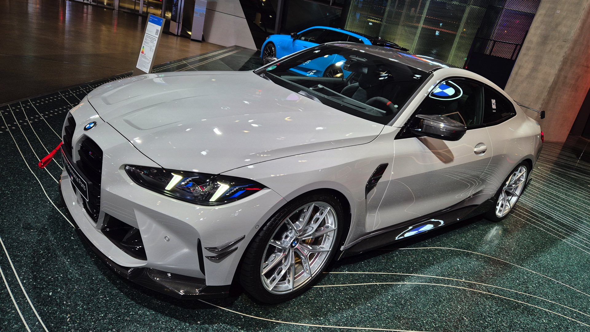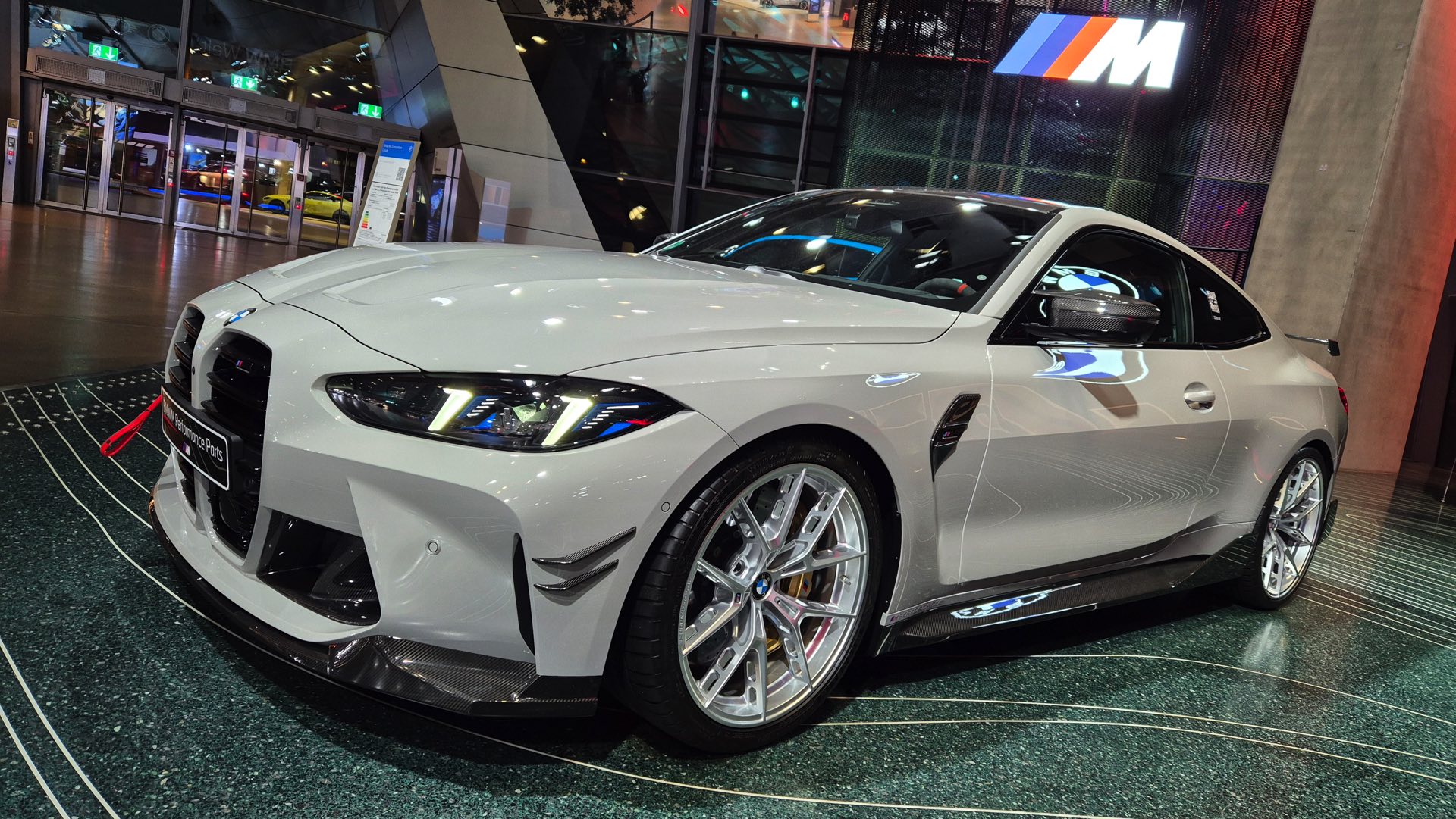 Einen weiteren Auftritt legt Kreide derzeit in der BMW Welt München hin, denn dort wird ein aktuelles BMW M4 Coupé (G82 LCI) mit zahlreichen M Performance-Parts präsentiert. Im Walkaround-Video von unserem Leser paul_m8 kommt das sehenswerte Zusammenspiel von auffällig-unauffälliger Lackierung und unübersehbaren Aerodynamik-Komponenten in Sicht-Carbon perfekt zur Geltung: Der kohlefaserverstärkte Kunststoff harmoniert perfekt mit diversen Elementen in Hochglanz-Schwarz und sorgt für einen konsequenten Bicolor-Look am gesamten Fahrzeug.