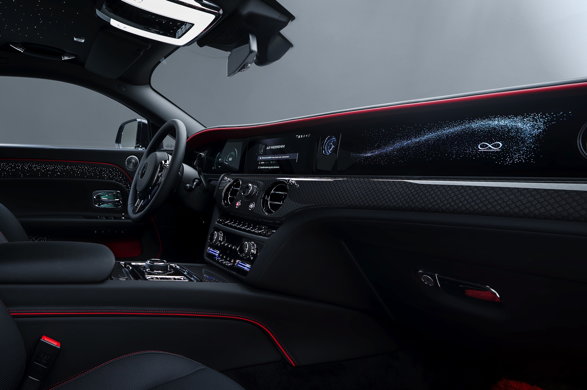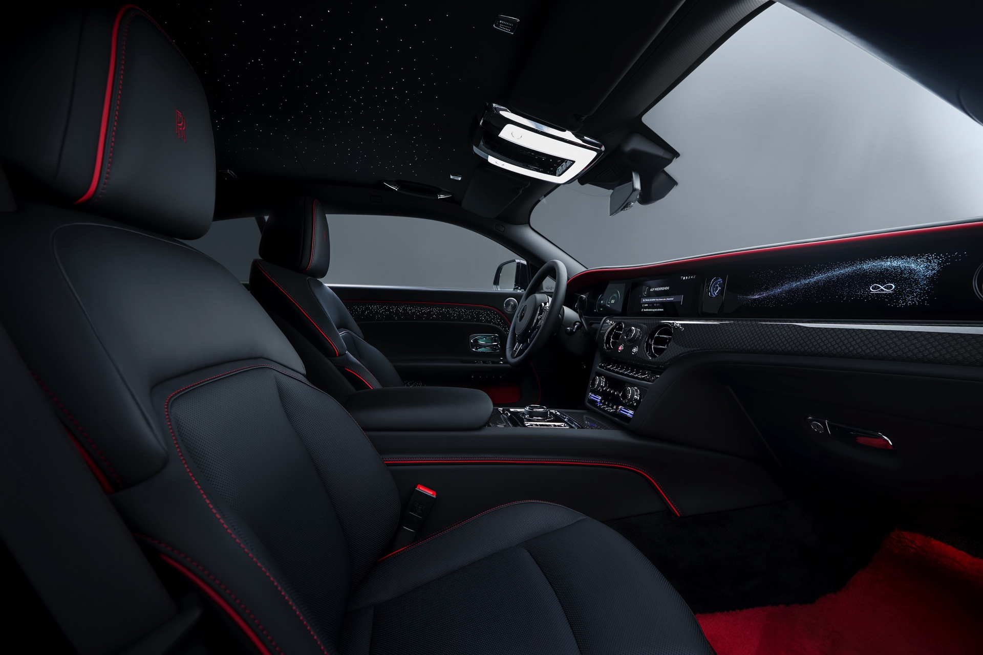Das kann auch nicht schaden, denn obwohl der Elektro-Antrieb des Rolls-Royce Spectre Black Badge unverändert bleibt, ist er mit offiziell 659 PS und sogar 1.075 Newtonmeter Drehmoment zweifellos extrem potent. Der elektrische Rolls-Royce nutzt dabei die stärkste Variante der fünften Generation des eDrive-Antriebs, wie sie auch im BMW i7 M70 und seit kurzem im BMW iX M70 zum Einsatz kommt. Für feine farbige Akzente sorgt neben den rot lackierten Bremssätteln auch eine dezente rote Linie, die die beiden Räder optisch zu verbinden scheint.